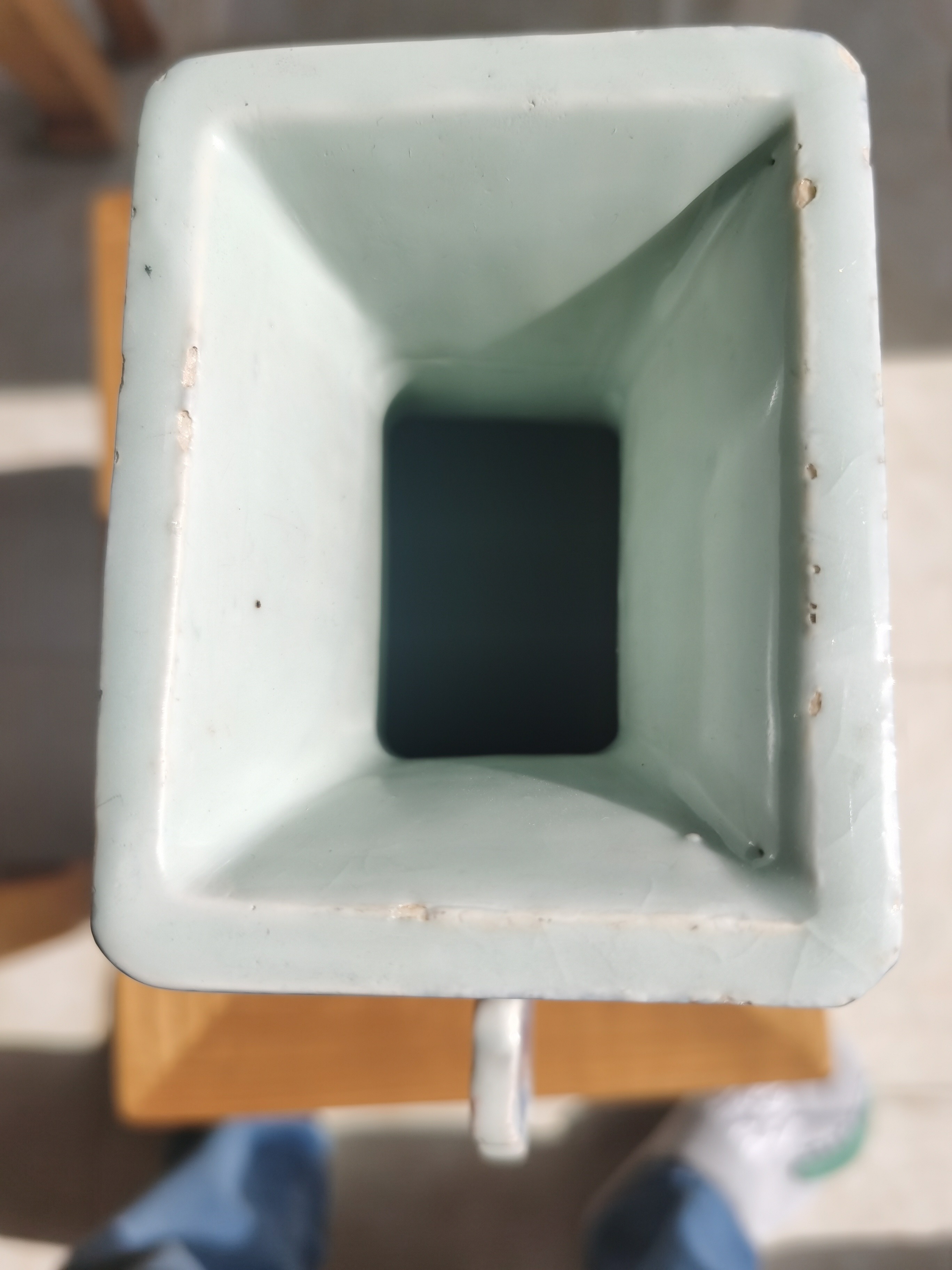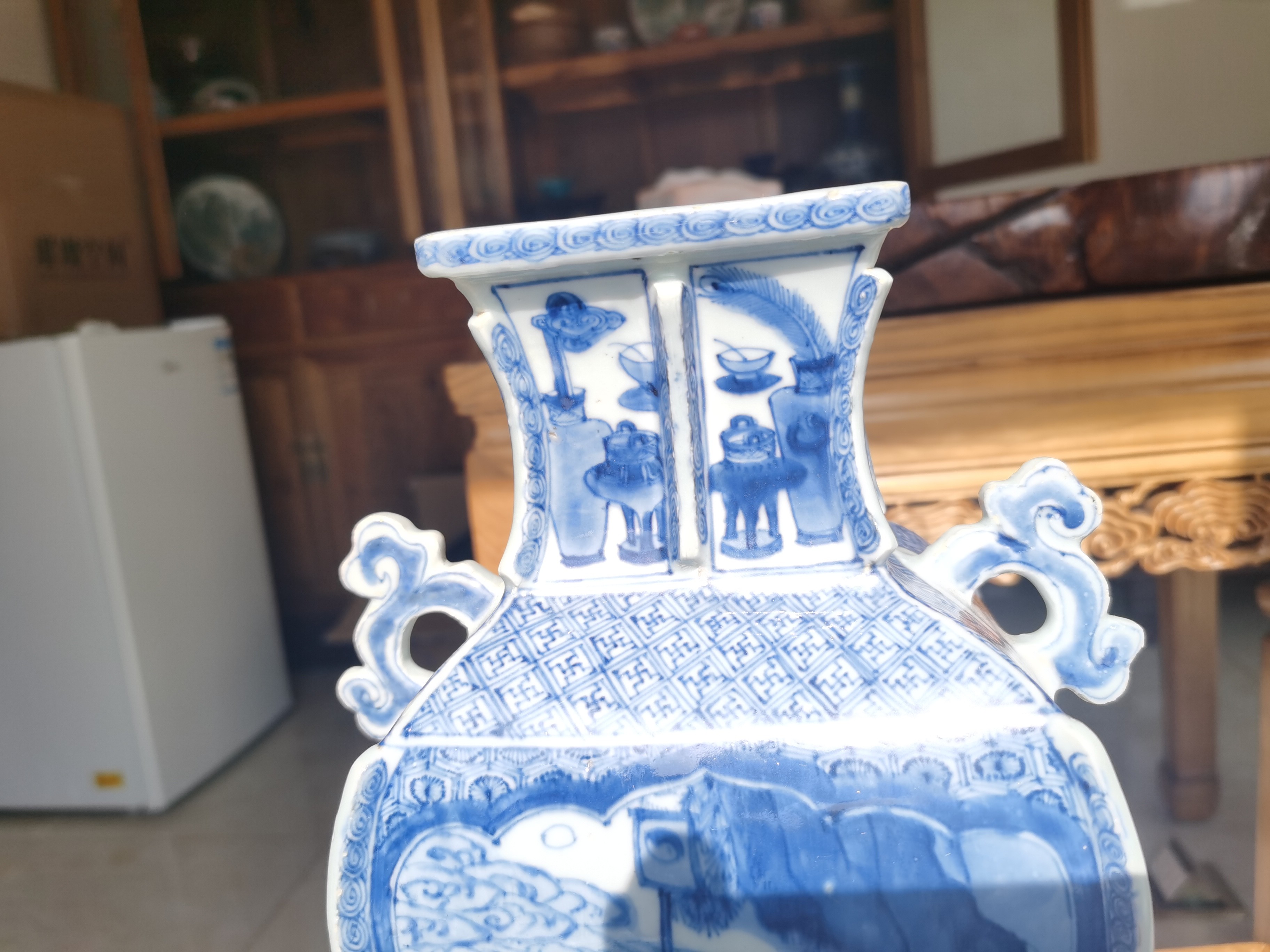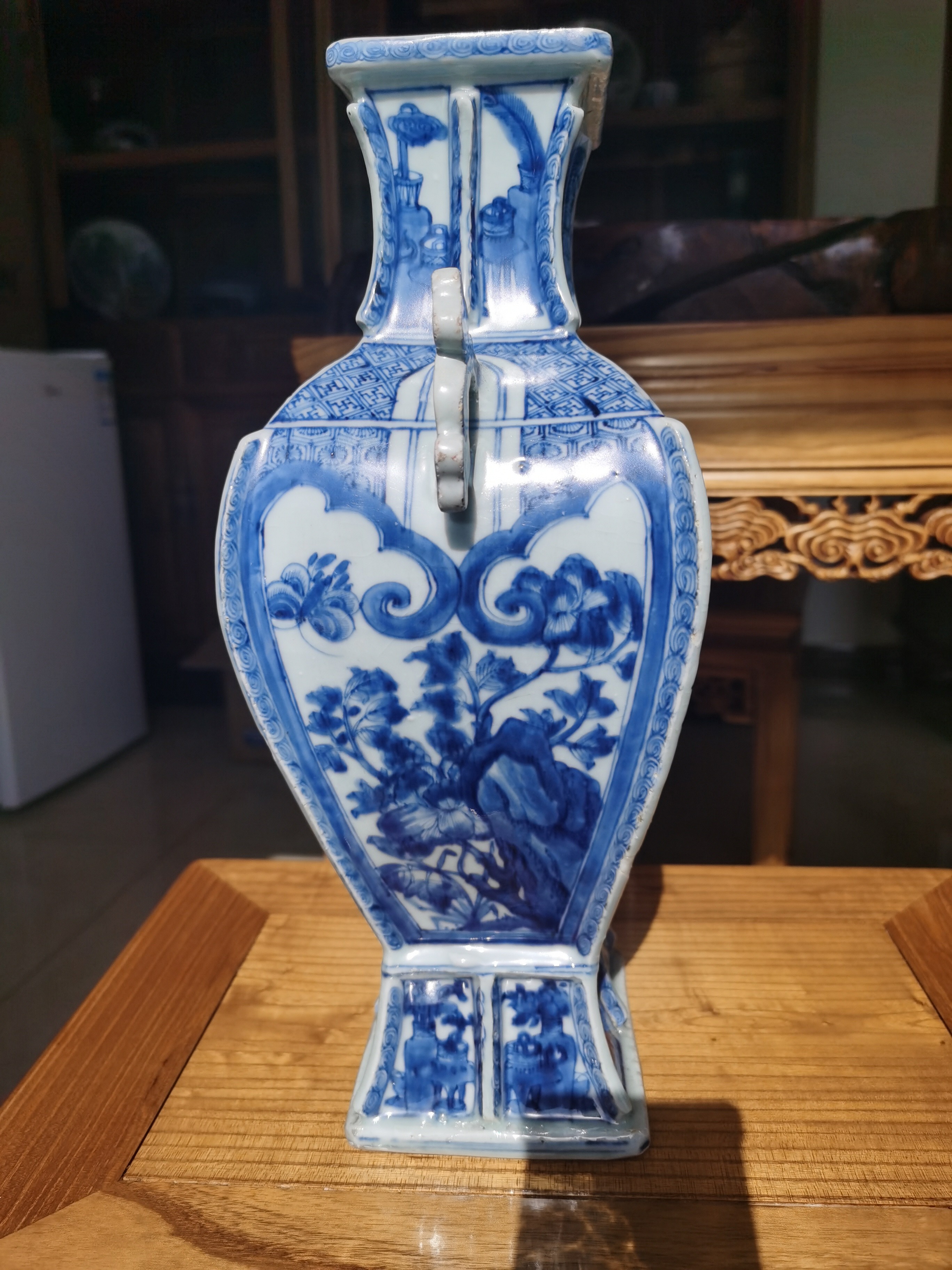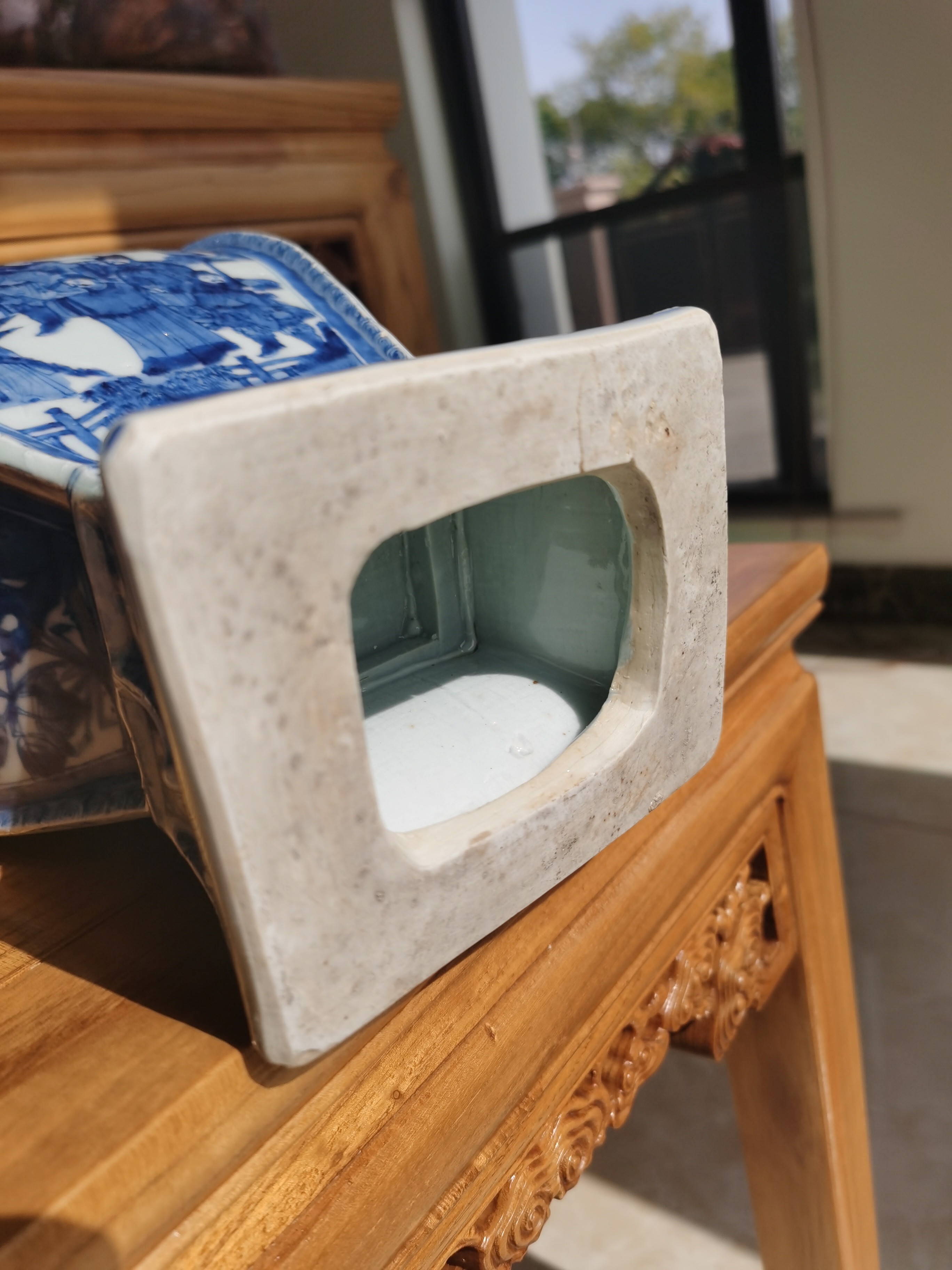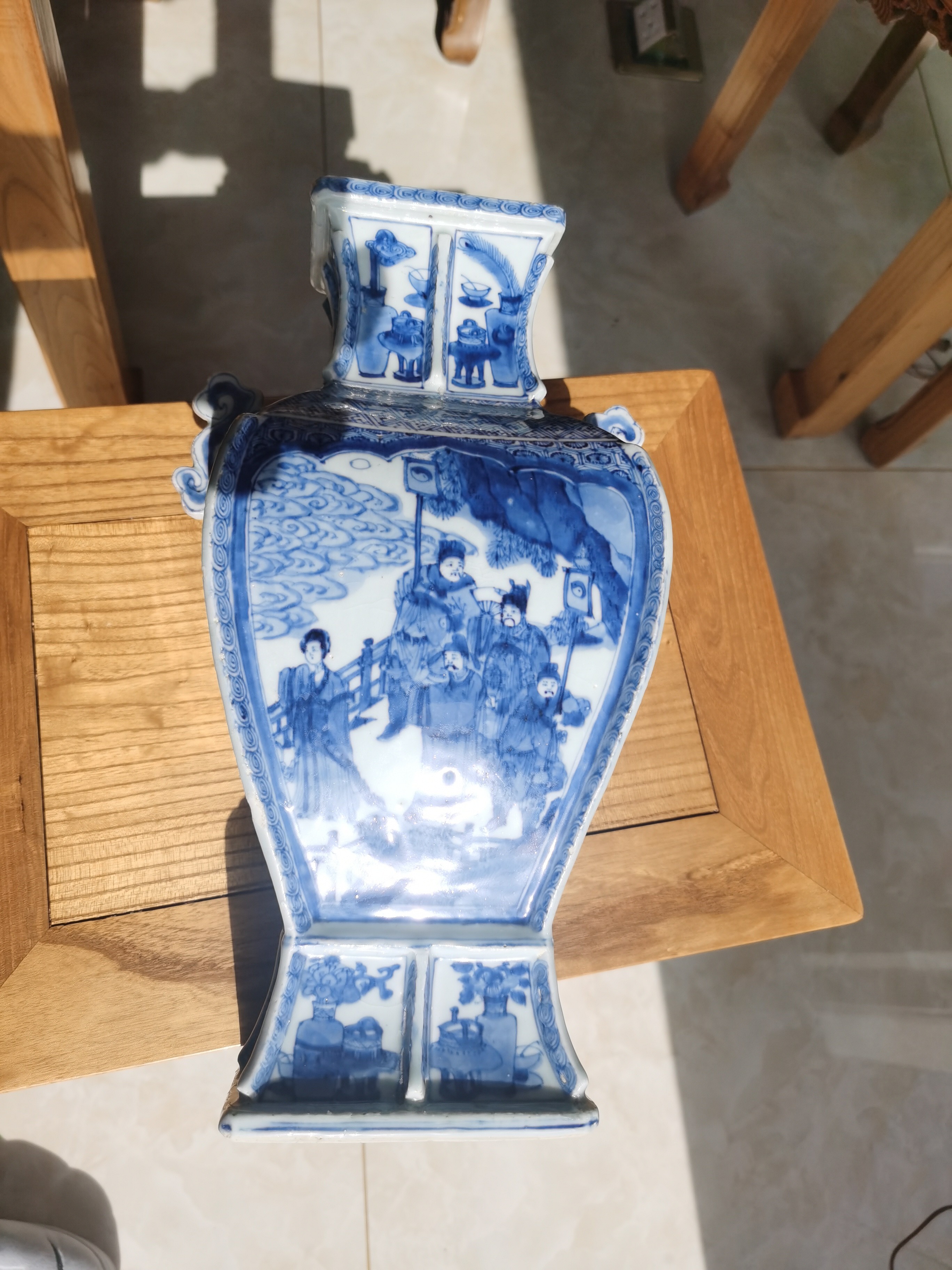 康熙青花人物四方尊,典型的外销风格,外型仿青铜器,纹饰画工潇洒随意,青花发色沉稳,釉面紧致,胎质坚硬,这一类在康熙一朝比较流行,大多用于外销。