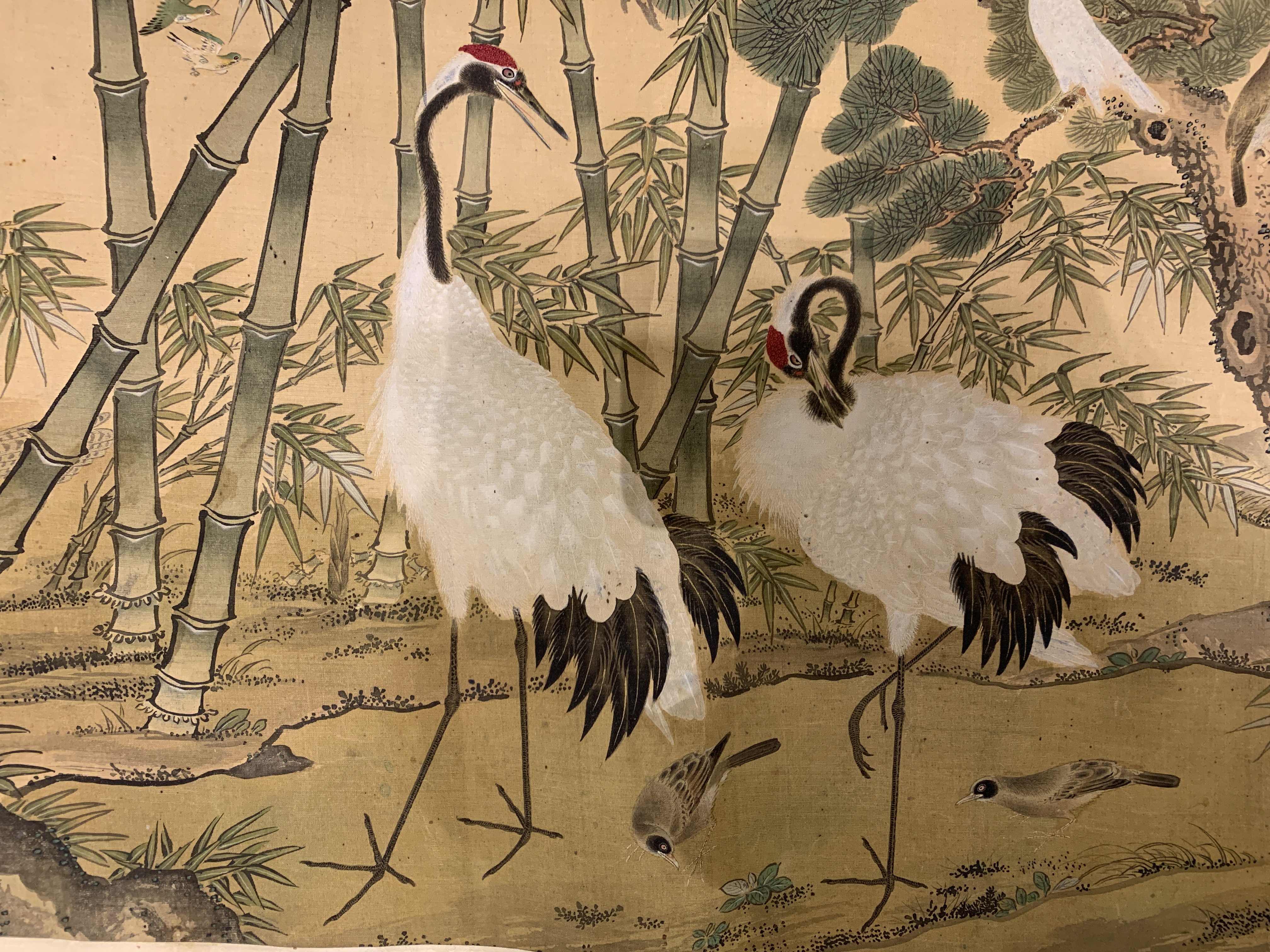 该画为清晚民国初期仿品,画面秀丽,松鹤延年,竹和“祝”谐音,有贺寿之意,仔细观察其画风与赵大年古朴洒脱,优雅清丽的画风还是差别甚远,宋代的绢画保存在现在也已经寥寥无几了,古绢必有鲫鱼口和雪丝,自然破裂痕迹,纺织方式也不相同,故鉴定为老仿,有一定的收藏价值。