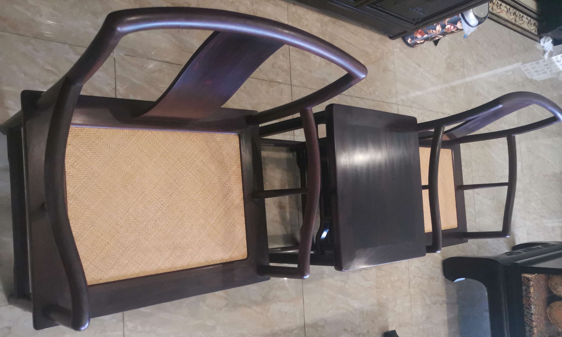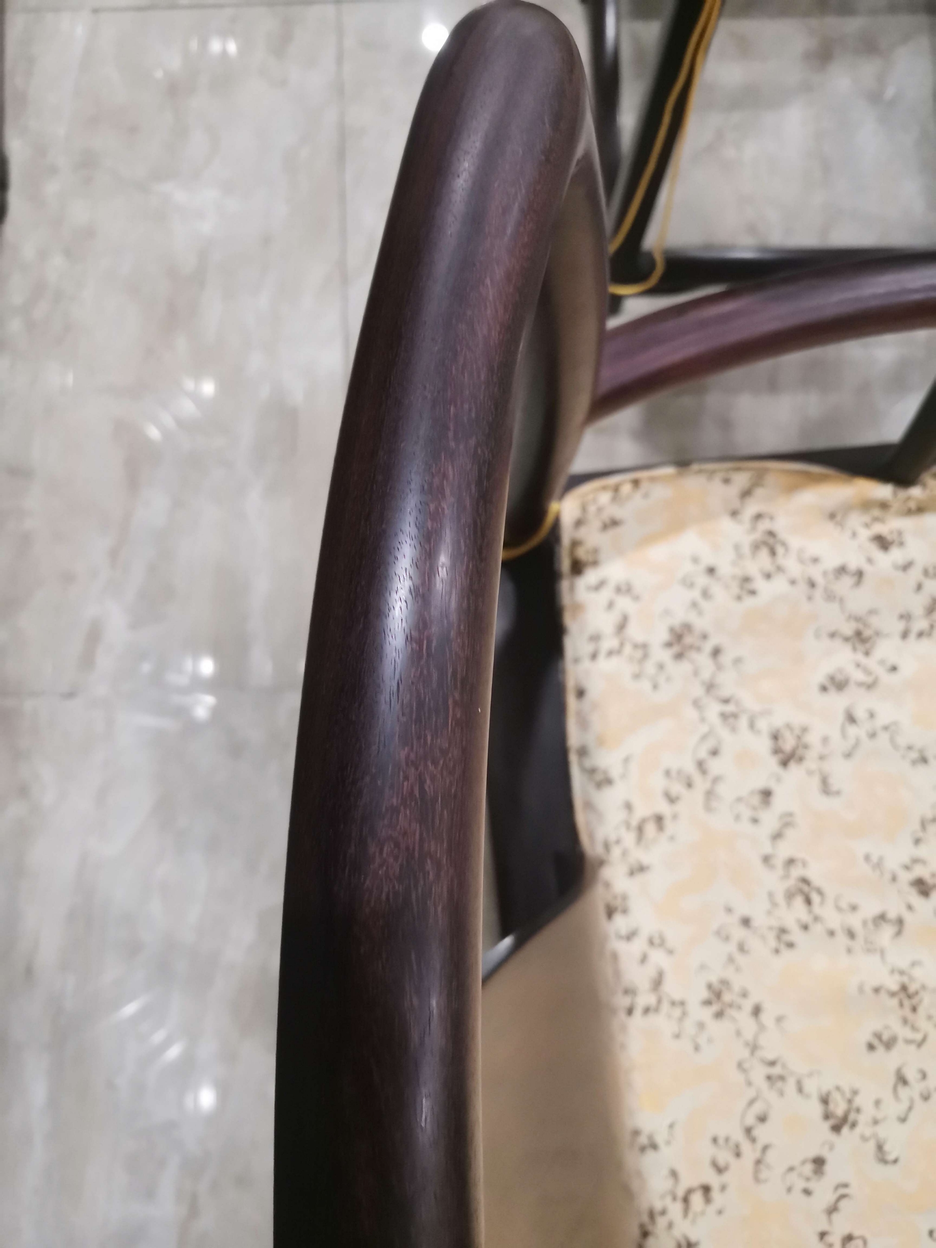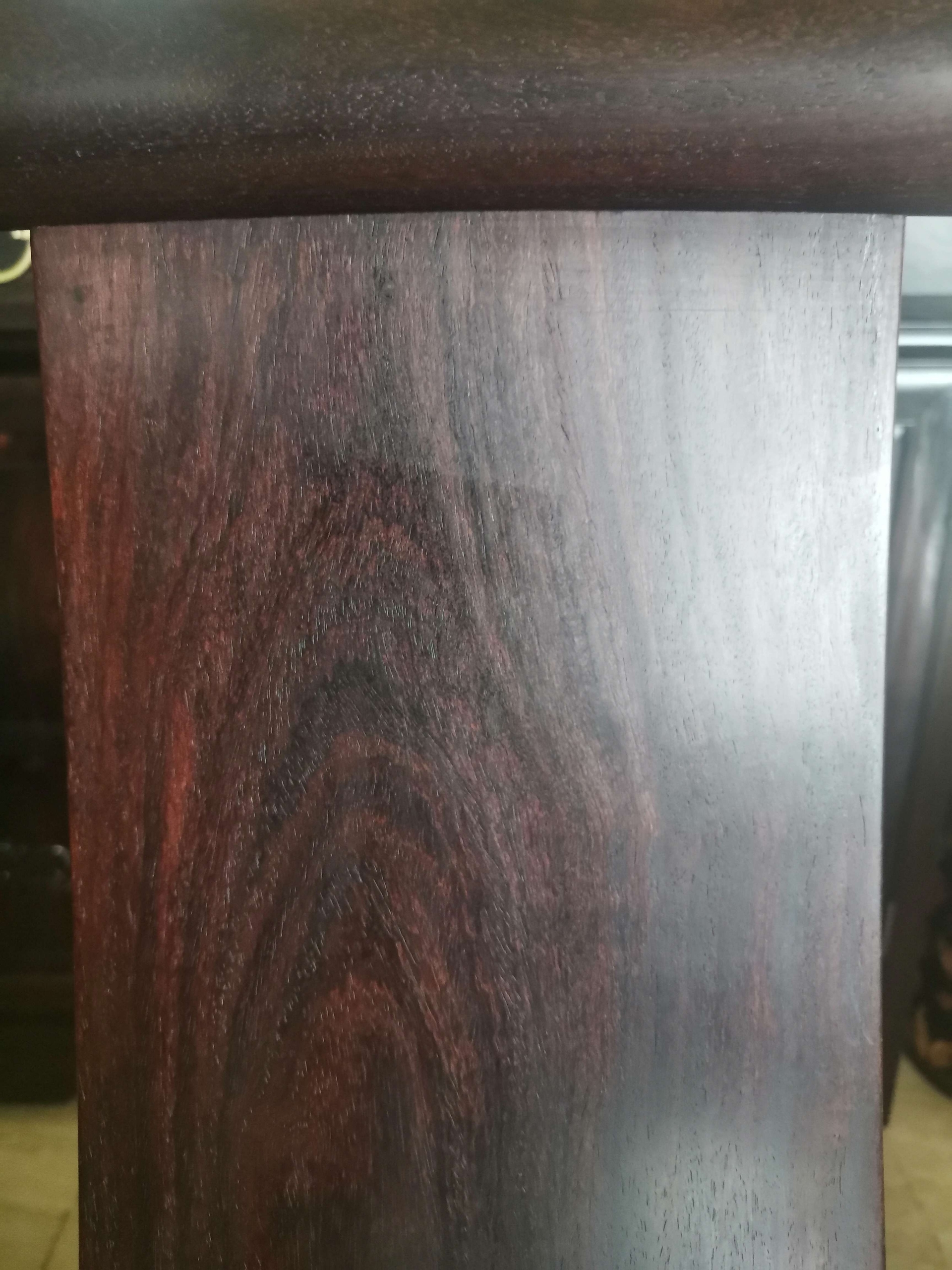 这对套官帽三件套做工精细,素雅大方,应该出老工匠之手,从它油性密度来看是印度小叶紫檀(而且是折房老料),这类素雅家具用料不大,没必要参假材料。
