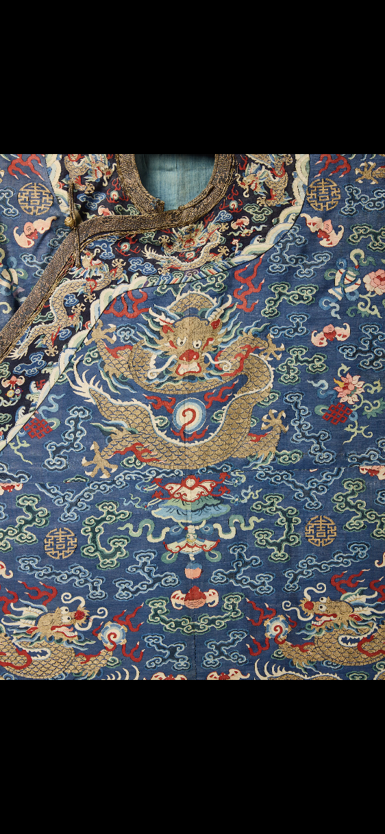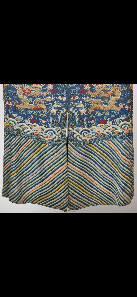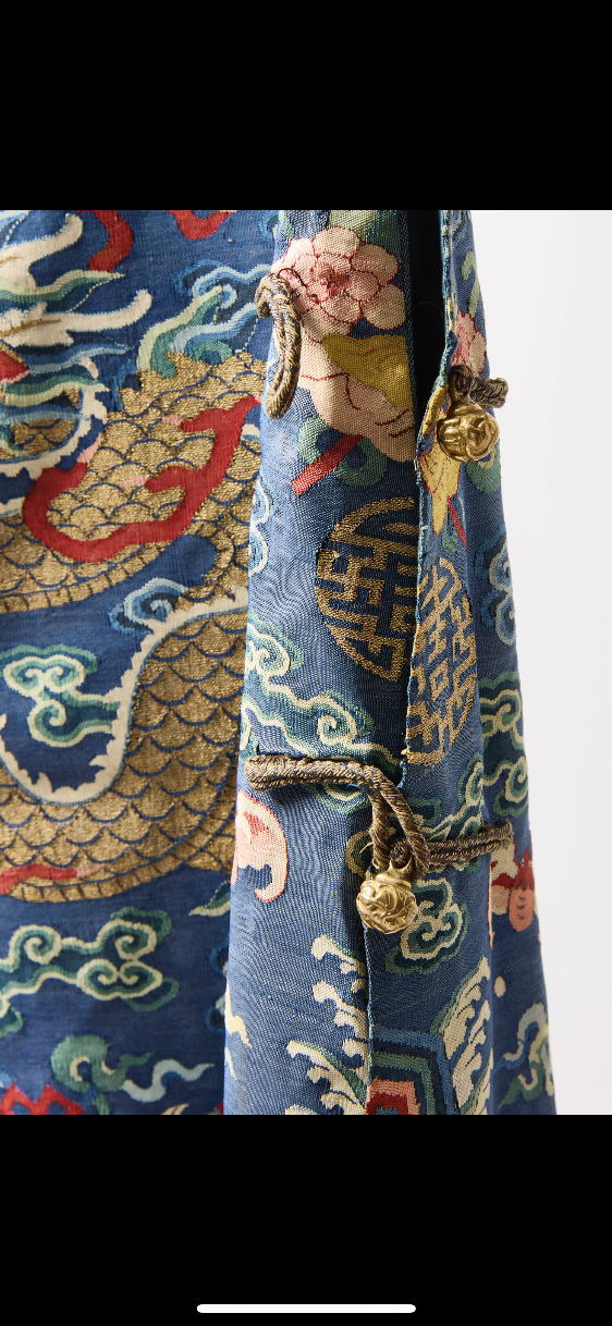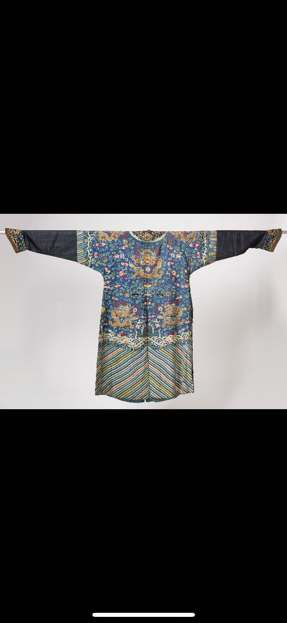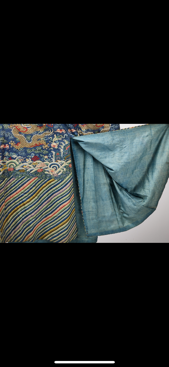 此件吉服从刺绣风格和装饰工艺来看,行为晚清宫廷吉服,打子秀、盘金秀等工艺考究,内里衬布也是这一时期特征,但要看具体尺寸和品相,围绕参考价格再浮动定夺。
