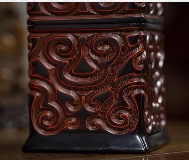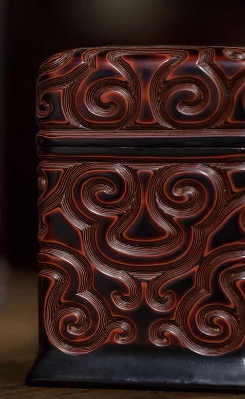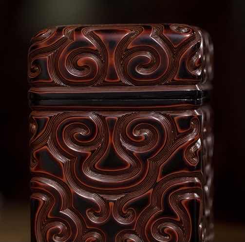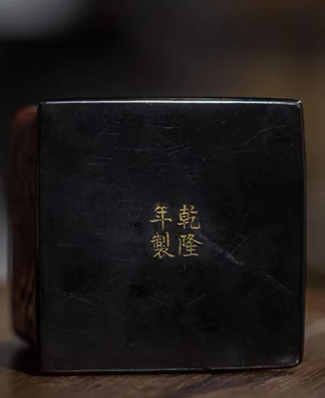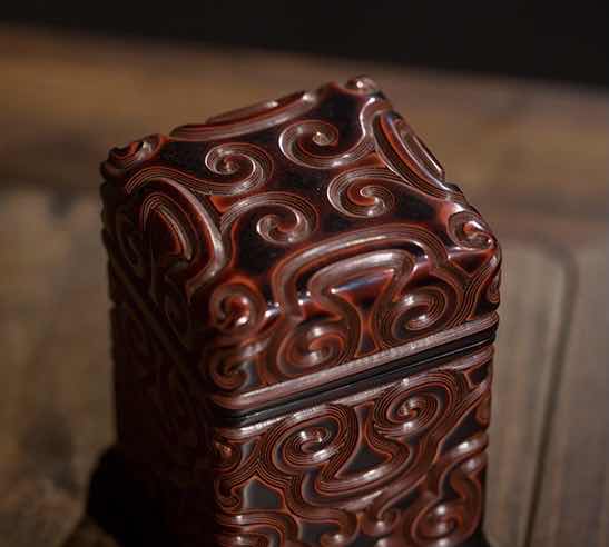 看真。 乾隆剔犀印章盒。 型置规则,刻工精致。如意纹饰,寓意吉祥。款识先刻后描金,符合乾隆工艺。整体漆层均匀,刀痕截面红黑夹色漆层等钱分布,极其美观工整。用剔红作印盒鲜见,但剔犀印盒少见。不失为印盒精品!价格在千元左右