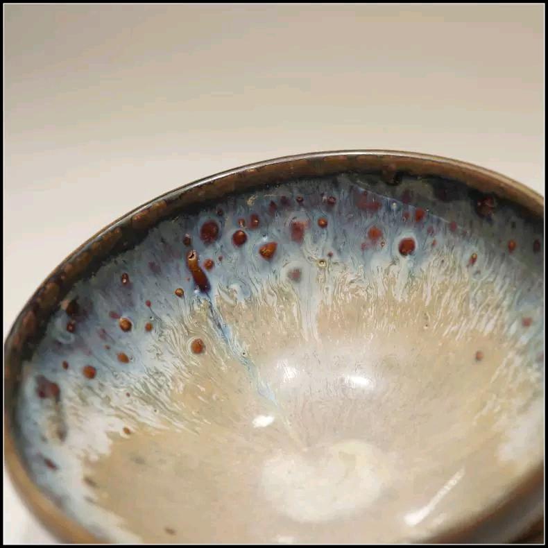 图片看这一件器物不是长沙窑,首先从这件器物的胎和底来看,胎的瓷泥杂质非常多,也比较粗糙,长沙窑的胎质要细一些,杂质也没有这么多。另外修胎的圈足比长沙窑的规整,长沙窑的时期制瓷工艺还没有这么规整,这件应当是长沙窑以后的器物。 另外长沙窑的胎和釉之间有一层化妆土,是给颜色比较偏暗的胎增加白度,而这件没有化妆土。从这件器物上的釉来看,长沙窑上面青釉都非常薄,这件的釉非常得肥厚,再看外壁它流釉和积釉非常厚,这与长沙窑有明显的差别。 从碗内看,口沿的釉都呈现铜红色,往下是浅黄色,这是窑变的这个现象,长沙窑的窑变没有这么明显。 从釉的开片来看这件碗的开片是从碗的中心从辐射状向四周开片,长沙窑的开片就像网状型的。 所以,从以上几个方面可以判断这不是一件长沙窑。