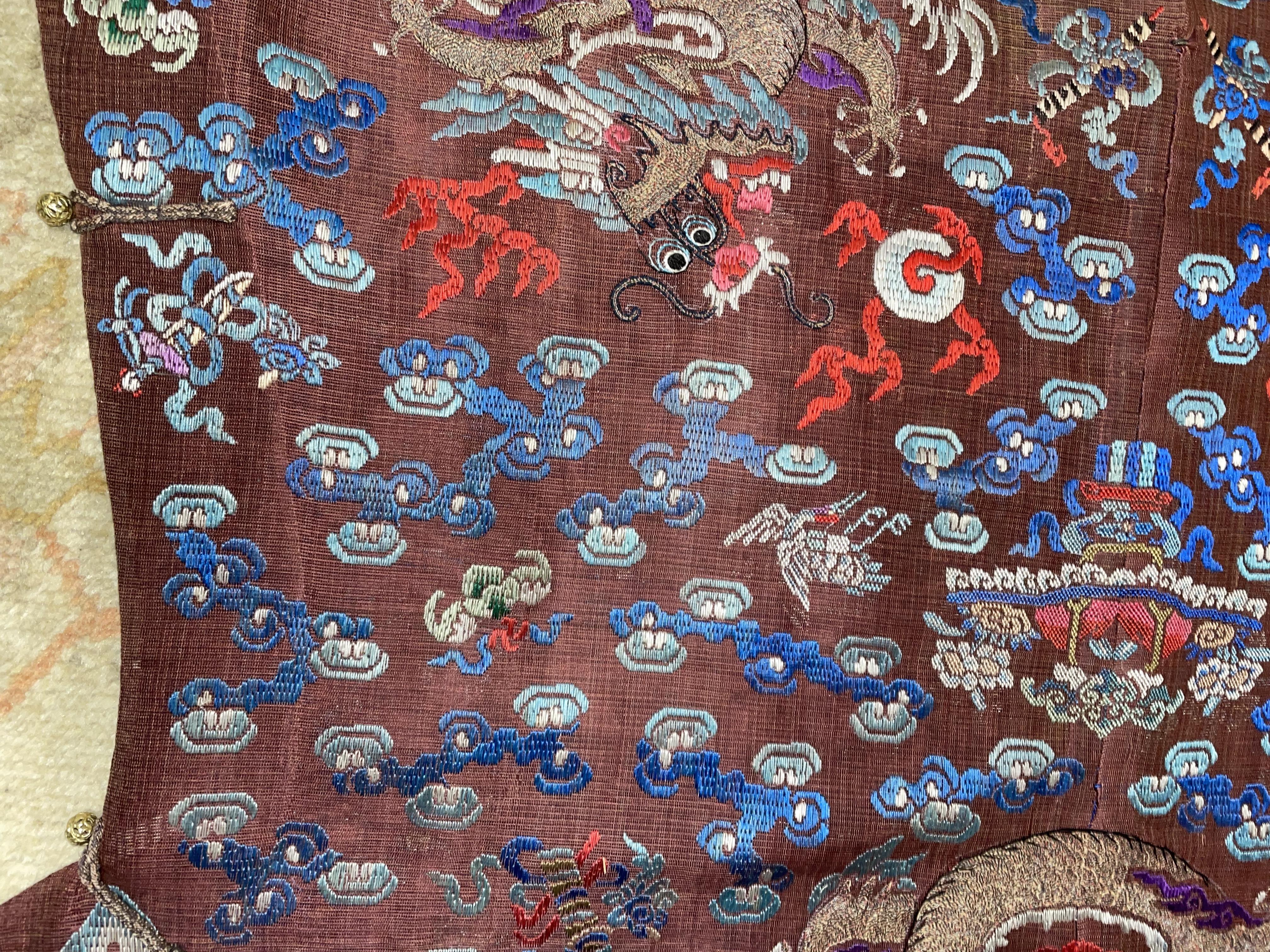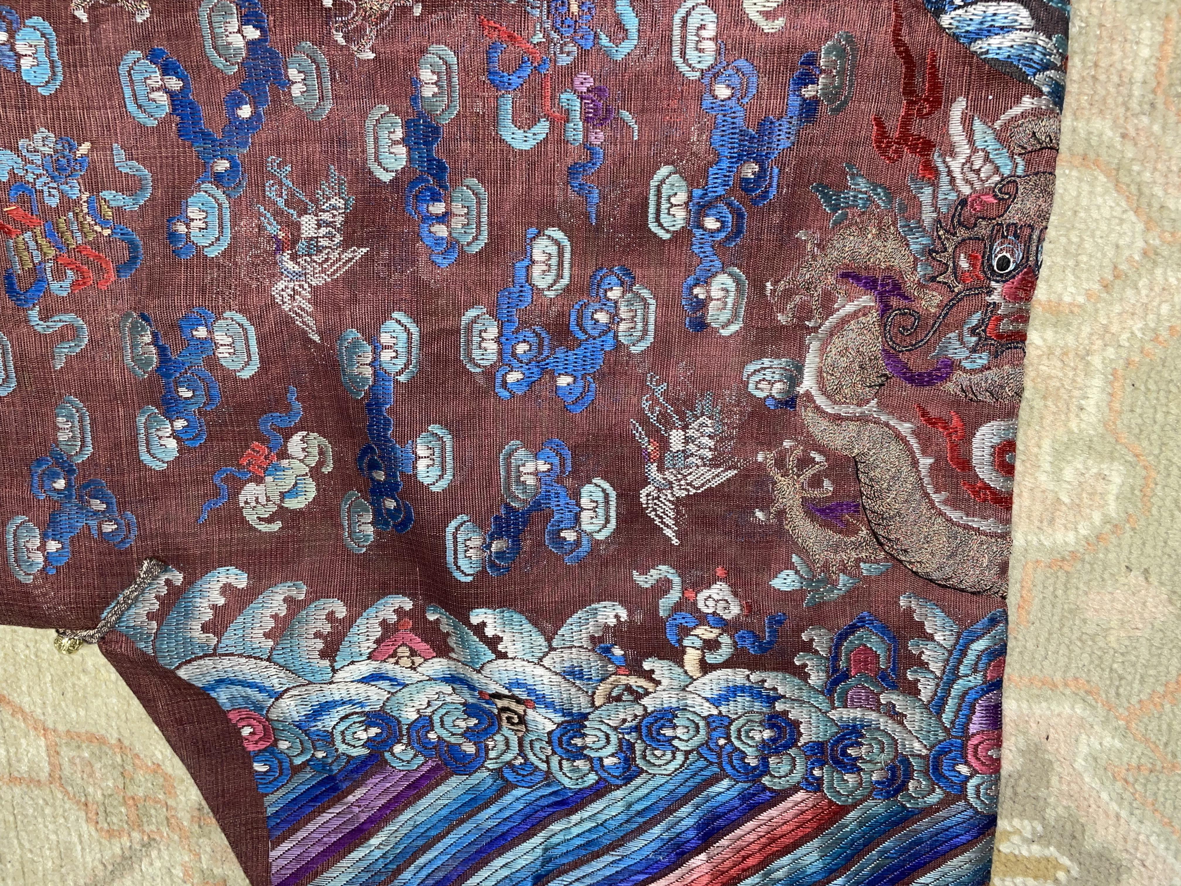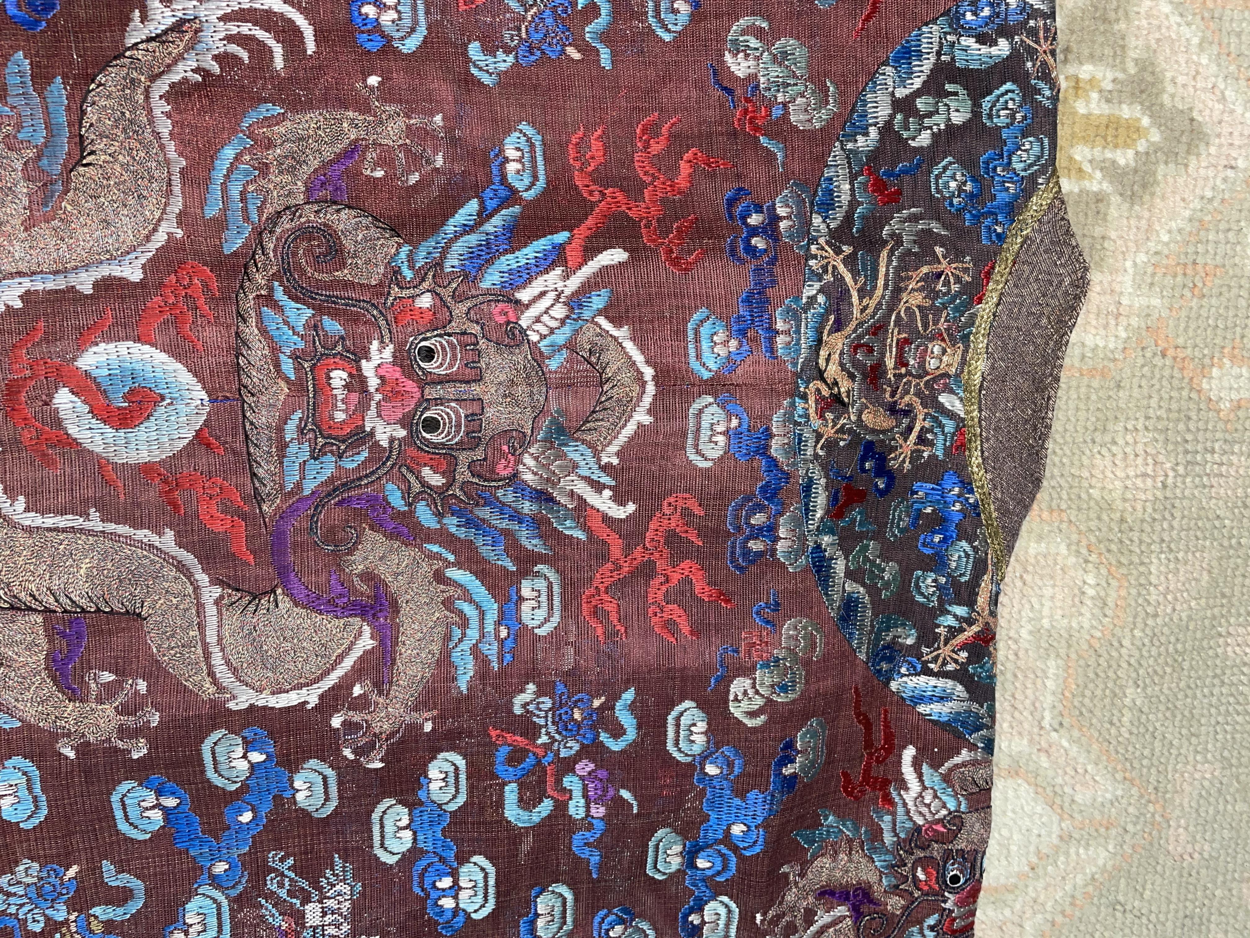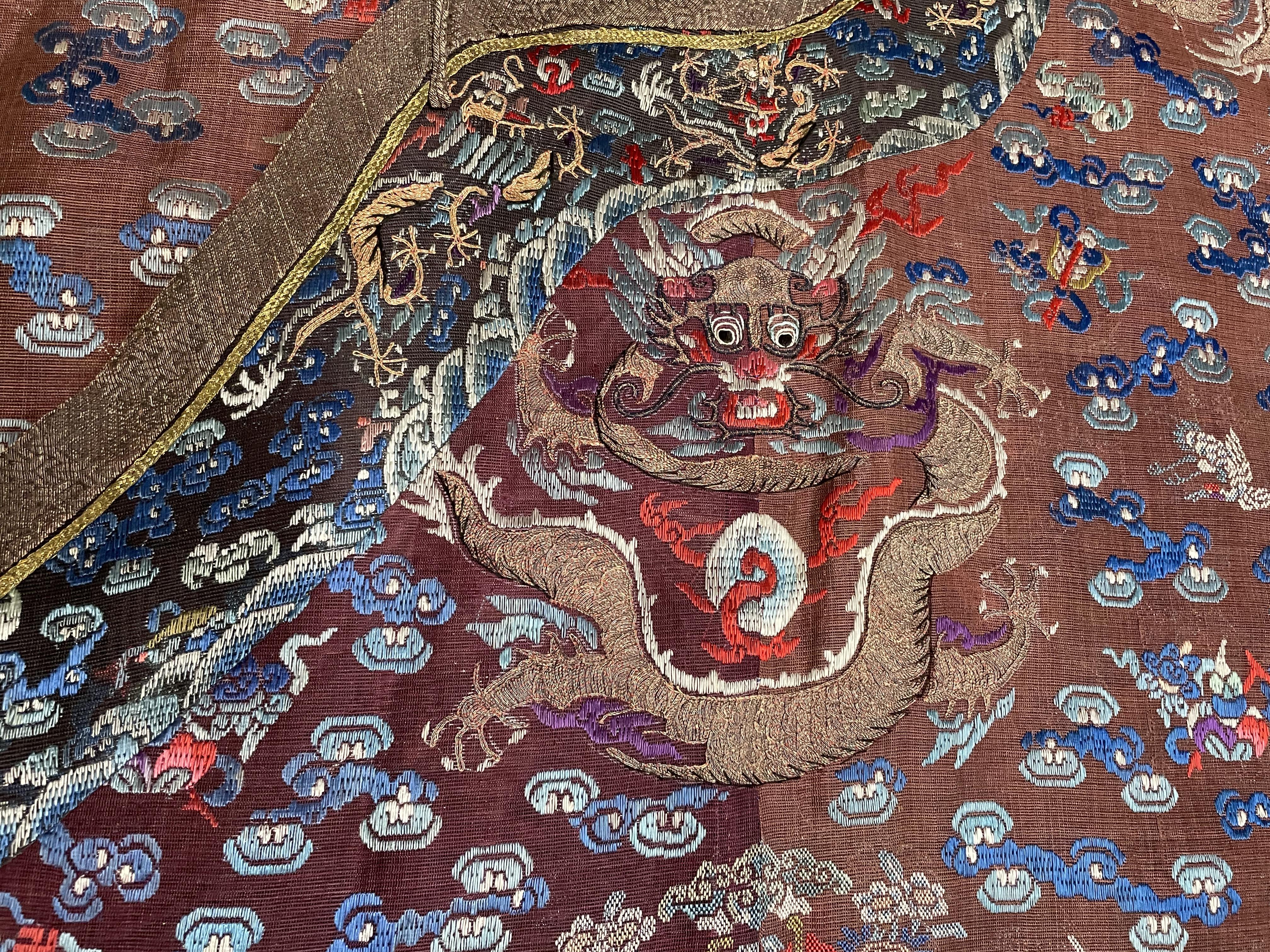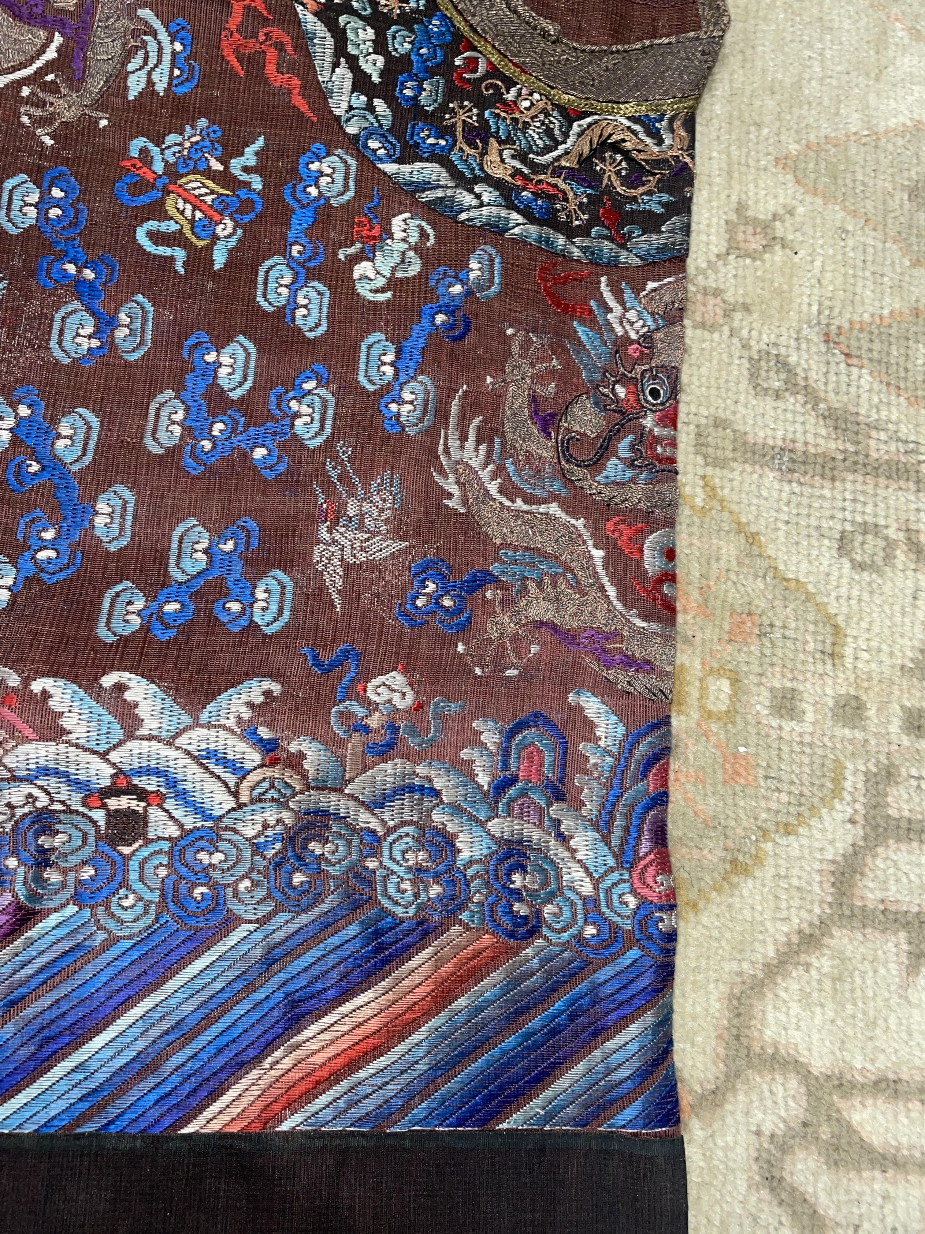 此褐地龙袍应为清代中晚期,品相尚可。此件龙袍是清代袍服中的一种,以盘金绣龙纹为主体,如意云、鹤、八宝、蝙蝠、海水五彩绣为辐的比较长见的官服纹饰搭配而成。龙袍以明黄等级最高,他带代表着皇权的向征,其它颜色次之,清代宫廷有严格制式!