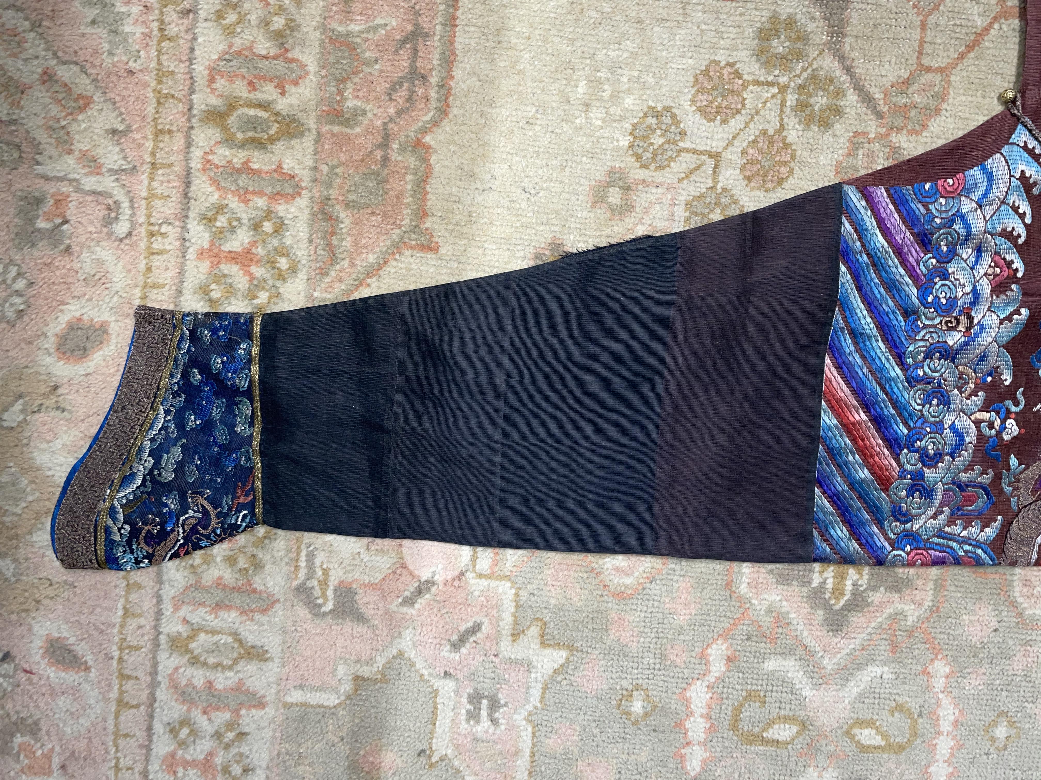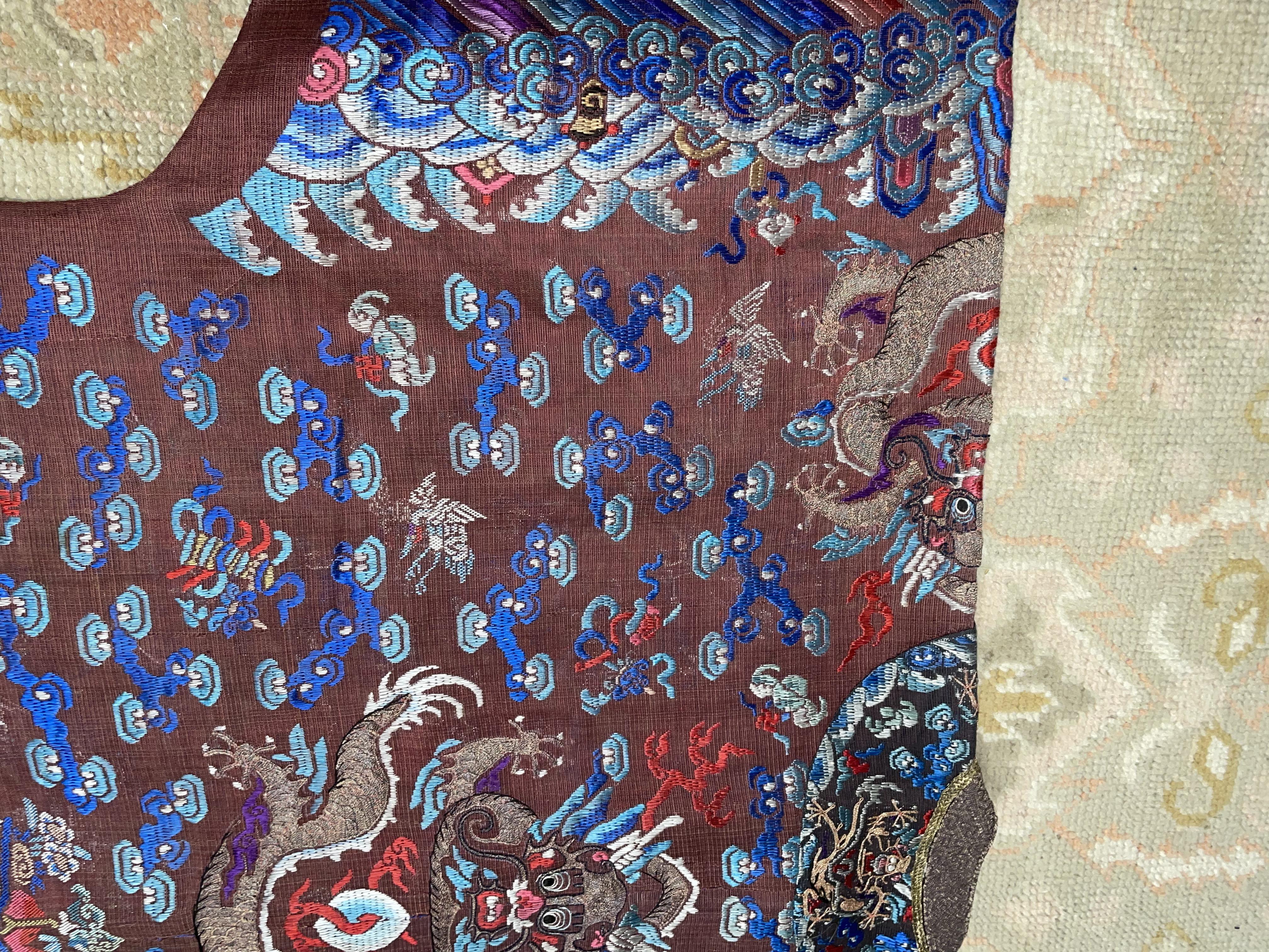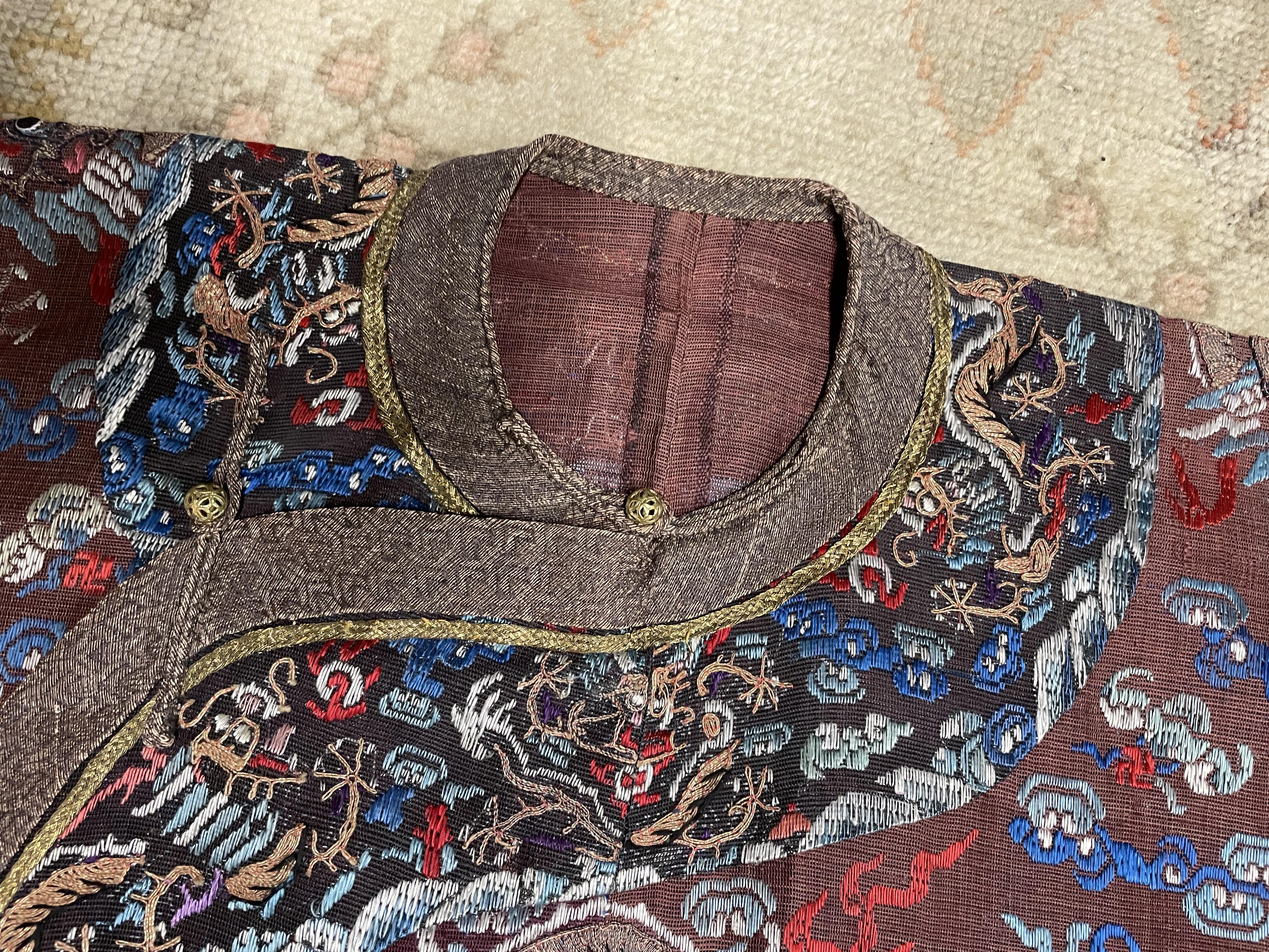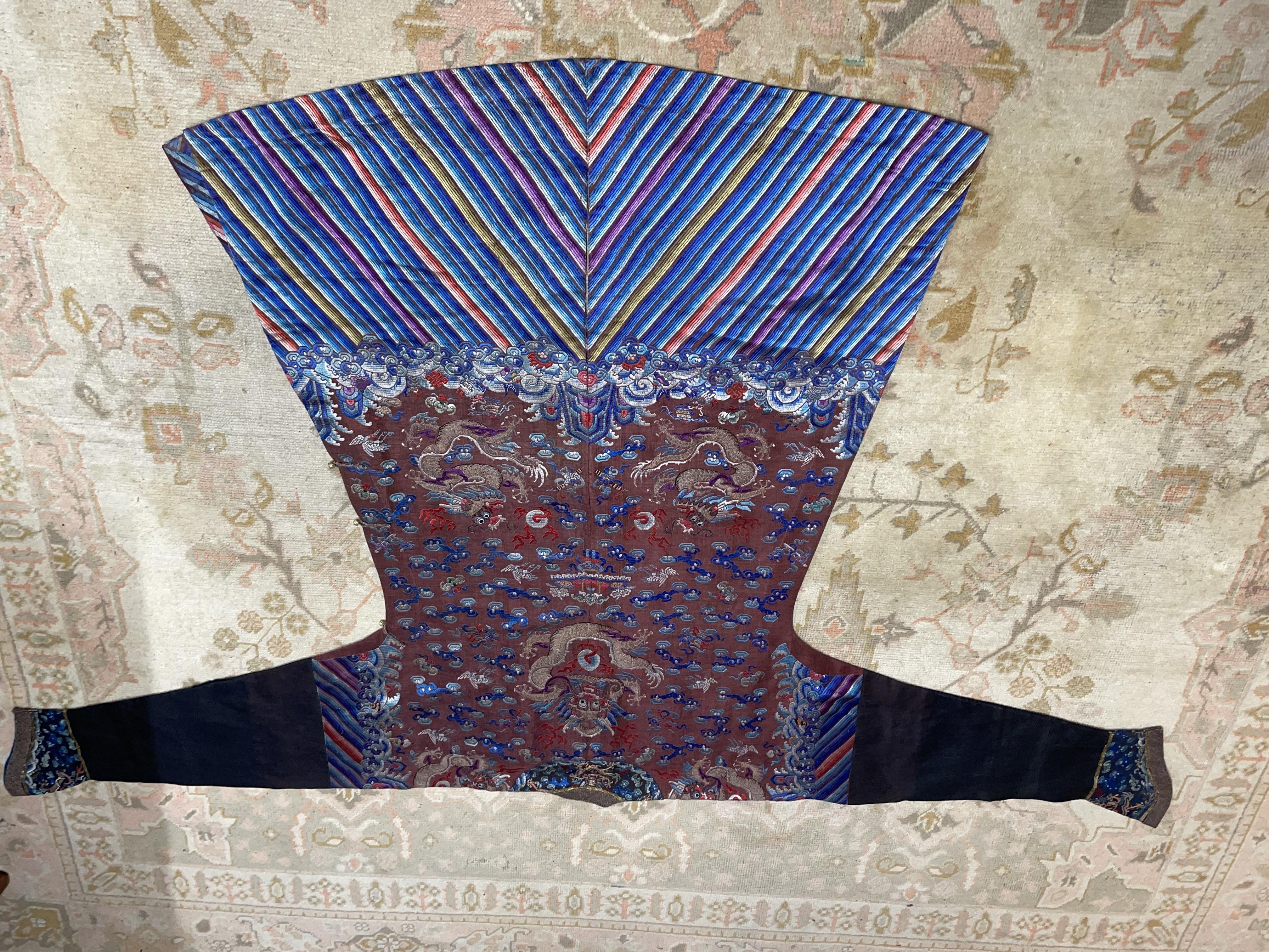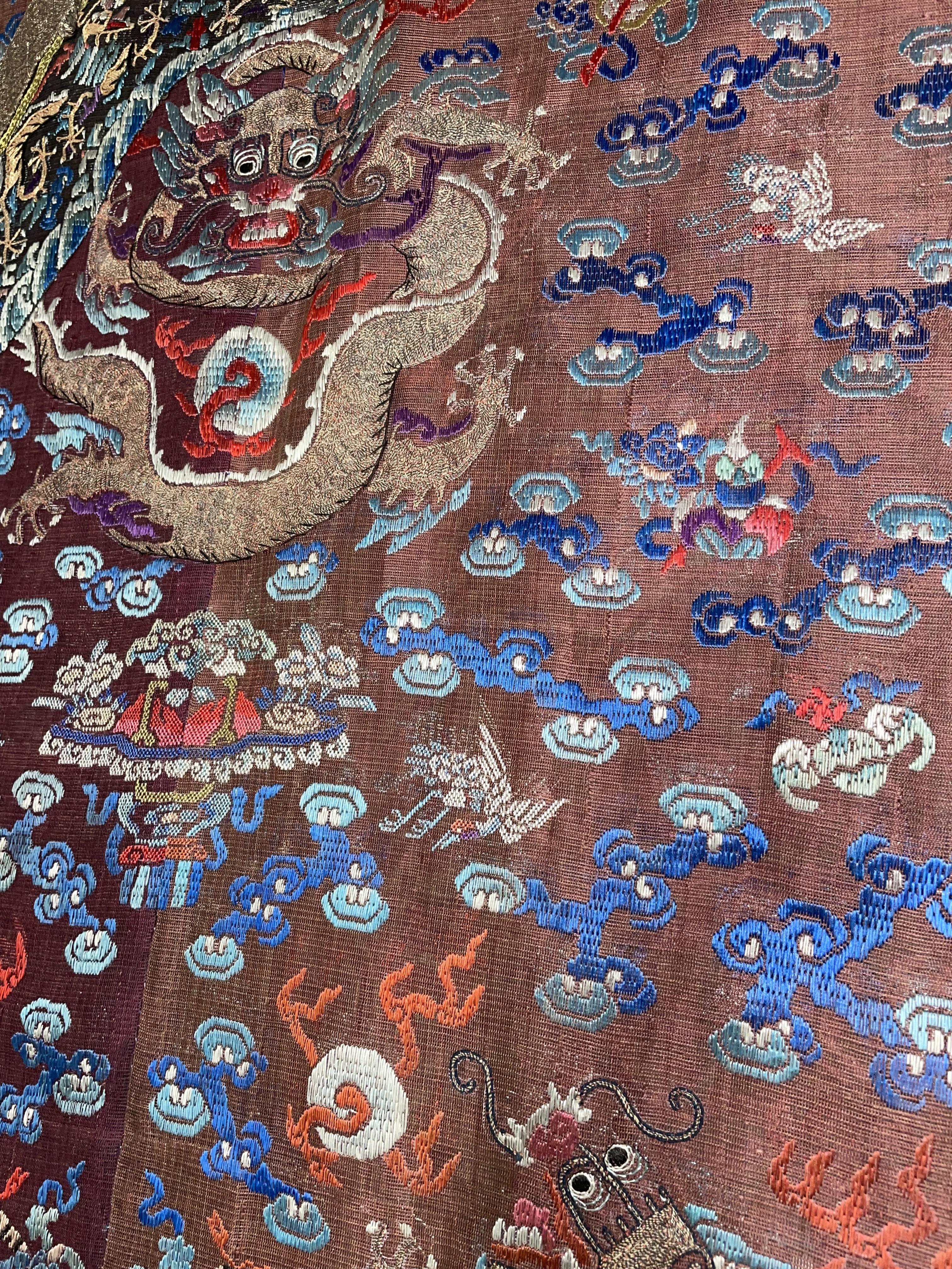 此褐地龙袍应为清代中晚期,品相尚可。此件龙袍是清代袍服中的一种,以盘金绣龙纹为主体,如意云、鹤、八宝、蝙蝠、海水五彩绣为辐的比较长见的官服纹饰搭配而成。龙袍以明黄等级最高,他带代表着皇权的向征,其它颜色次之,清代宫廷有严格制式!