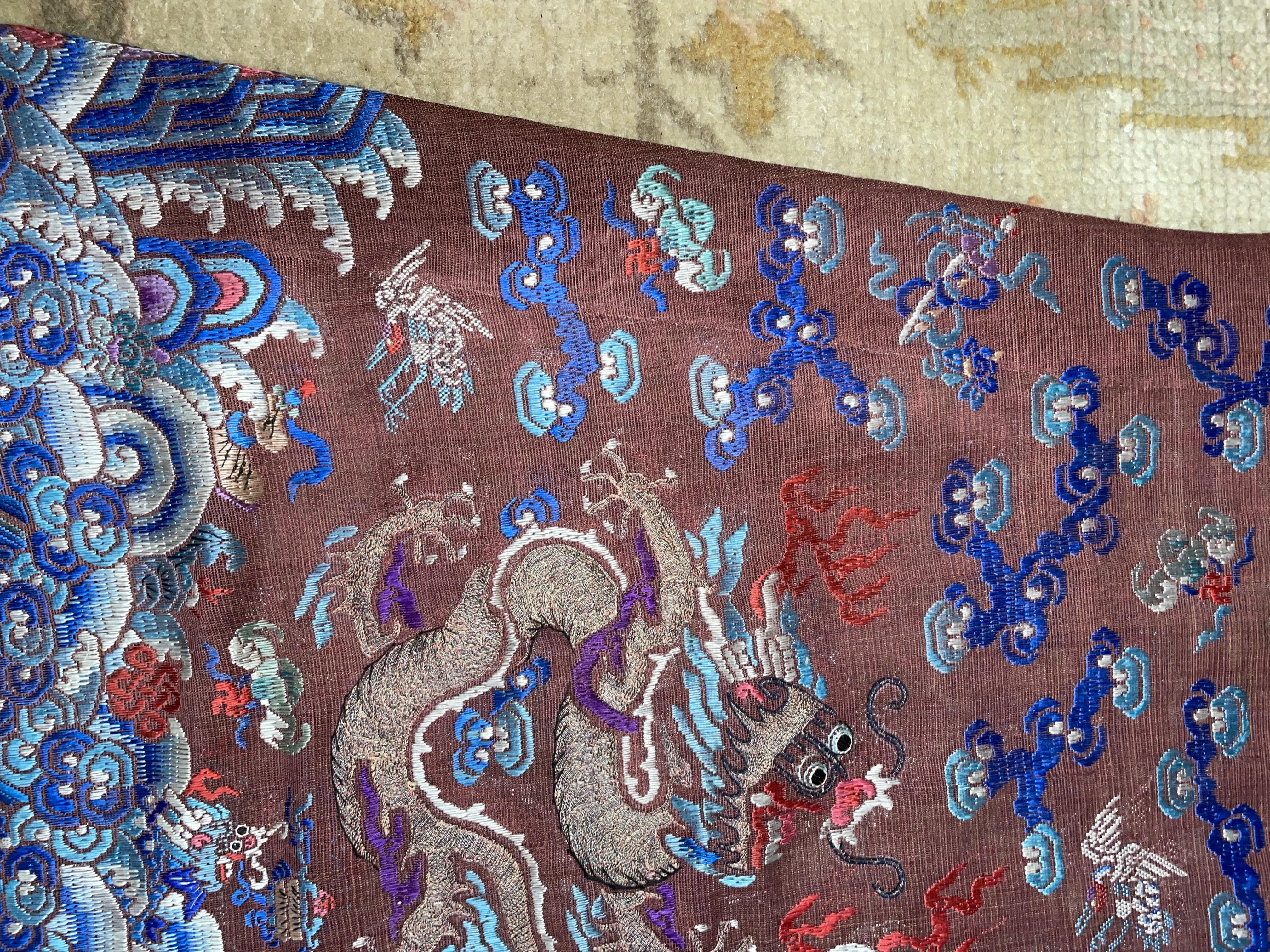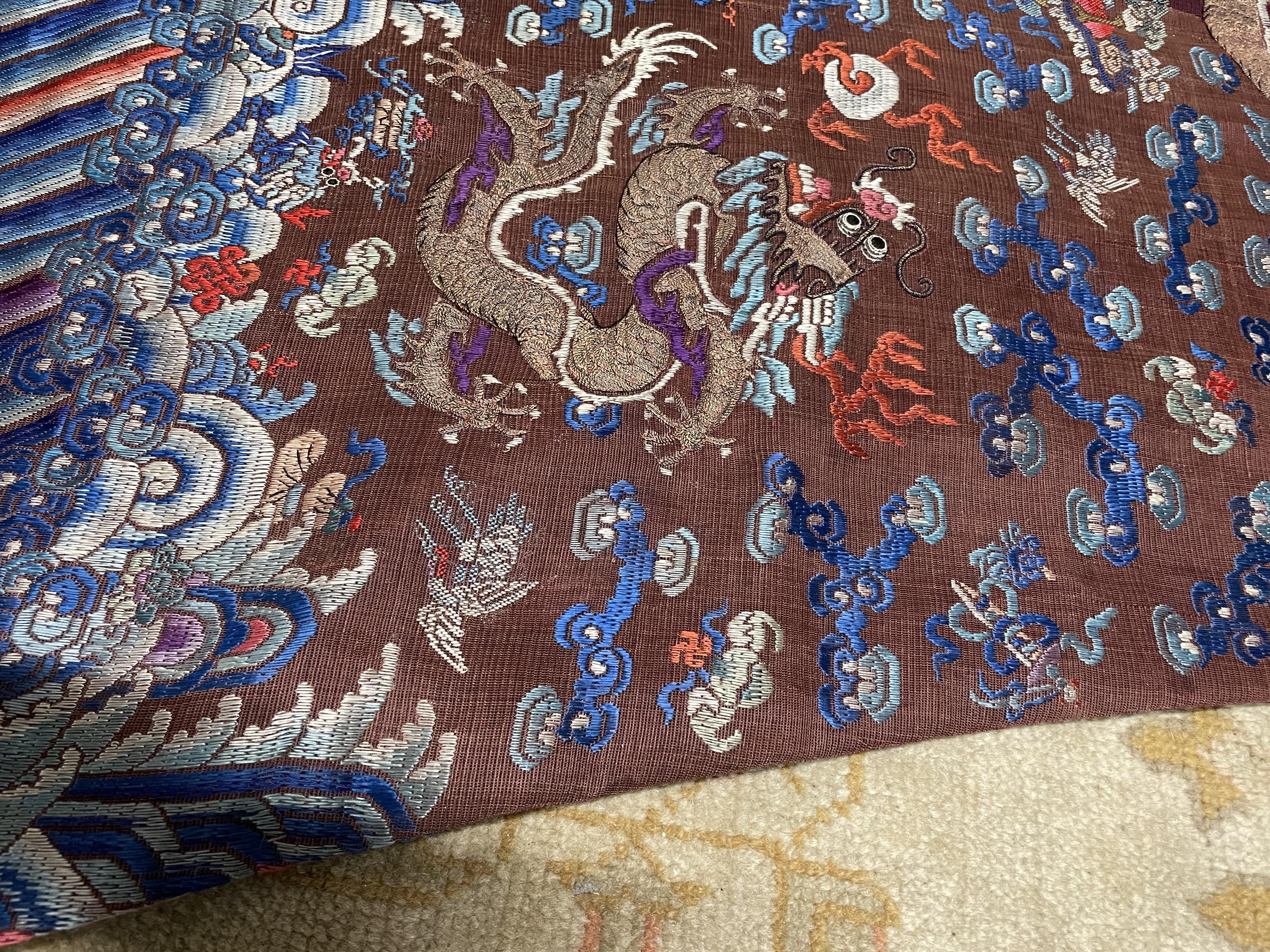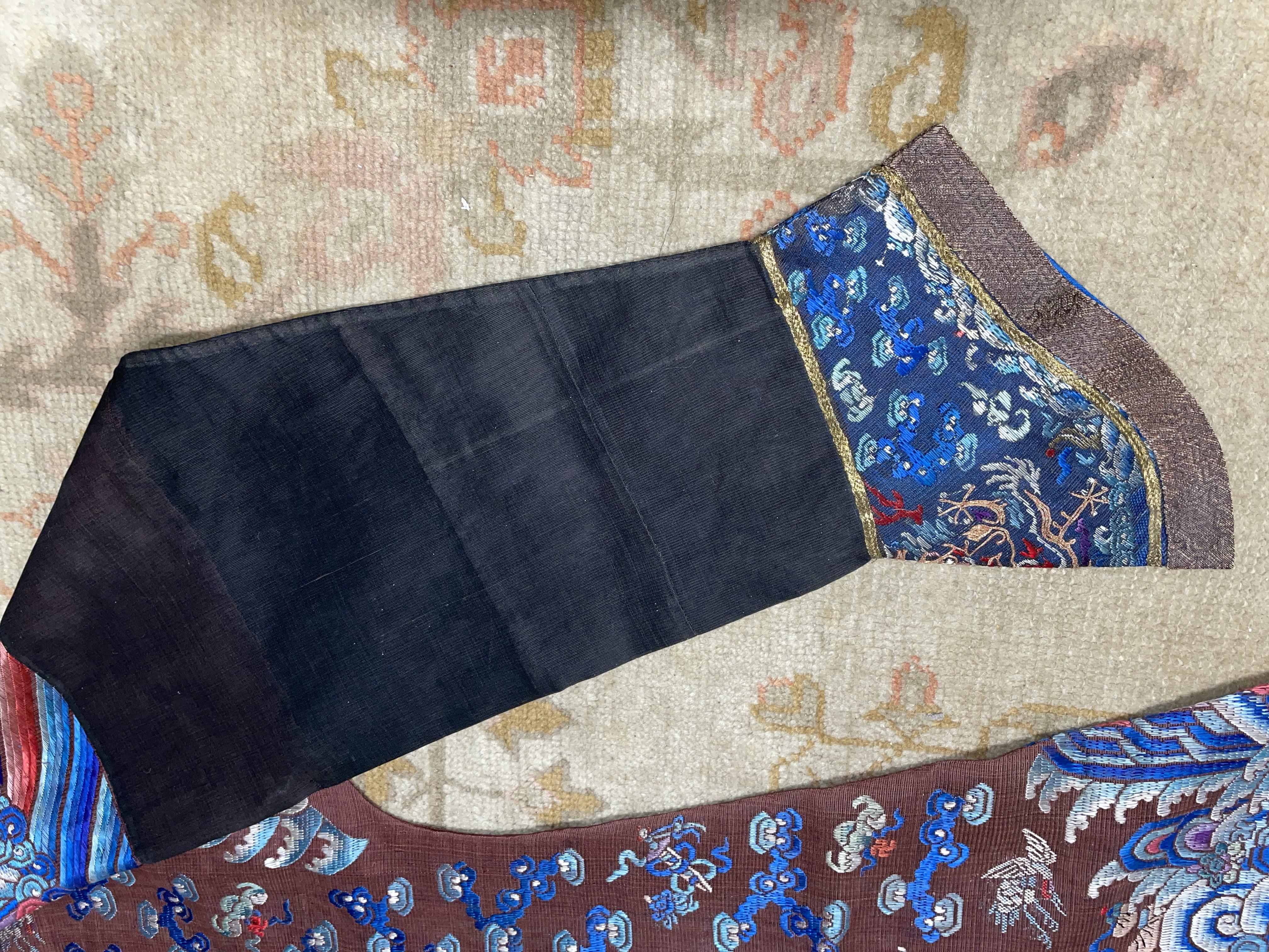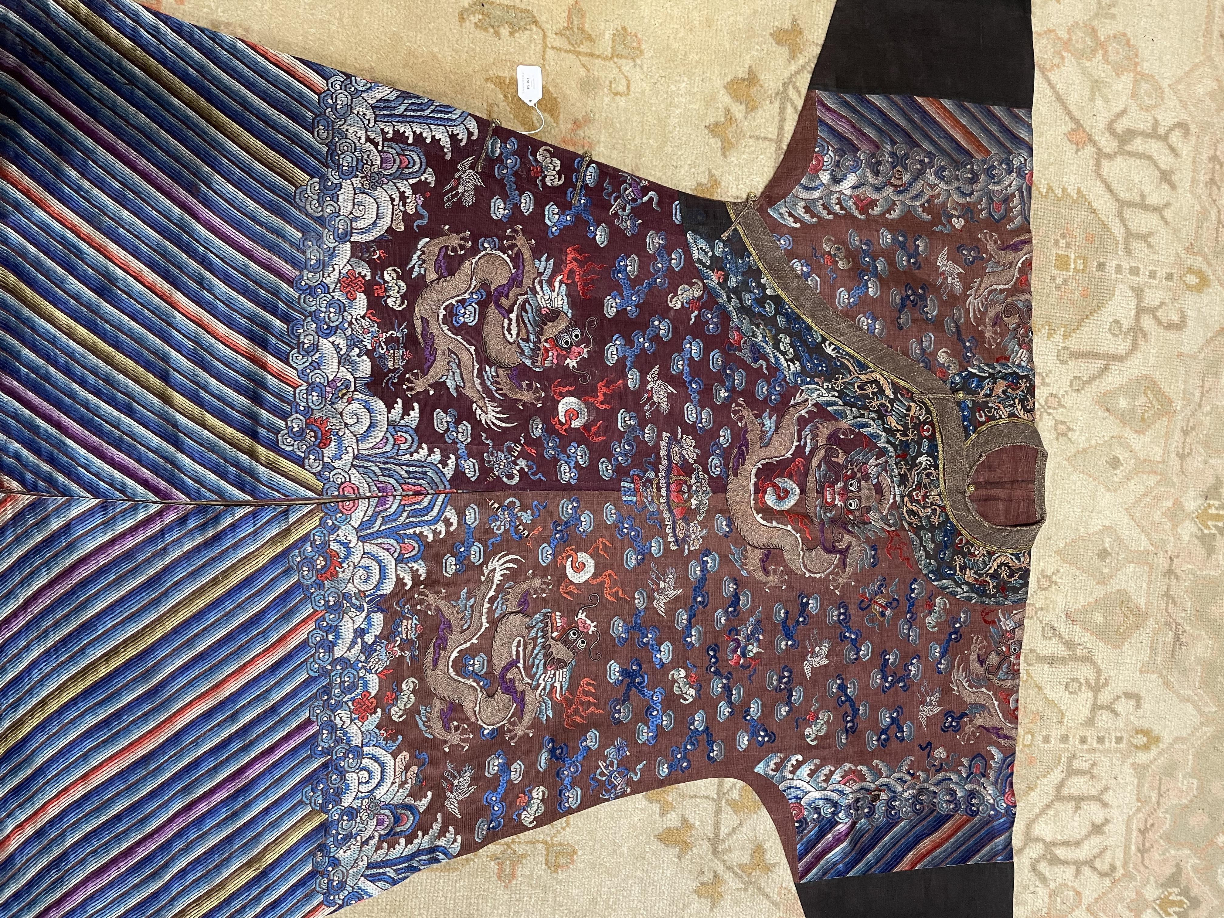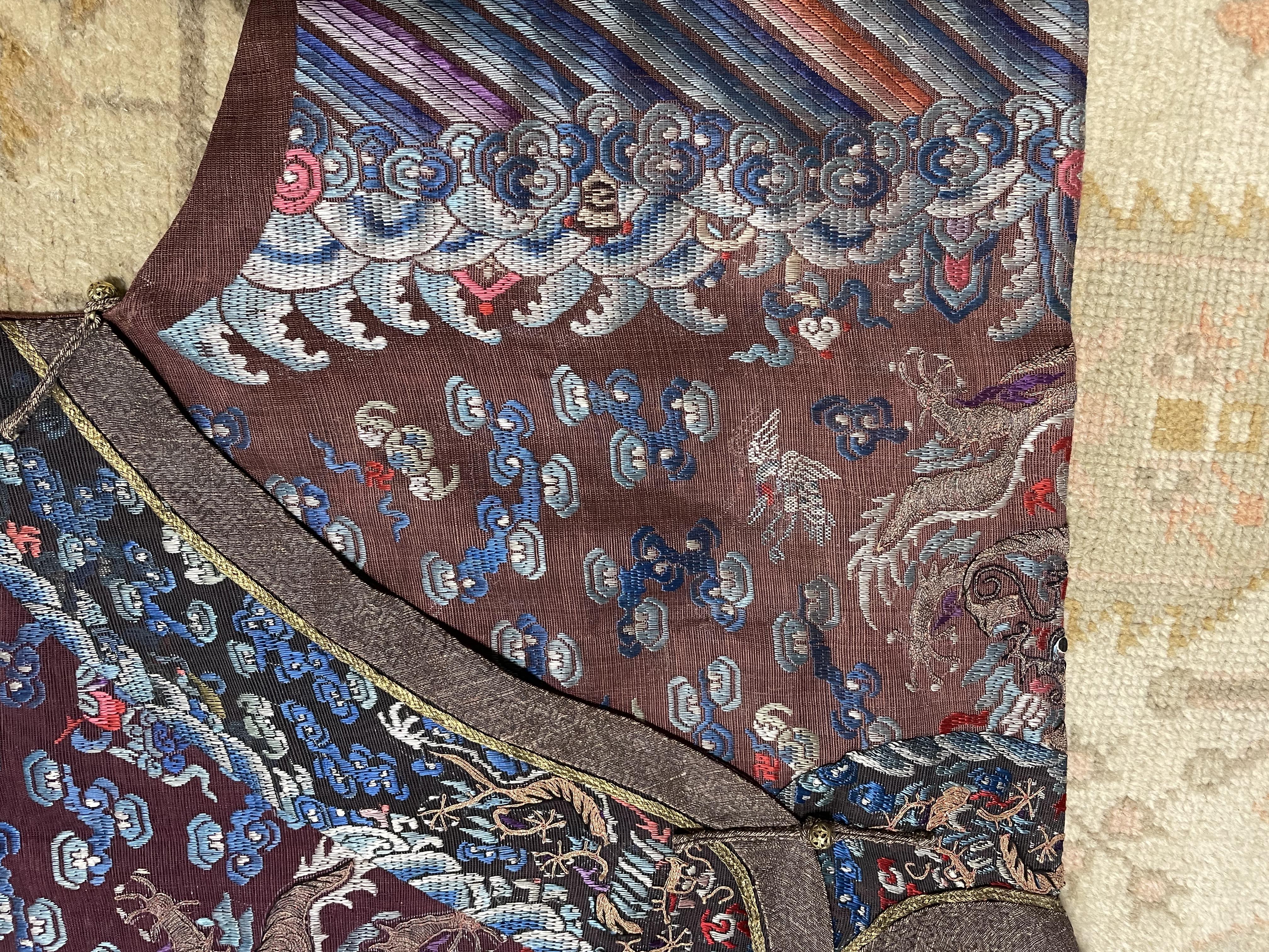 此褐地龙袍应为清代中晚期,品相尚可。此件龙袍是清代袍服中的一种,以盘金绣龙纹为主体,如意云、鹤、八宝、蝙蝠、海水五彩绣为辐的比较长见的官服纹饰搭配而成。龙袍以明黄等级最高,他带代表着皇权的向征,其它颜色次之,清代宫廷有严格制式!