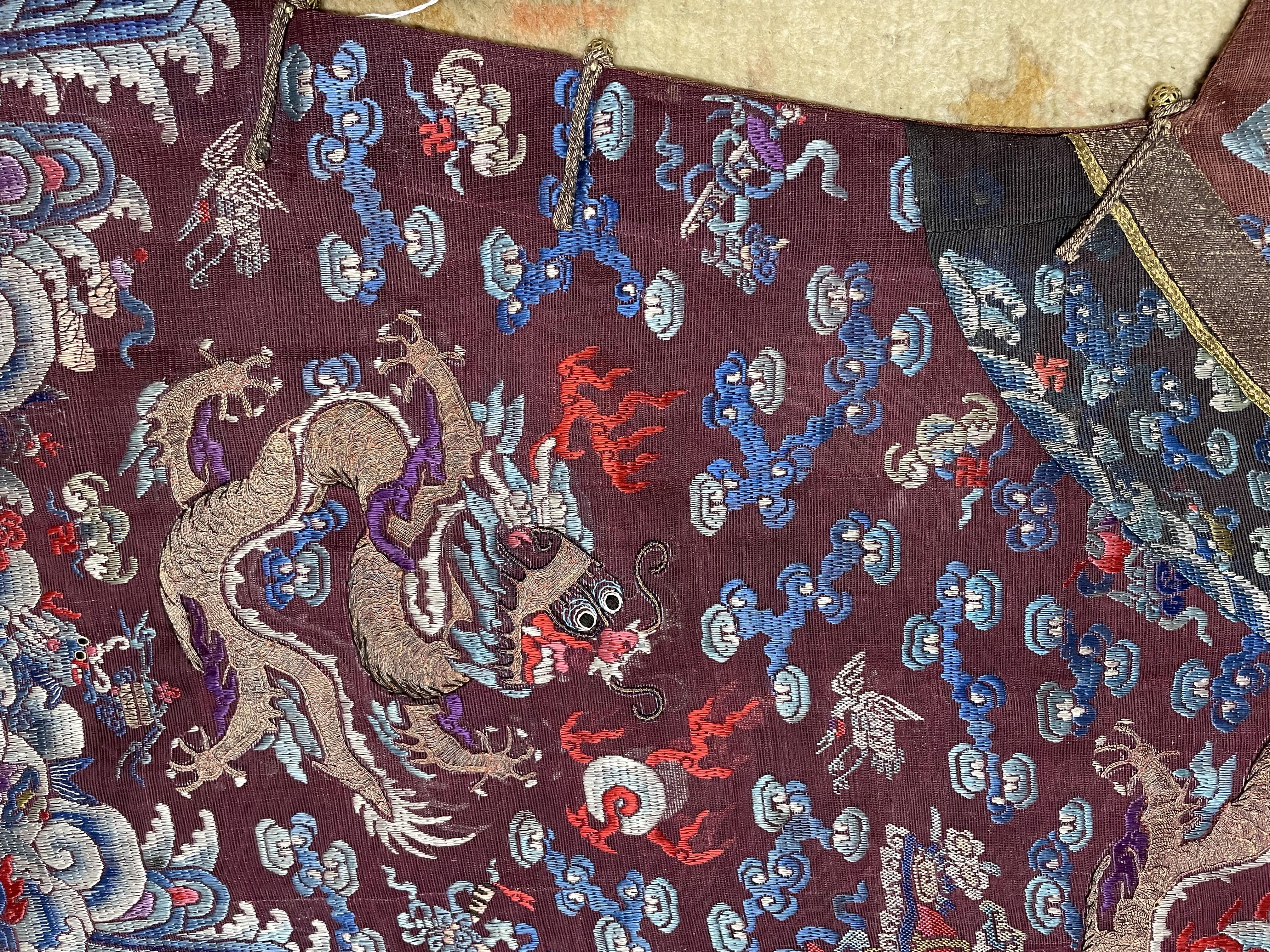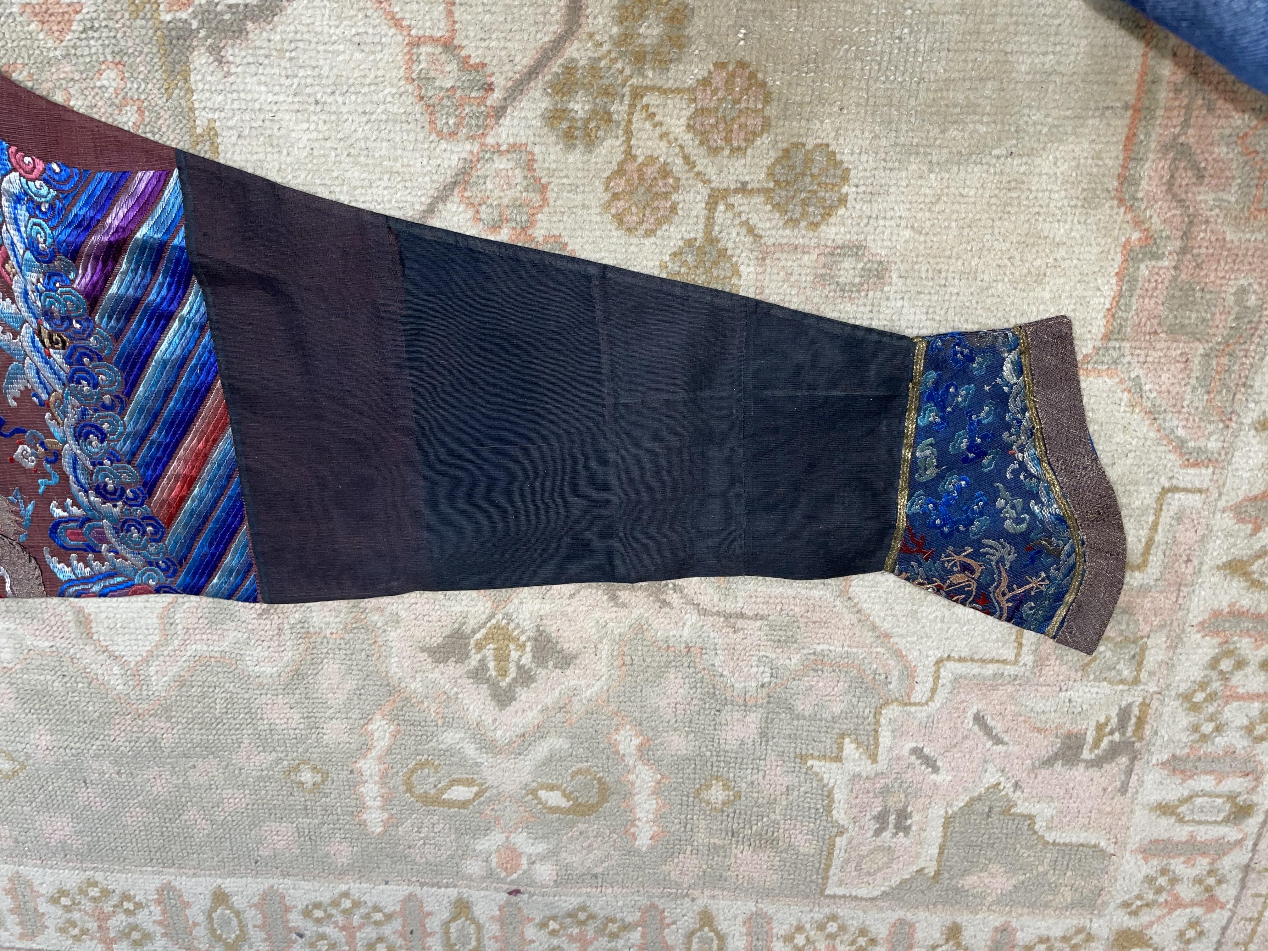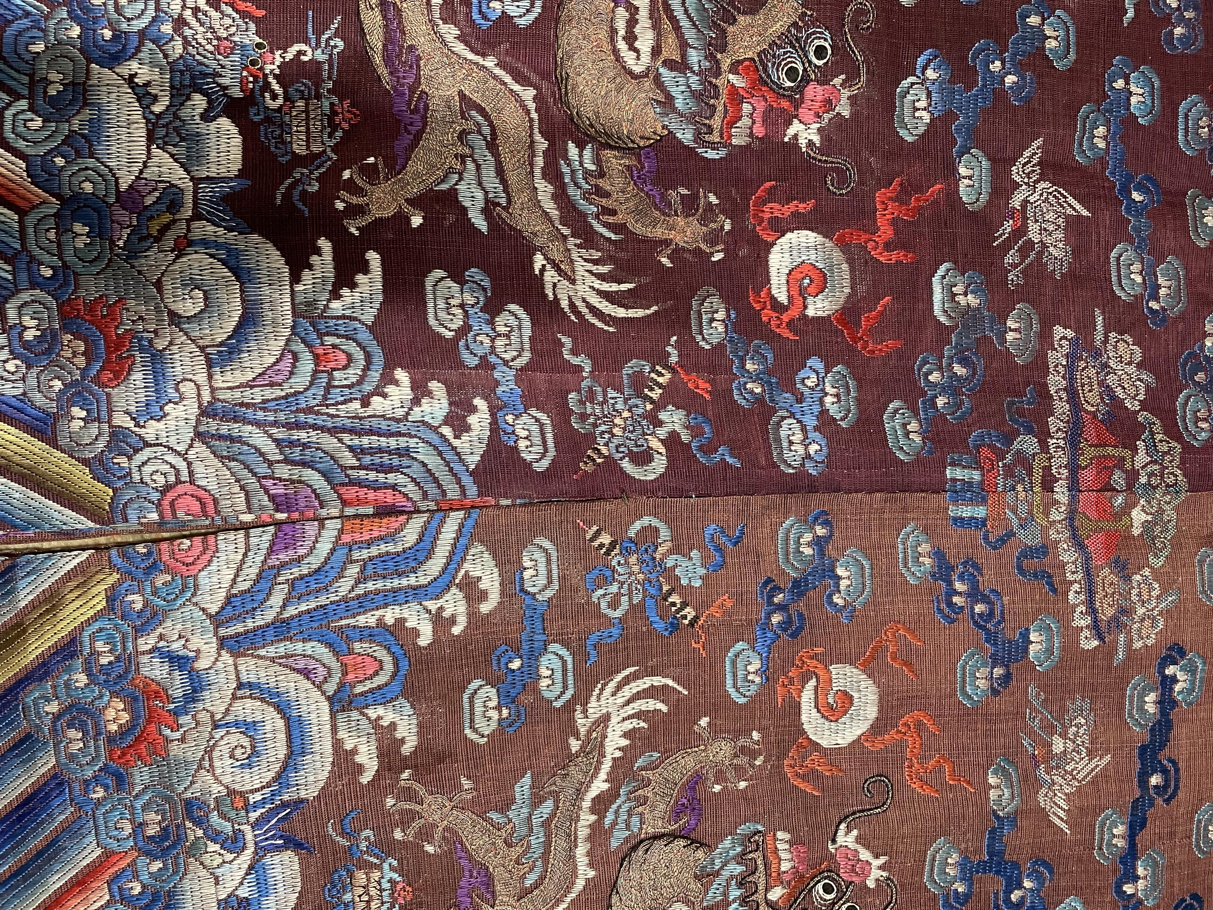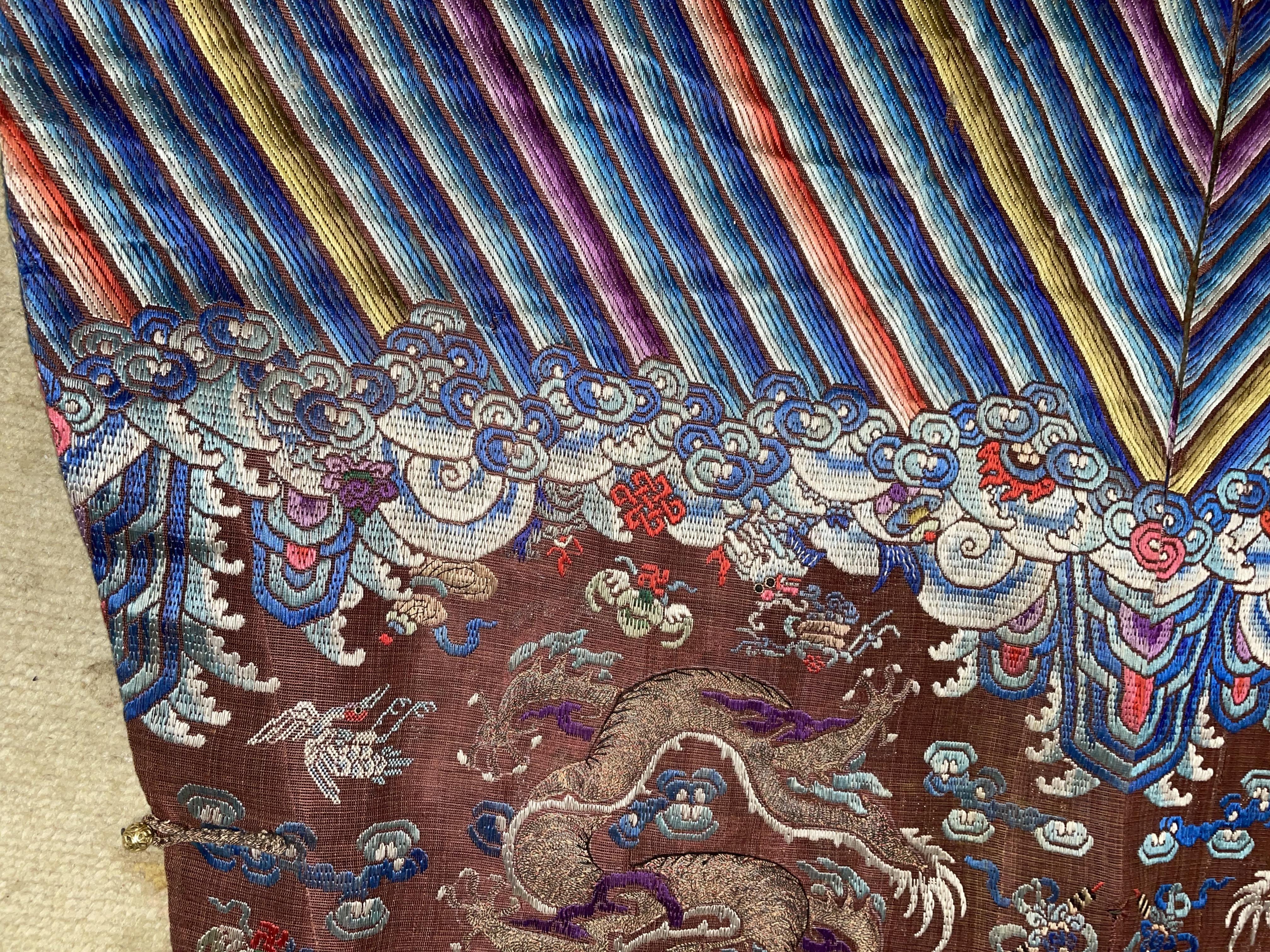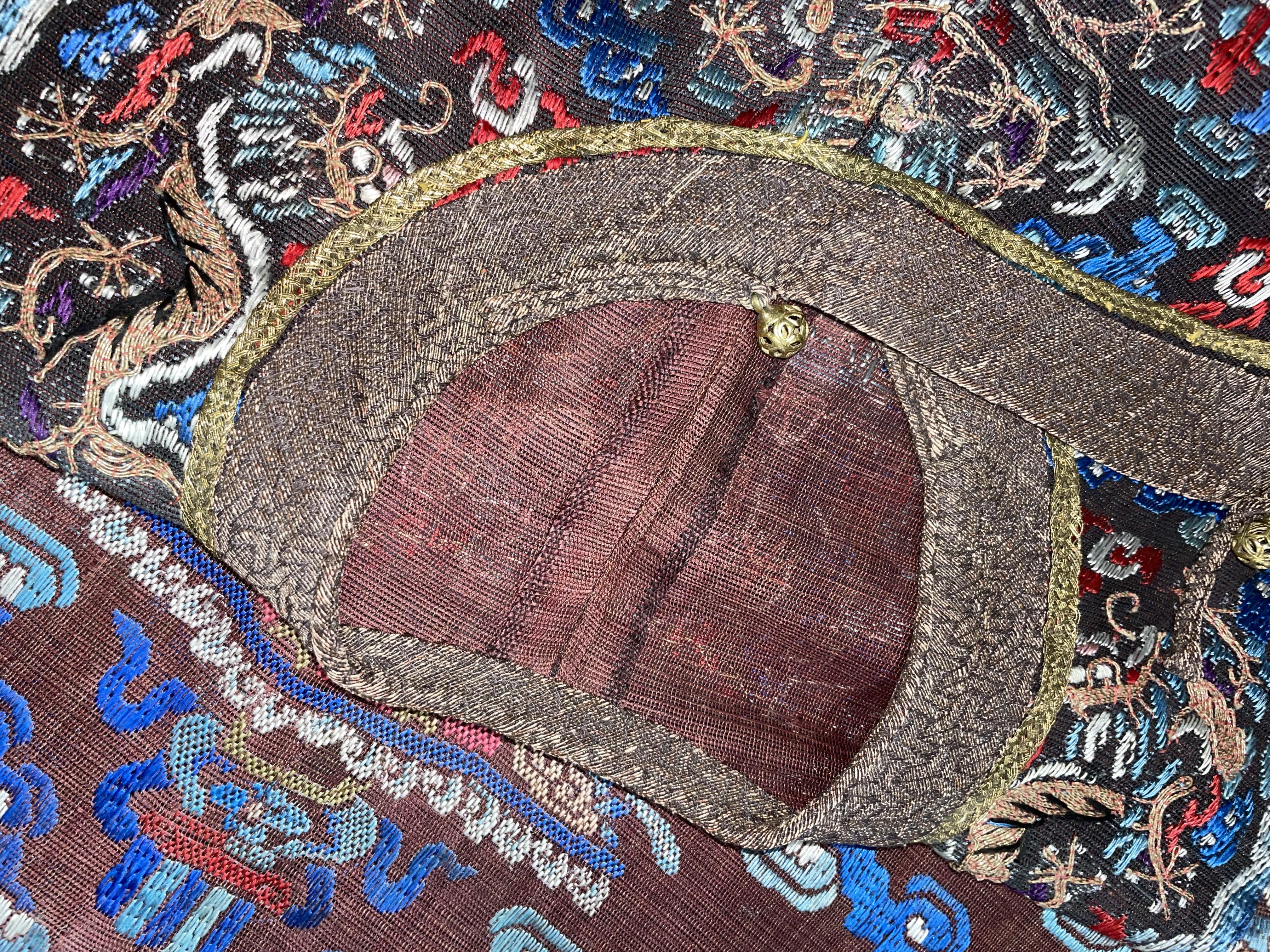 此褐地龙袍应为清代中晚期,品相尚可。此件龙袍是清代袍服中的一种,以盘金绣龙纹为主体,如意云、鹤、八宝、蝙蝠、海水五彩绣为辐的比较长见的官服纹饰搭配而成。龙袍以明黄等级最高,他带代表着皇权的向征,其它颜色次之,清代宫廷有严格制式!