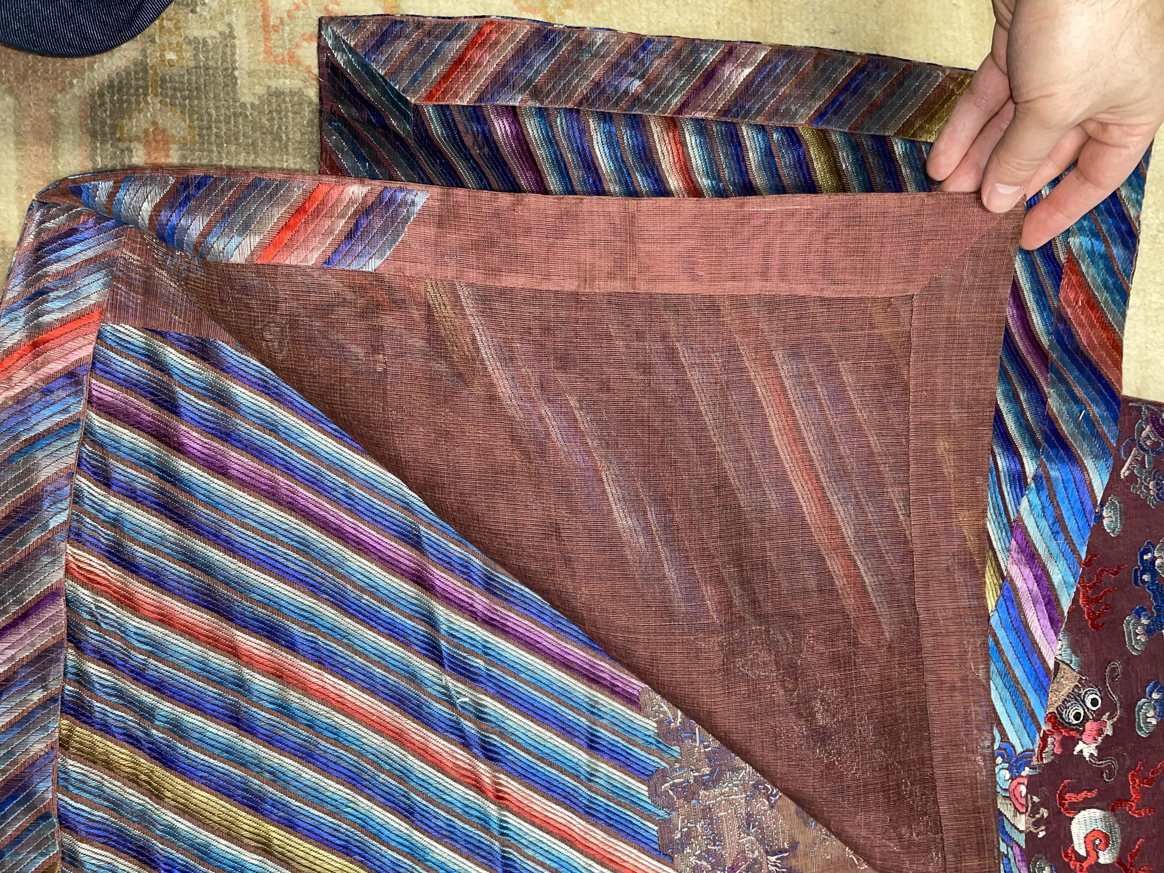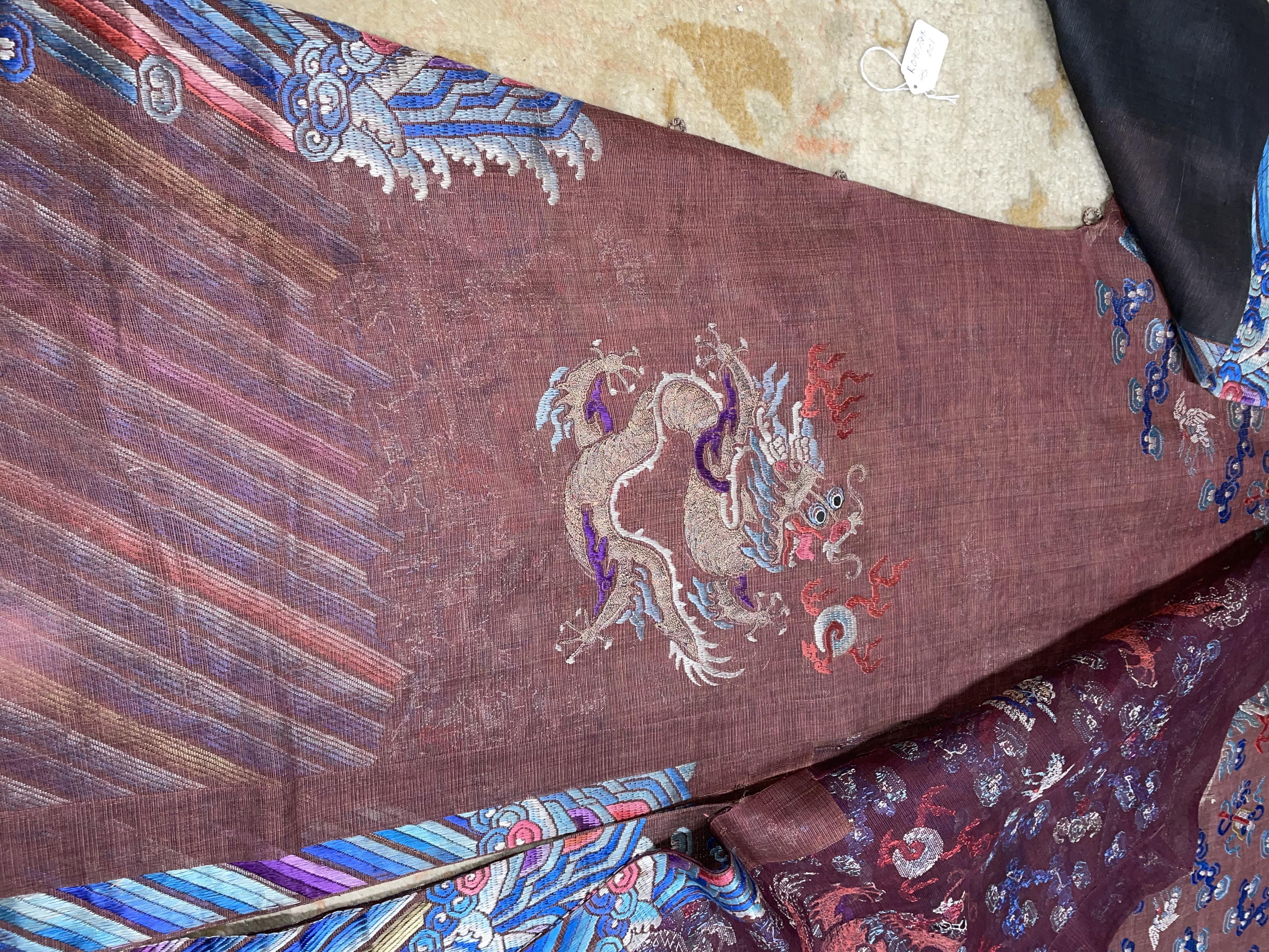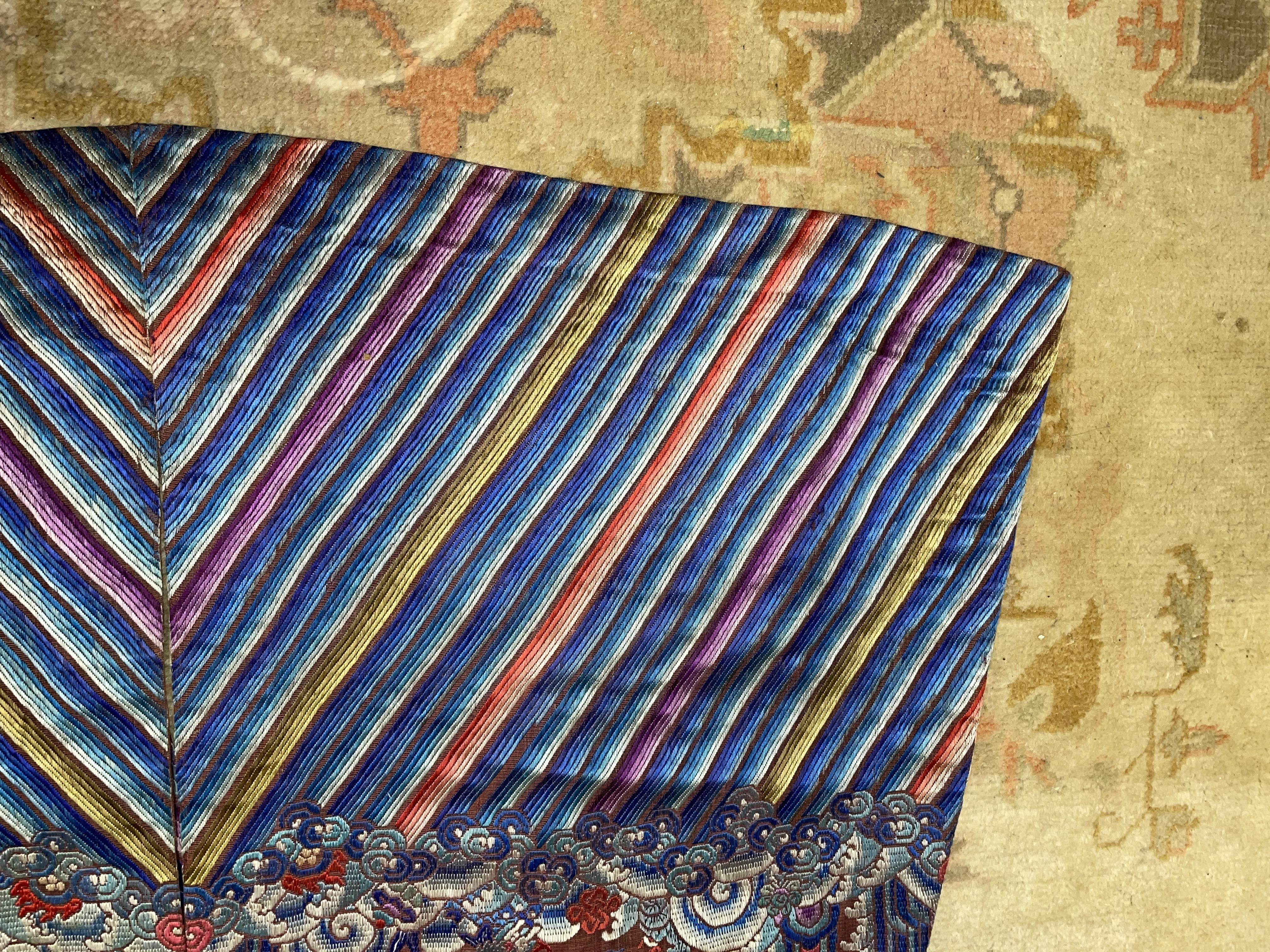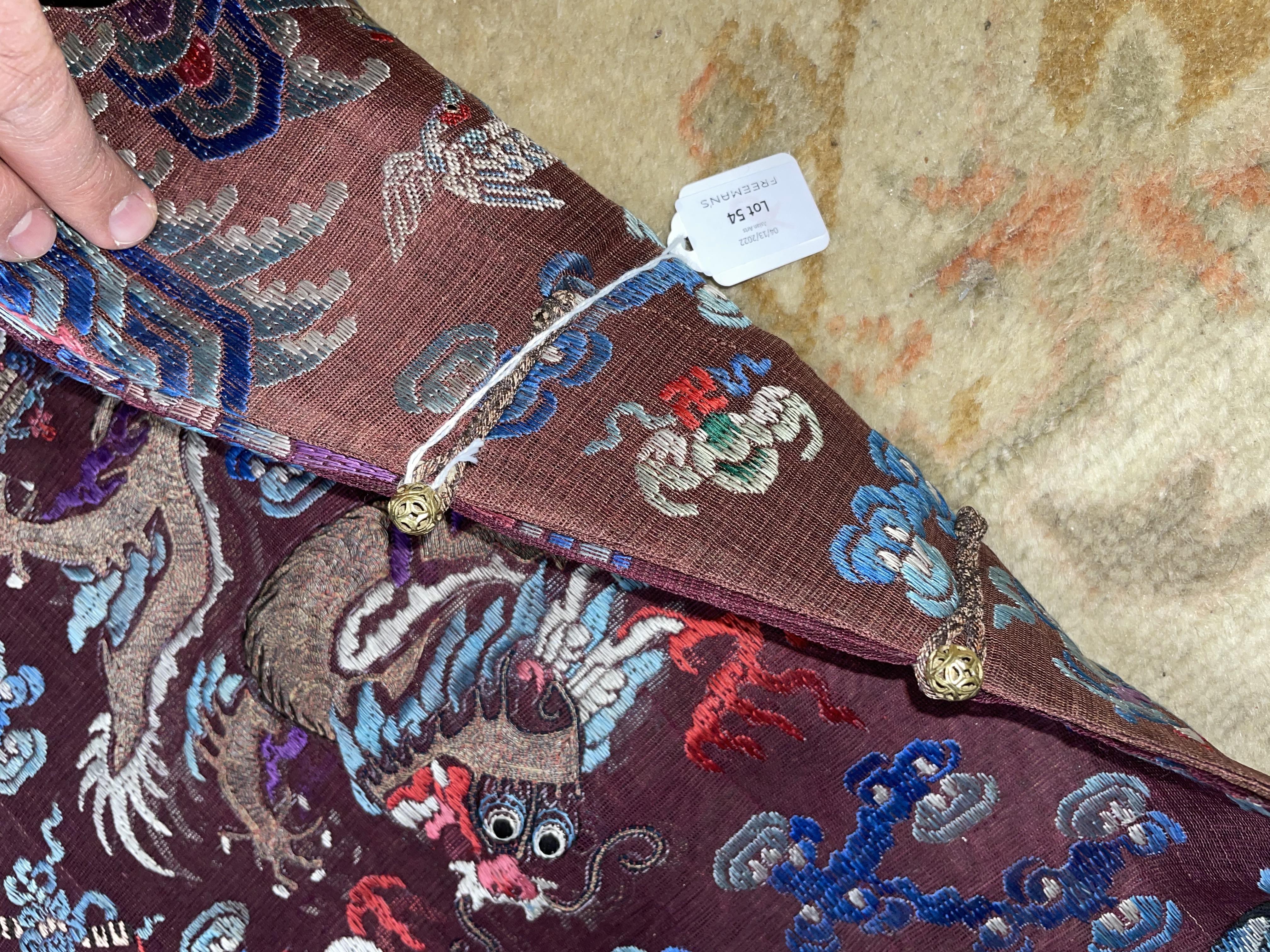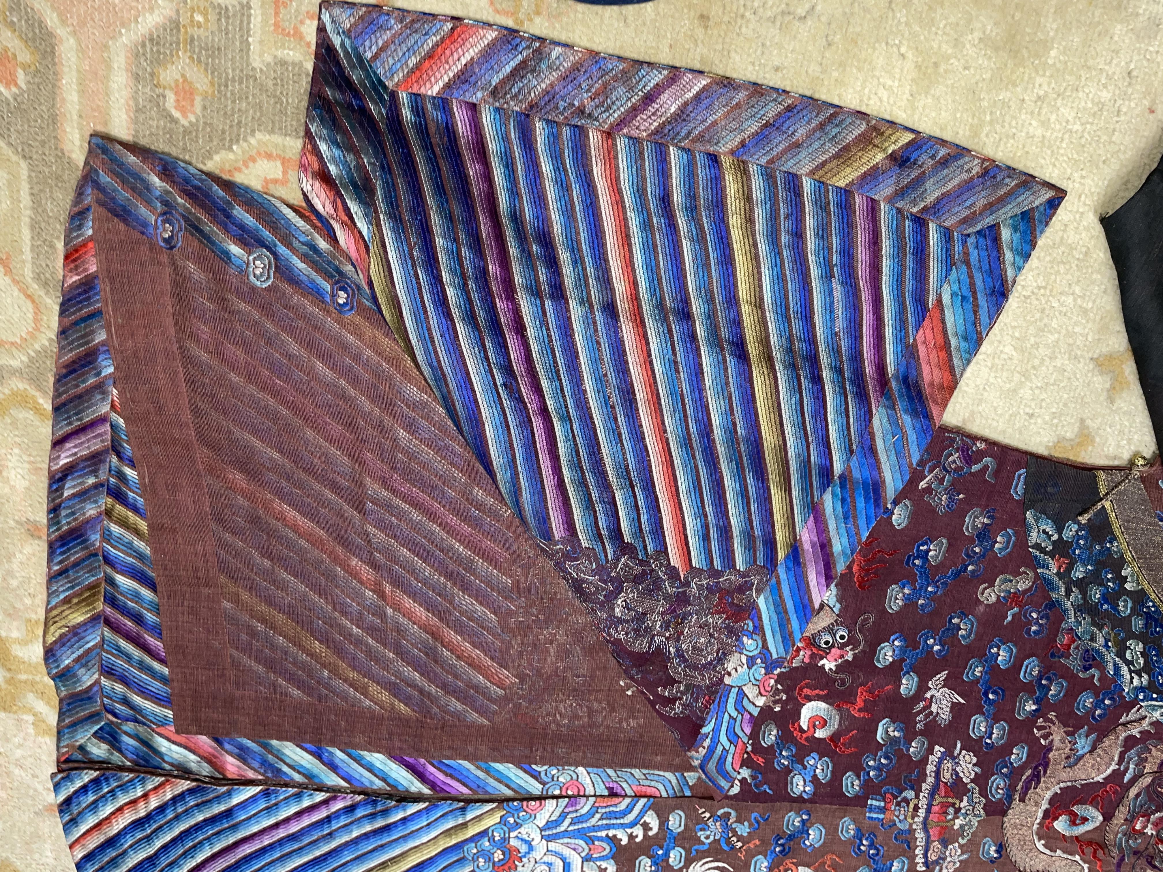 此褐地龙袍应为清代中晚期,品相尚可。此件龙袍是清代袍服中的一种,以盘金绣龙纹为主体,如意云、鹤、八宝、蝙蝠、海水五彩绣为辐的比较长见的官服纹饰搭配而成。龙袍以明黄等级最高,他带代表着皇权的向征,其它颜色次之,清代宫廷有严格制式!