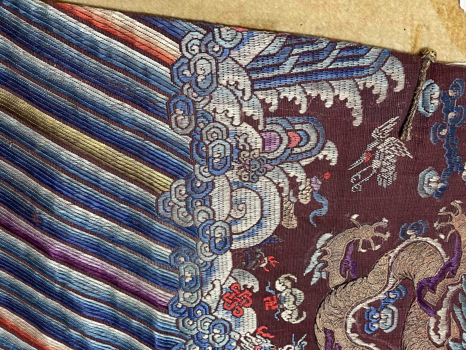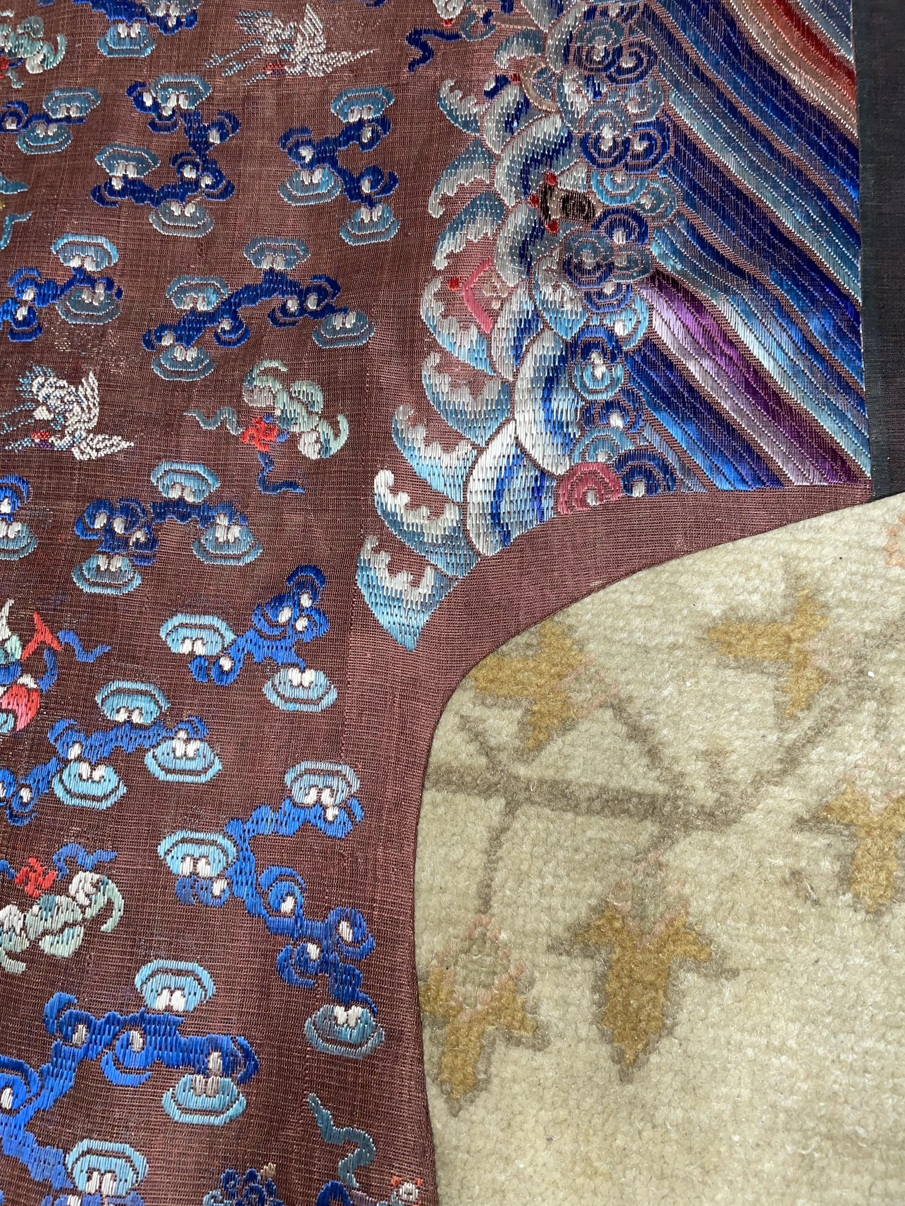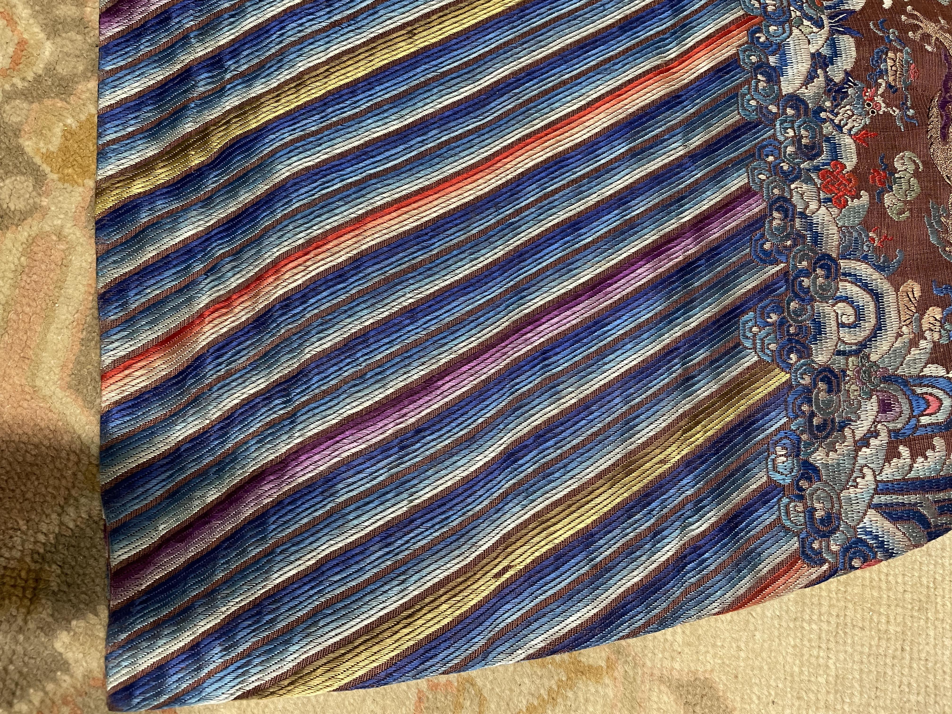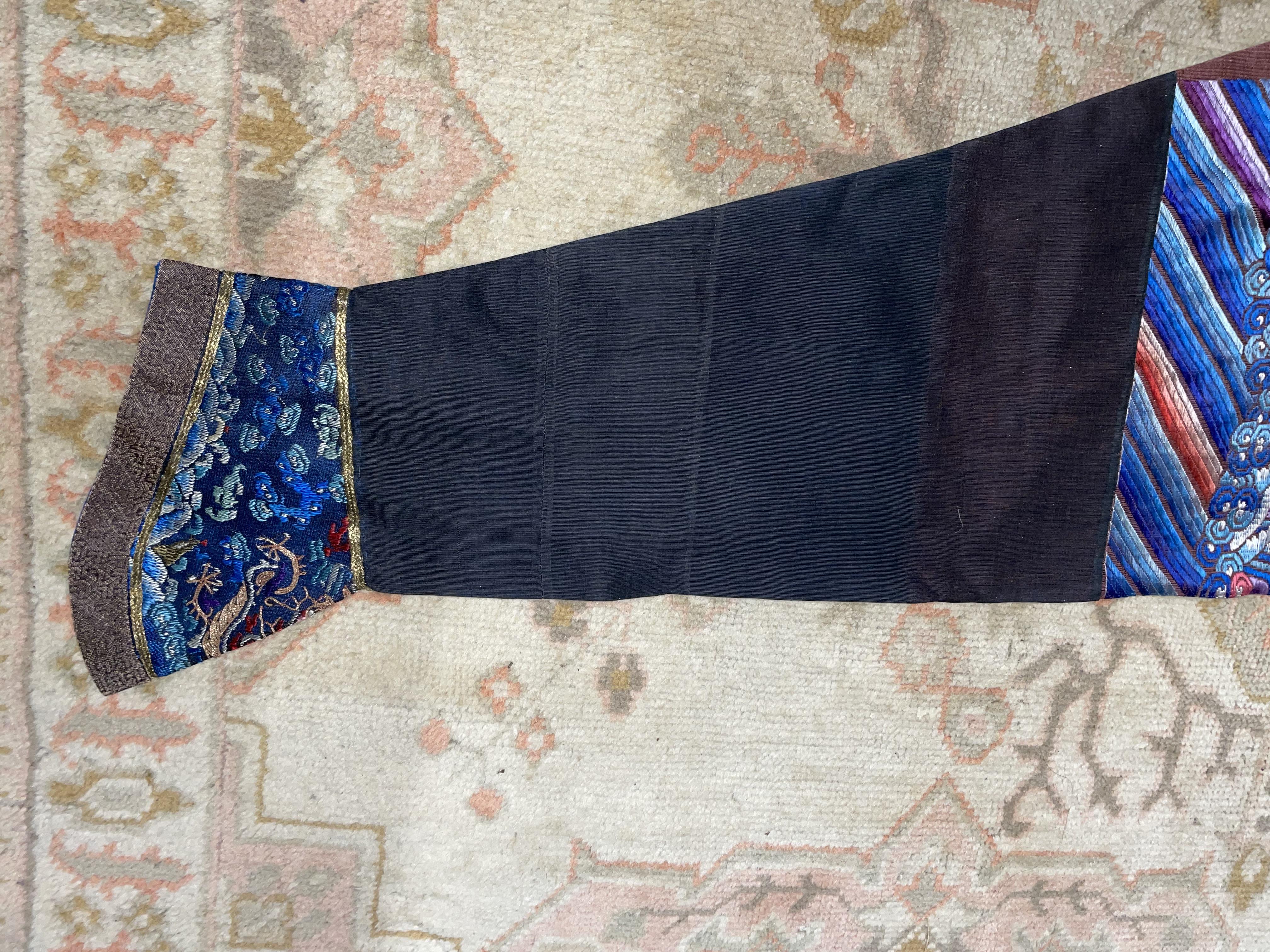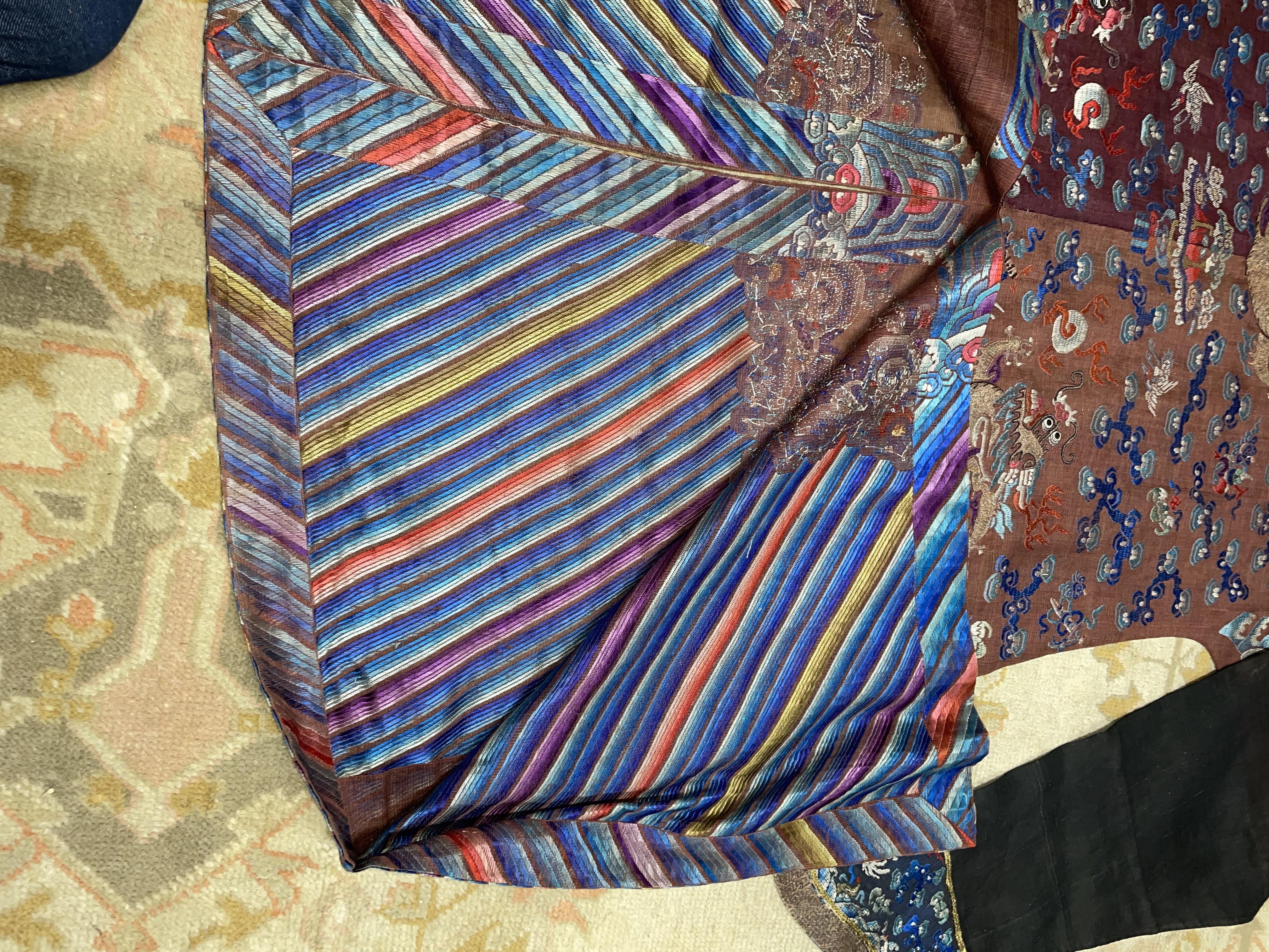 此褐地龙袍应为清代中晚期,品相尚可。此件龙袍是清代袍服中的一种,以盘金绣龙纹为主体,如意云、鹤、八宝、蝙蝠、海水五彩绣为辐的比较长见的官服纹饰搭配而成。龙袍以明黄等级最高,他带代表着皇权的向征,其它颜色次之,清代宫廷有严格制式!