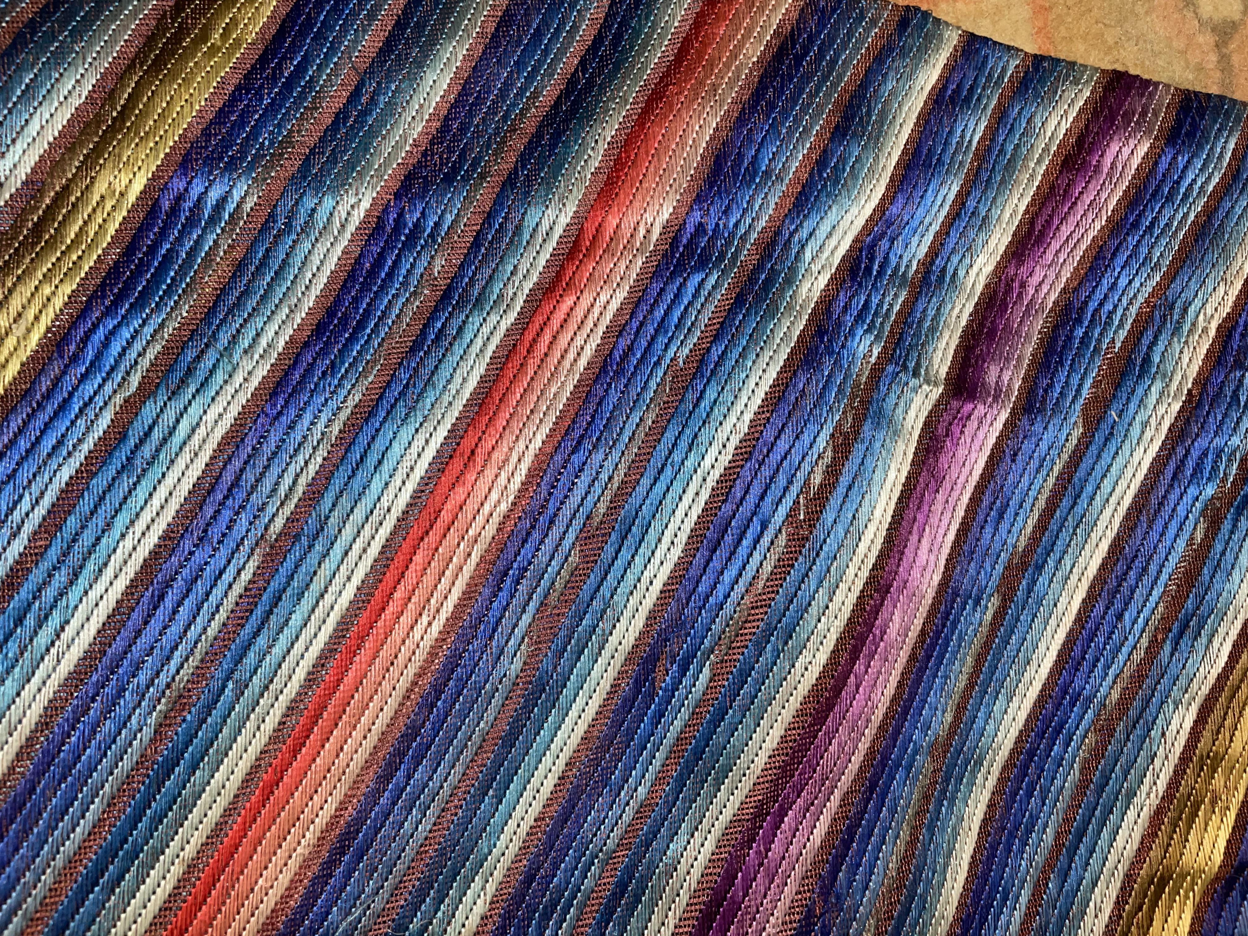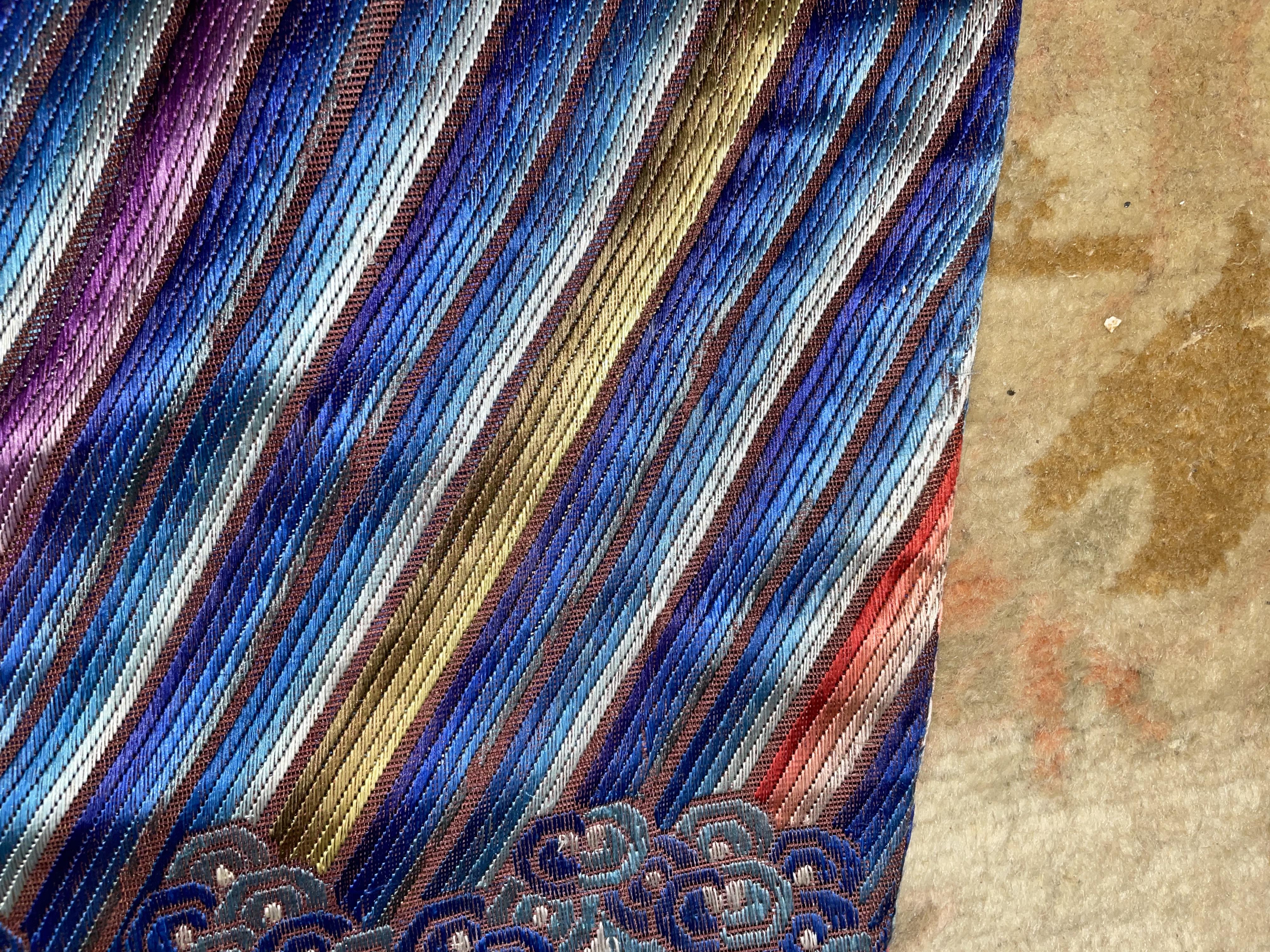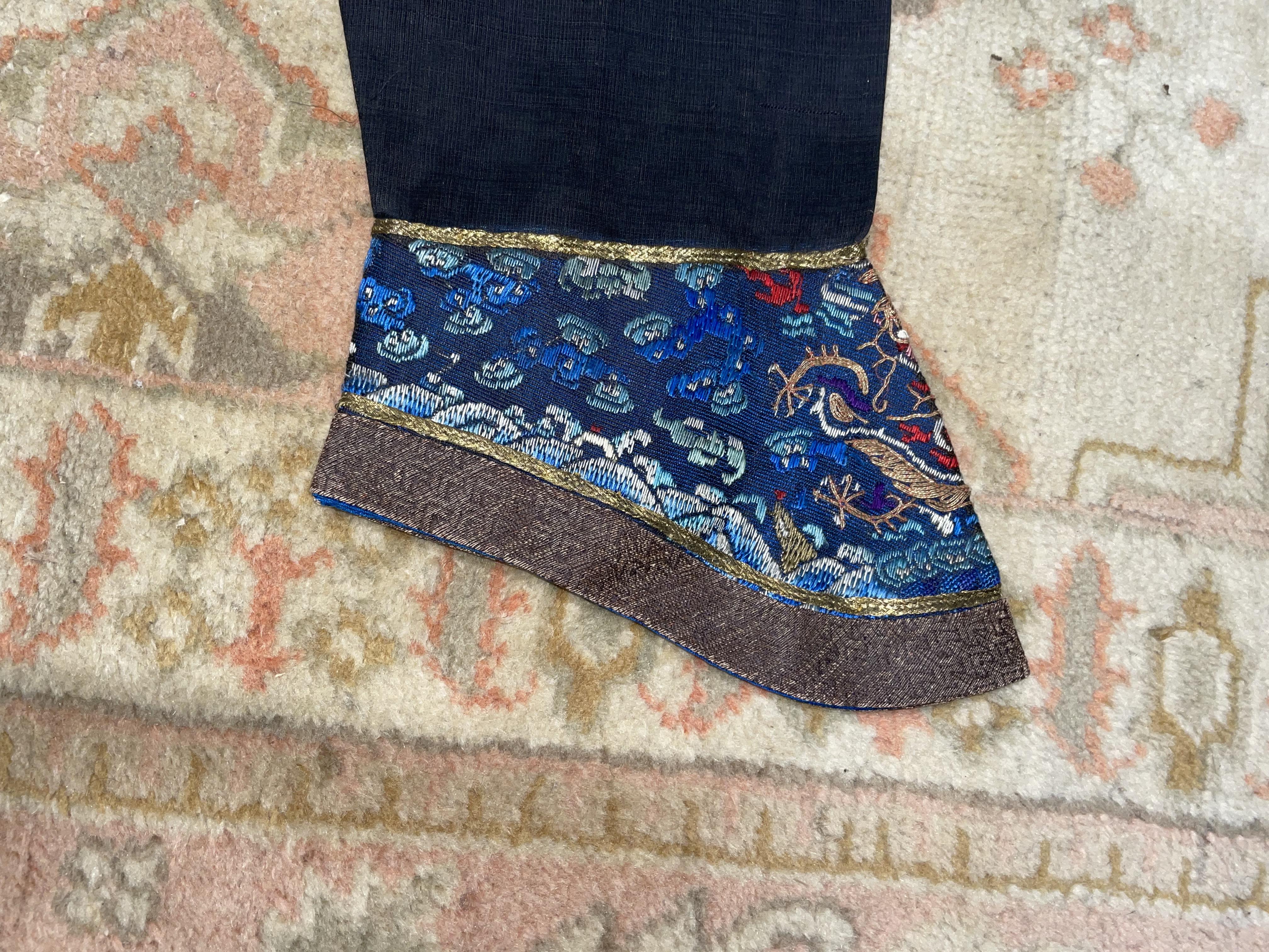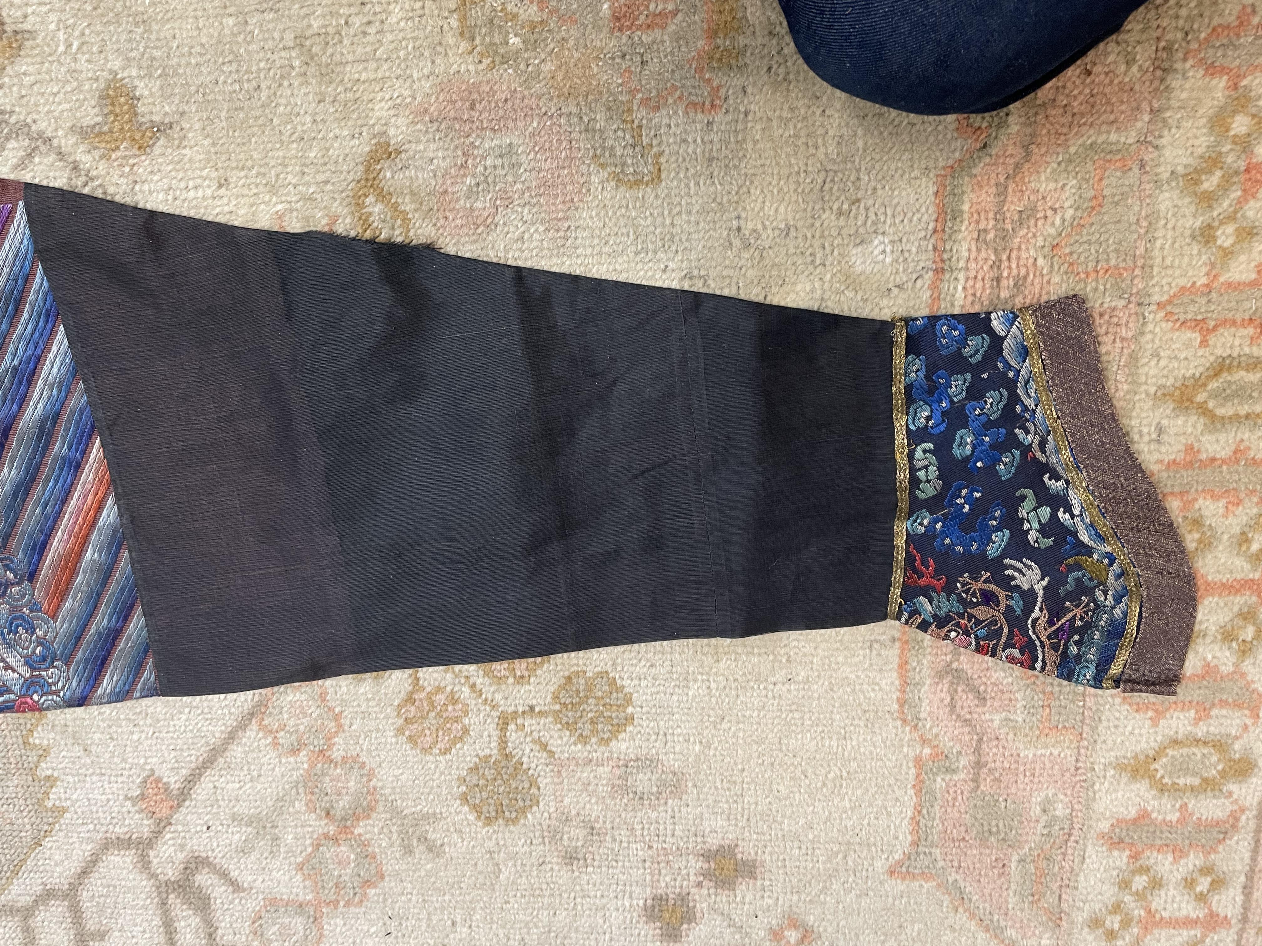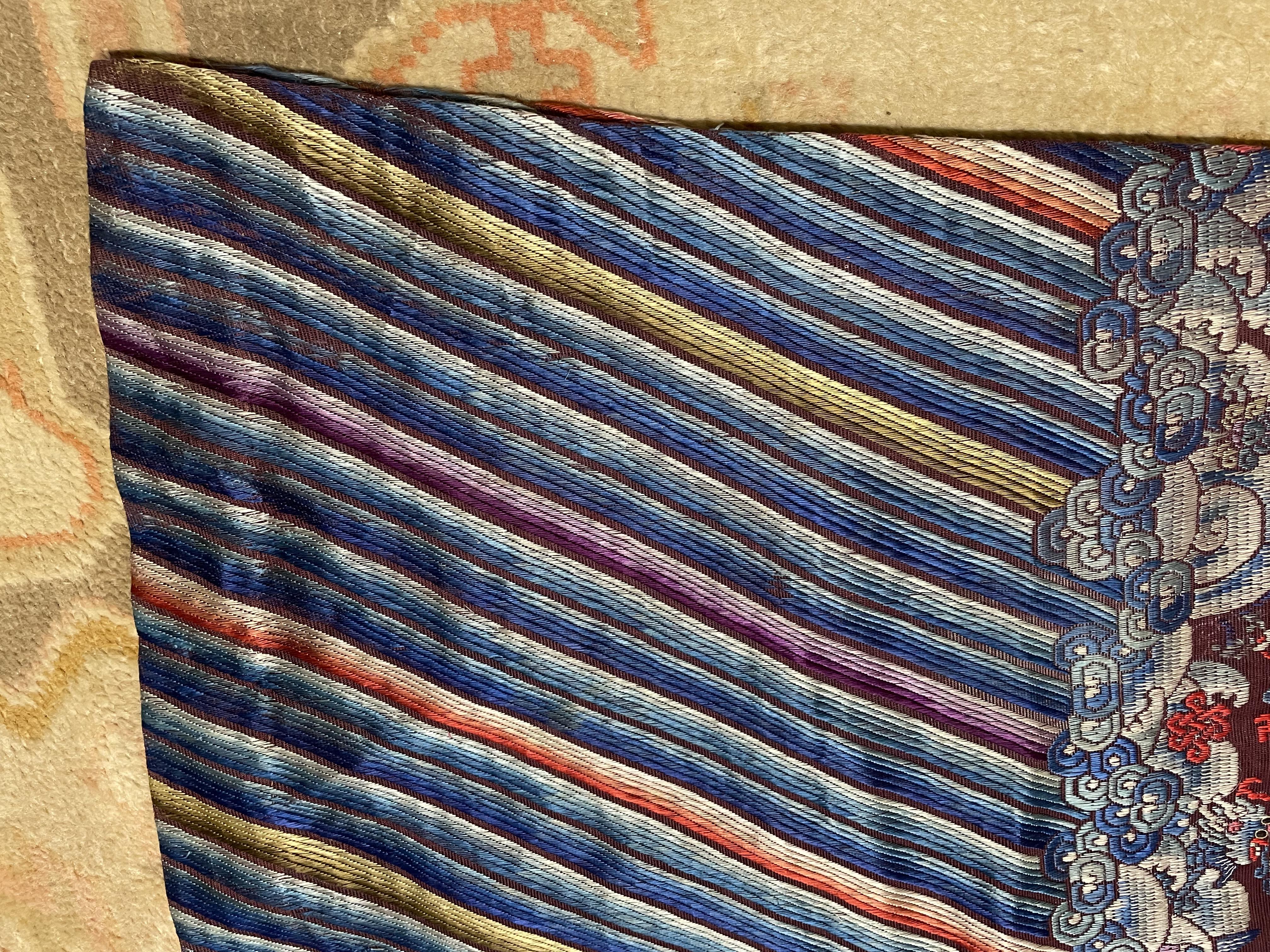 此褐地龙袍应为清代中晚期,品相尚可。此件龙袍是清代袍服中的一种,以盘金绣龙纹为主体,如意云、鹤、八宝、蝙蝠、海水五彩绣为辐的比较长见的官服纹饰搭配而成。龙袍以明黄等级最高,他带代表着皇权的向征,其它颜色次之,清代宫廷有严格制式!