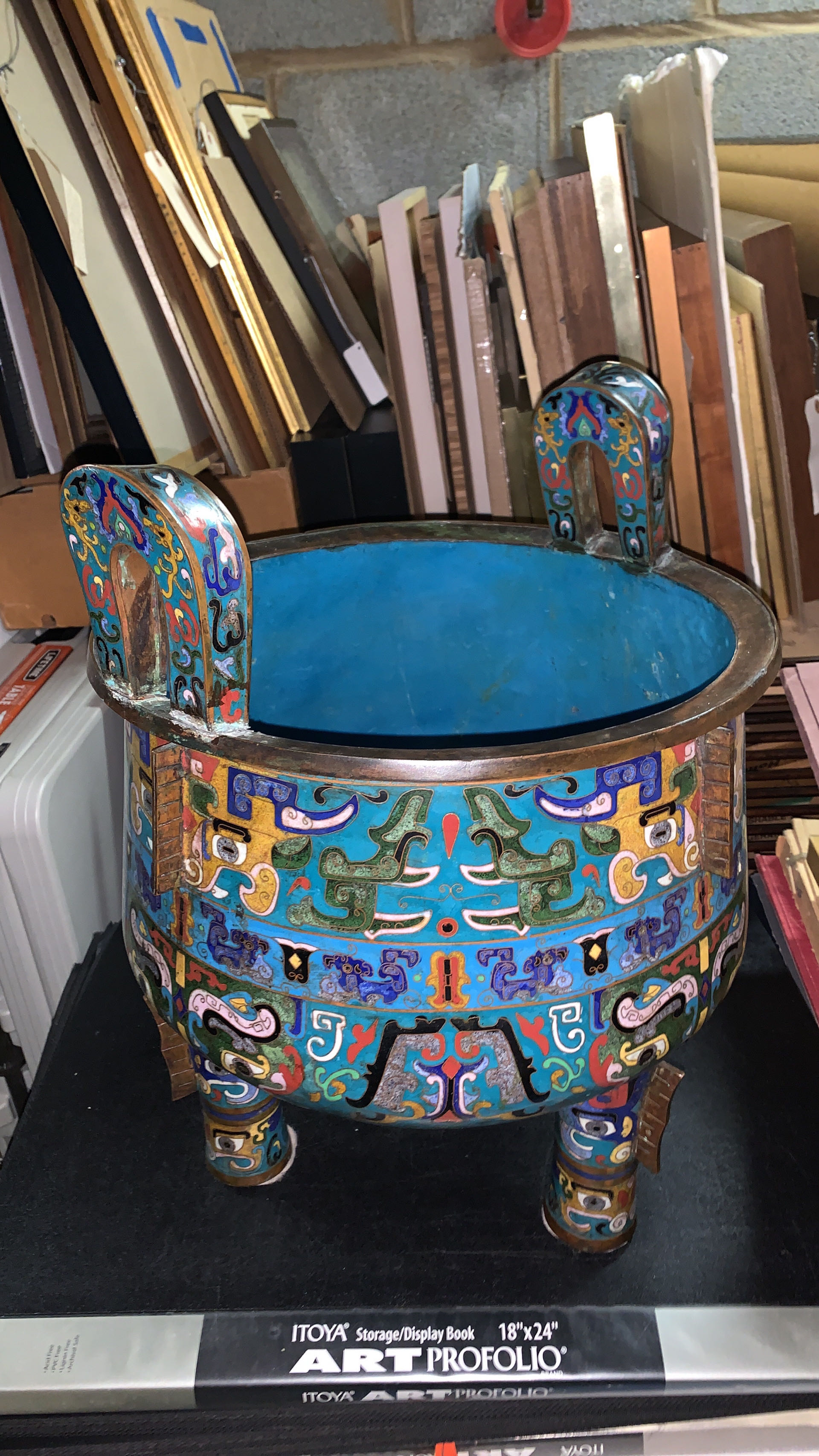 藏友您好,根据现有图片所反映的器物状态来看,您发来的这件铜胎掐丝珐琅饕餮纹三足双耳鼎式炉是一件建国以后生产的工艺品。其准确的制作年代应该在六七十年代左右,此种工艺与民国工艺存在较大差异,掐丝呈现出来的纹饰较平且死板,珐琅料颗粒过细,缺乏应有的颗粒大小差异,颜色的复合感呈现较差,也就是珐琅料颗粒颜色的配色感较差,颜色较为单一,色感直接。且掐丝线条缺乏张力,表现出来的掐丝状态过硬,纹饰布局稍许有些偏散,底部及内里的蓝色珐琅料较为单薄,厚度不够,铜质不够细腻,铜皮较薄,器物造型三足、出戟及双耳显得较为笨拙,表面脏旧的状态有当时人为做旧的痕迹在,具有仿古的工艺特征,此类制品当时主要集中在北京市场上多有制作。即便如此,此炉具有相应的年份,是建国后六七十年代左右生产的制品,就目前图片可视品相,其耳部有残,市场价位大概在人民币一万元到一万五千元左右,供您参考。图片鉴定仅供参考。感谢您对我的信任,我是崔凯。