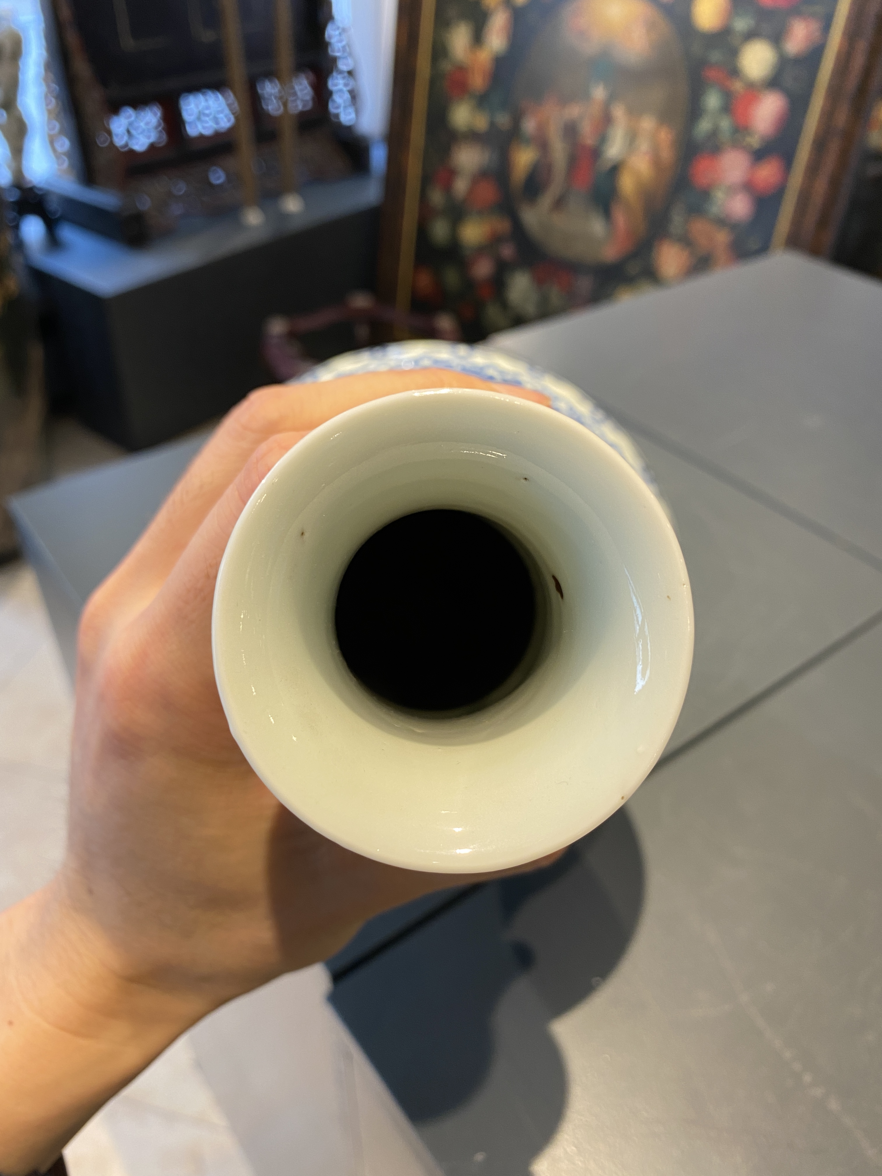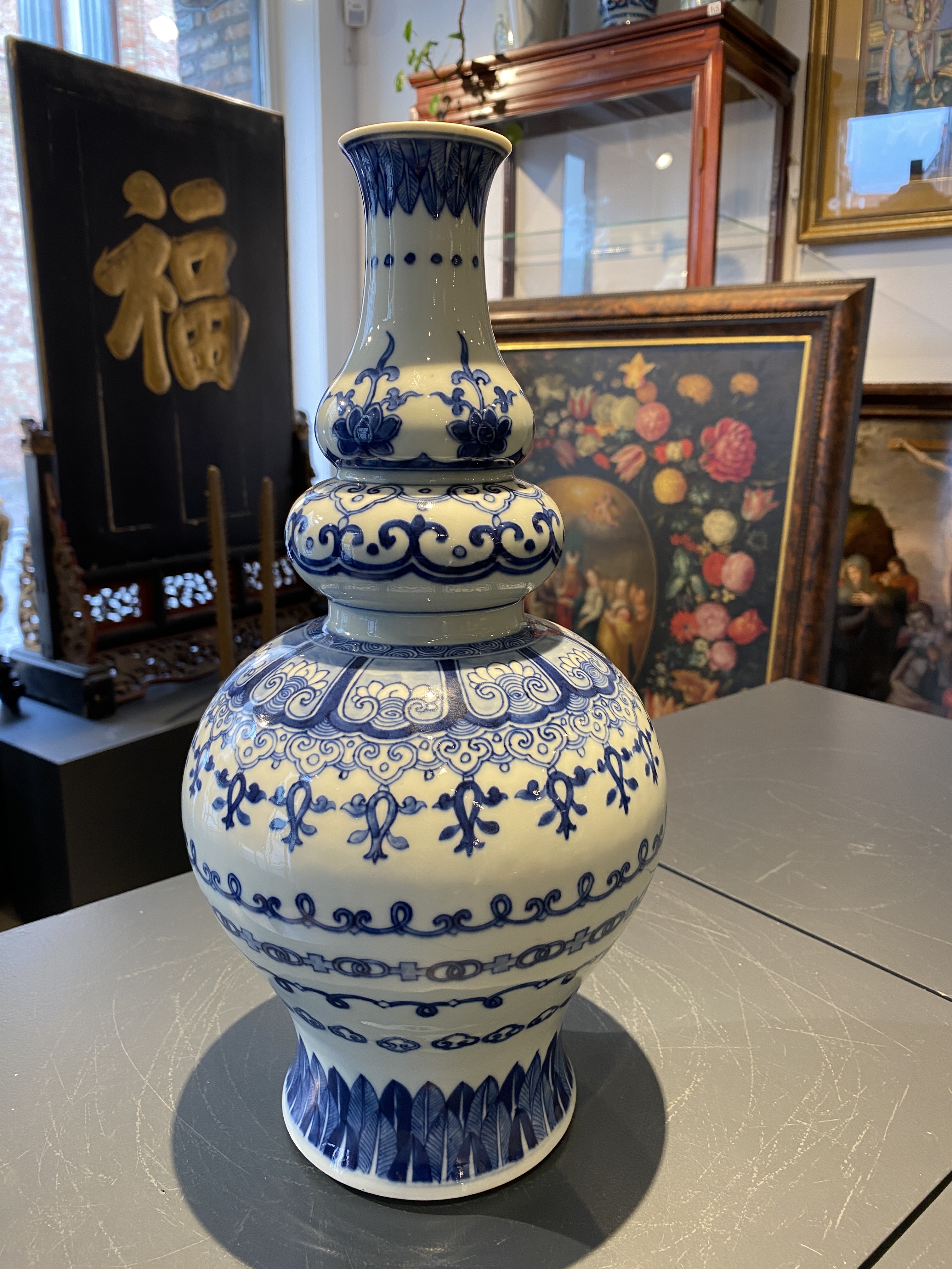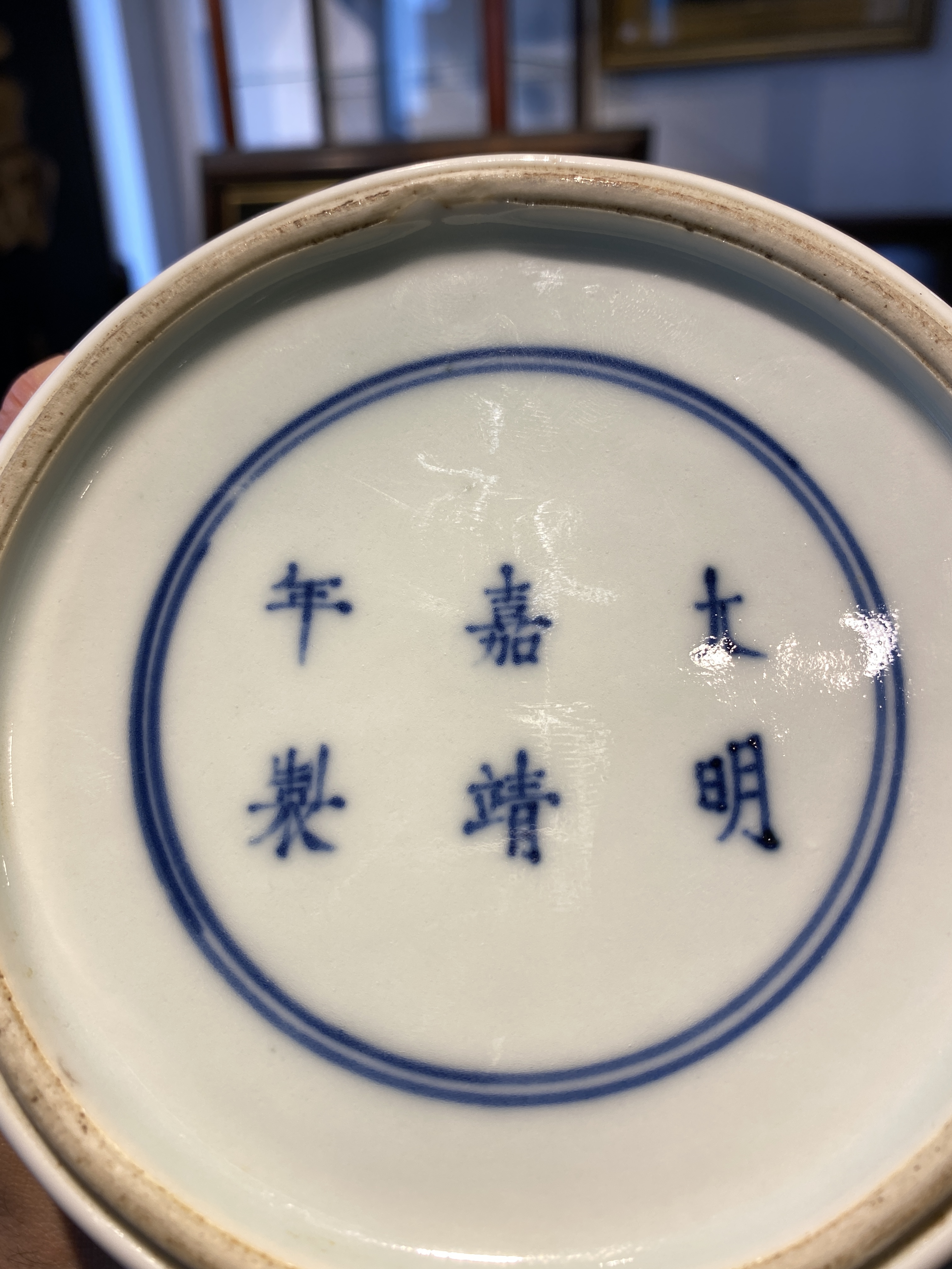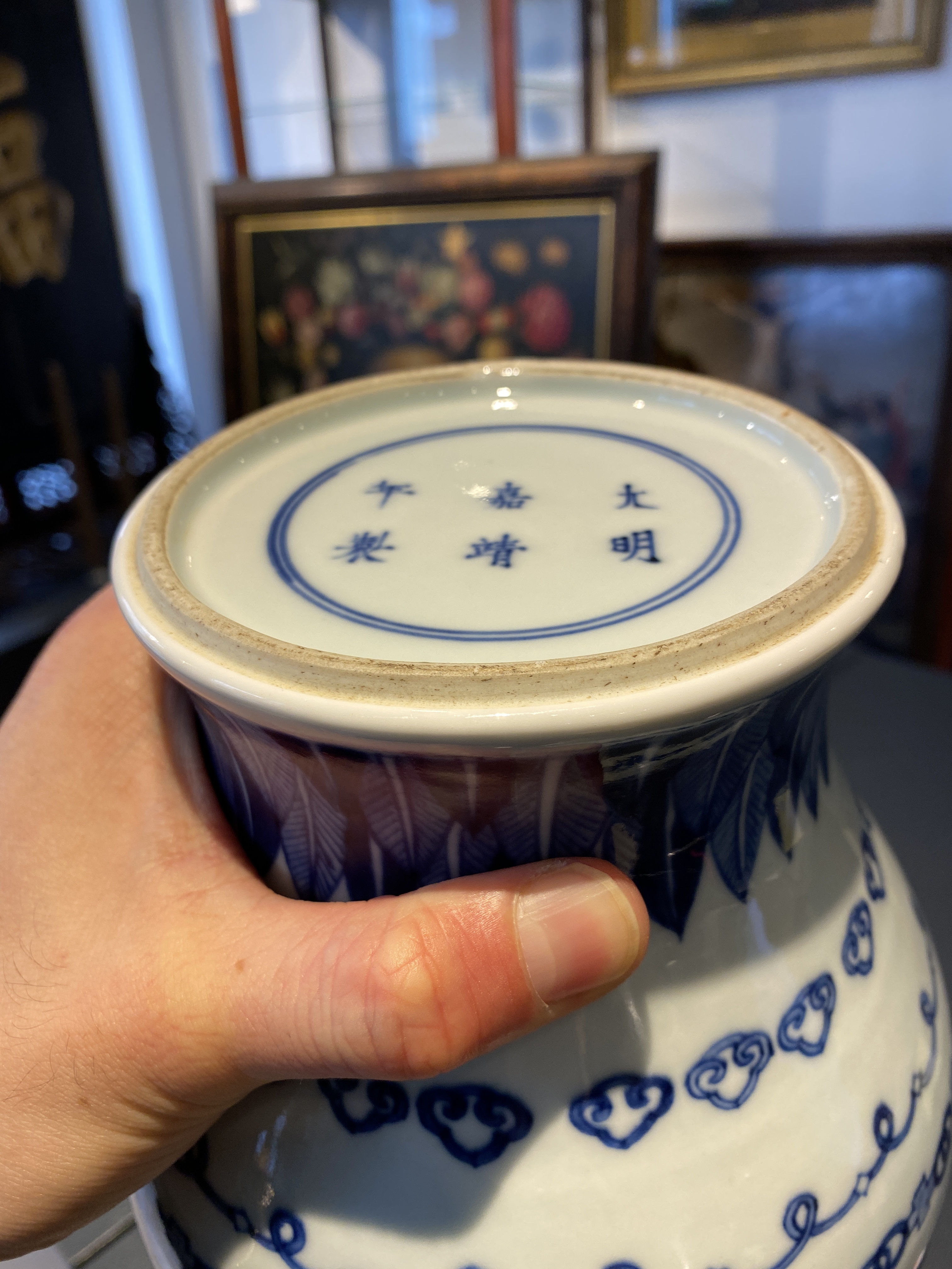 藏友您好,根据现有图片所反映的器物状态来看,您发来的这件底部落有“大明嘉靖年制”六字青花楷书双圈款识的青花仰蕉叶覆莲瓣如意云头花叶纹葫芦瓶,是一件清代晚期光绪时期的真品。虽然此瓶呈现三鼓腹的瓶形,但是也可以称之为葫芦瓶。其是按照康熙时期外销瓷的风格来制作的,虽然底部落有嘉靖款识,但是和嘉靖不具备任何关系,是晚清时期按照清朝康熙书写前朝嘉靖寄托款识的风格制式,甚至有些外销瓷的画工及器物造型来烧制的。此种由各种不同边饰组合形成的横向边饰在康熙时期就较为流行,与康熙相比其青花发色整体略显发飘,画工线条笔法不够凝练,表现出来的纹饰状态结构略显松散。虽底部款识书写的笔法略显纤细,但是用笔的提按顿挫呈现上佳,底部修制利落,底部露胎部分胎质细润,釉面质感莹润。所以这是一件晚清光绪时期的真品,就目前图片可视品相,其市场价位大概在人民币二万元到三万元之间,供您参考。图片鉴定仅供参考。感谢您对我的信任,我是崔凯。