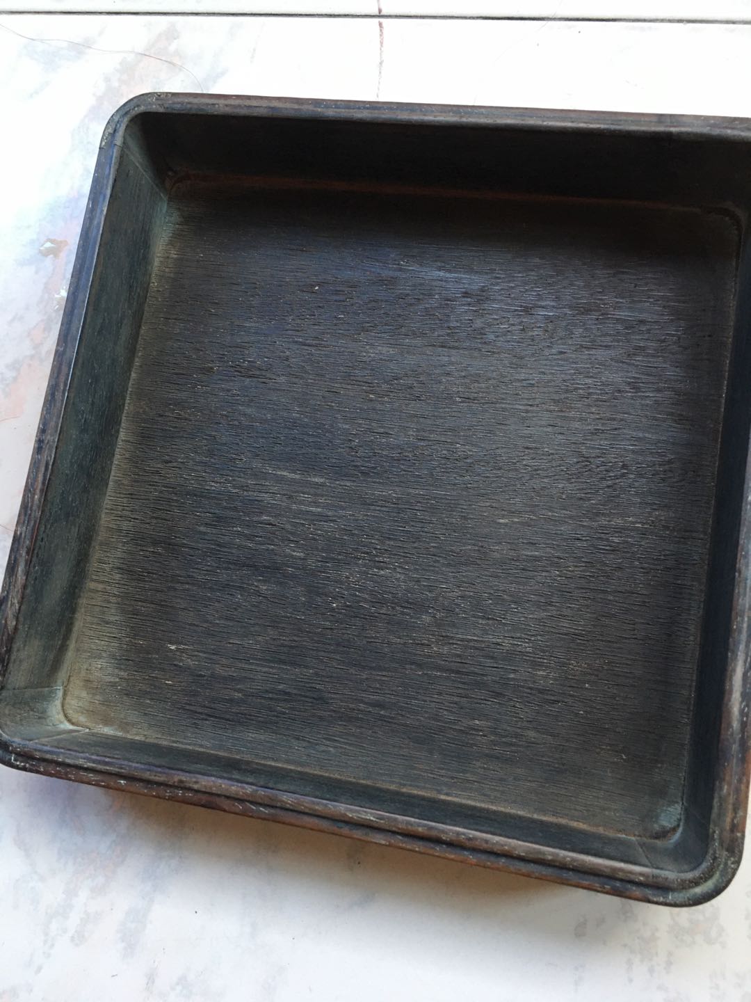 图片看木盒盒身盒盖应为酸枝之类,棕眼纹理缺乏黄花梨排列特征。底板用的铁力木,盒盖起鼓,四角圆角,盒底落膛起鼓,四角方角,应为清代工艺,制作精致,具有艺术性,值得收藏。