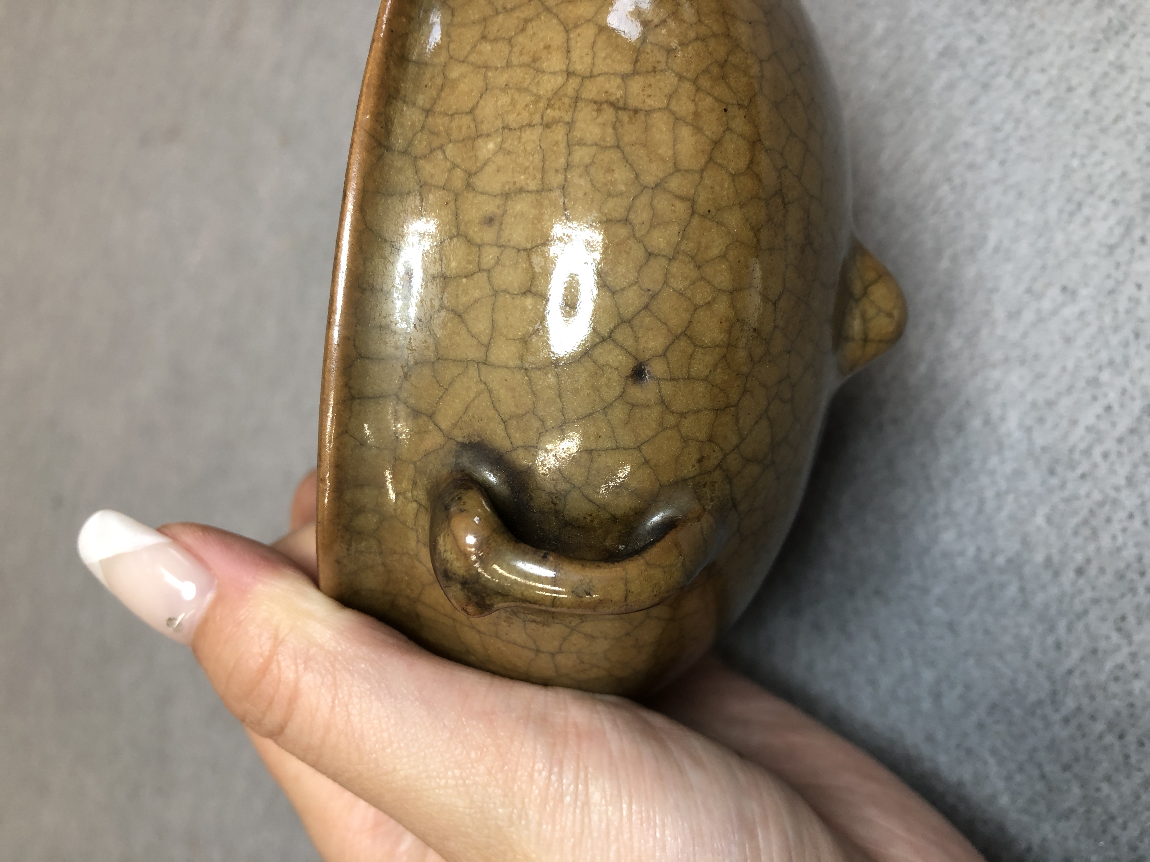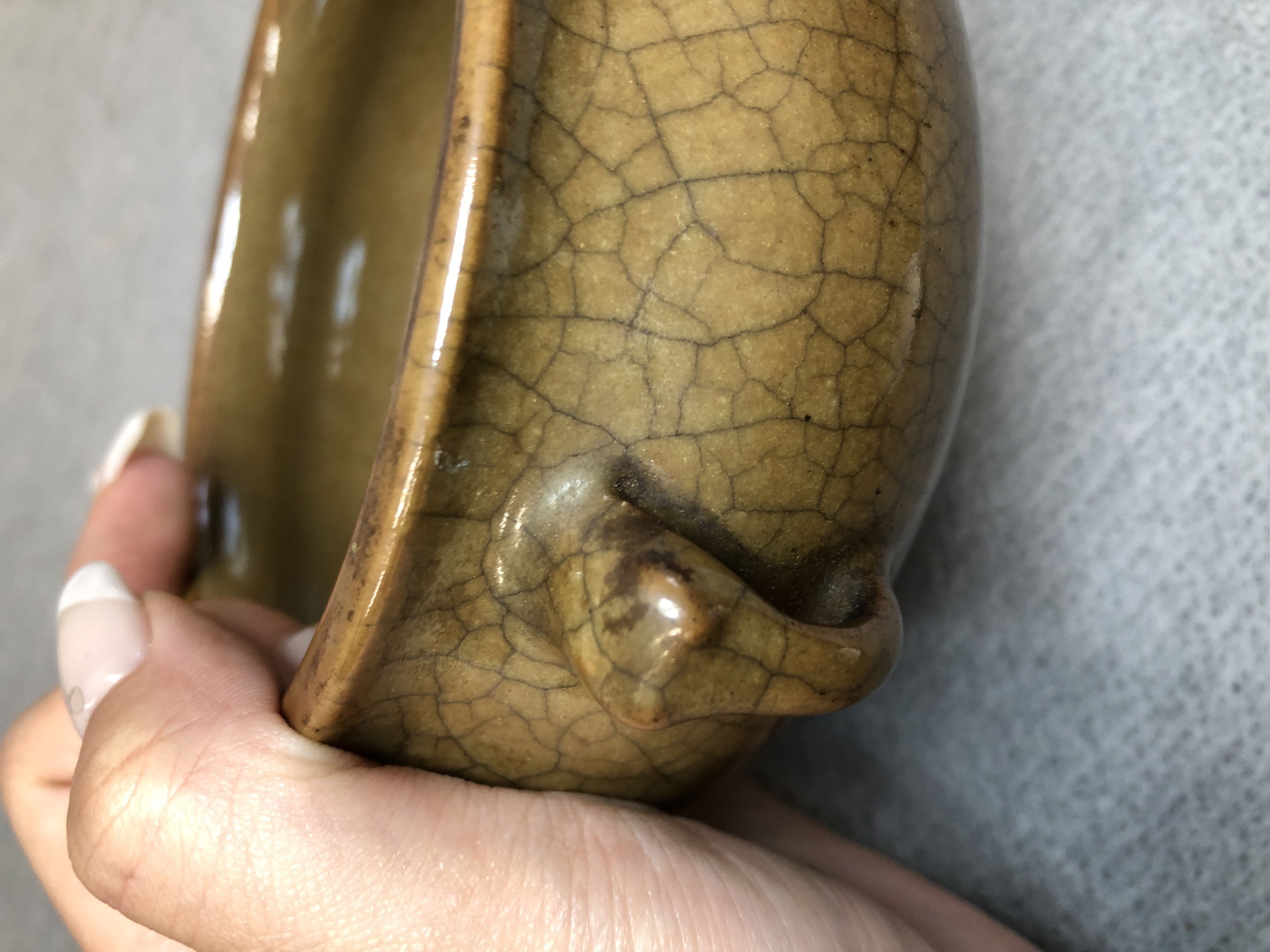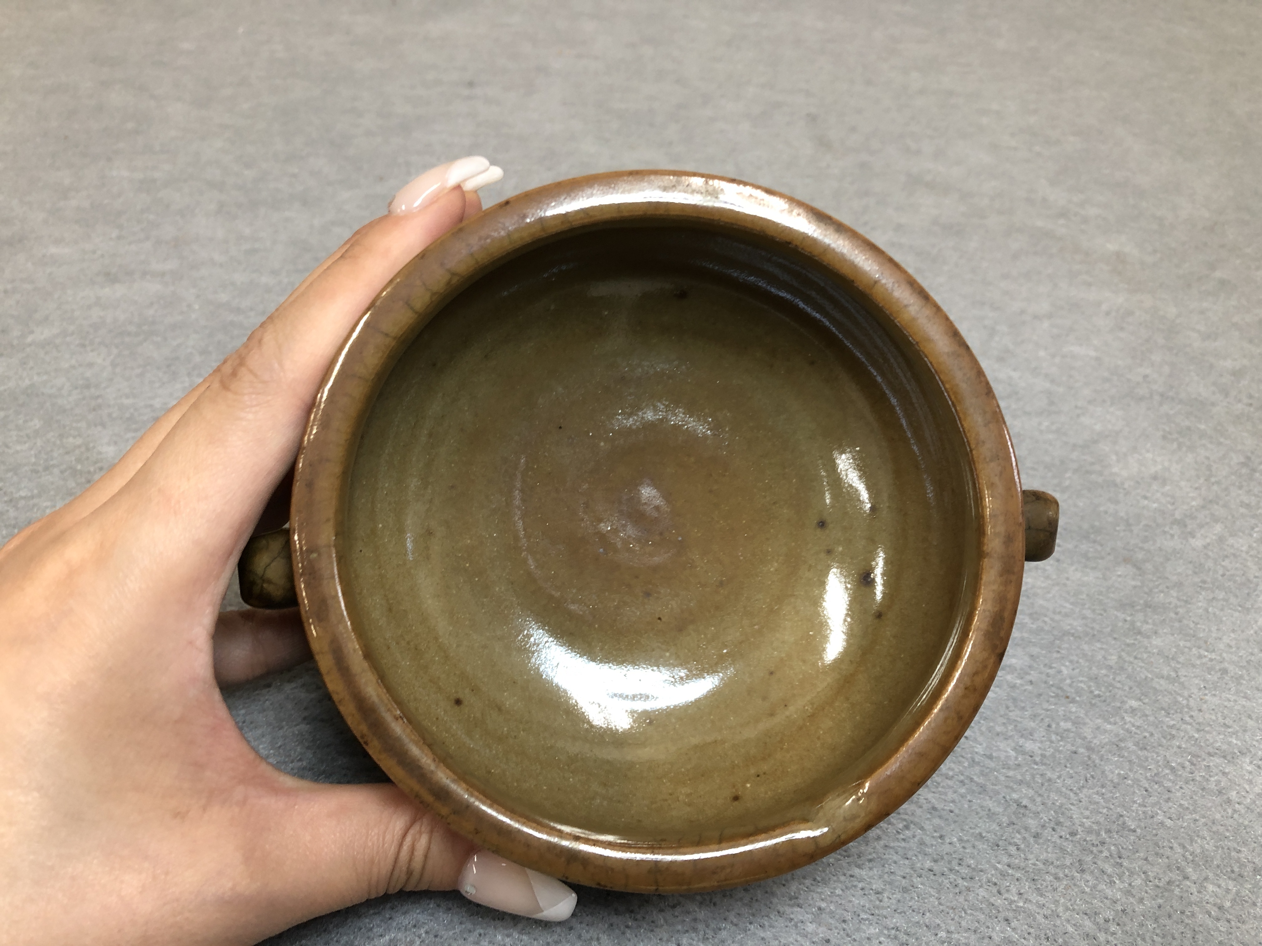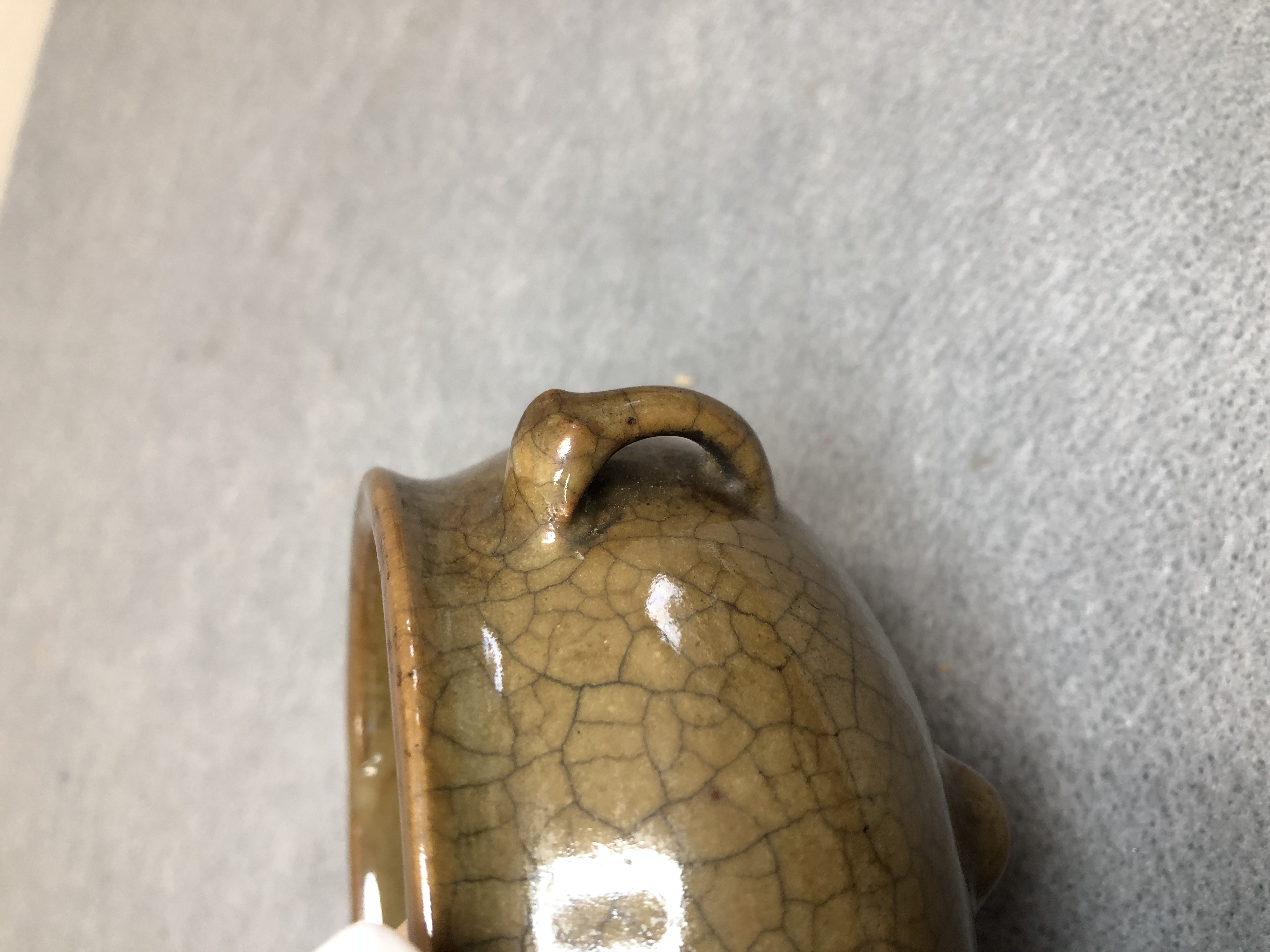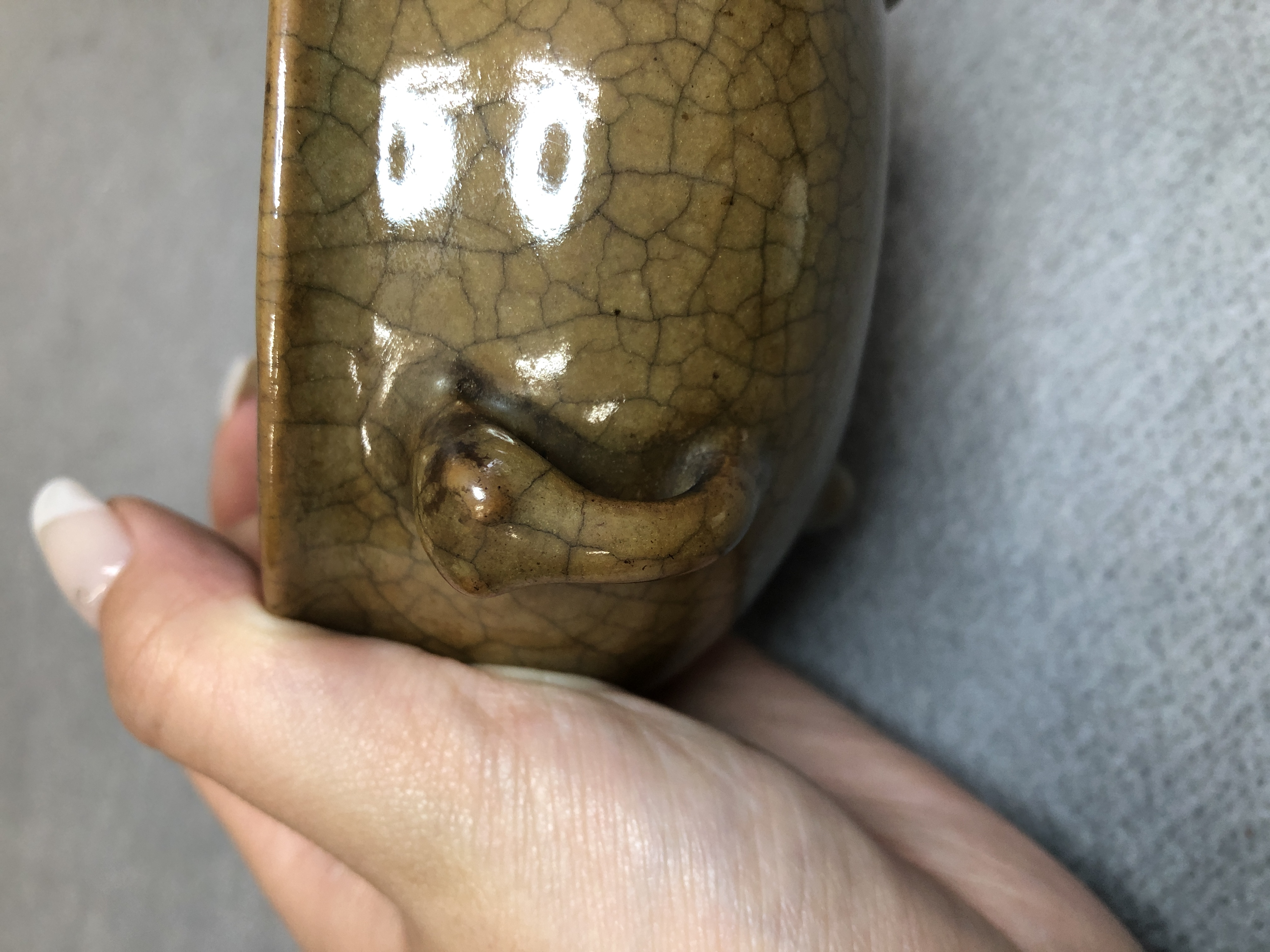 此件作品器形端庄,釉面莹润,开片自然,修足干净利落,整体线条流敞,鉴定结果为清代哥窑三足炉。