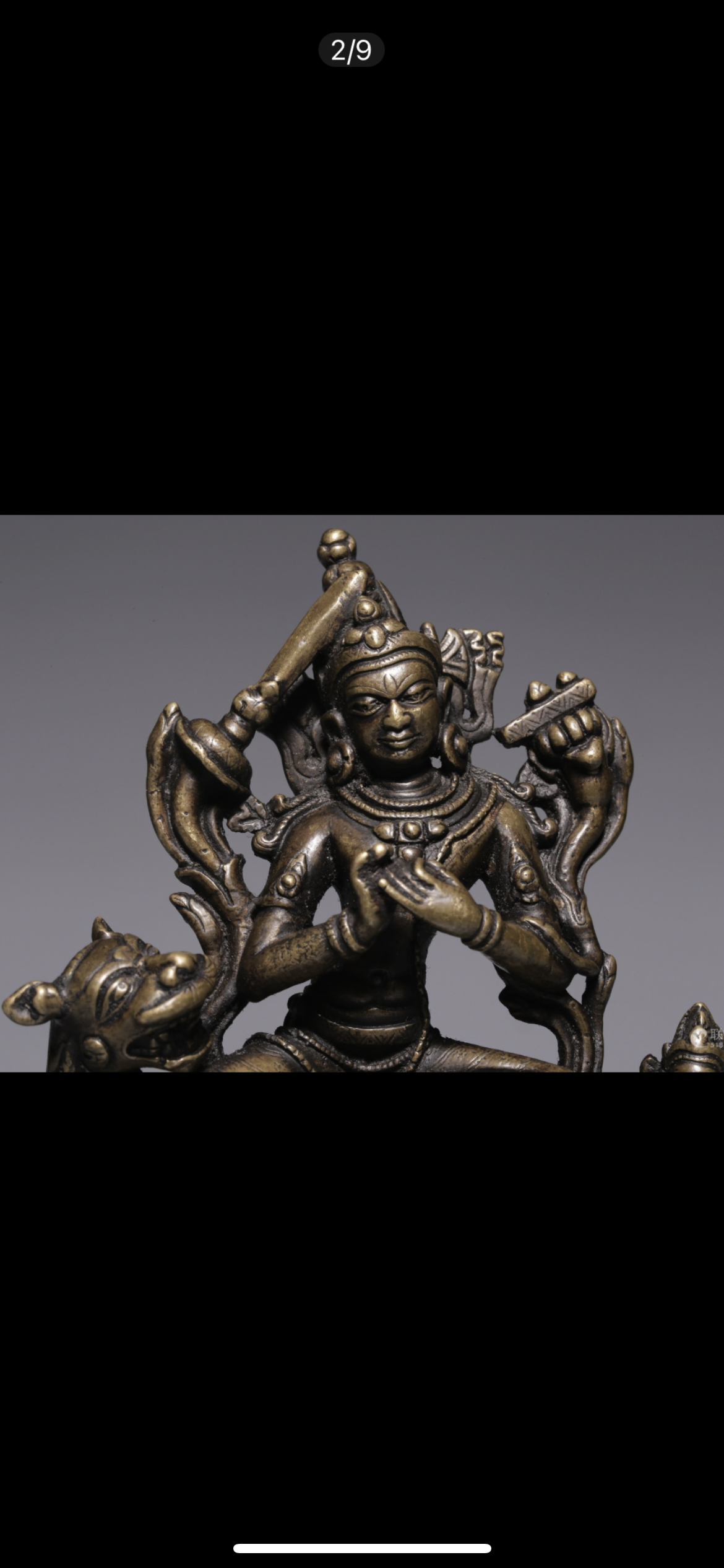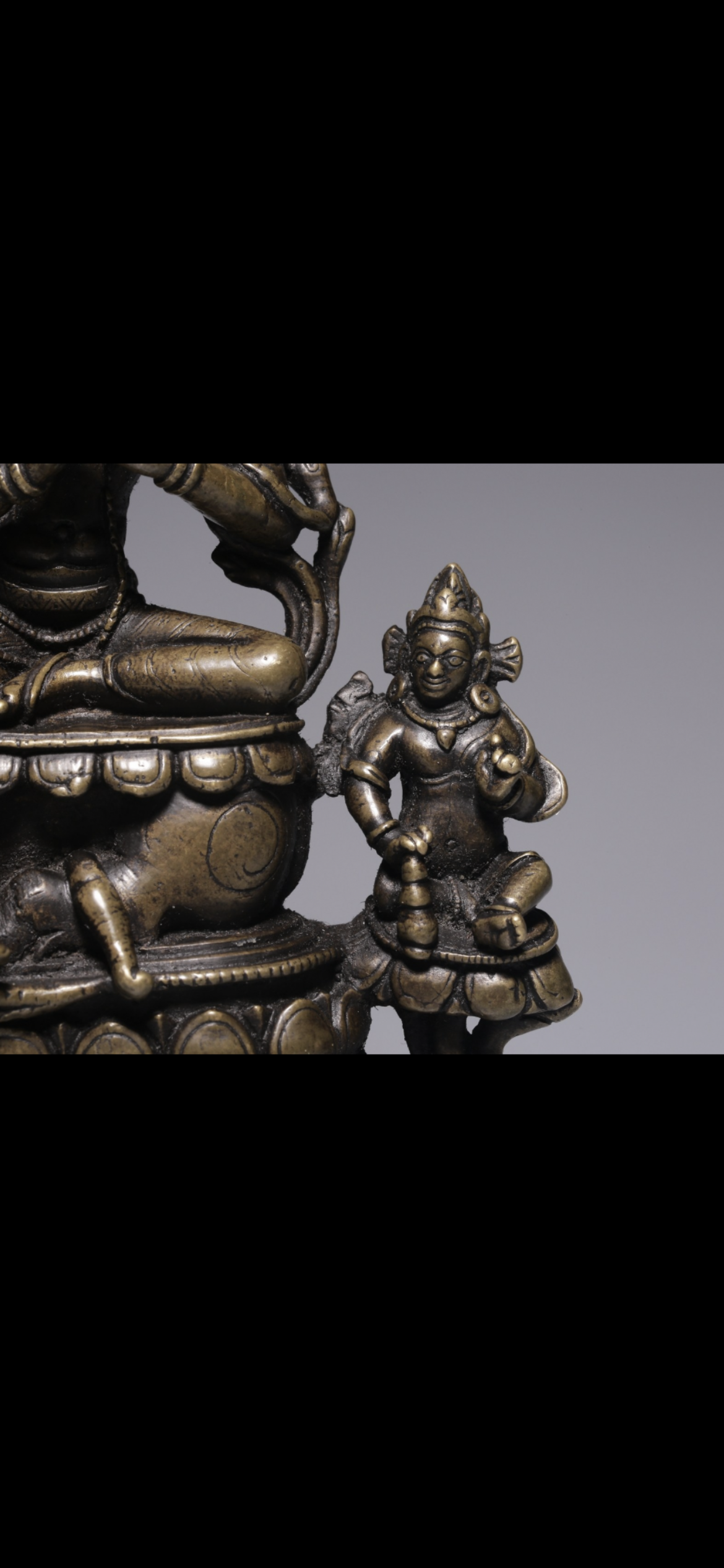文殊菩萨像,左右二菩萨像,左侧双手合十,右侧的菩萨手持钱袋,象征着财富。文殊菩萨体形优美,为合金铜铸造,腿部的衣纹呈双阴刻线,凿刻梅花点。仰覆莲台座,台座的底部边缘以联珠为装饰。整体造型应该属于东印度风格,大约十三世纪的作品。