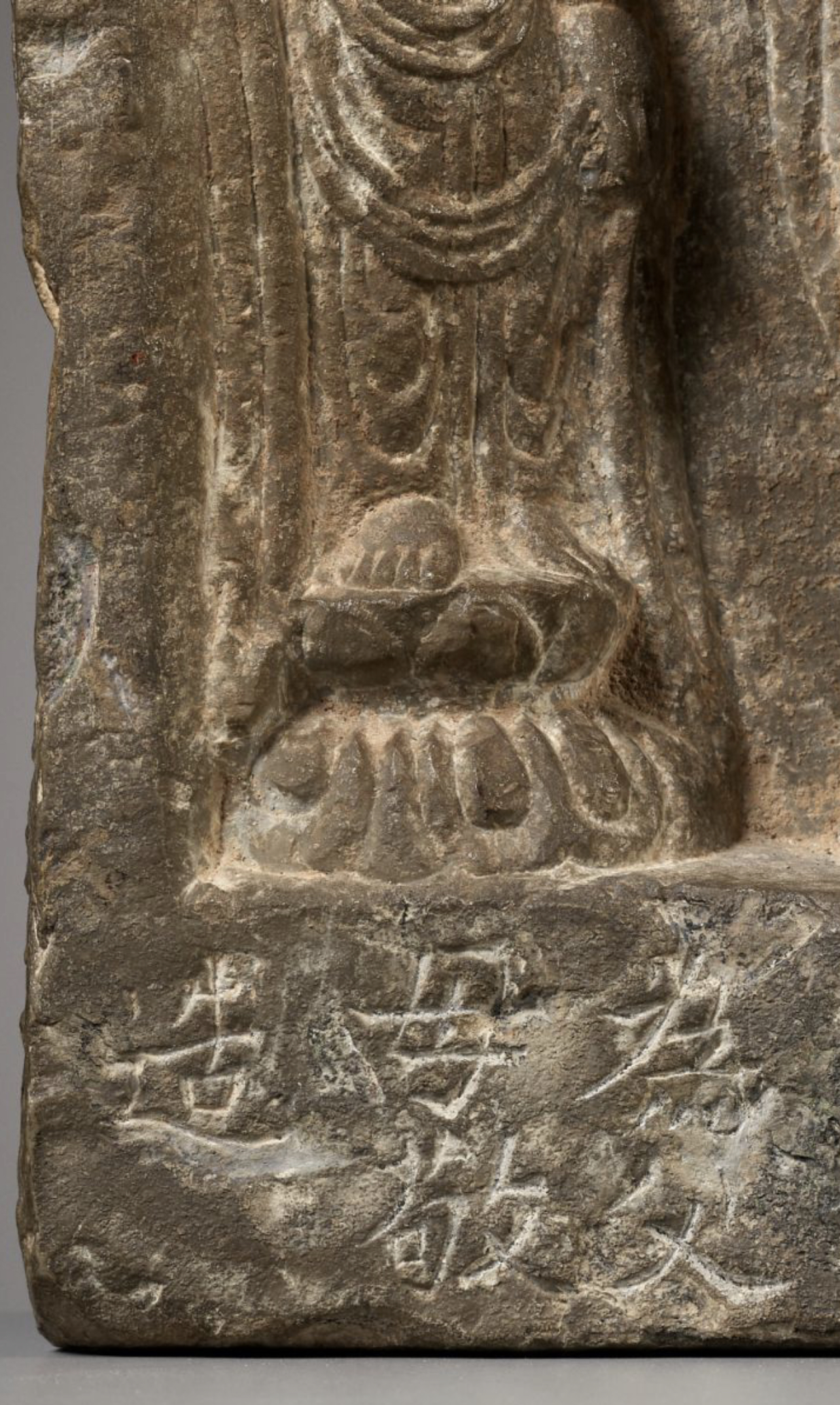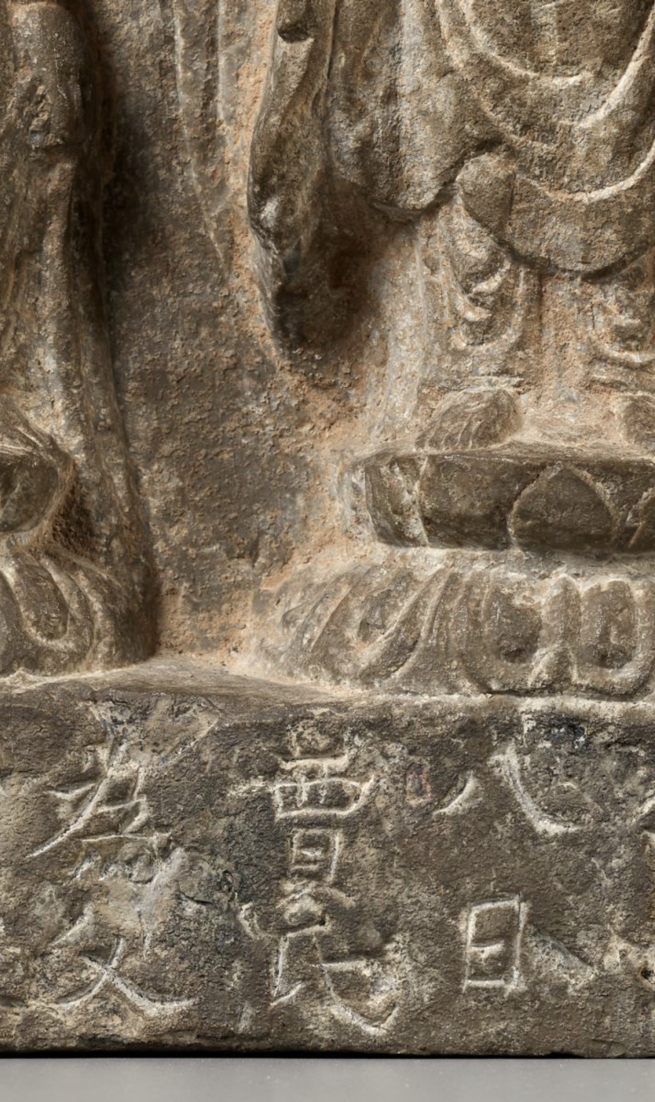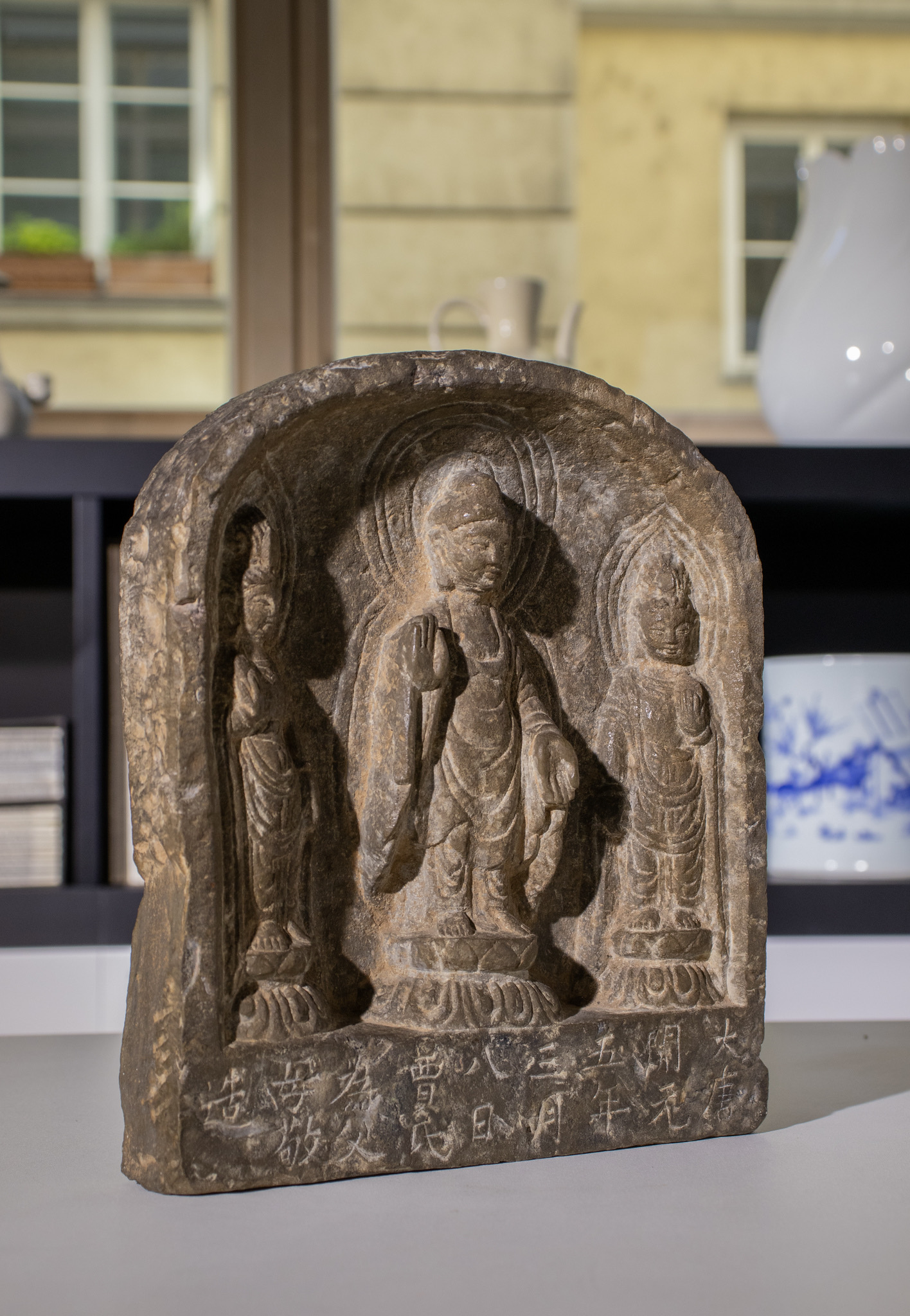 鉴真:唐:(民间石刻三佛像)、从石刻工艺上看,应该是民间工艺,石刻风化、皮壳正确。(大唐開元五年三月八日贾氏为父母敬造)。考证:字迹风化与佛造像一致。故鉴定为:唐代開元年间,民间石刻工艺佛造像。 鉴定师:于斌 鉴定於2022年10月3日。