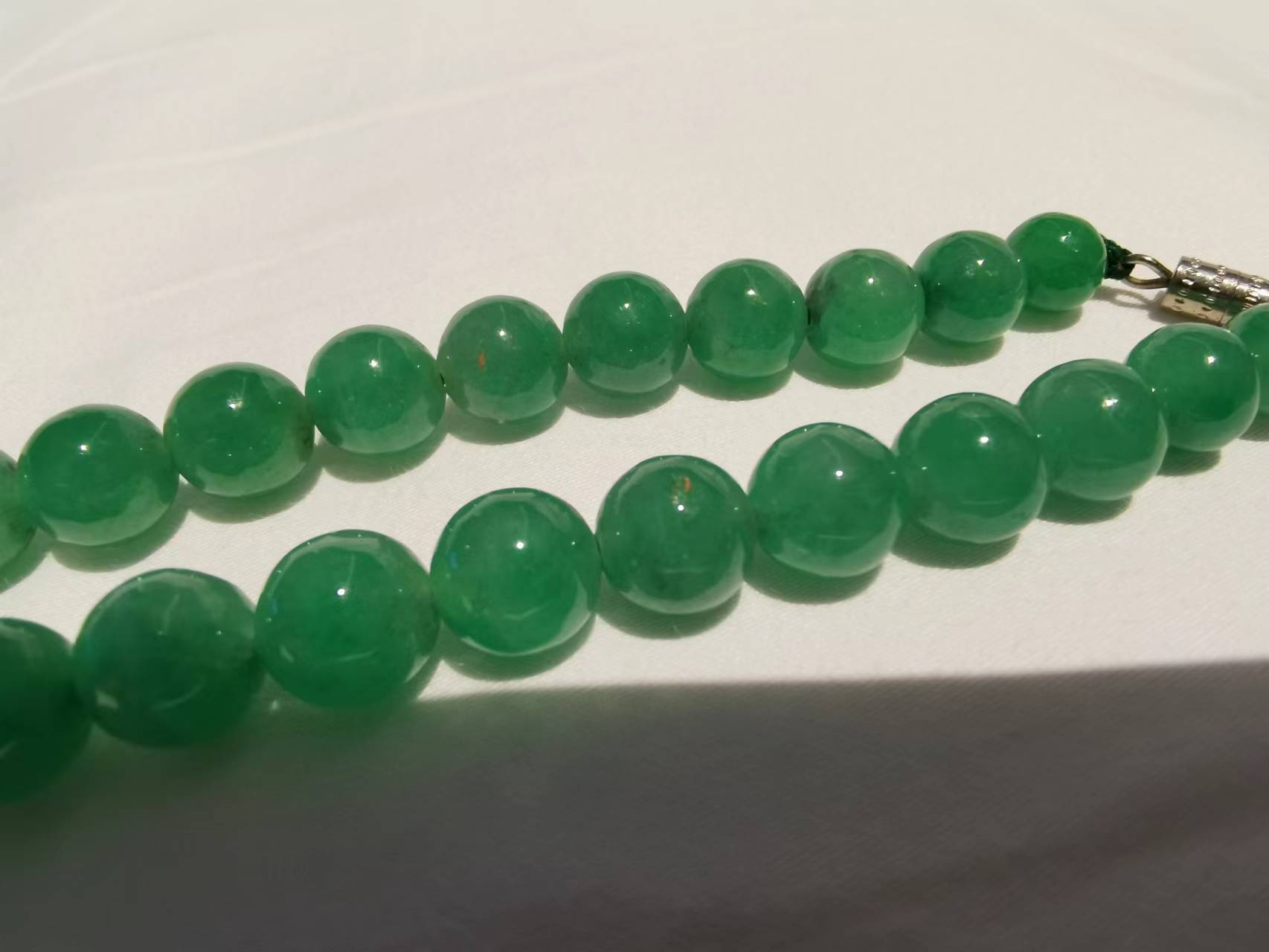 藏友您好,您所发藏品从照片中看,材质为天然翡翠塔珠项链,其颜色均匀且色度浓郁,个别珠子有黑色瑕疵和白棉,从照片中看整体珠型匀称周正,属于高档翡翠饰品,但只能从照片判断不足以证明真品,还需要国家检测机构检验并出具相关证书加以佐证。
