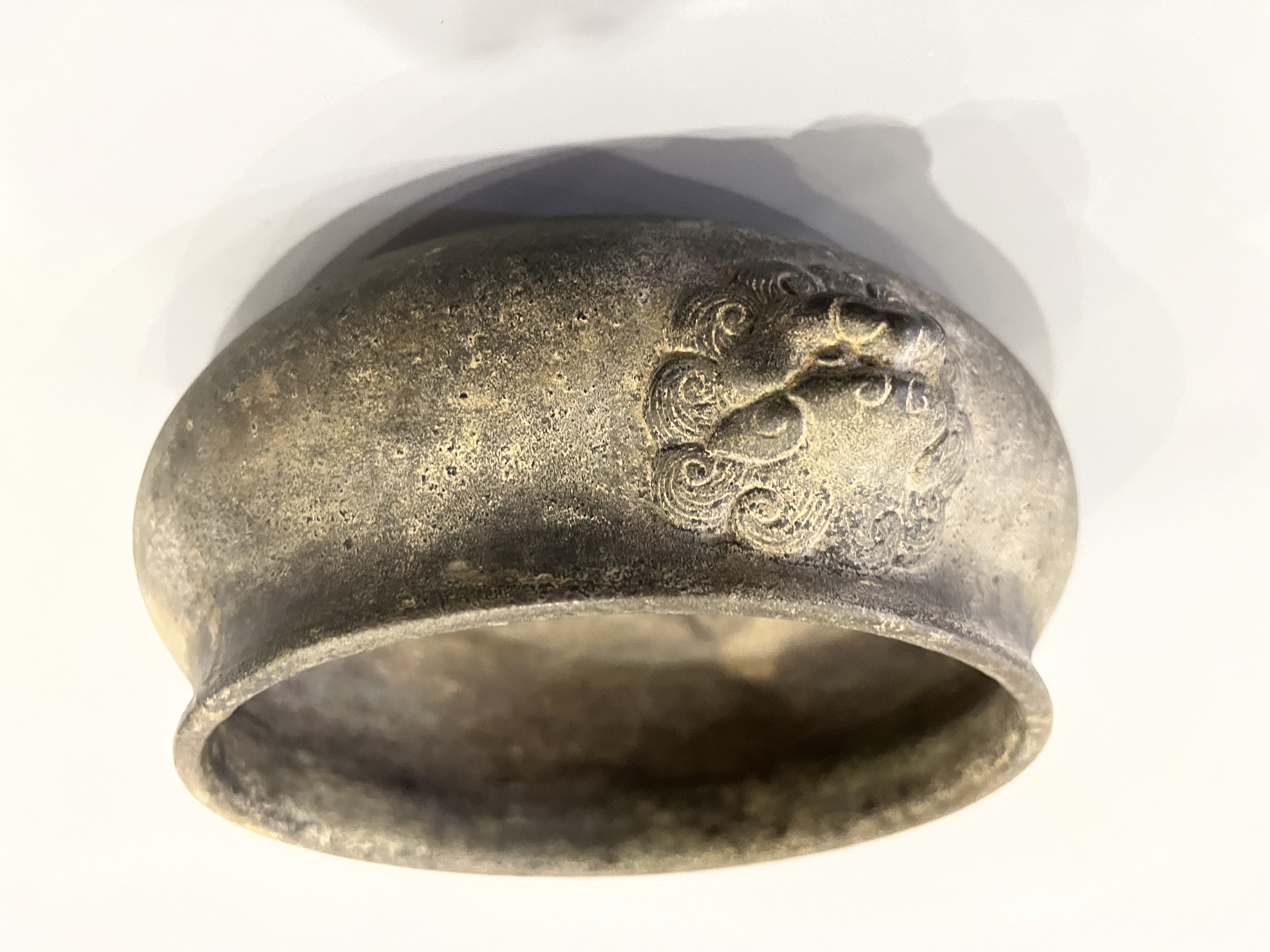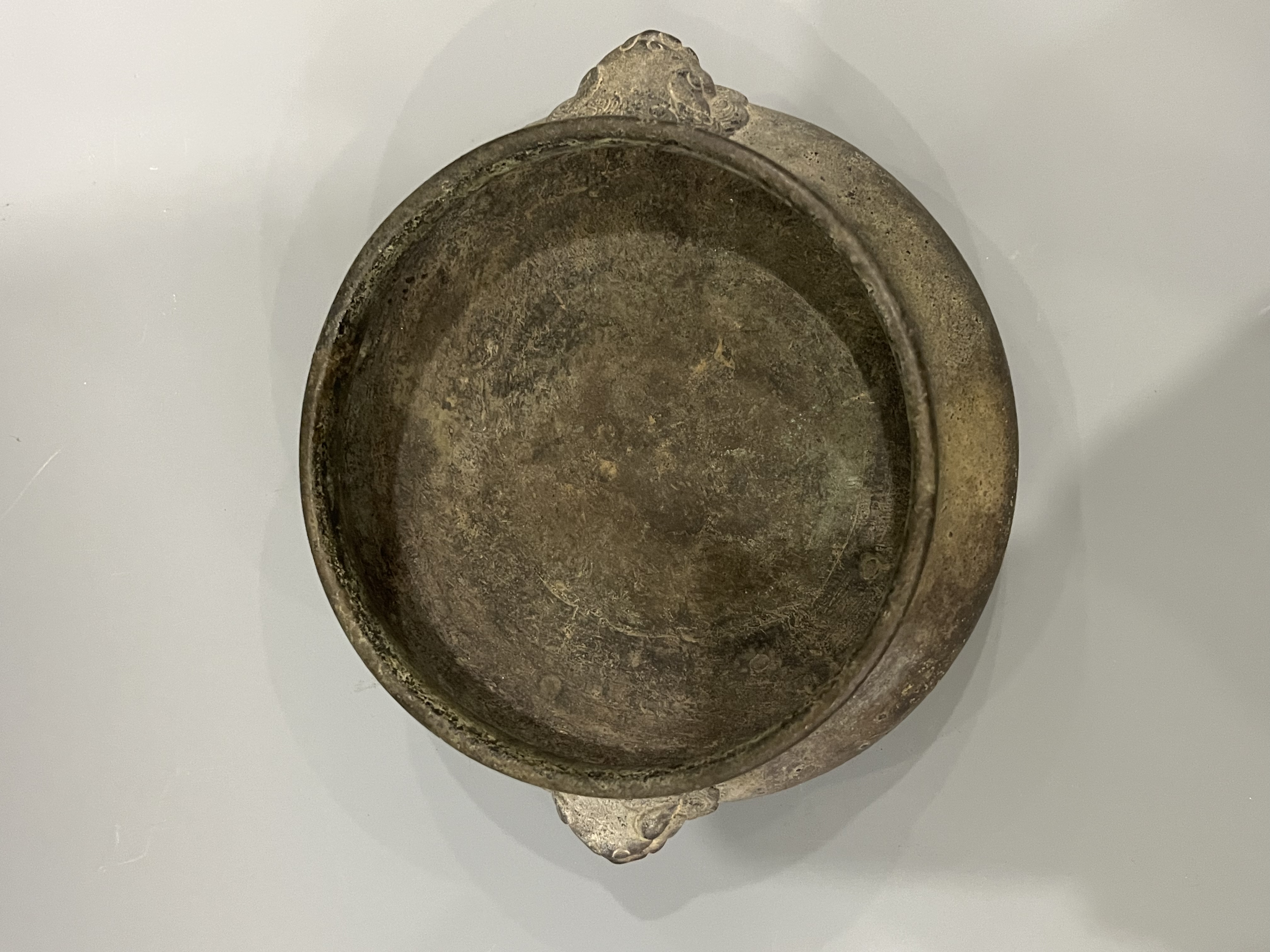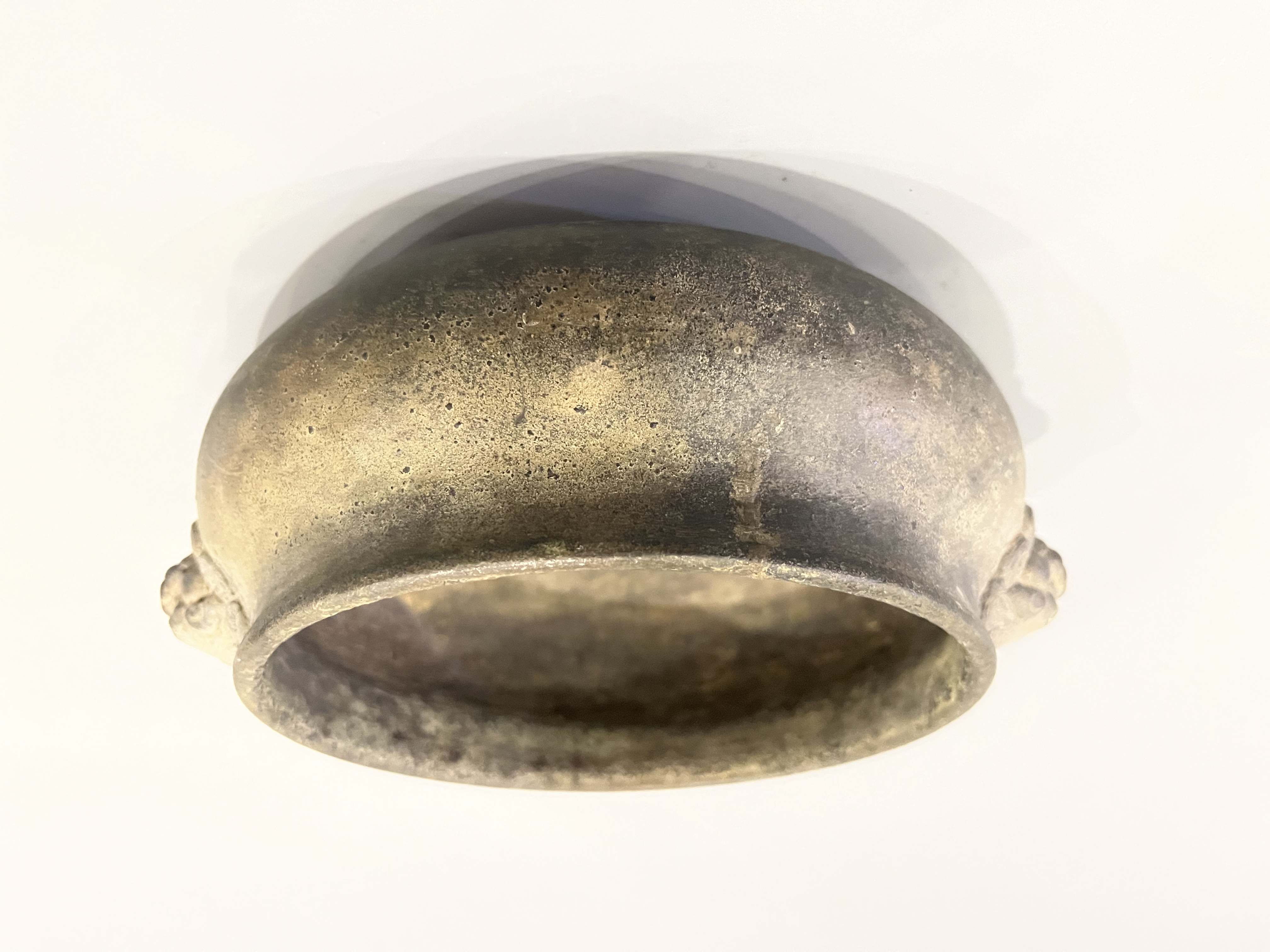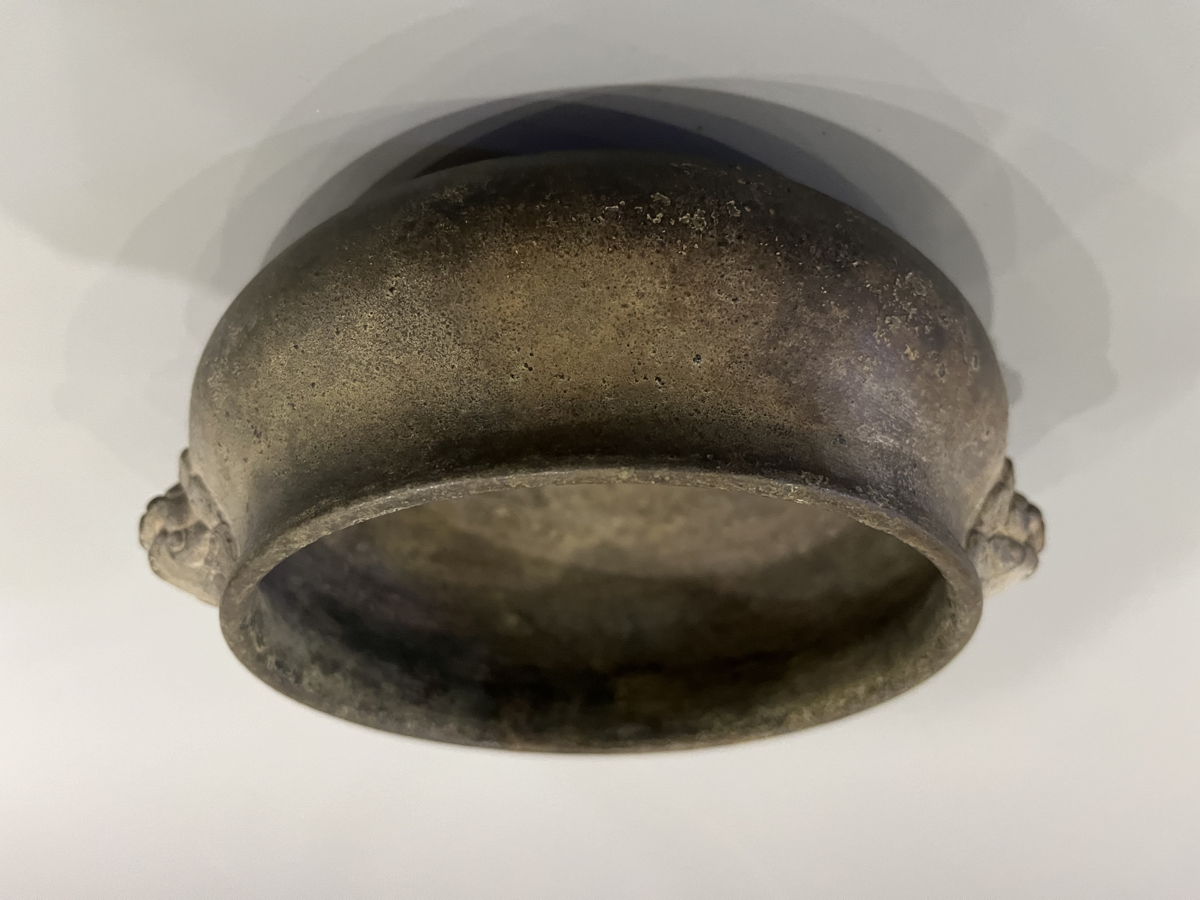 藏友您好!见图,此铜香炉器型制作工艺皮壳包浆磨损氧化底款均符合清代香炉特征,应为清代仿明代老铜香炉,感谢!