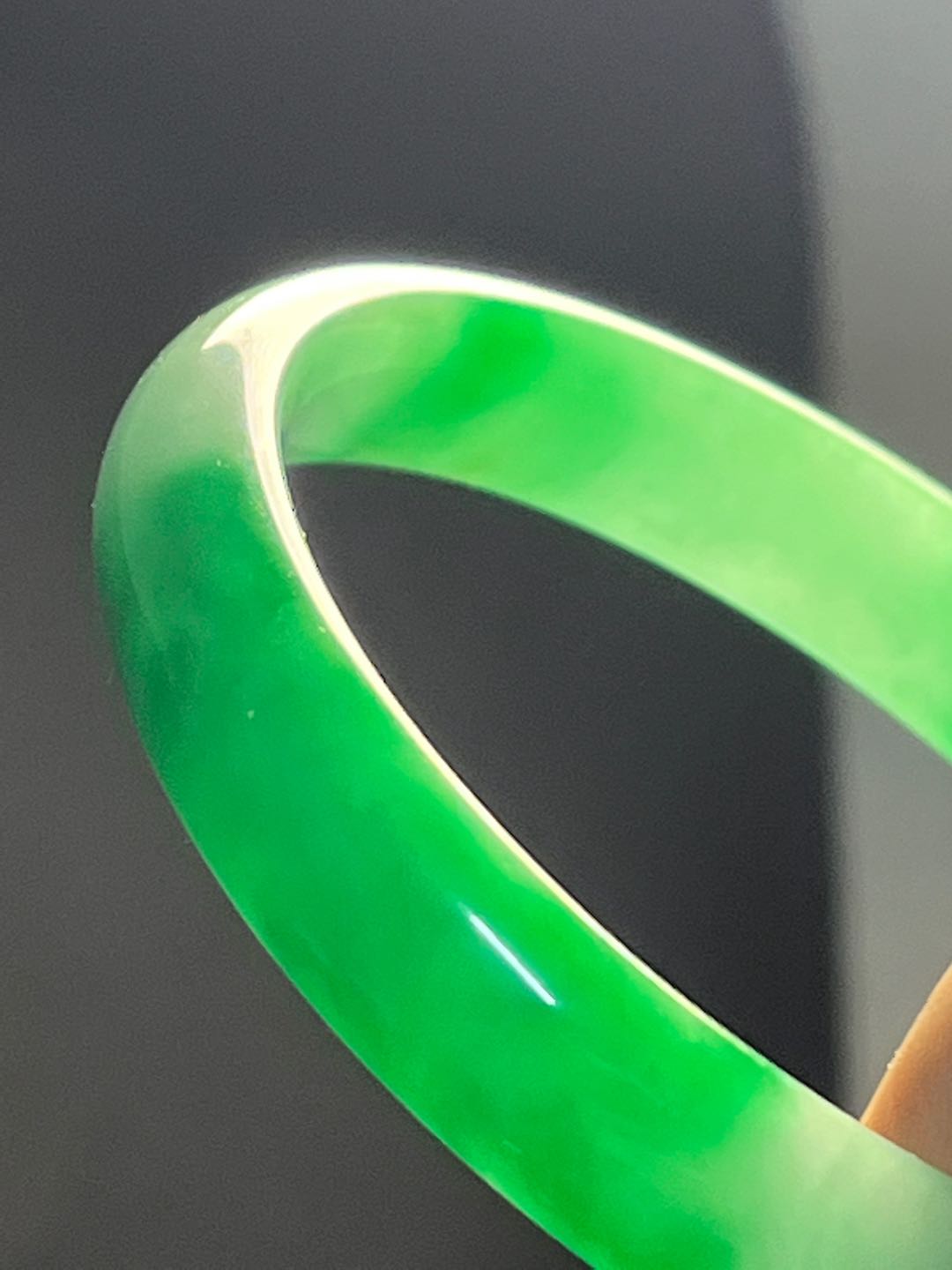 藏友 您好!依据您提供的图片,这支手镯上的颜色呈块状,没有色根,颜色是经过漂白处理后注色,不是天然颜色,已经没有价值,是A+B+C货,感谢您的信任与支持!