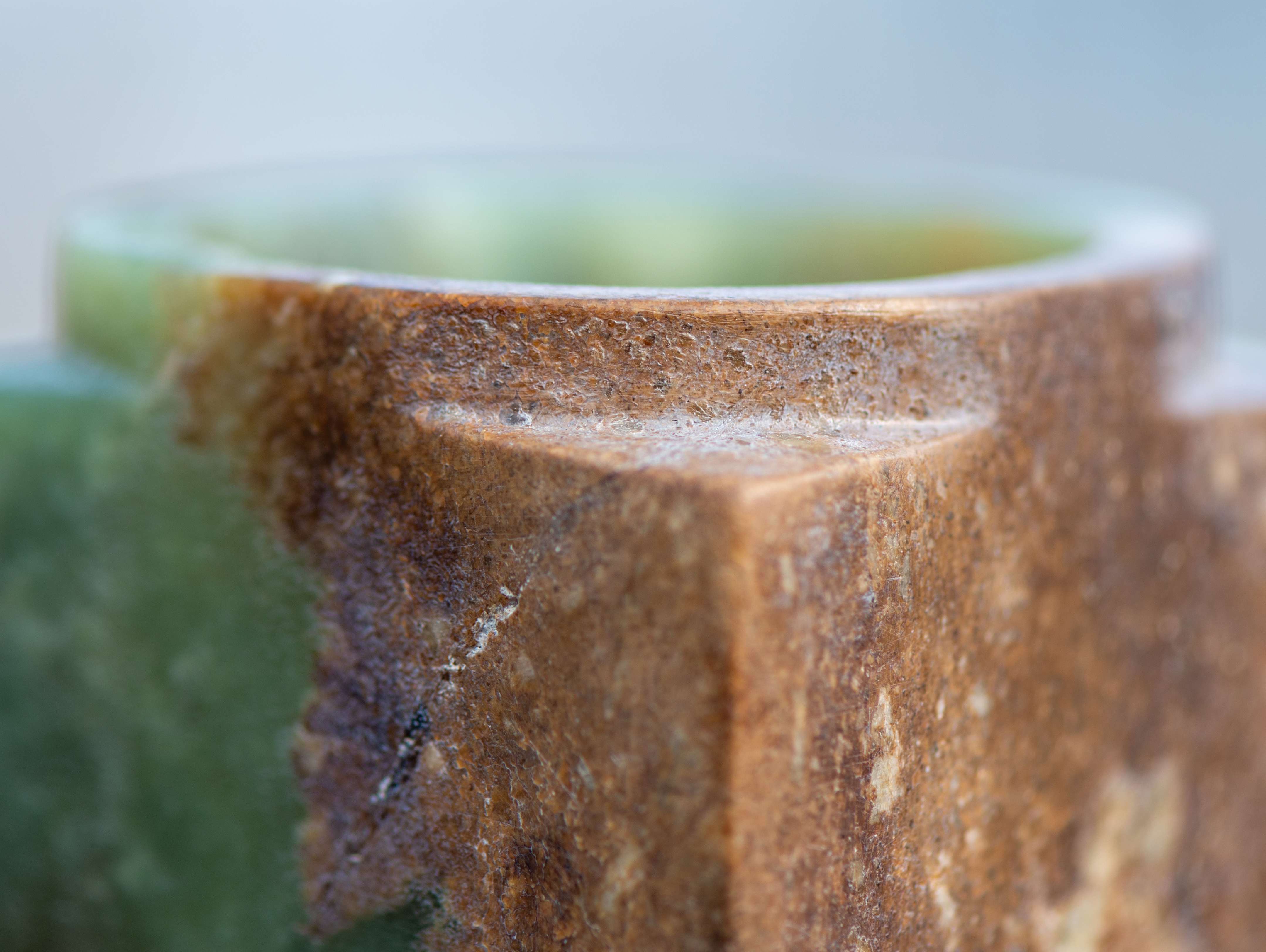 您好,这件器物是否为居易书屋旧藏,我们并没有核实,暂付阙如,但是这件玉琮用古代砣工加工的痕迹还是很明显的,在四个“射”的转角部位以及内壁都看得很清楚。没有熟旧的包浆只是证明它出土后没有经过人为的盘玩,保持着生坑或者半生坑的状态,并不为奇。这件玉琮沁色比较重的部分实际是玉料中的浆石性。总而言之,从照片分析,这是一枚传世的齐家文化玉琮,比较珍贵。