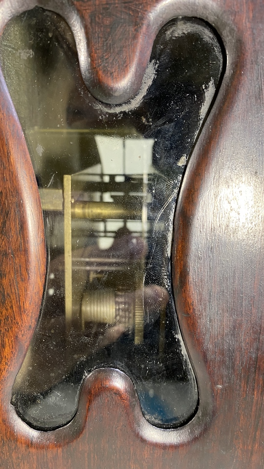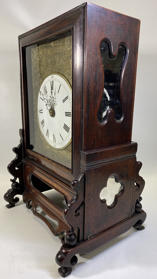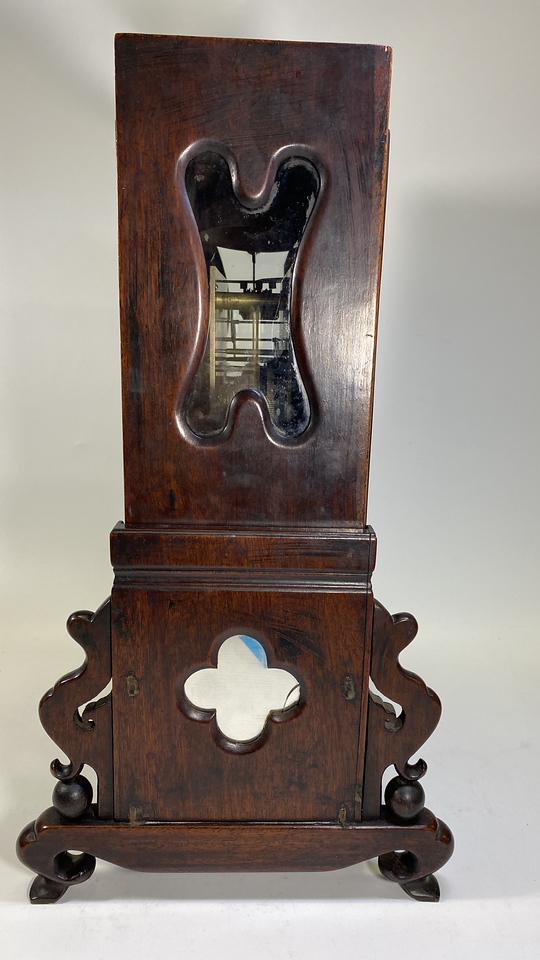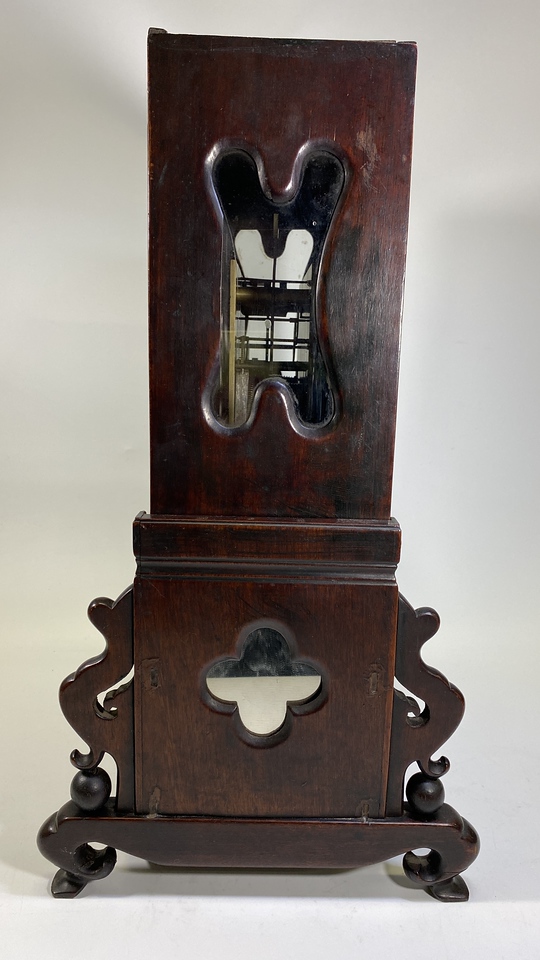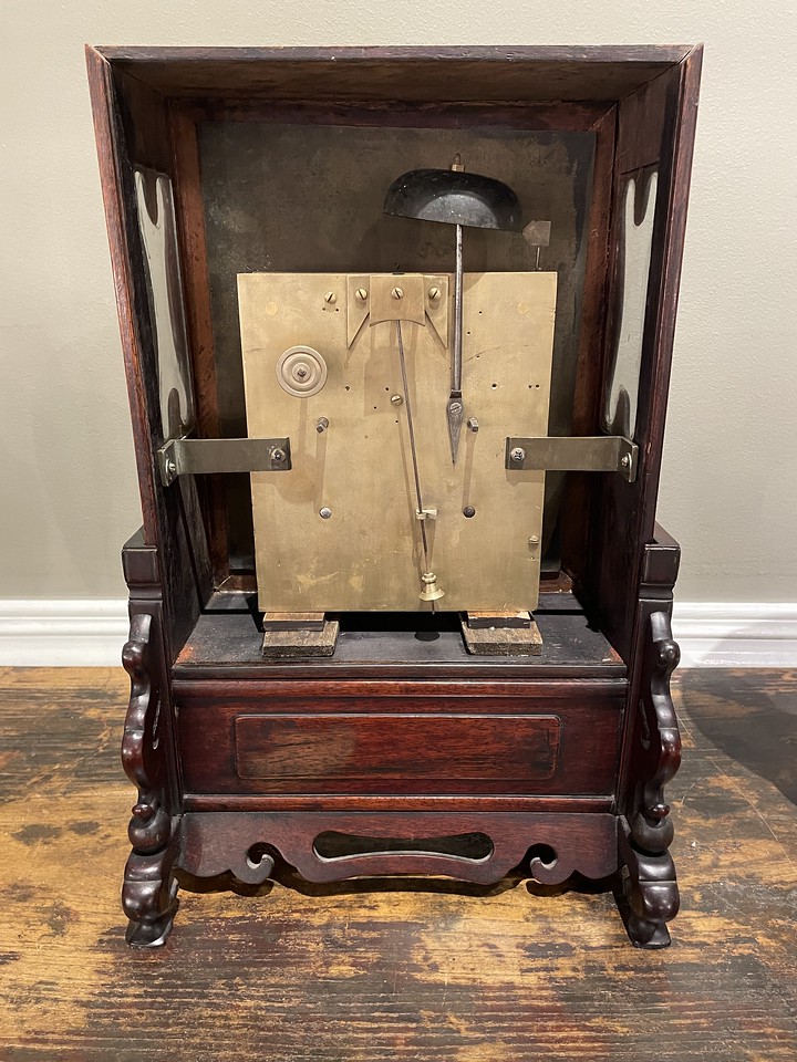 此钟为3号苏钟,由我国苏州地区生产。年代:20世纪早期(民国时期)。花梨木外壳,单玲素机芯。(机芯与外壳连接锣丝为后配)外壳开光处应为云南大理石,(缺失)前面表针缺少秒针缺底座。铜面板图案较为粗糙。现市场价格约在1.5万元左右。