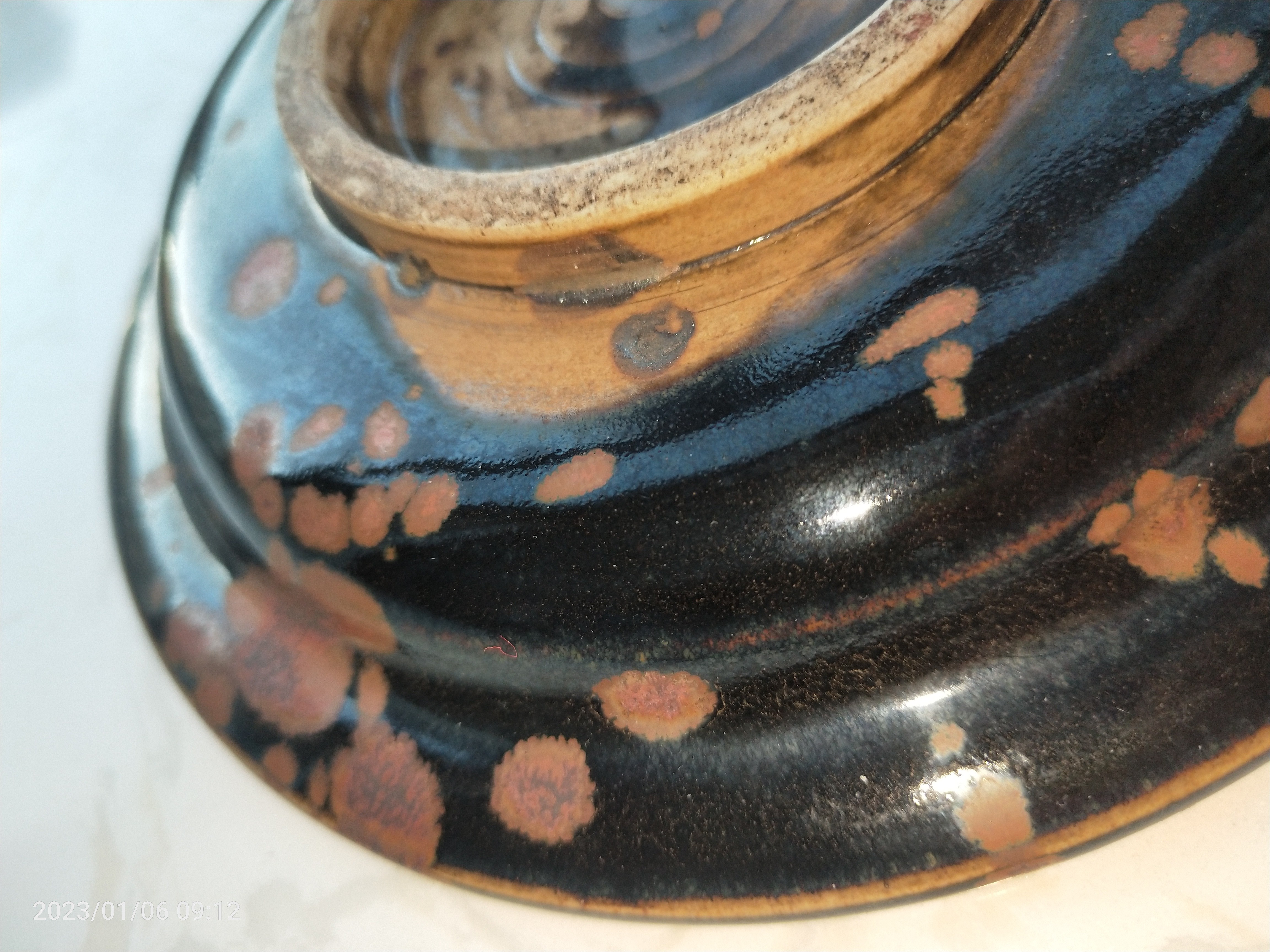 送鉴藏品,吉州窑酱釉褐斑折沿盘,釉色润泽,肥傲。底足平切。足心手工修胎纹路呈螺旋纹。挂薄釉。胎土细腻。干老!综上所述这是一件宋代吉州酱釉褐斑折沿盘。具有很高的收藏价值!