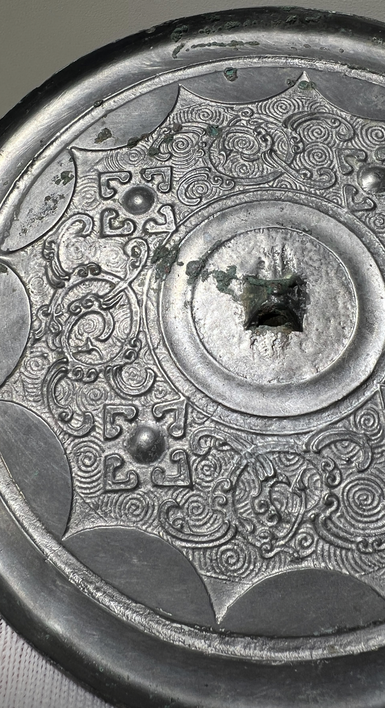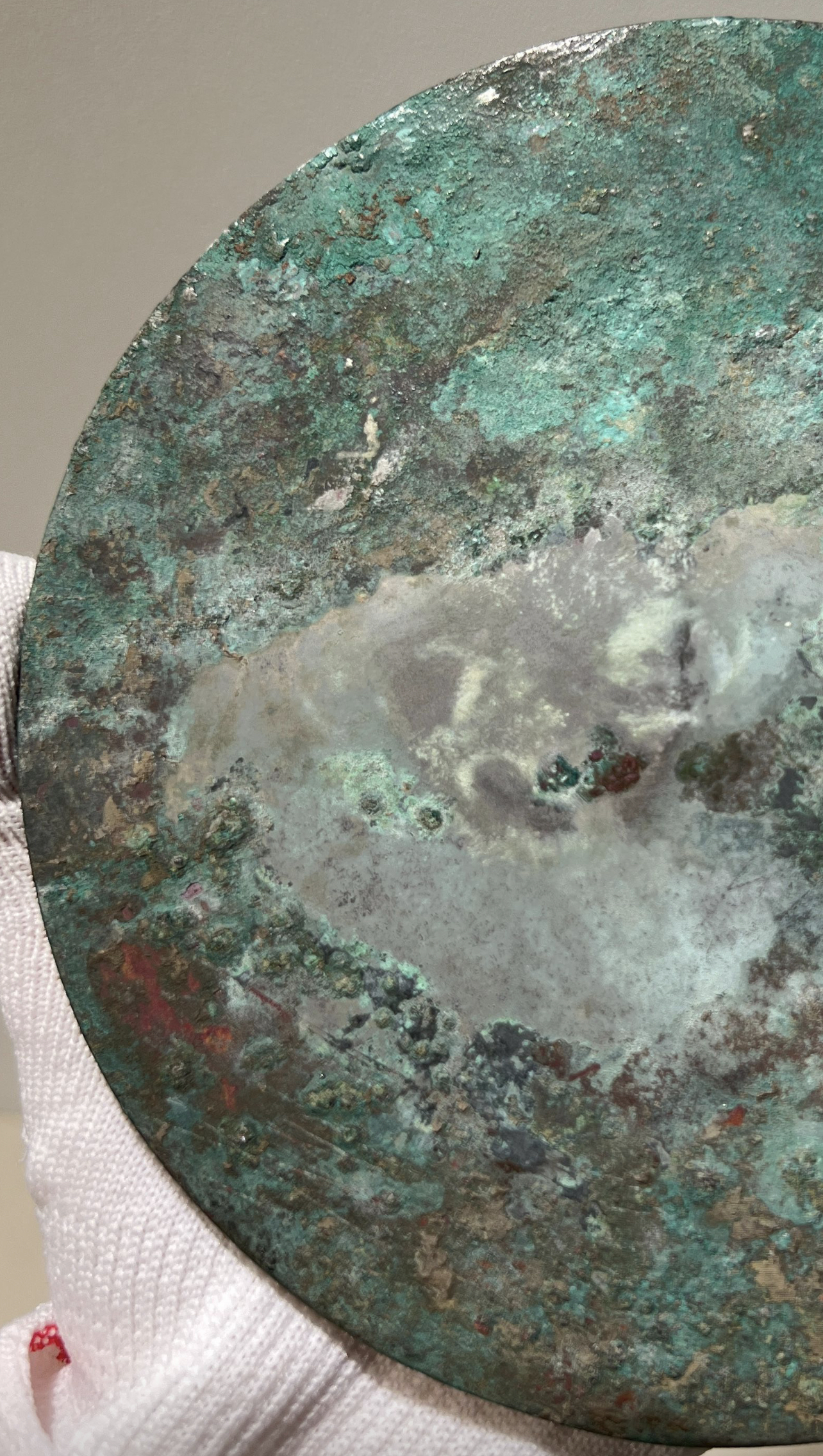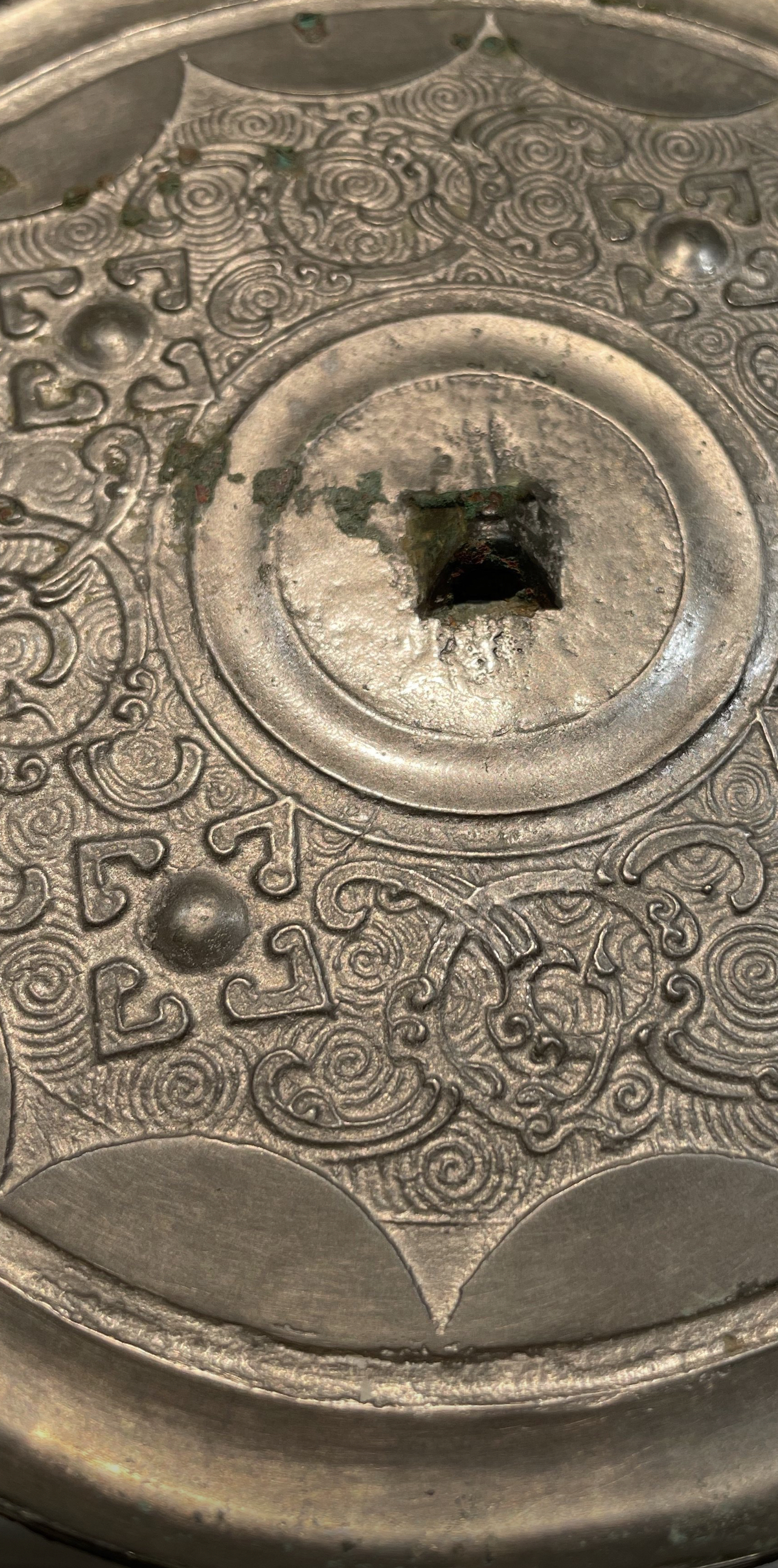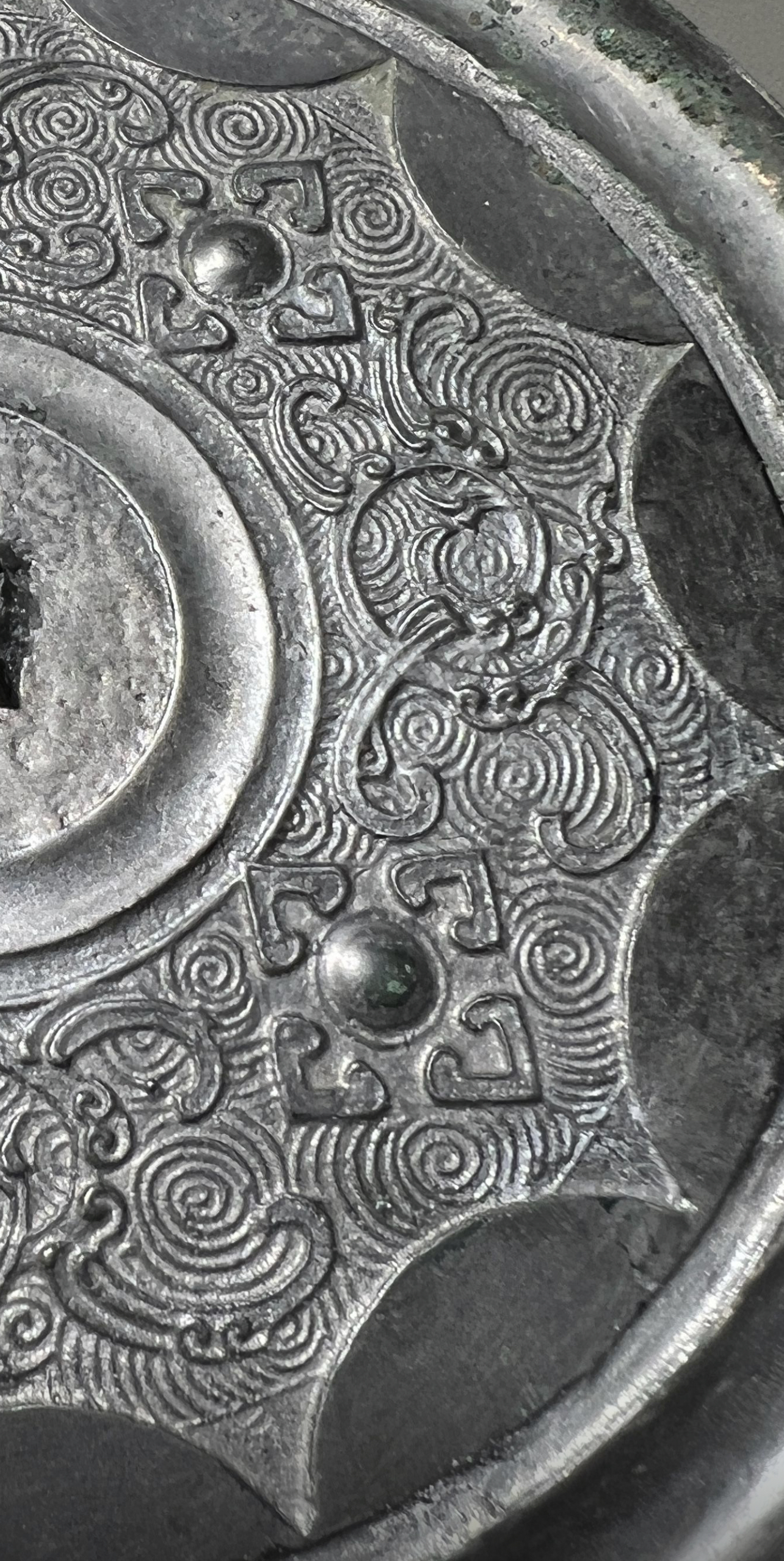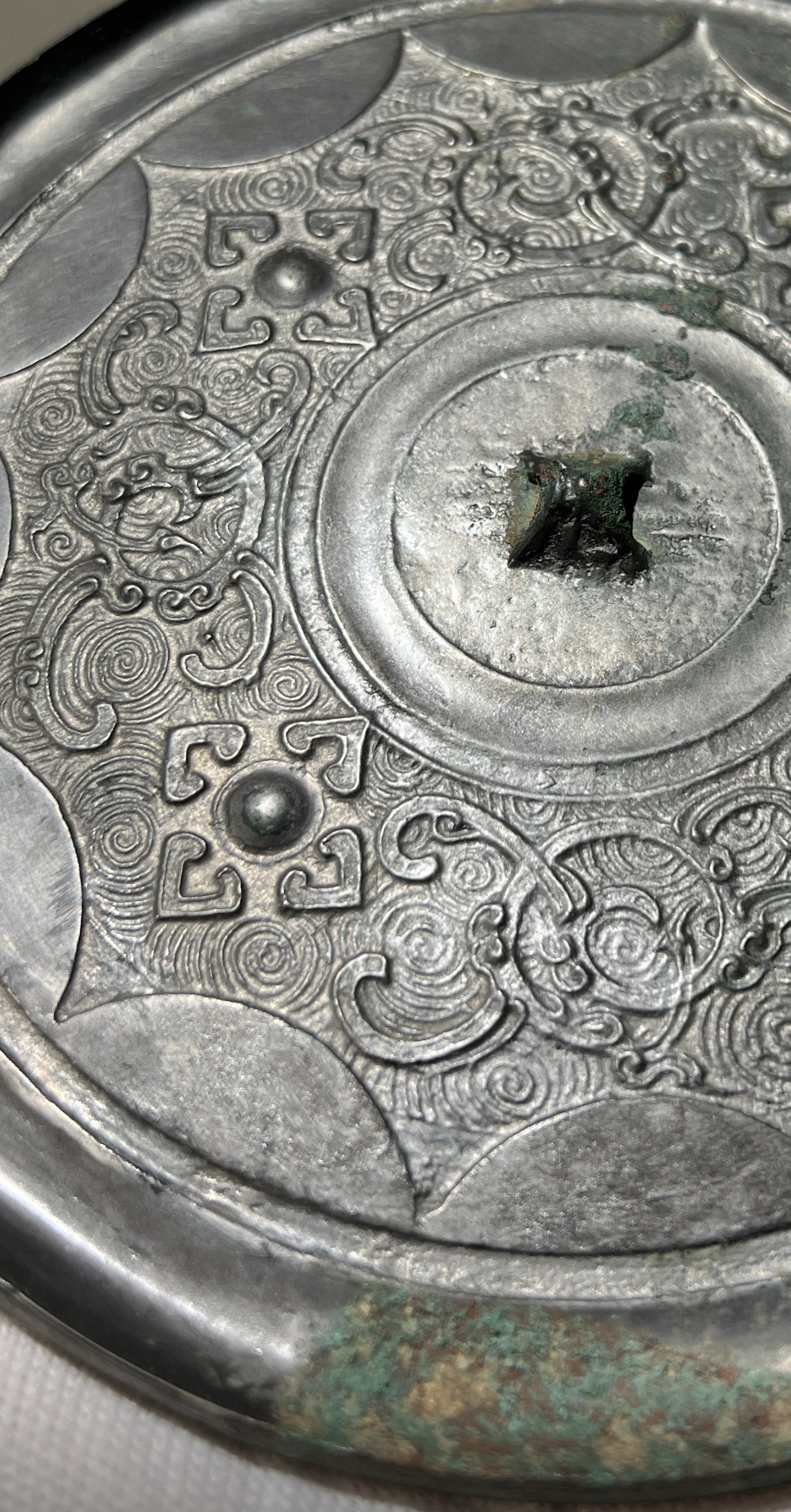 该镜应为战汉镜,其纽和蟠螭为战国纹饰,而沿为半球丶四乳有西汉的特征,但还应属战国镜,准确表述可为战汉镜,即战国未期西汉早期镜!该镜版模不错,应为一版半模,惜三纽周围修胎留有铸痕,镜背有几处入骨粉绣以及镜面绣重!但镜面白光,说明铜质特佳!战汉镜有16公分已属大镜,确实不错,价约2一3万左右!!