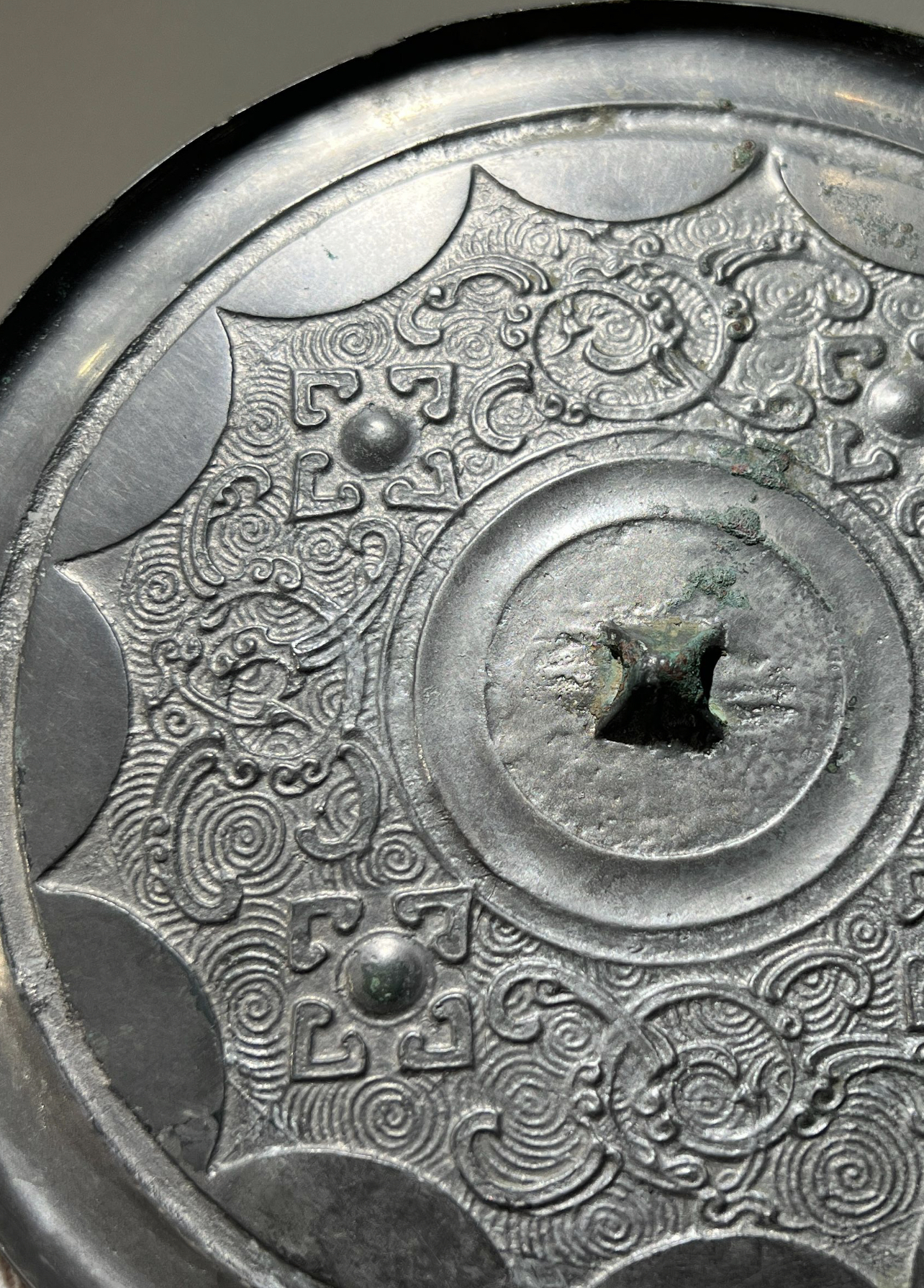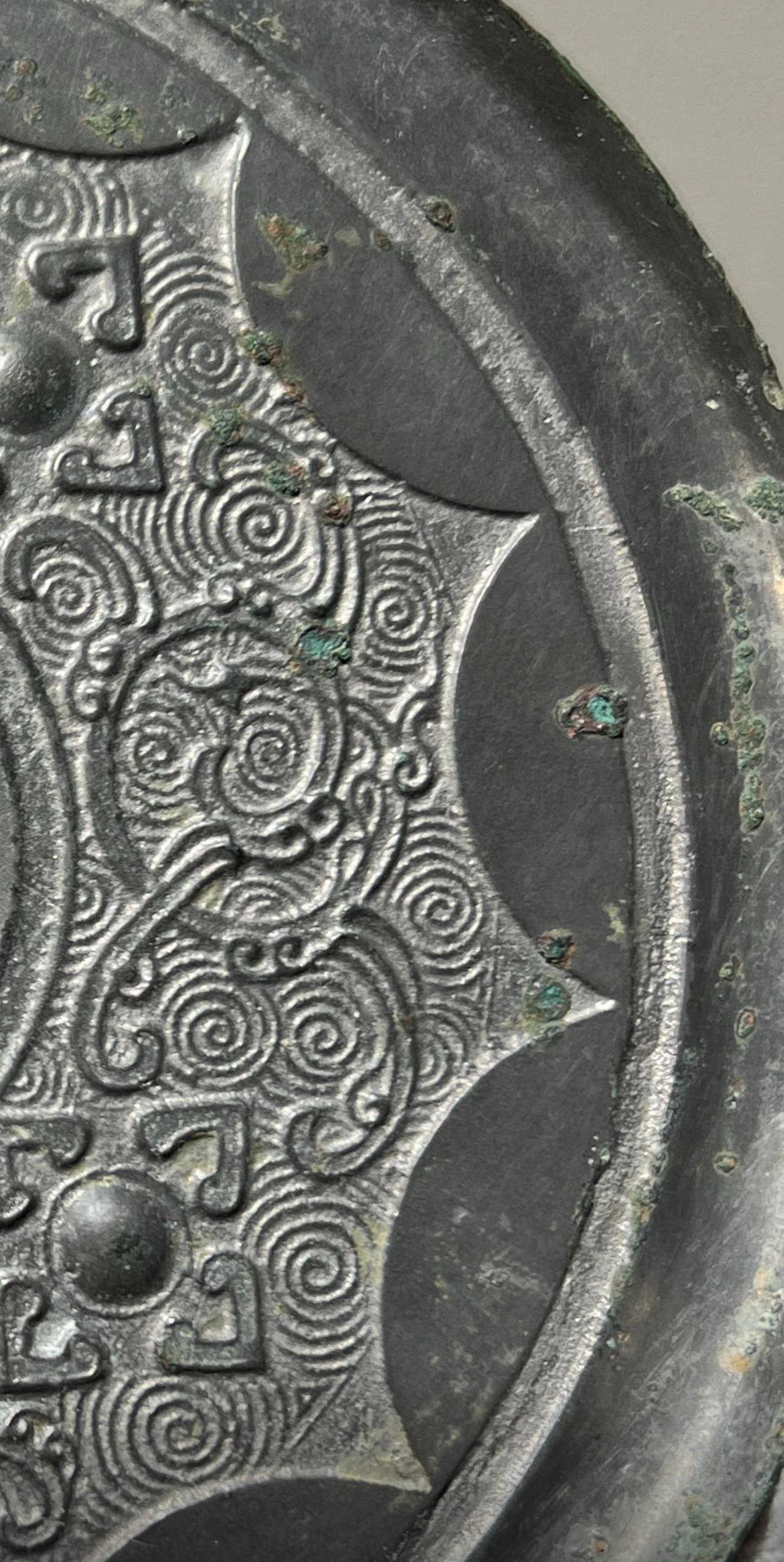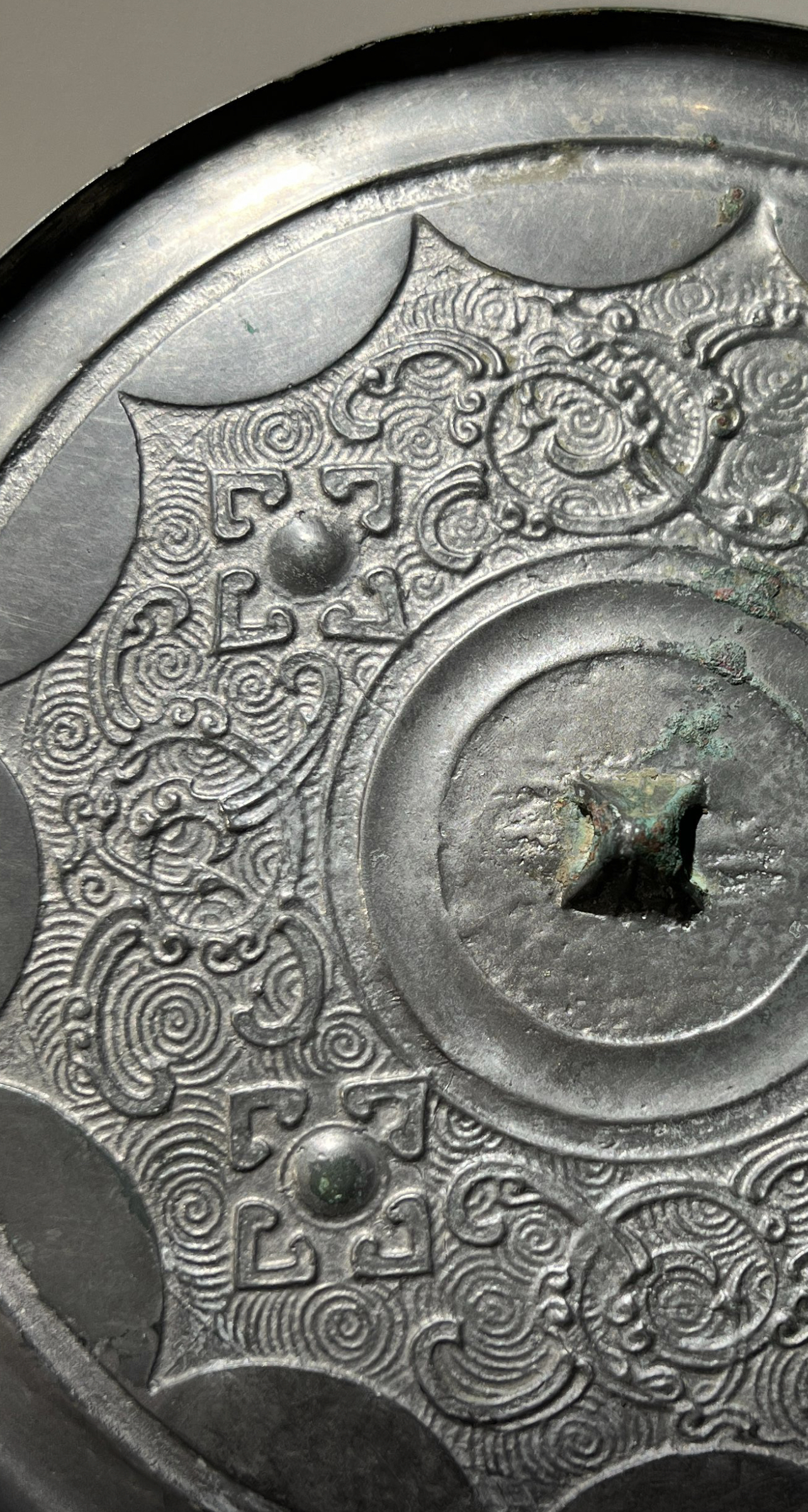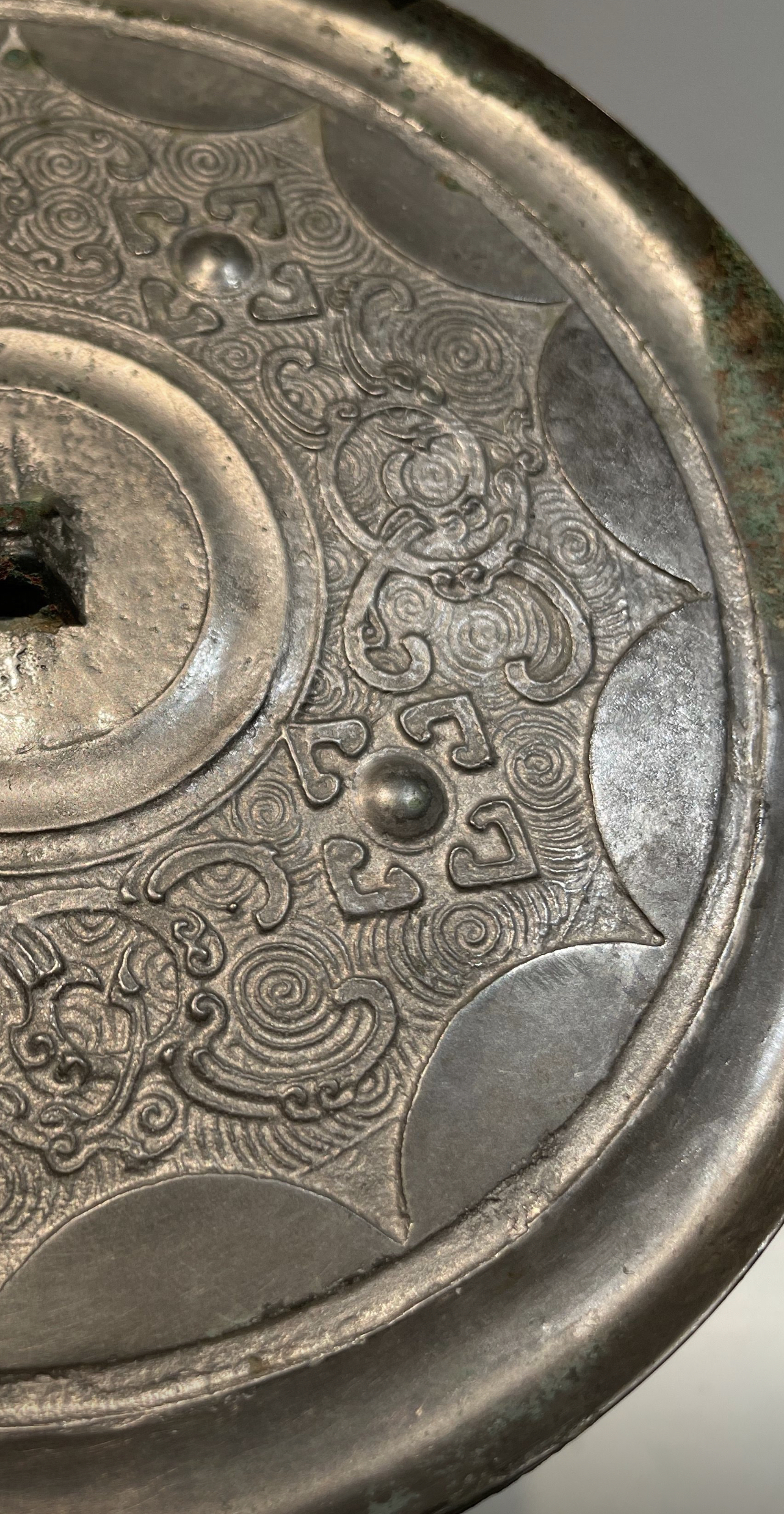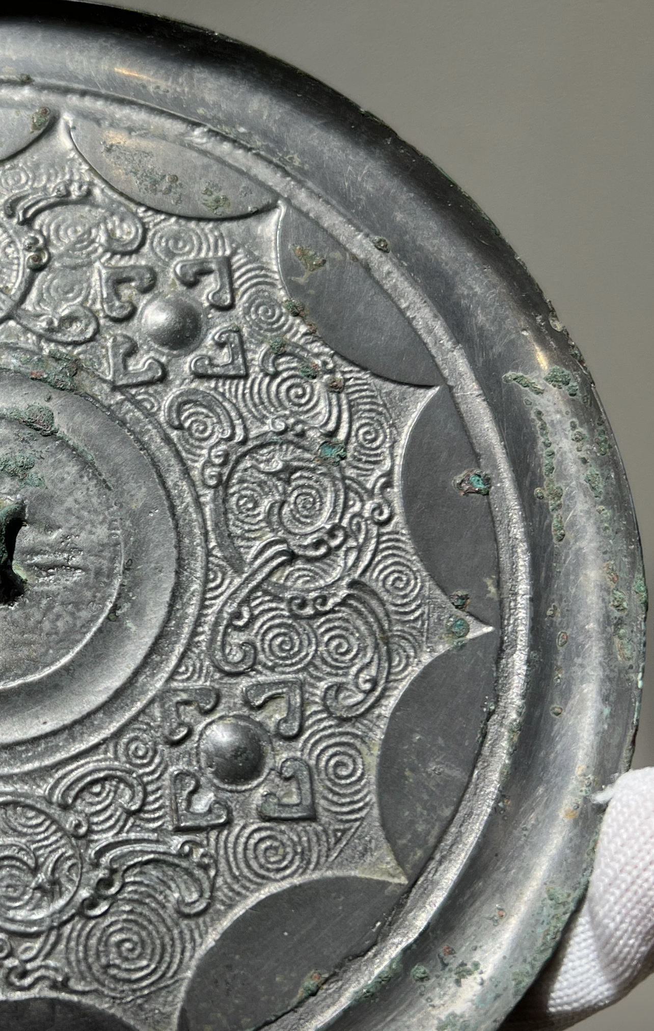 该镜应为战汉镜,其纽和蟠螭为战国纹饰,而沿为半球丶四乳有西汉的特征,但还应属战国镜,准确表述可为战汉镜,即战国未期西汉早期镜!该镜版模不错,应为一版半模,惜三纽周围修胎留有铸痕,镜背有几处入骨粉绣以及镜面绣重!但镜面白光,说明铜质特佳!战汉镜有16公分已属大镜,确实不错,价约2一3万左右!!