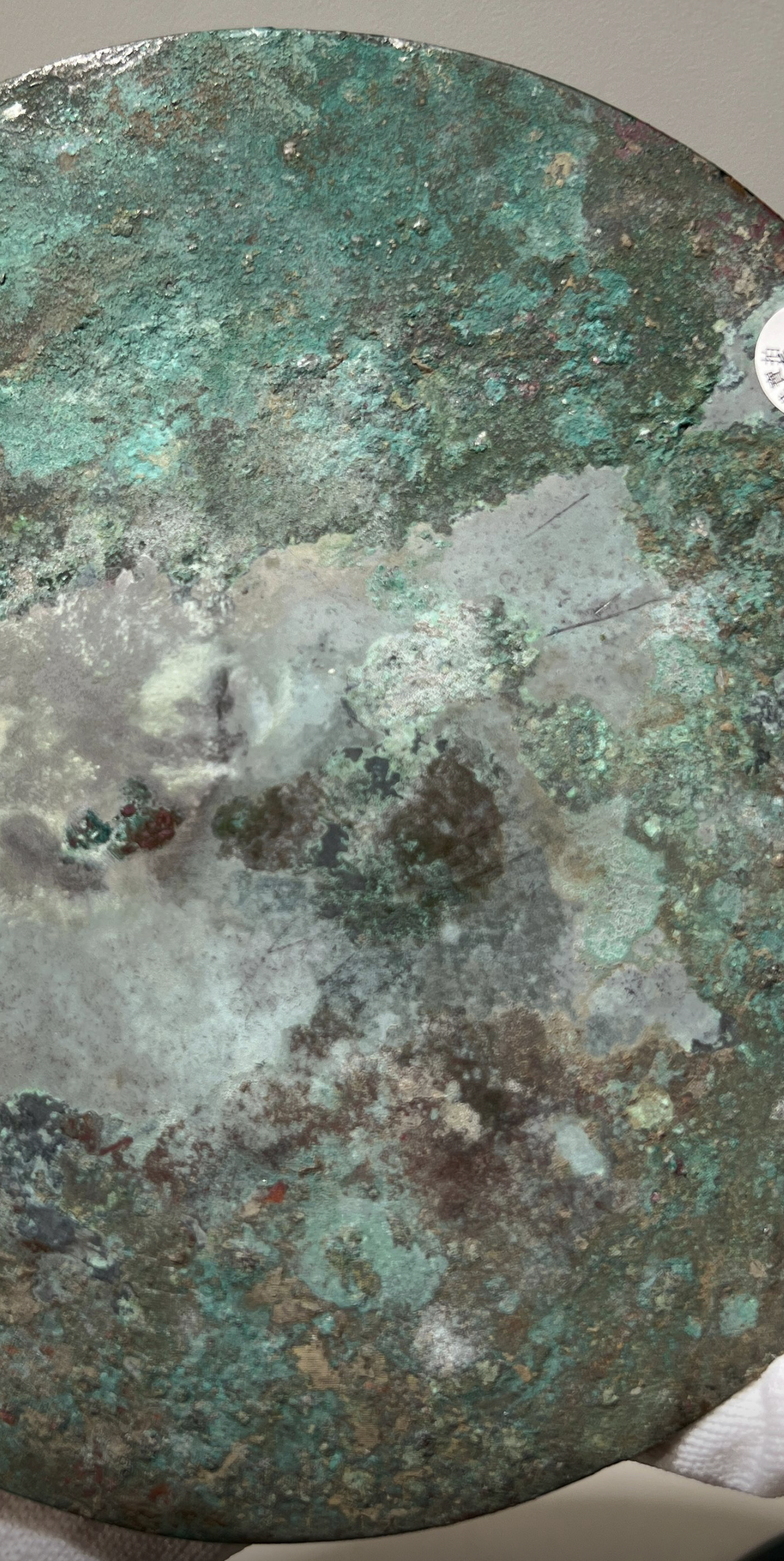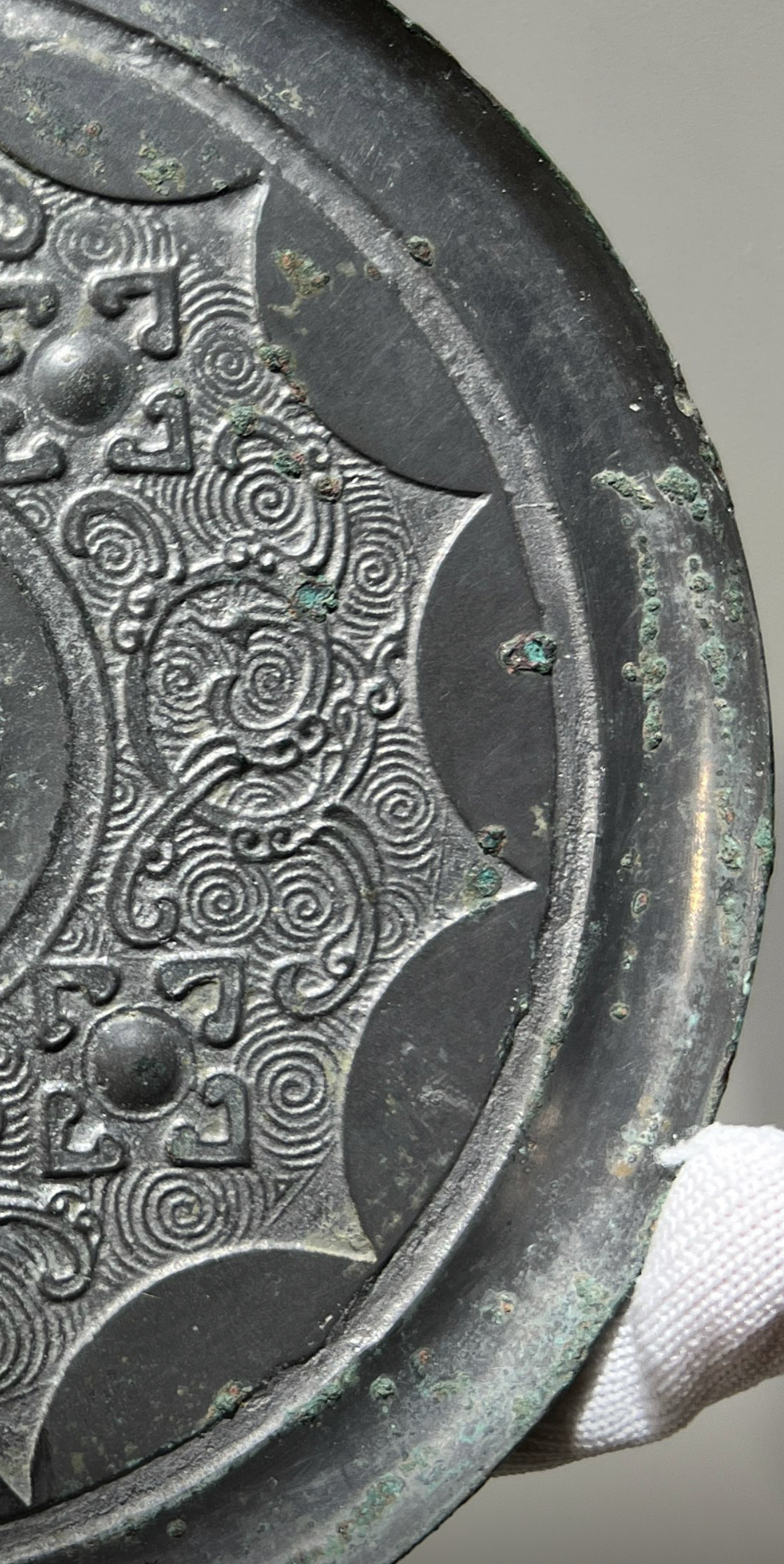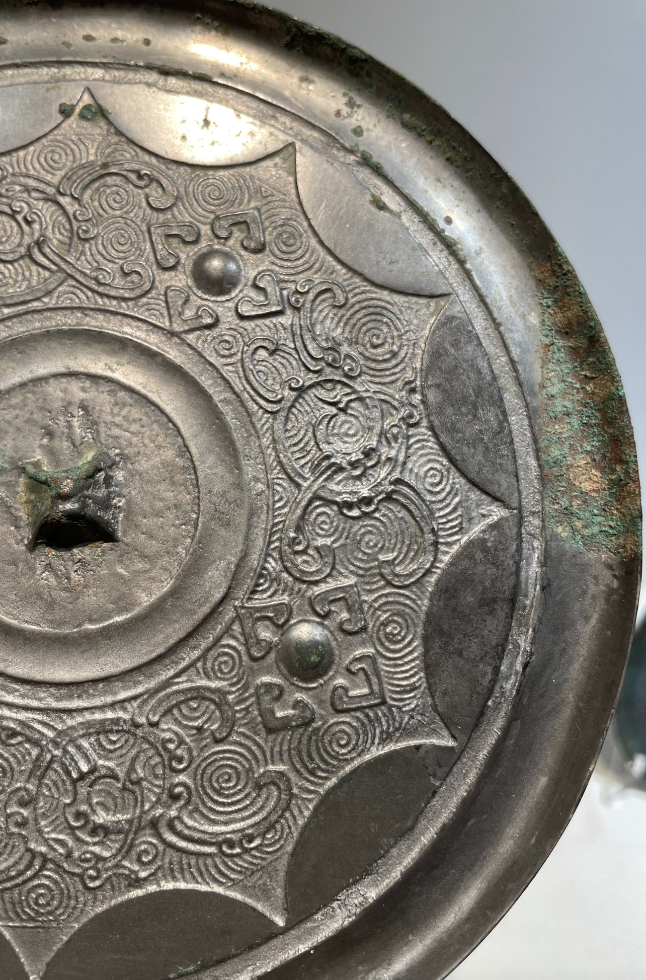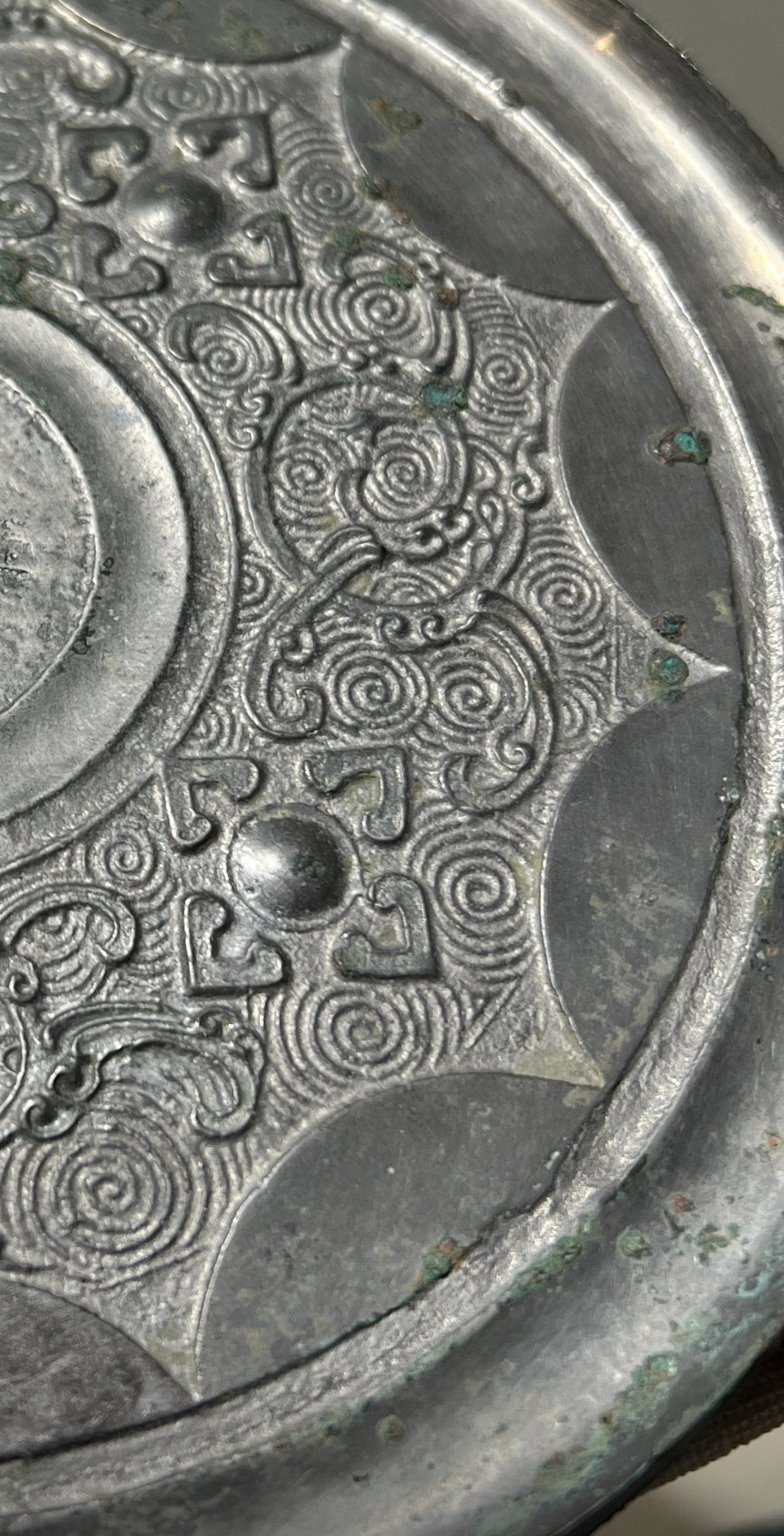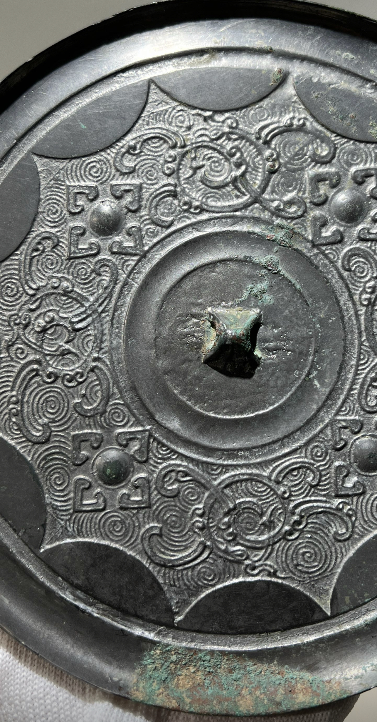 该镜应为战汉镜,其纽和蟠螭为战国纹饰,而沿为半球丶四乳有西汉的特征,但还应属战国镜,准确表述可为战汉镜,即战国未期西汉早期镜!该镜版模不错,应为一版半模,惜三纽周围修胎留有铸痕,镜背有几处入骨粉绣以及镜面绣重!但镜面白光,说明铜质特佳!战汉镜有16公分已属大镜,确实不错,价约2一3万左右!!