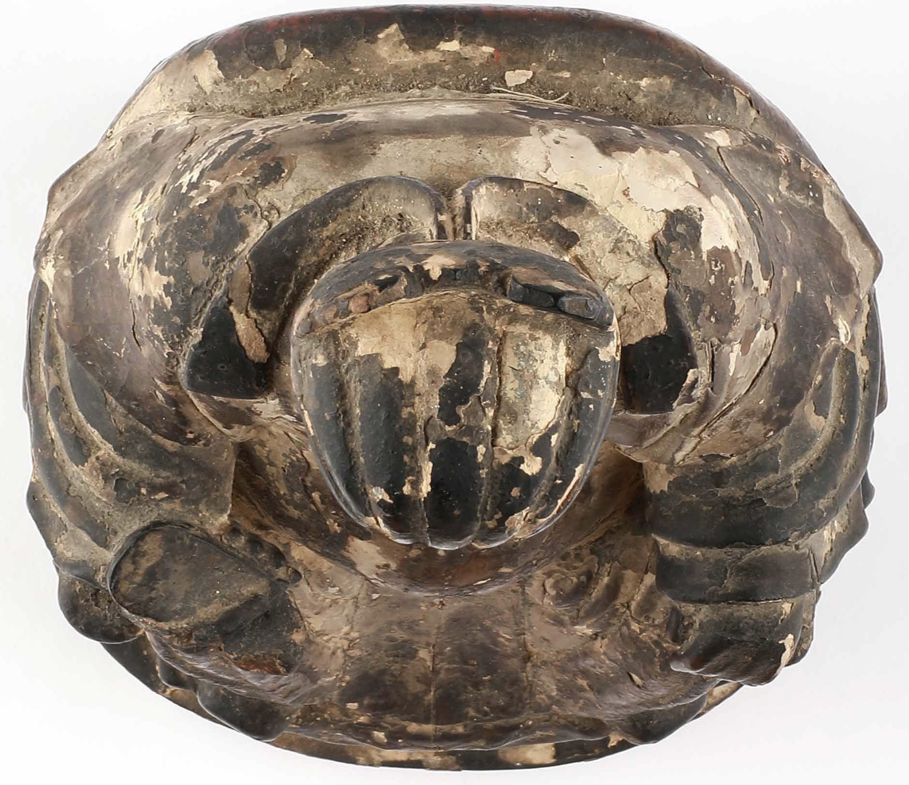 文昌帝君,个人感觉脸部处理写实生动,以及背颈部处理有明代感觉。但是座椅粗线处理,脚踏雕刻和衣纹处理,应该为清代木雕造像。脸部的枣红色漆,周身用墨绘,这种表现形式在清晚期出现得比较多,但不排除这尊像有多次重装的可能性。整体风格看应为清中期以上,雕刻非常不错,个人意见估价8000-1万左右。以上供参考