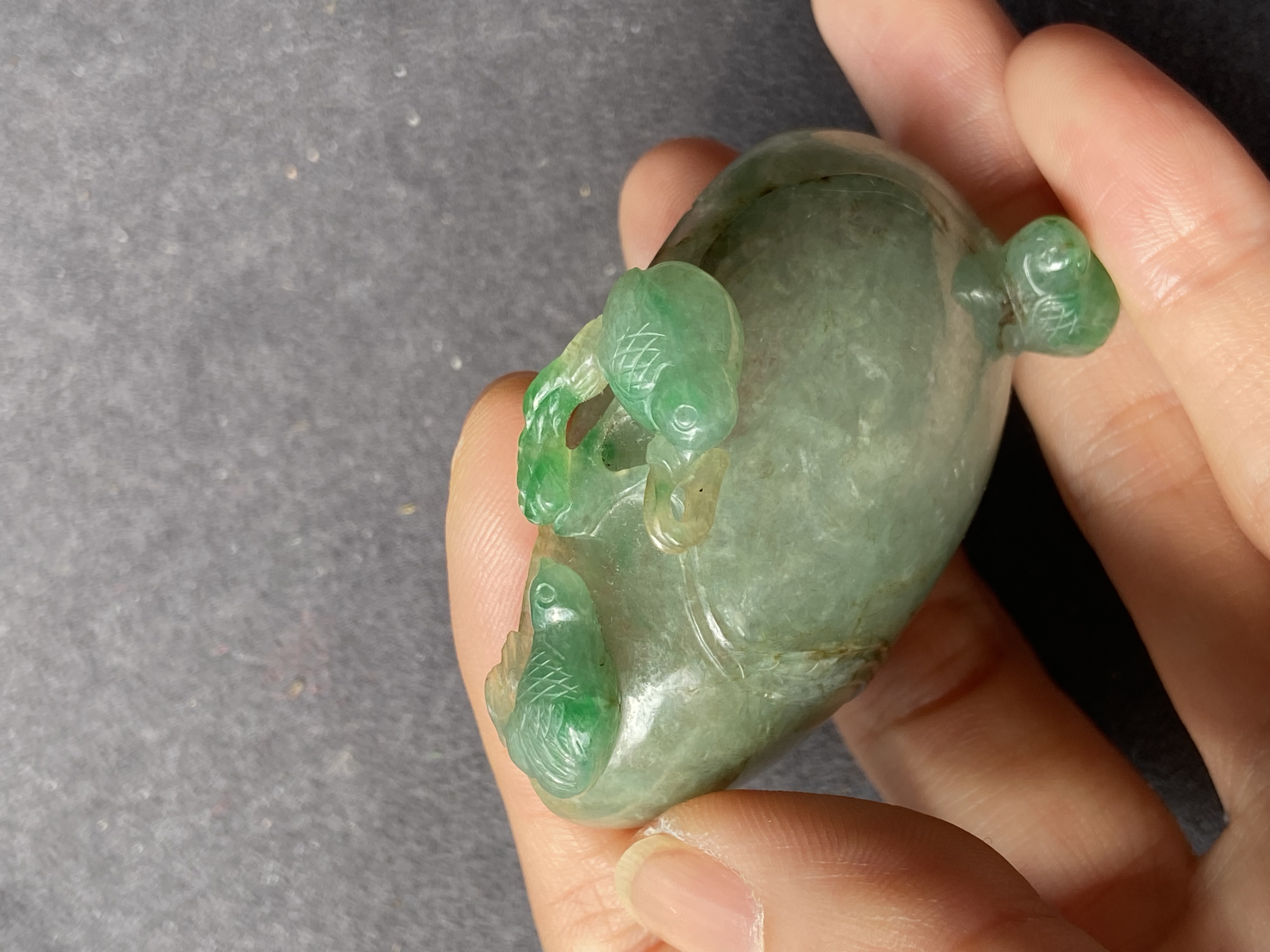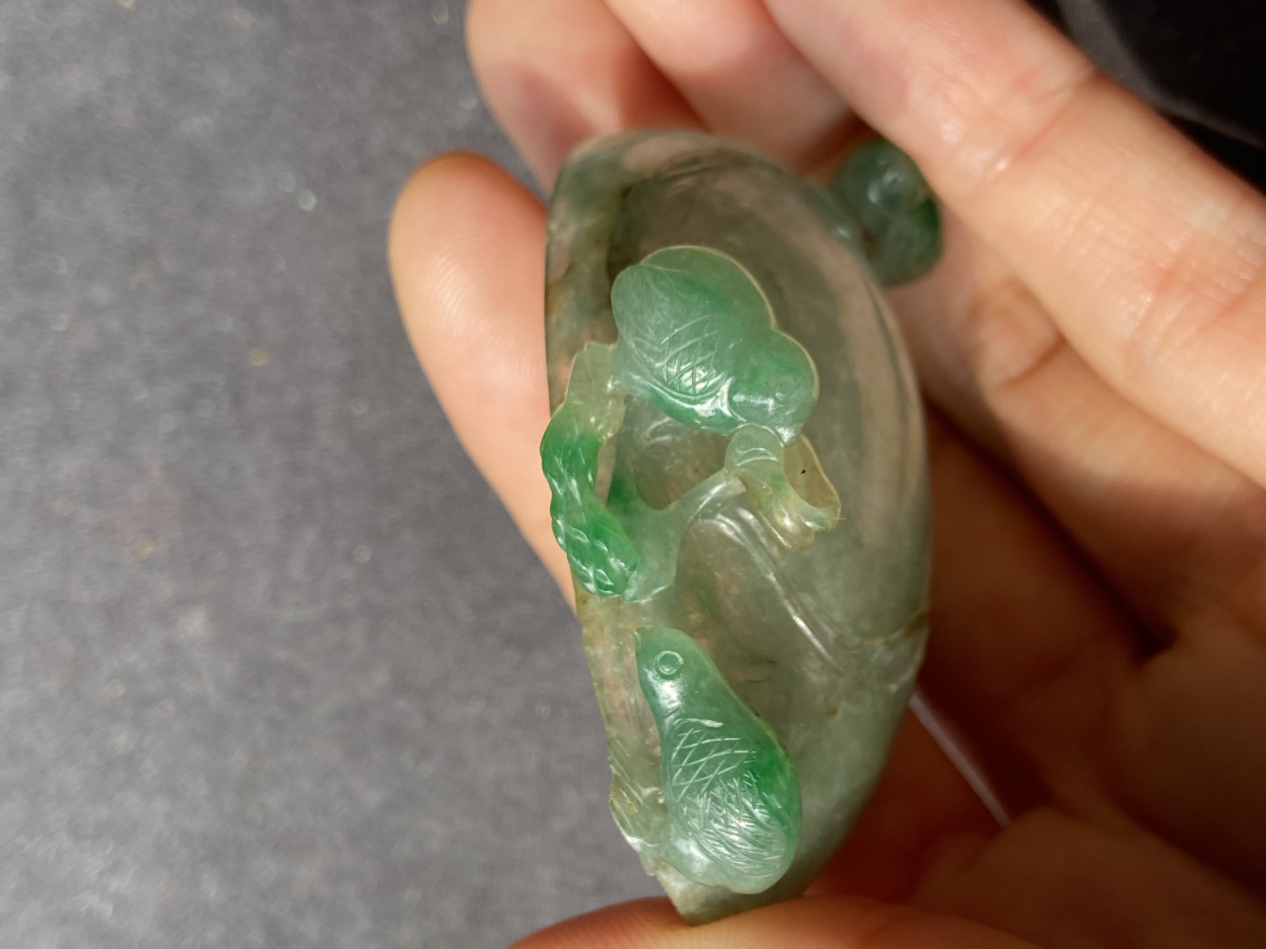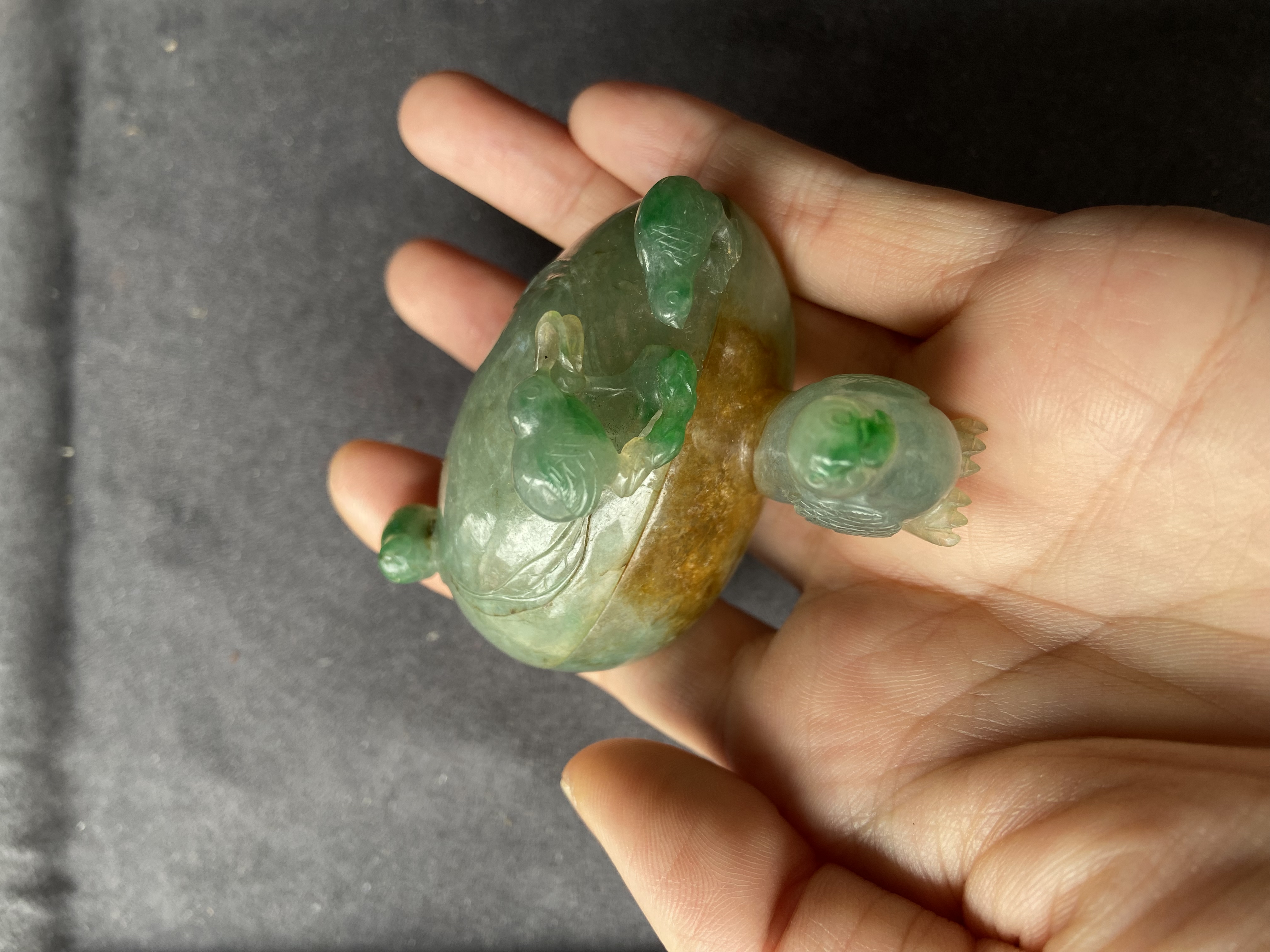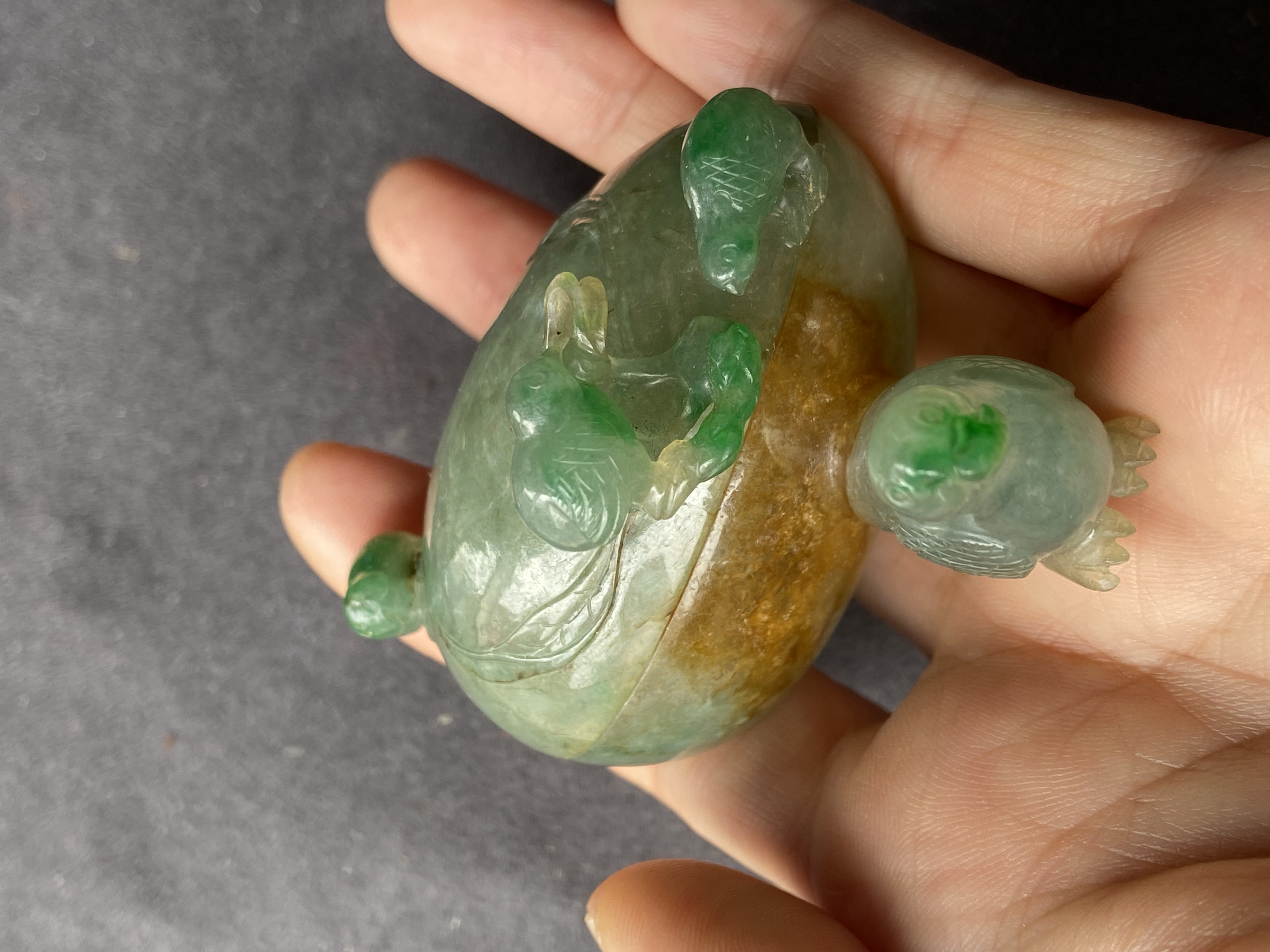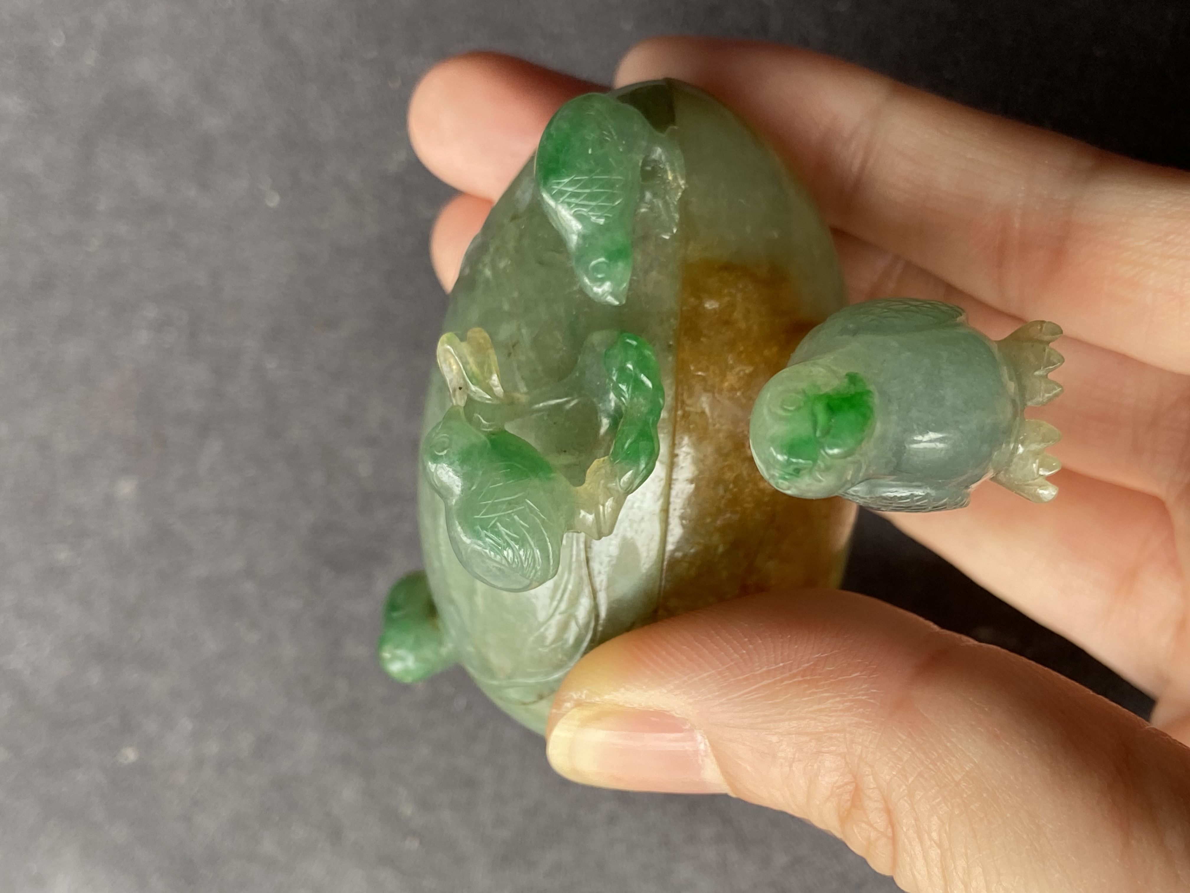此盒天然翡翠雕刻,种水冰透,色翠绿又带黄翡,通体圆雕、巧雕工艺,手工难度较大,技艺较为精炼,鸡纹刀工符合传统韵味,器型玲珑可爱,宜于文人香道案头把玩或当时女性化妆粉盒。此类造型在翡翠拍卖市场较少见,可惜沁色不够自然,图中显示有外裂,影响价格。