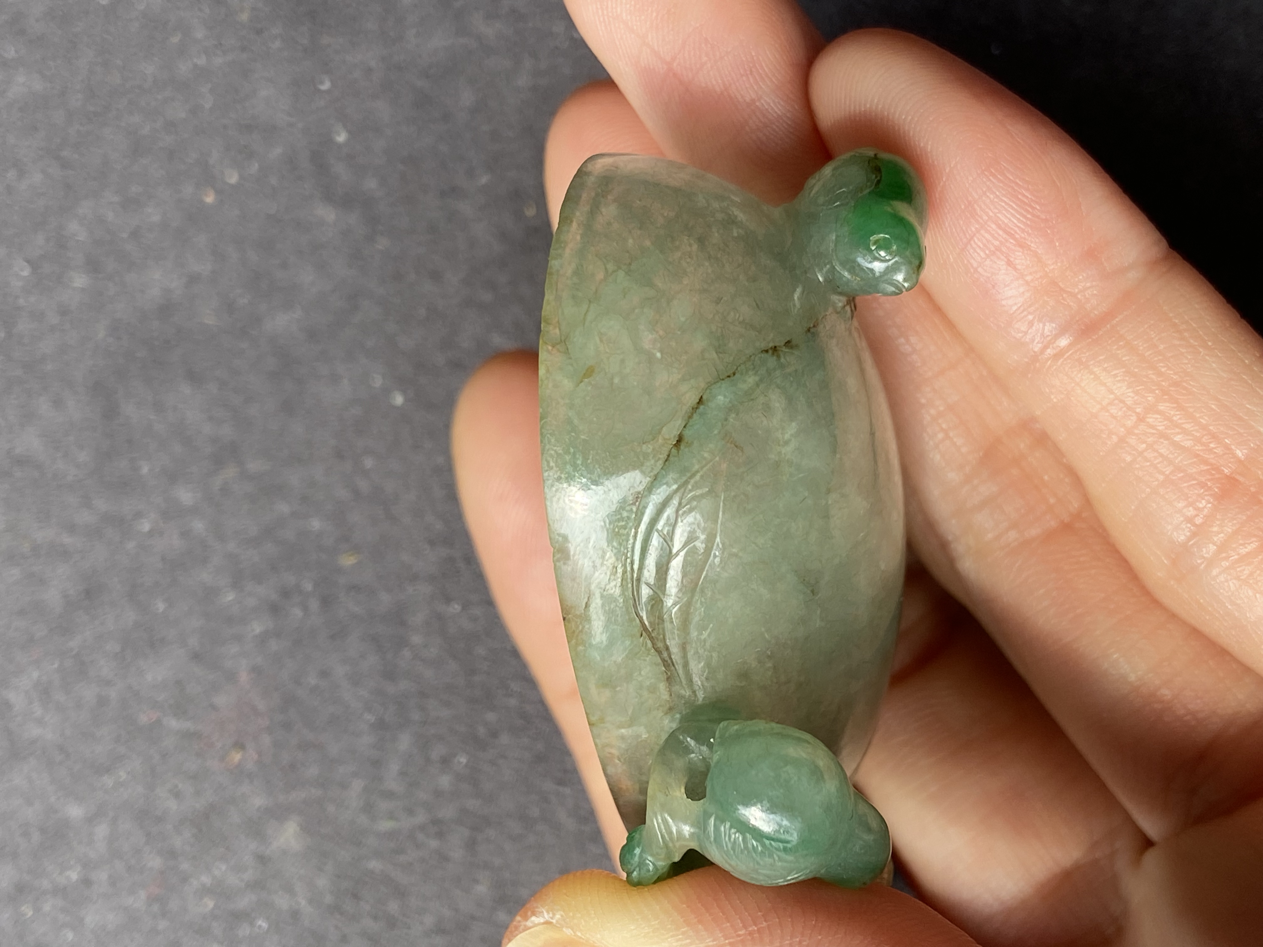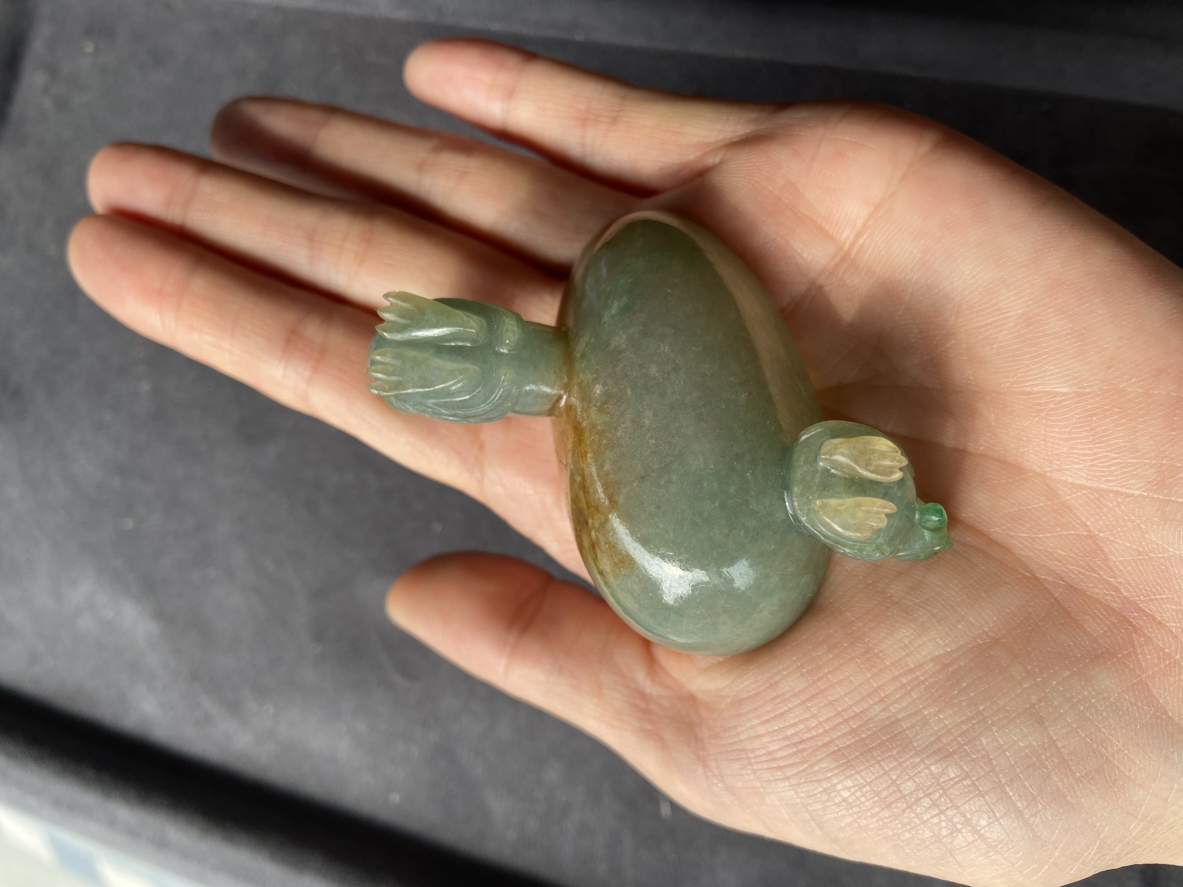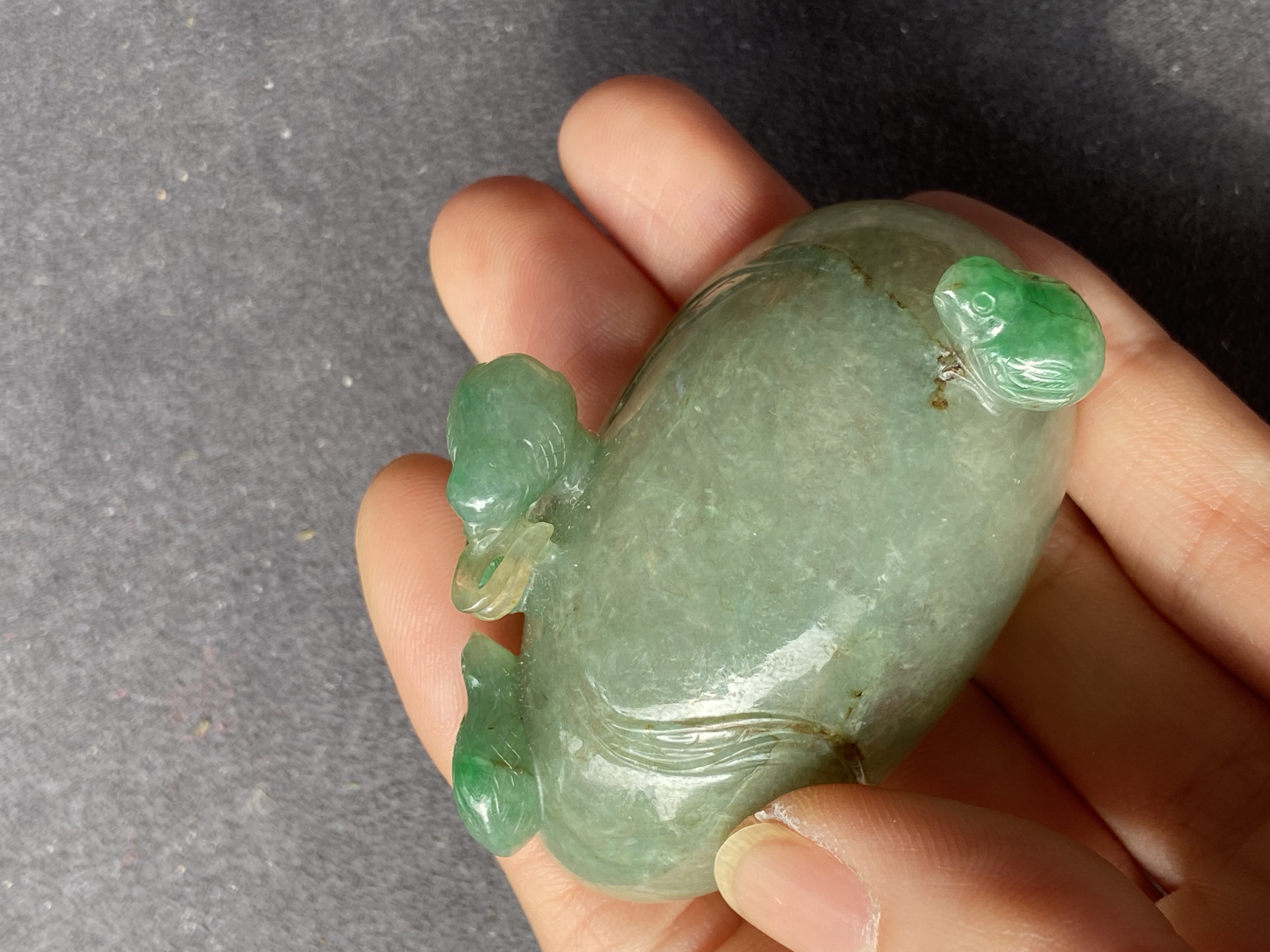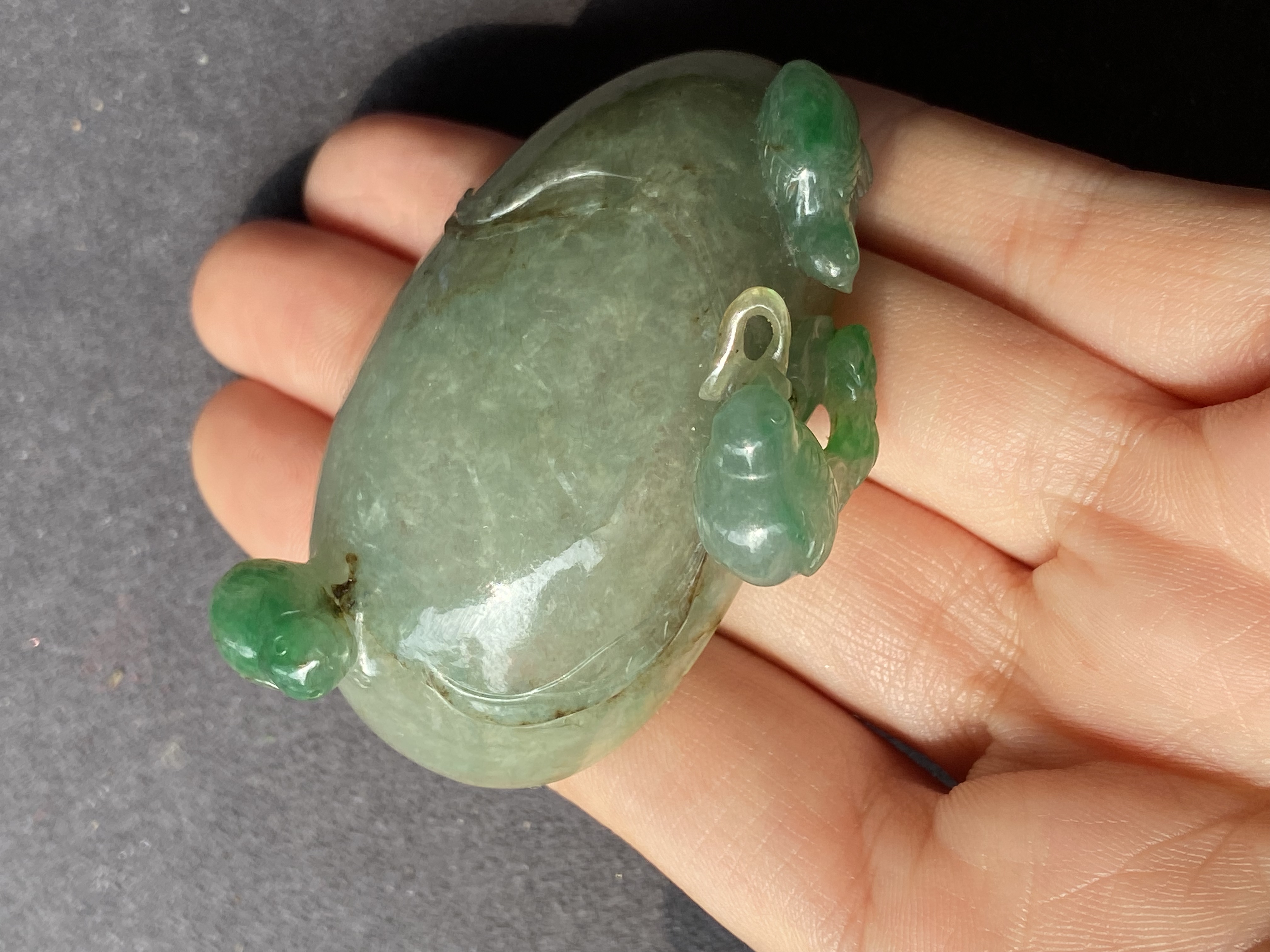 此盒天然翡翠雕刻,种水冰透,色翠绿又带黄翡,通体圆雕、巧雕工艺,手工难度较大,技艺较为精炼,鸡纹刀工符合传统韵味,器型玲珑可爱,宜于文人香道案头把玩或当时女性化妆粉盒。此类造型在翡翠拍卖市场较少见,可惜沁色不够自然,图中显示有外裂,影响价格。