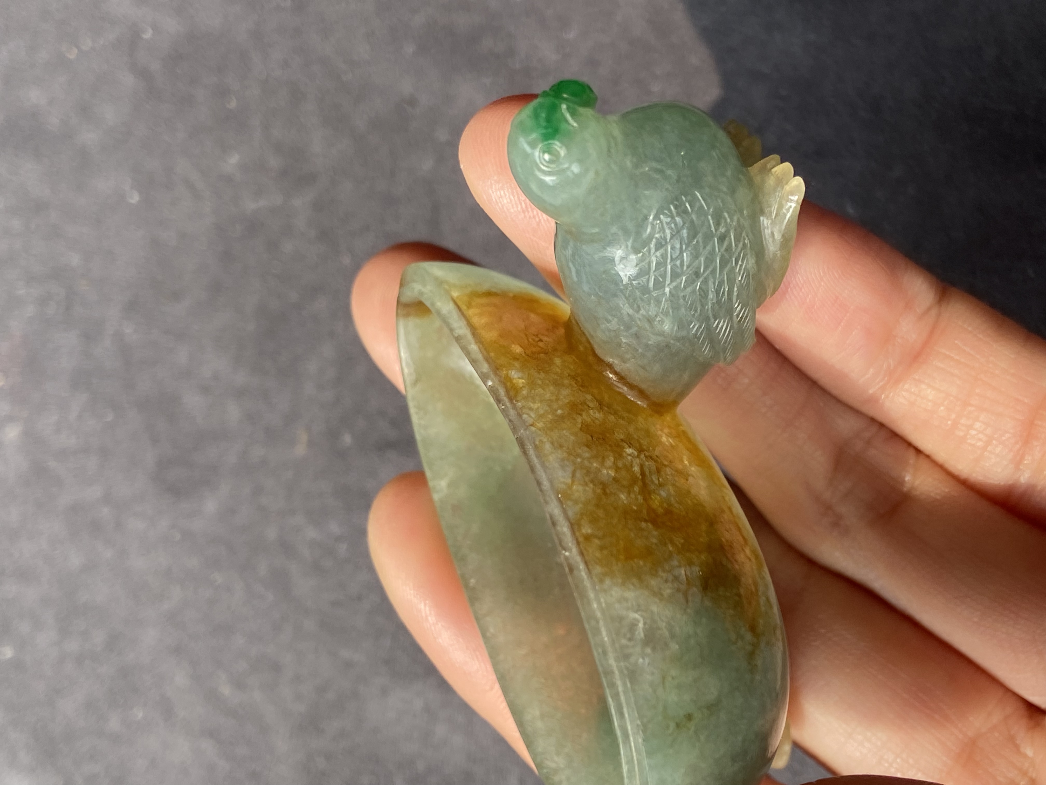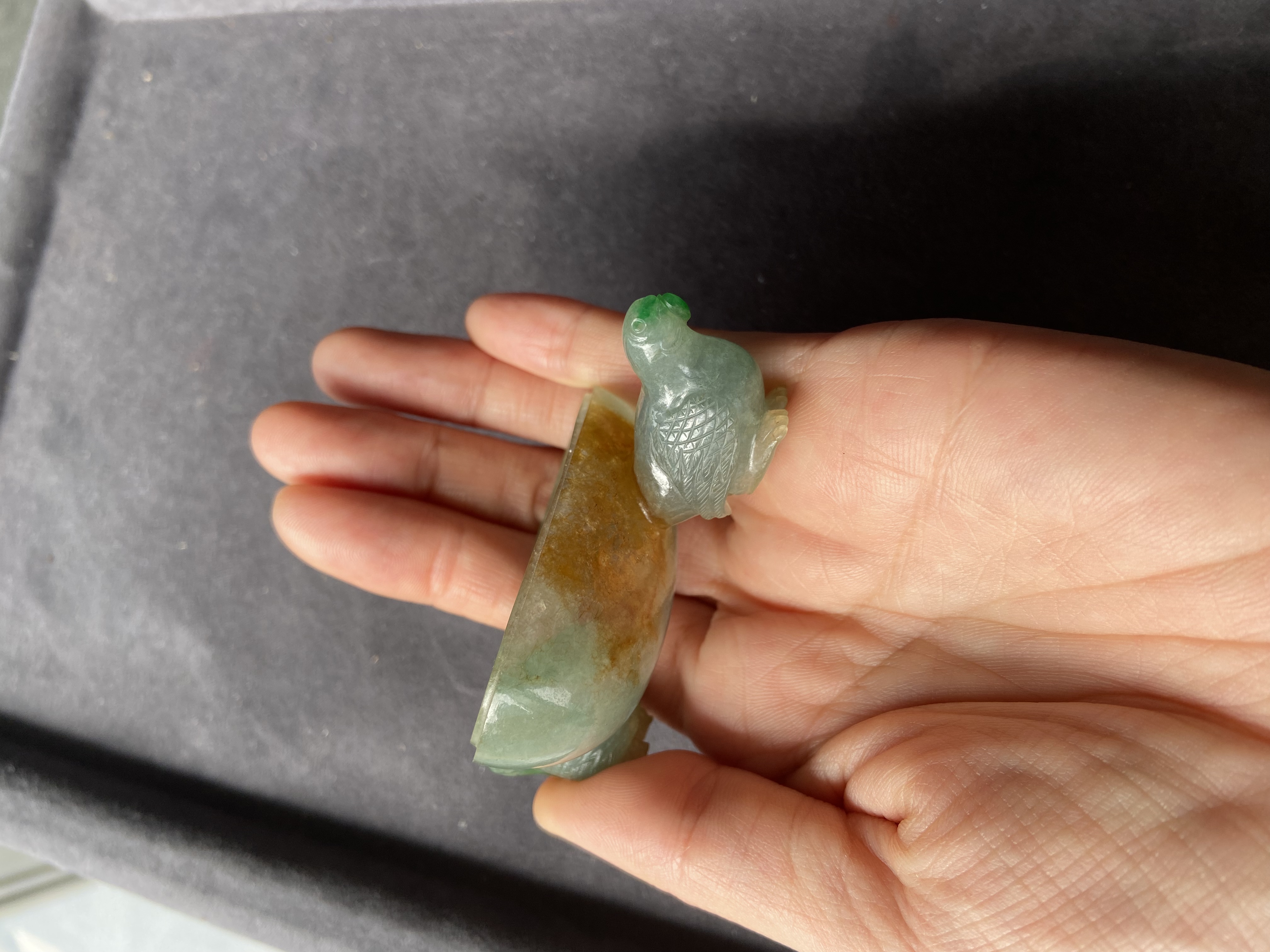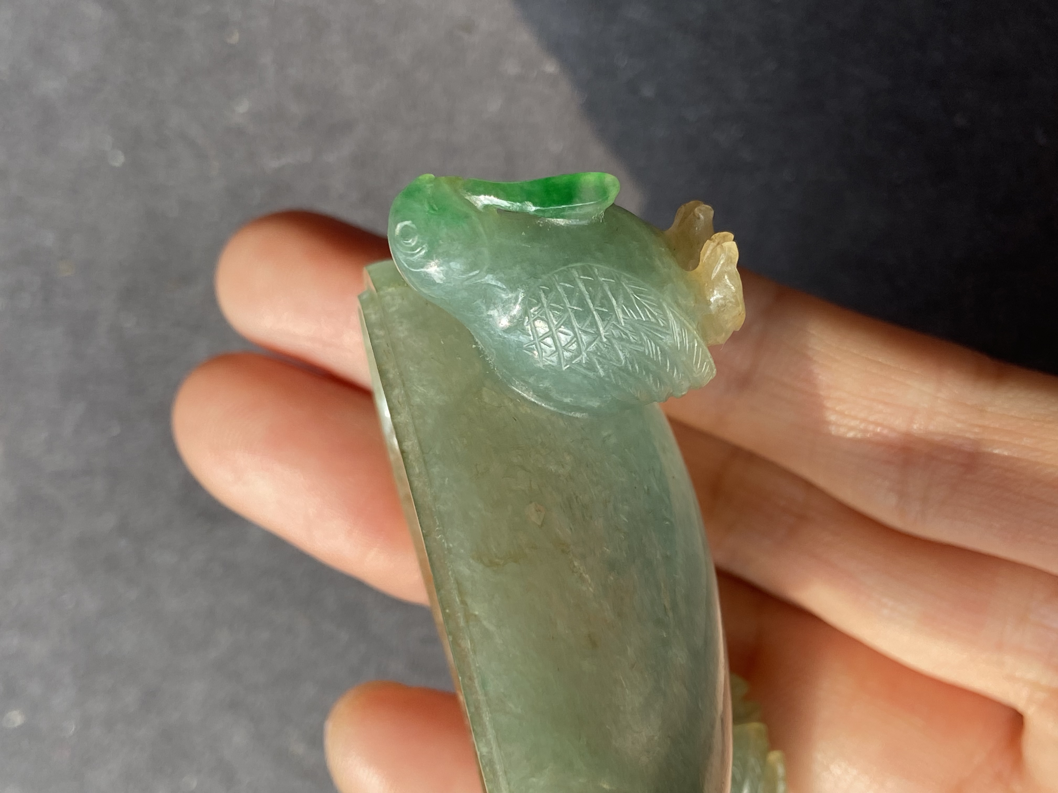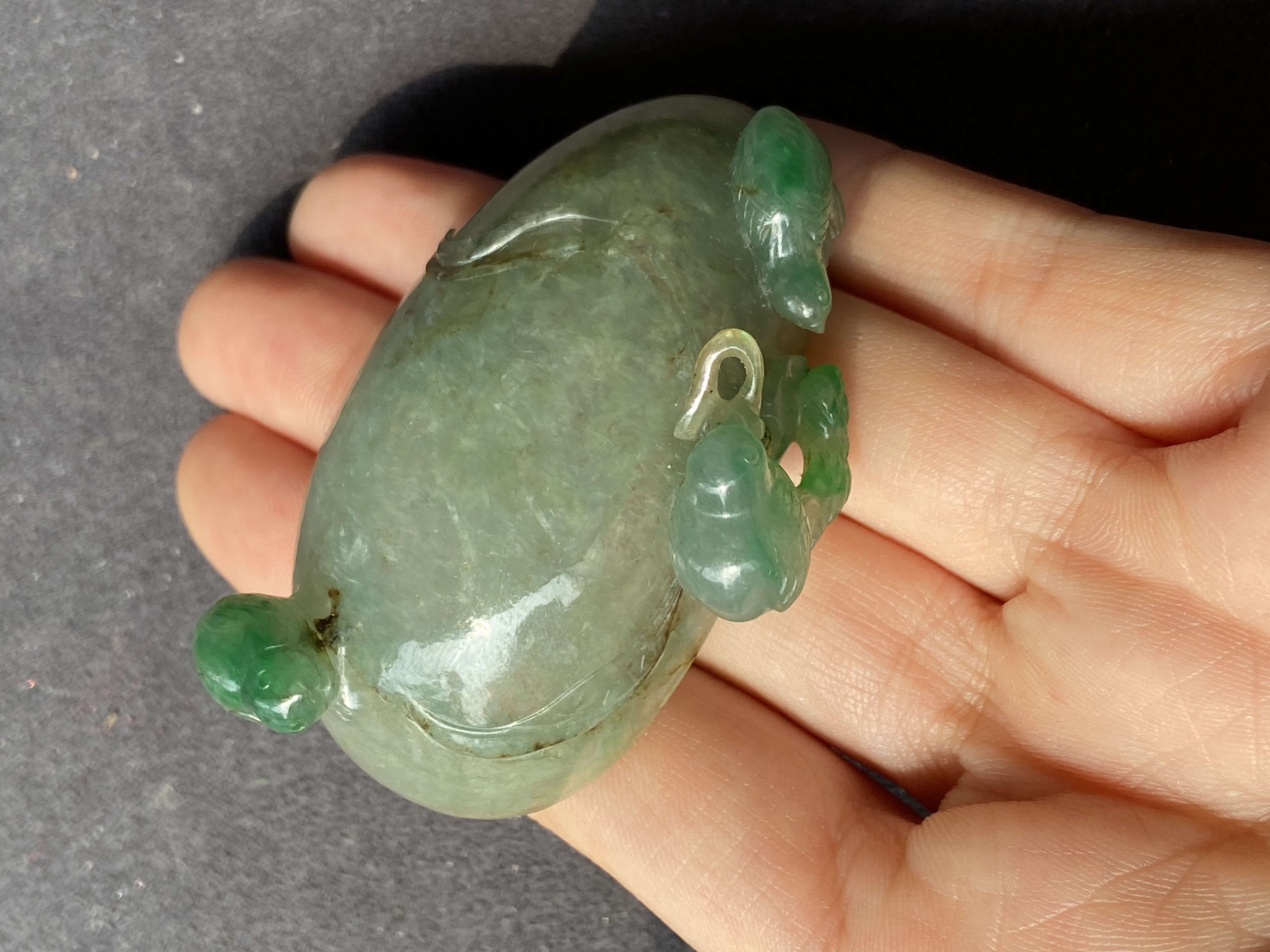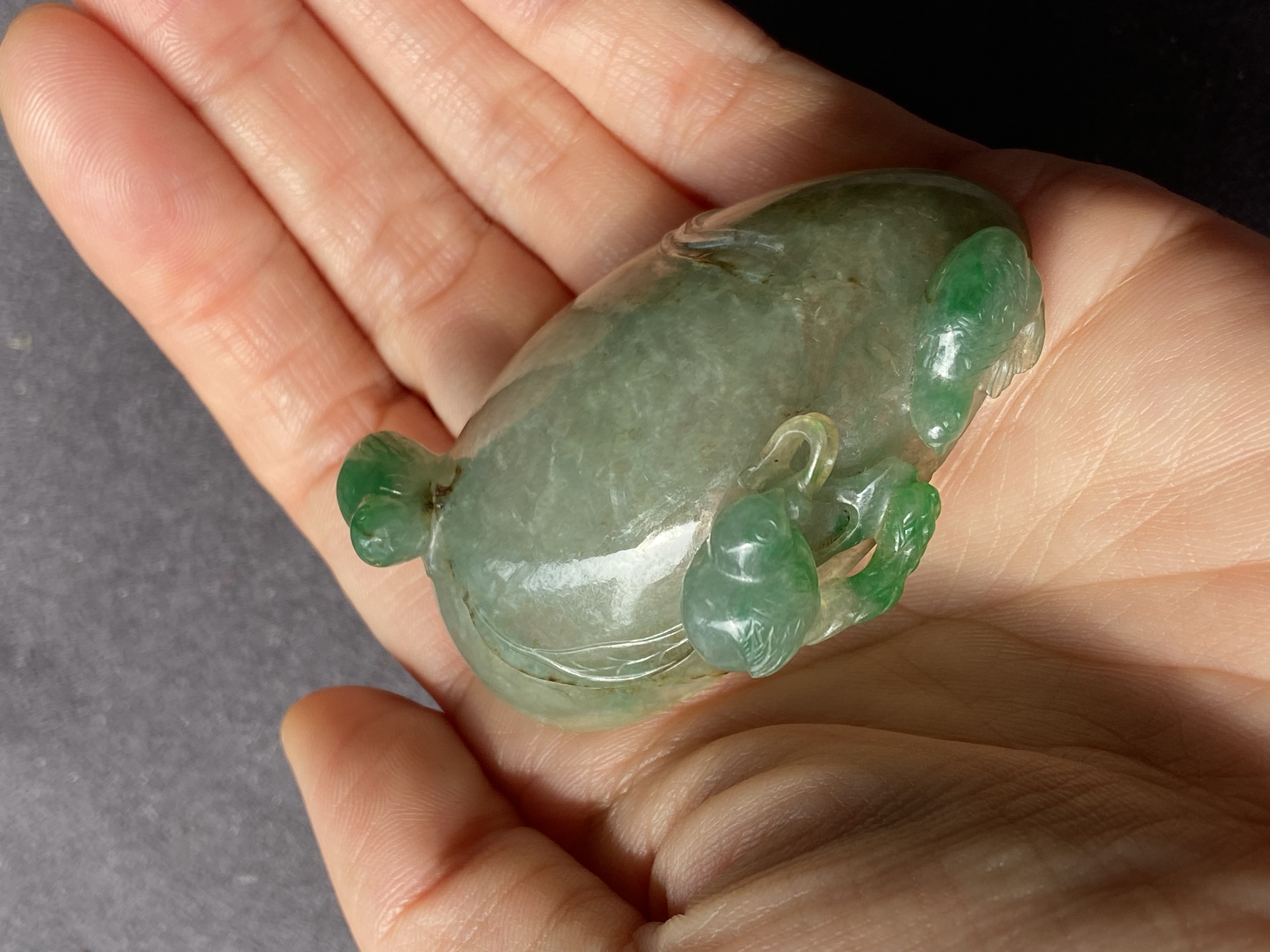 此盒天然翡翠雕刻,种水冰透,色翠绿又带黄翡,通体圆雕、巧雕工艺,手工难度较大,技艺较为精炼,鸡纹刀工符合传统韵味,器型玲珑可爱,宜于文人香道案头把玩或当时女性化妆粉盒。此类造型在翡翠拍卖市场较少见,可惜沁色不够自然,图中显示有外裂,影响价格。