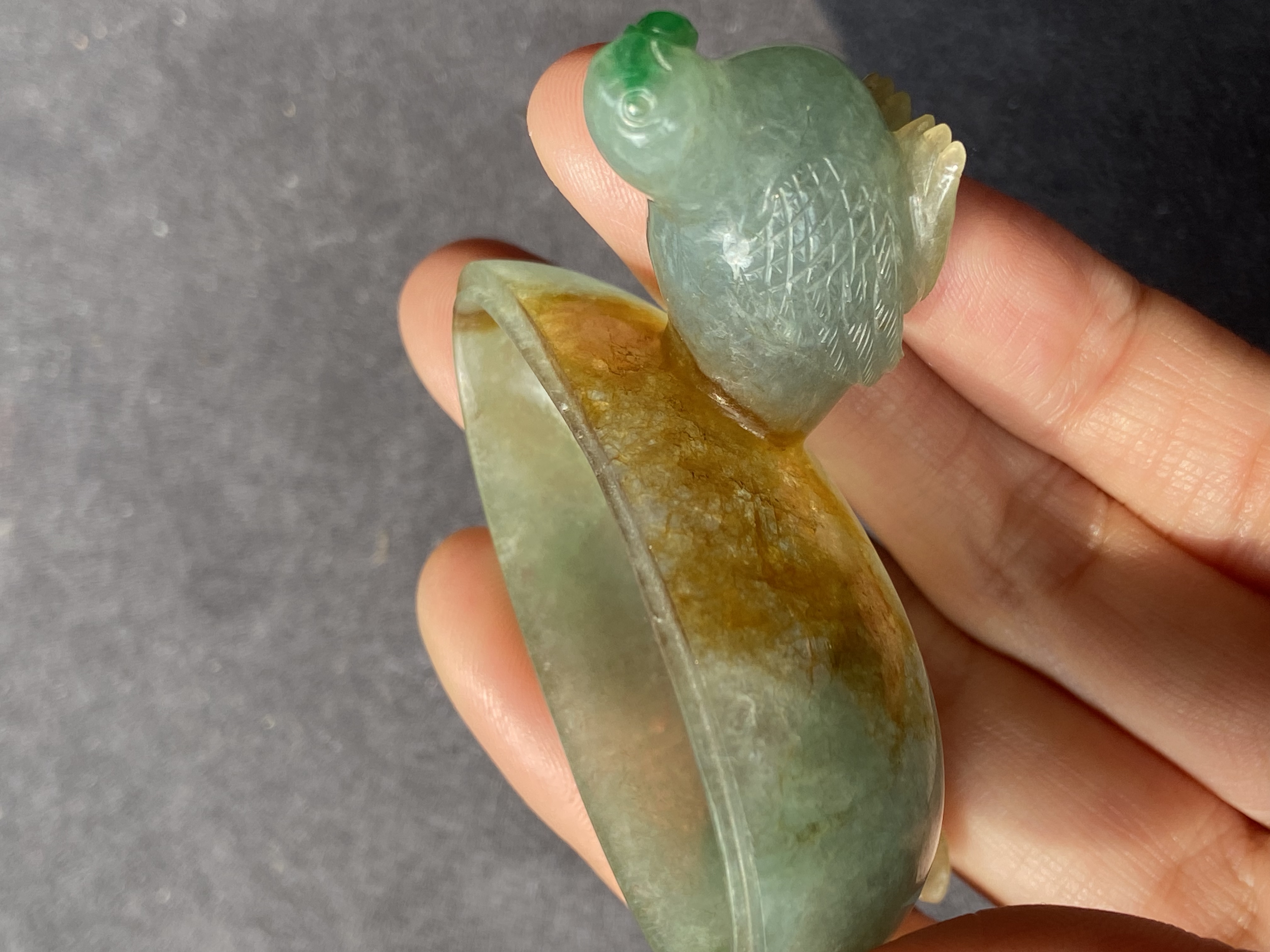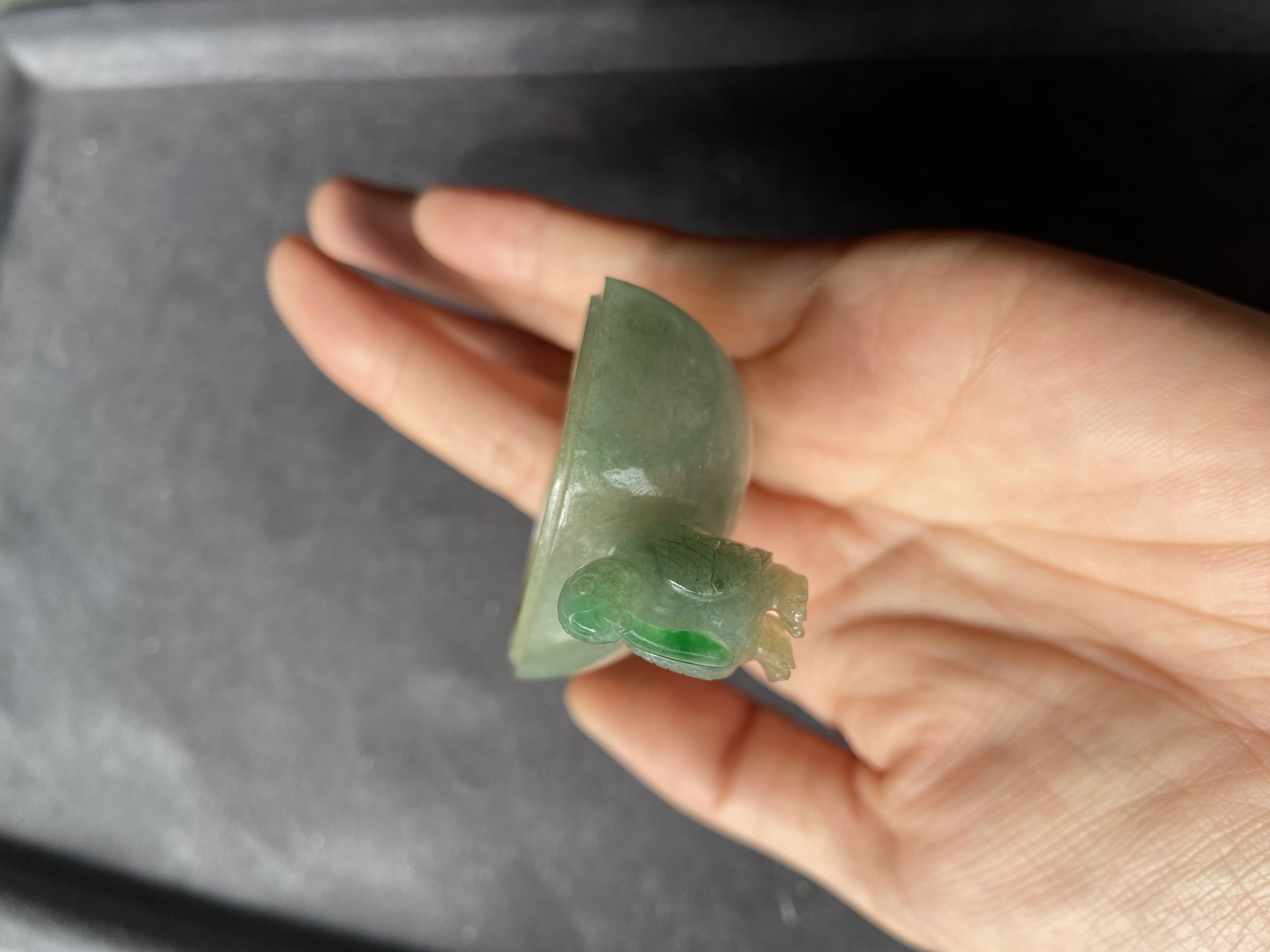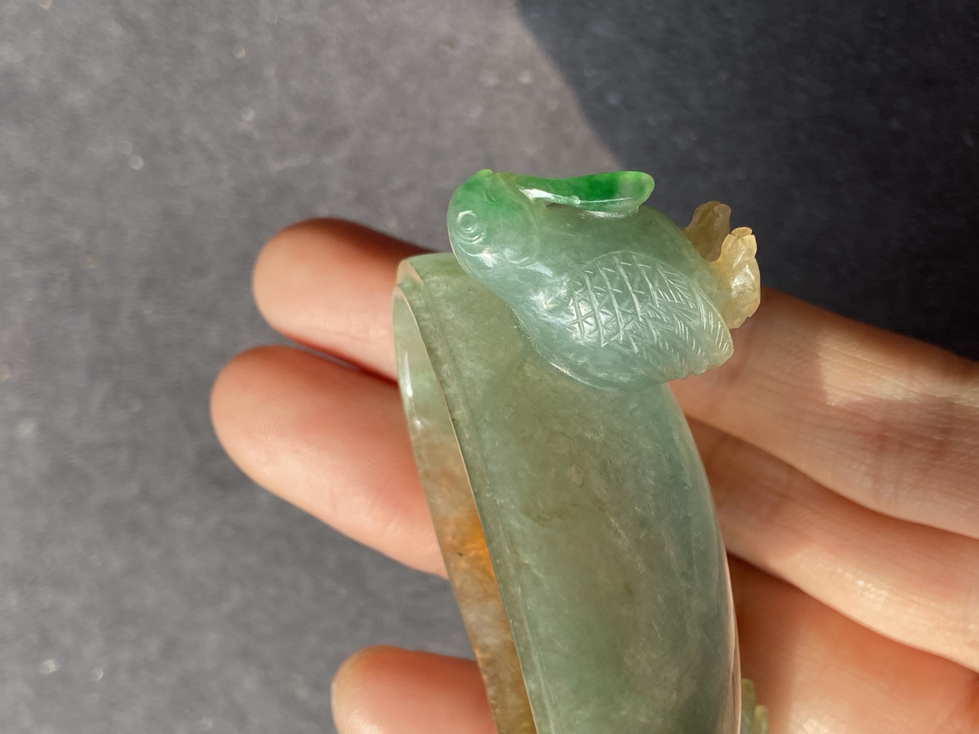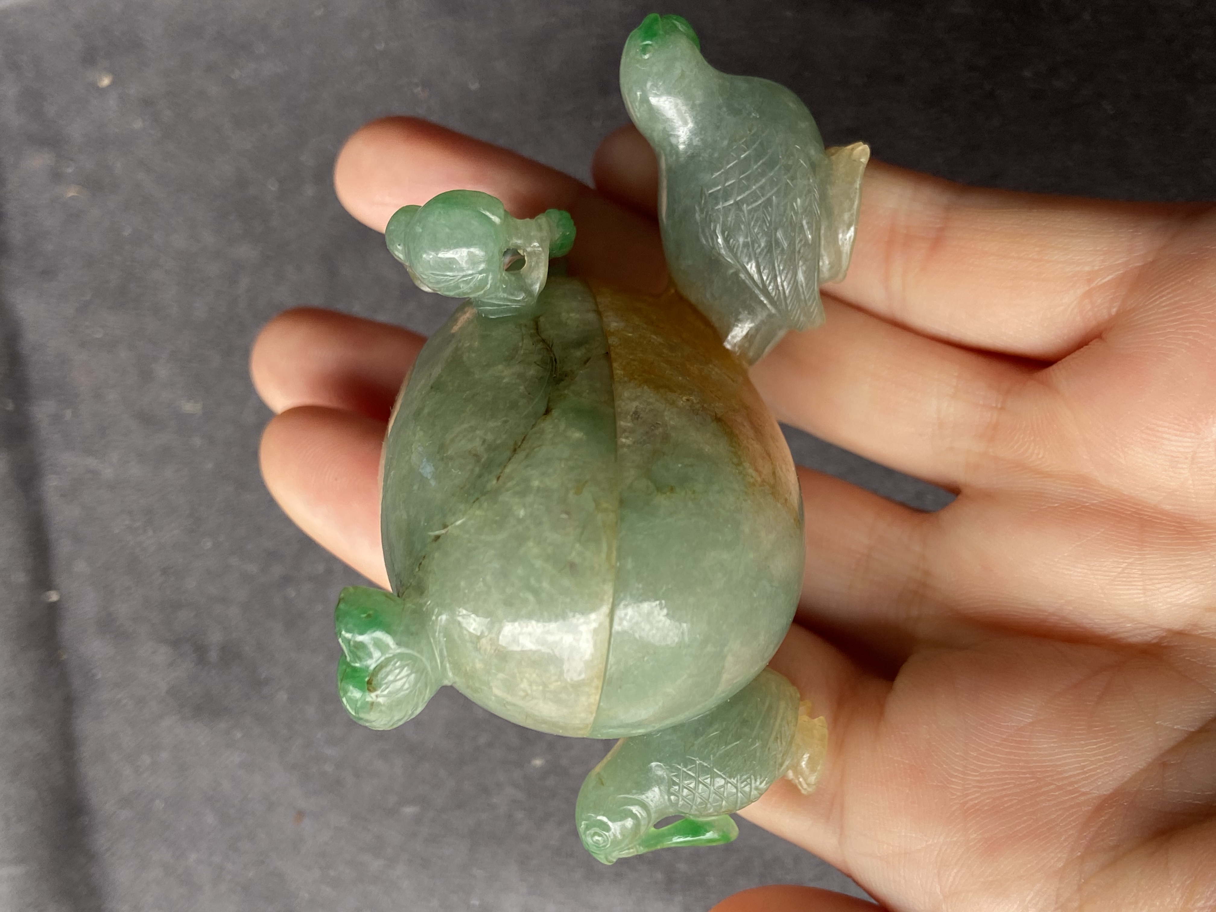 此盒天然翡翠雕刻,种水冰透,色翠绿又带黄翡,通体圆雕、巧雕工艺,手工难度较大,技艺较为精炼,鸡纹刀工符合传统韵味,器型玲珑可爱,宜于文人香道案头把玩或当时女性化妆粉盒。此类造型在翡翠拍卖市场较少见,可惜沁色不够自然,图中显示有外裂,影响价格。