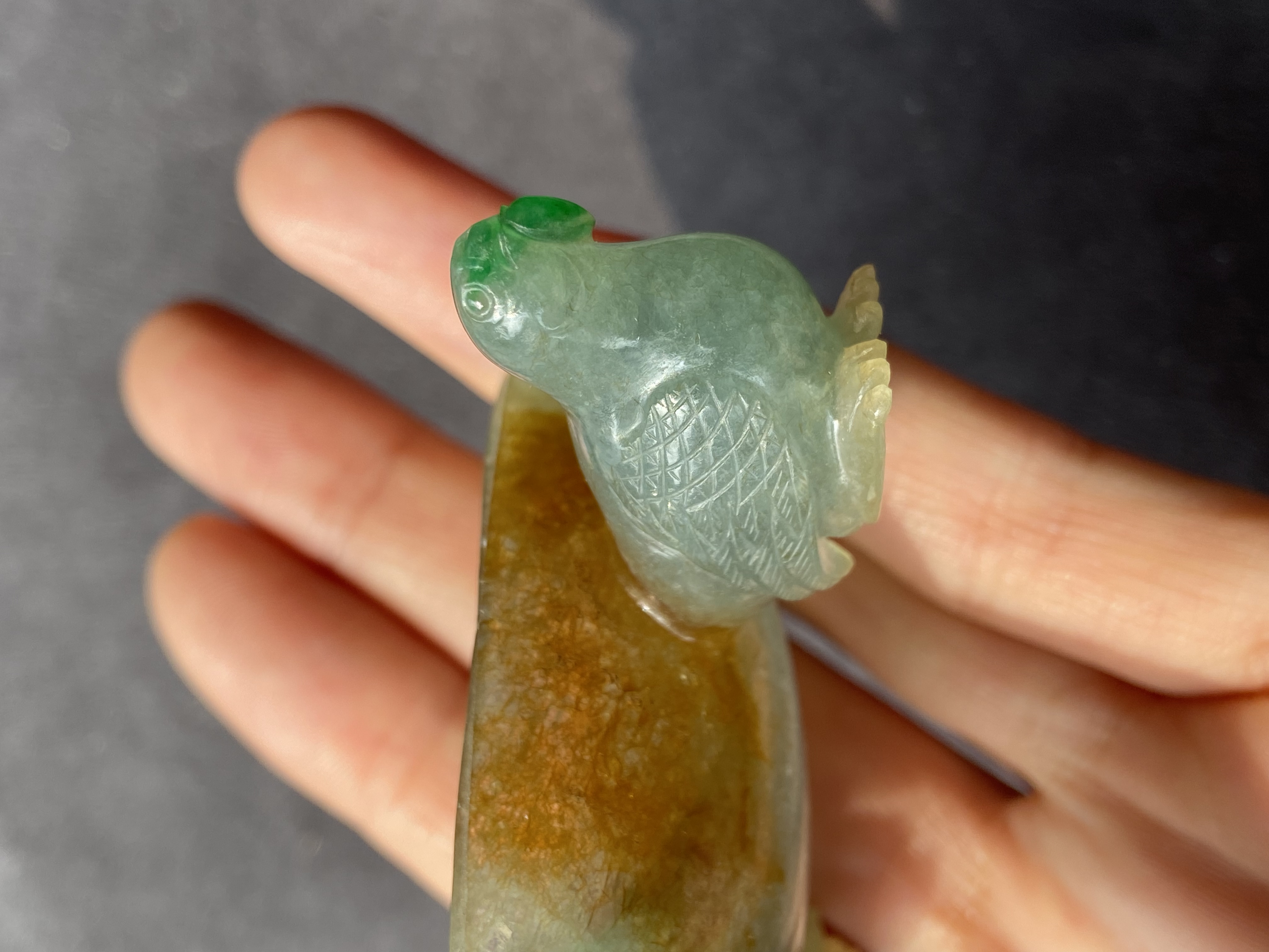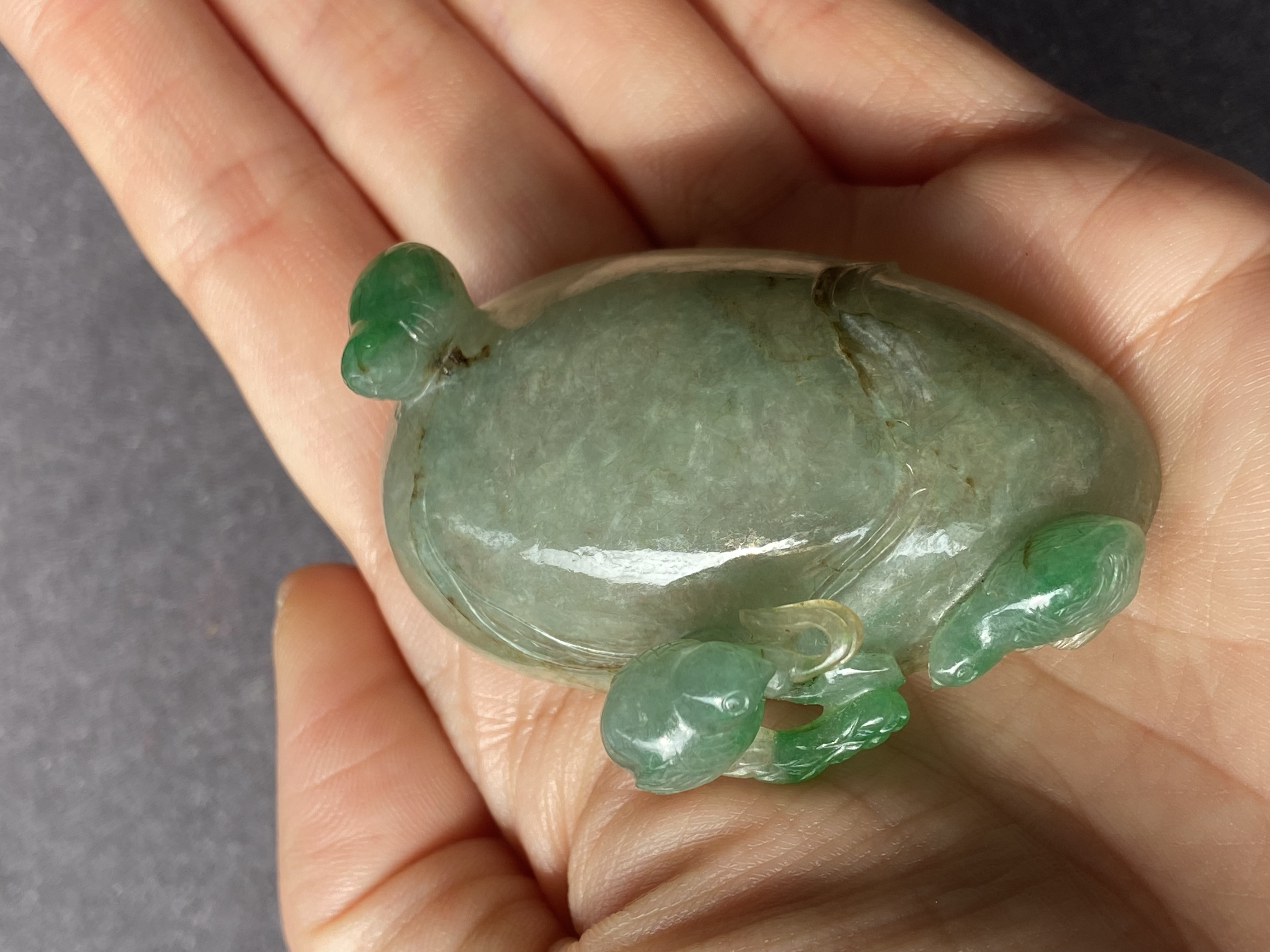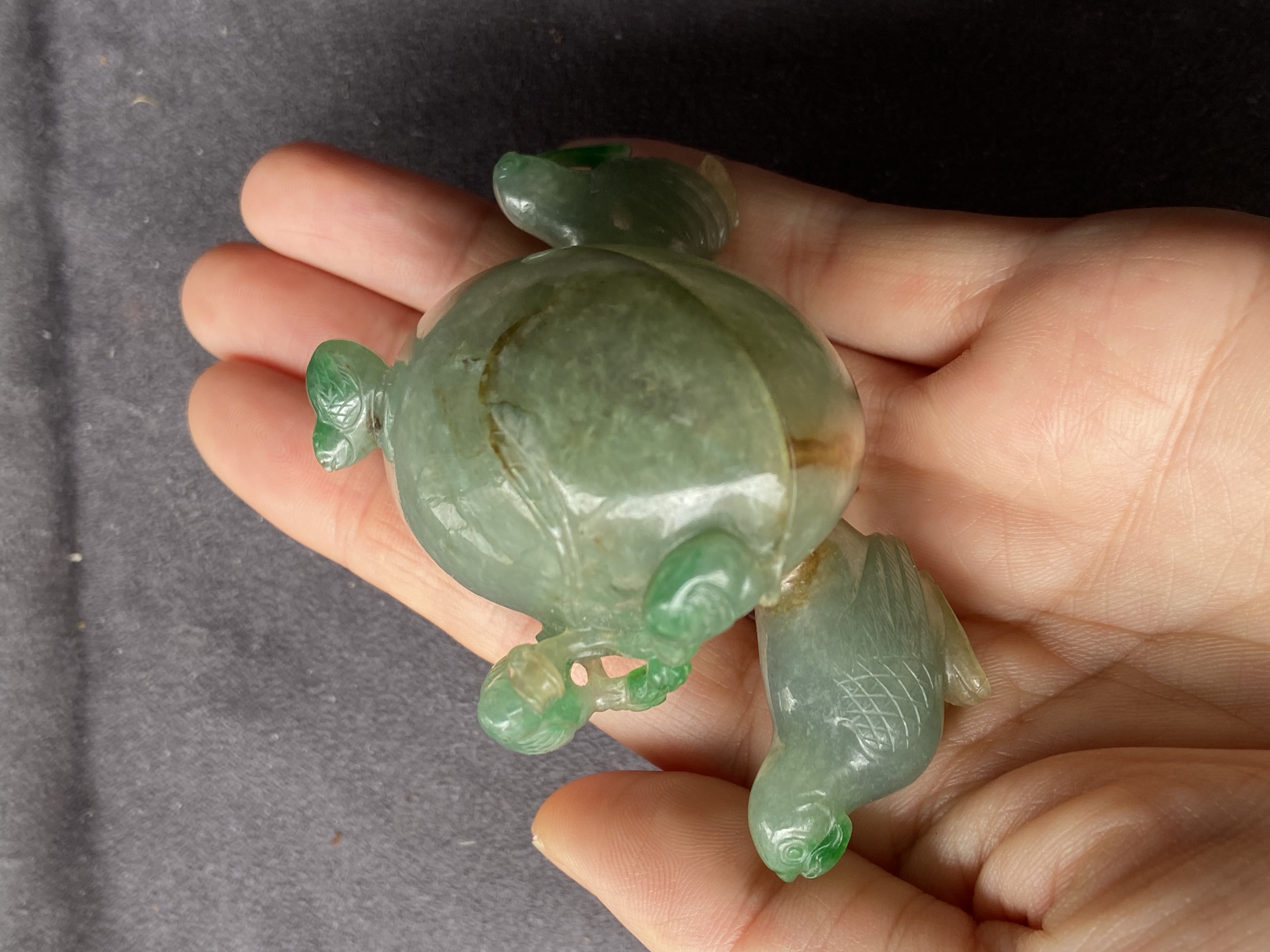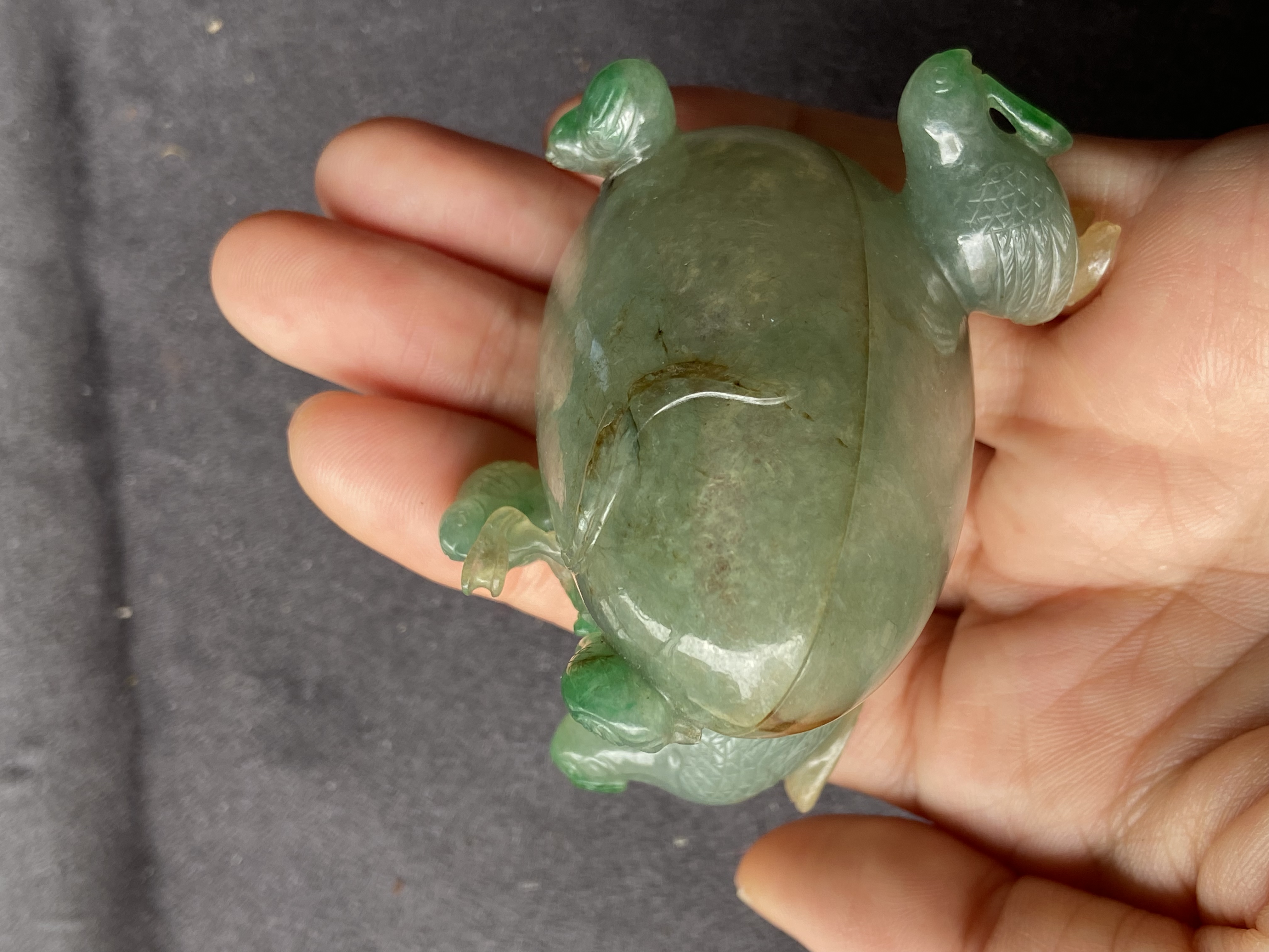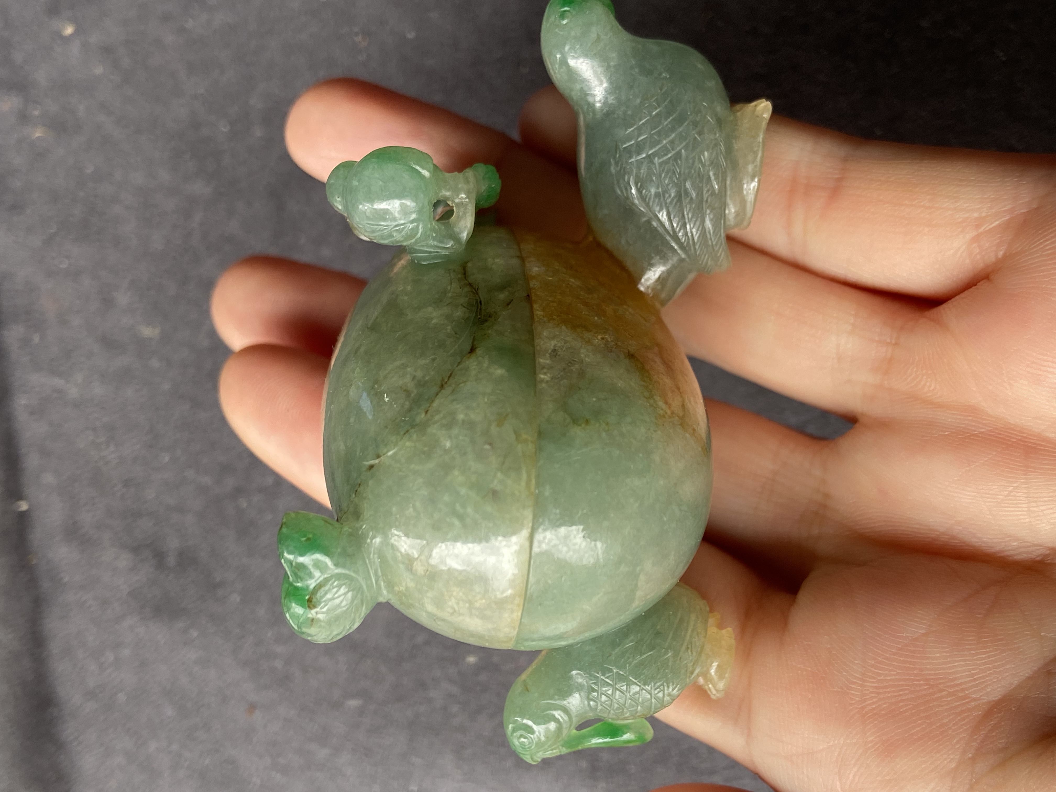 此盒天然翡翠雕刻,种水冰透,色翠绿又带黄翡,通体圆雕、巧雕工艺,手工难度较大,技艺较为精炼,鸡纹刀工符合传统韵味,器型玲珑可爱,宜于文人香道案头把玩或当时女性化妆粉盒。此类造型在翡翠拍卖市场较少见,可惜沁色不够自然,图中显示有外裂,影响价格。