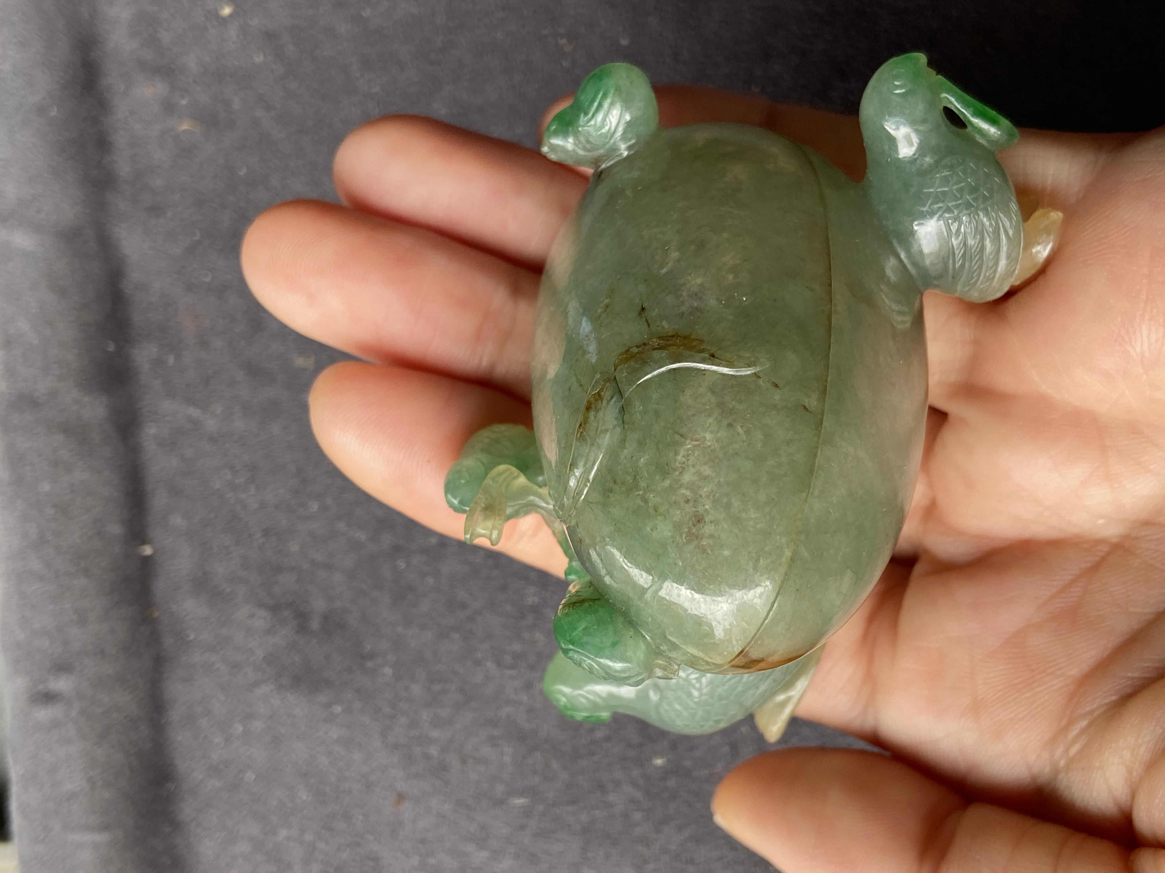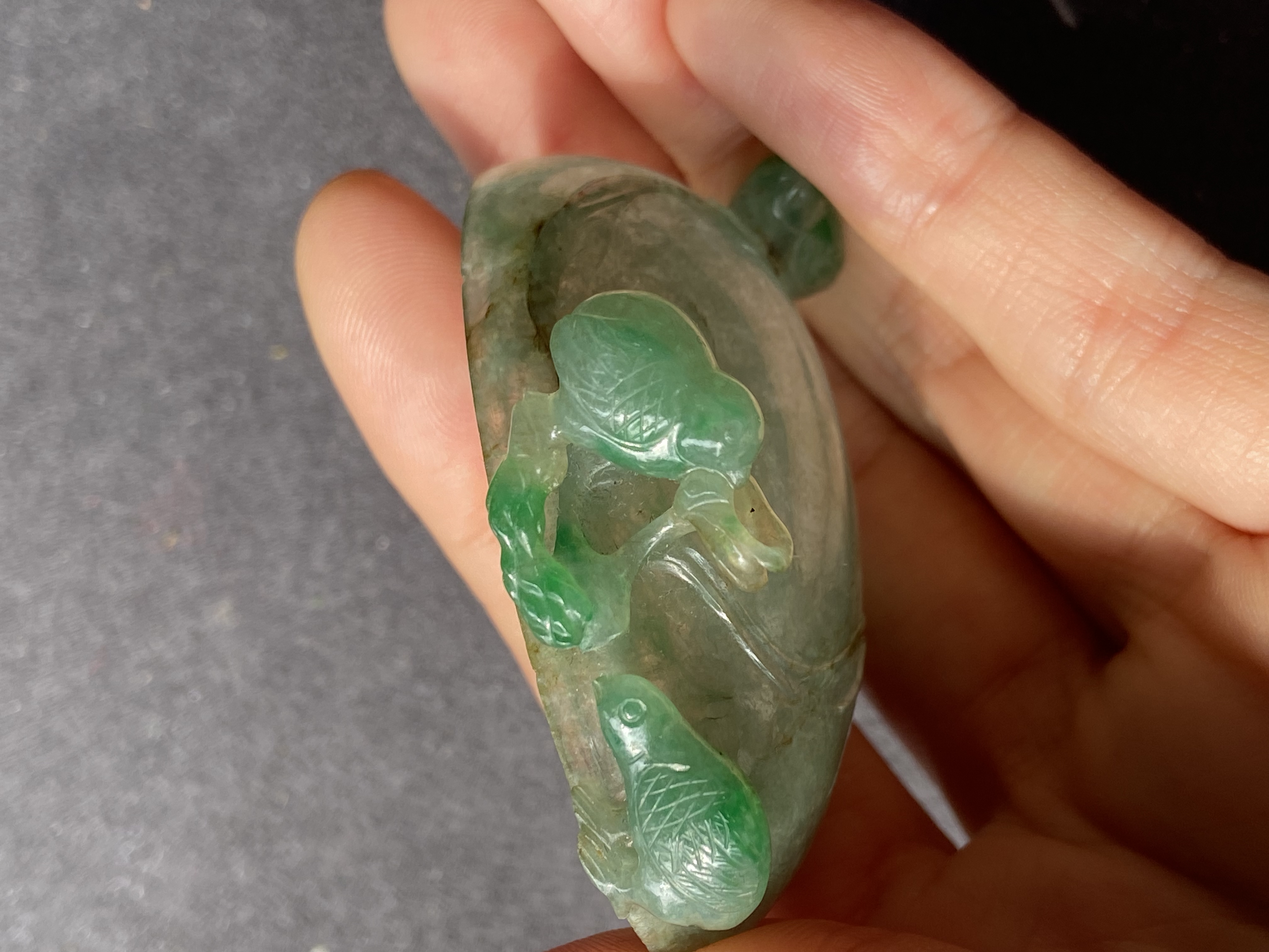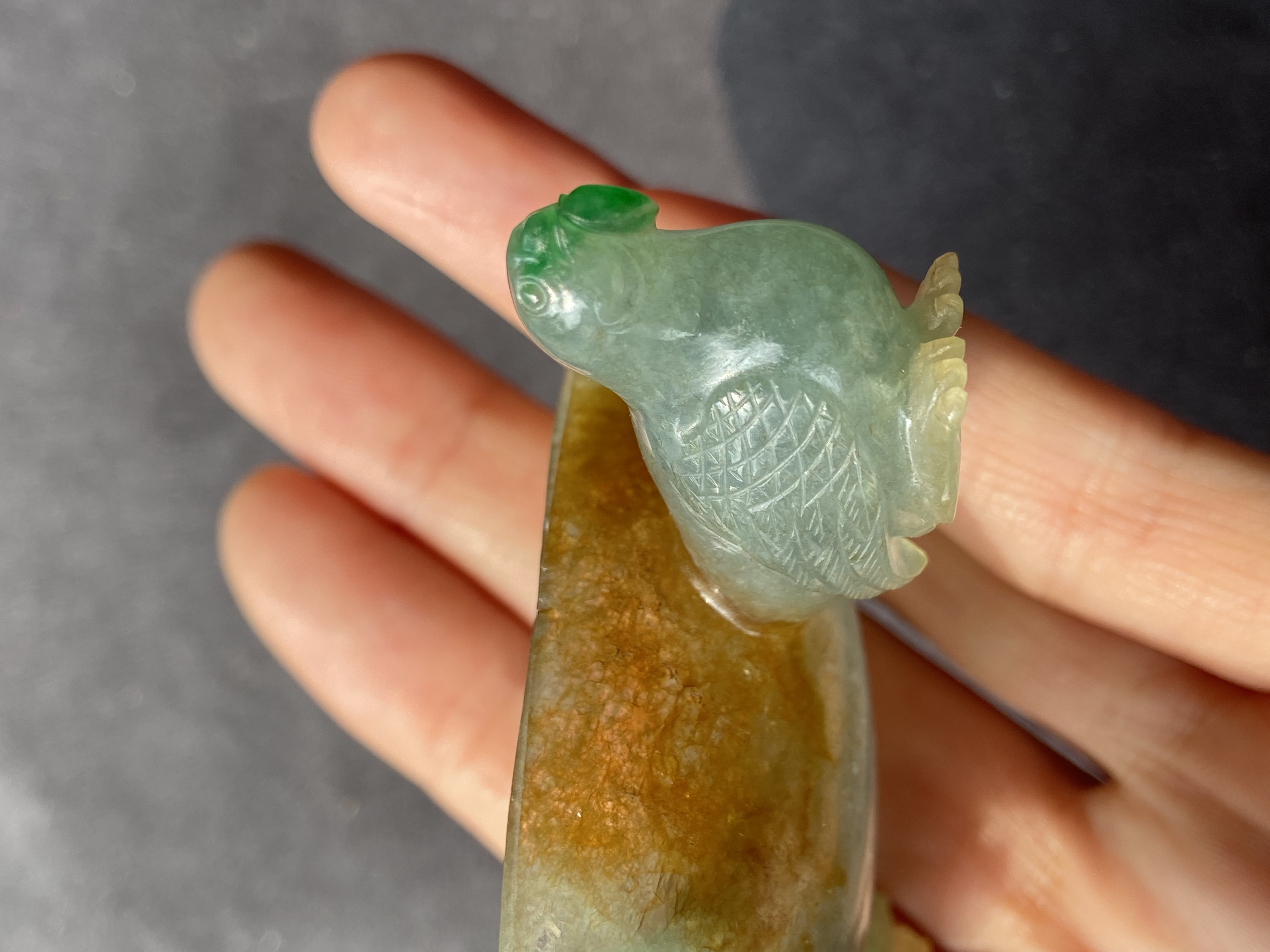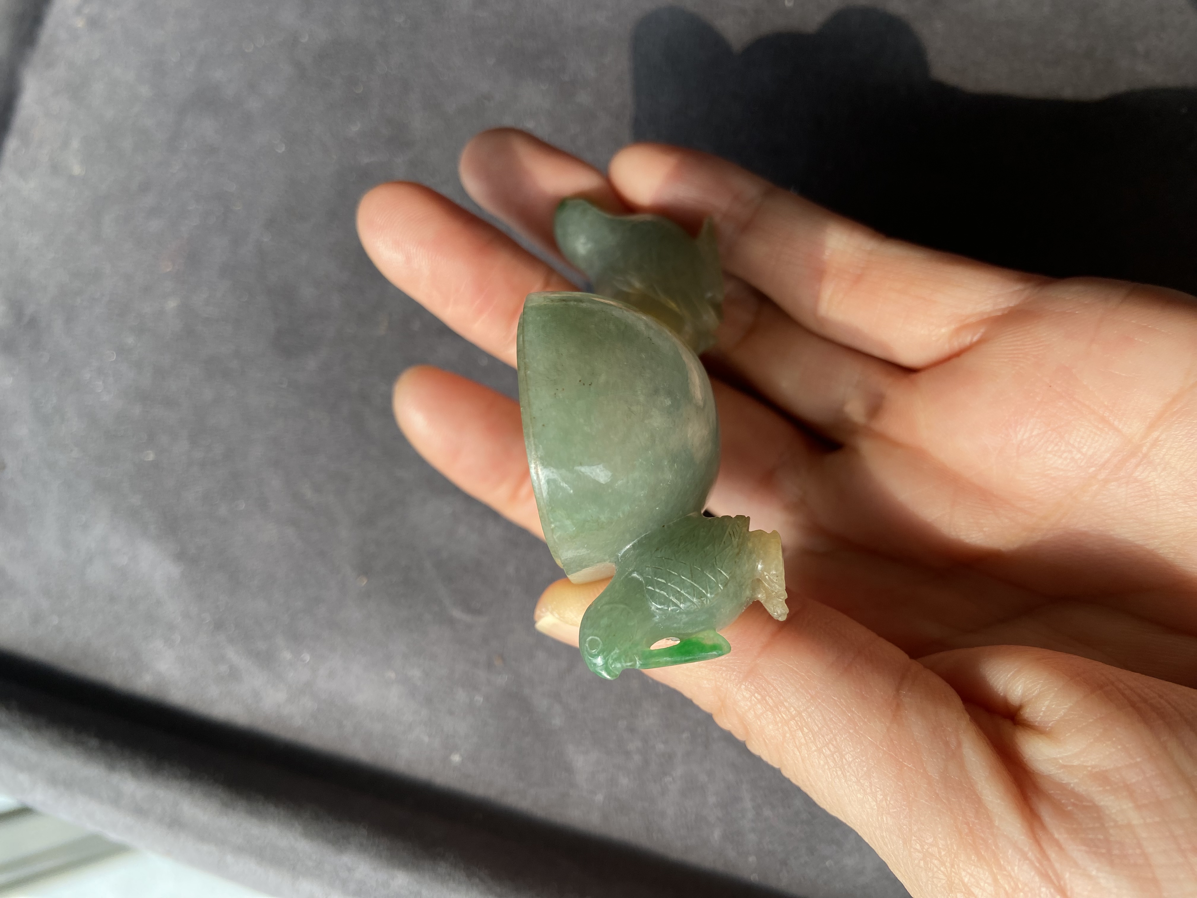 此盒天然翡翠雕刻,种水冰透,色翠绿又带黄翡,通体圆雕、巧雕工艺,手工难度较大,技艺较为精炼,鸡纹刀工符合传统韵味,器型玲珑可爱,宜于文人香道案头把玩或当时女性化妆粉盒。此类造型在翡翠拍卖市场较少见,可惜沁色不够自然,图中显示有外裂,影响价格。
