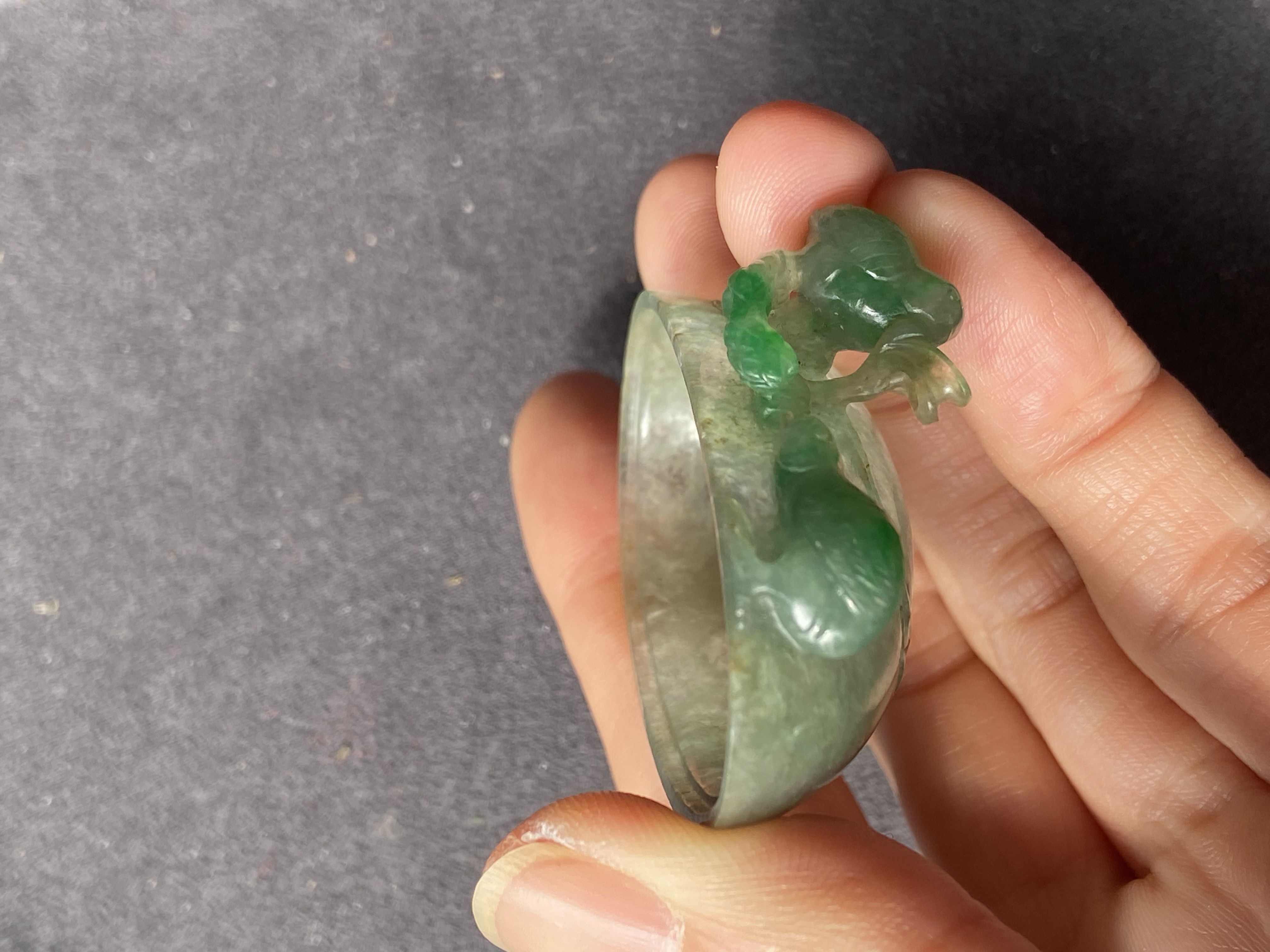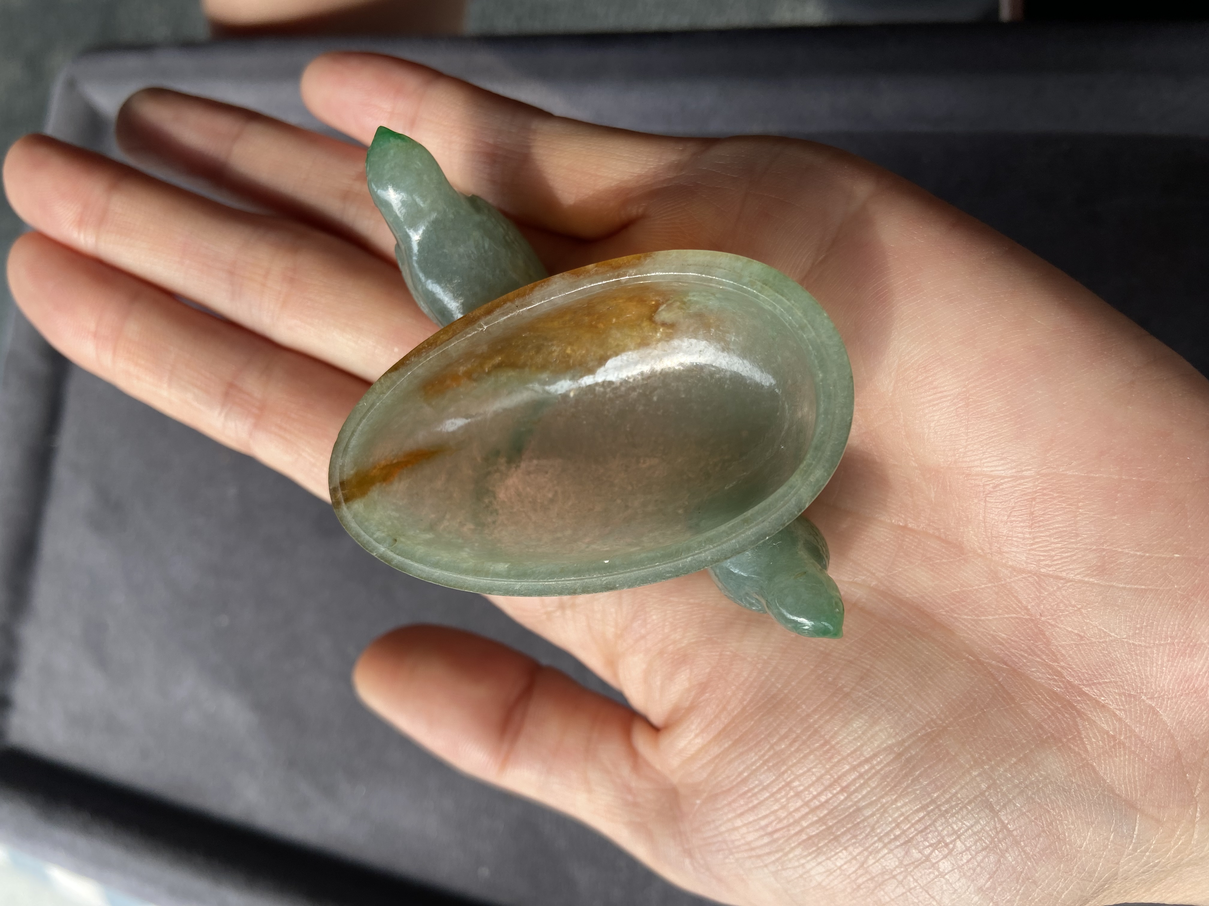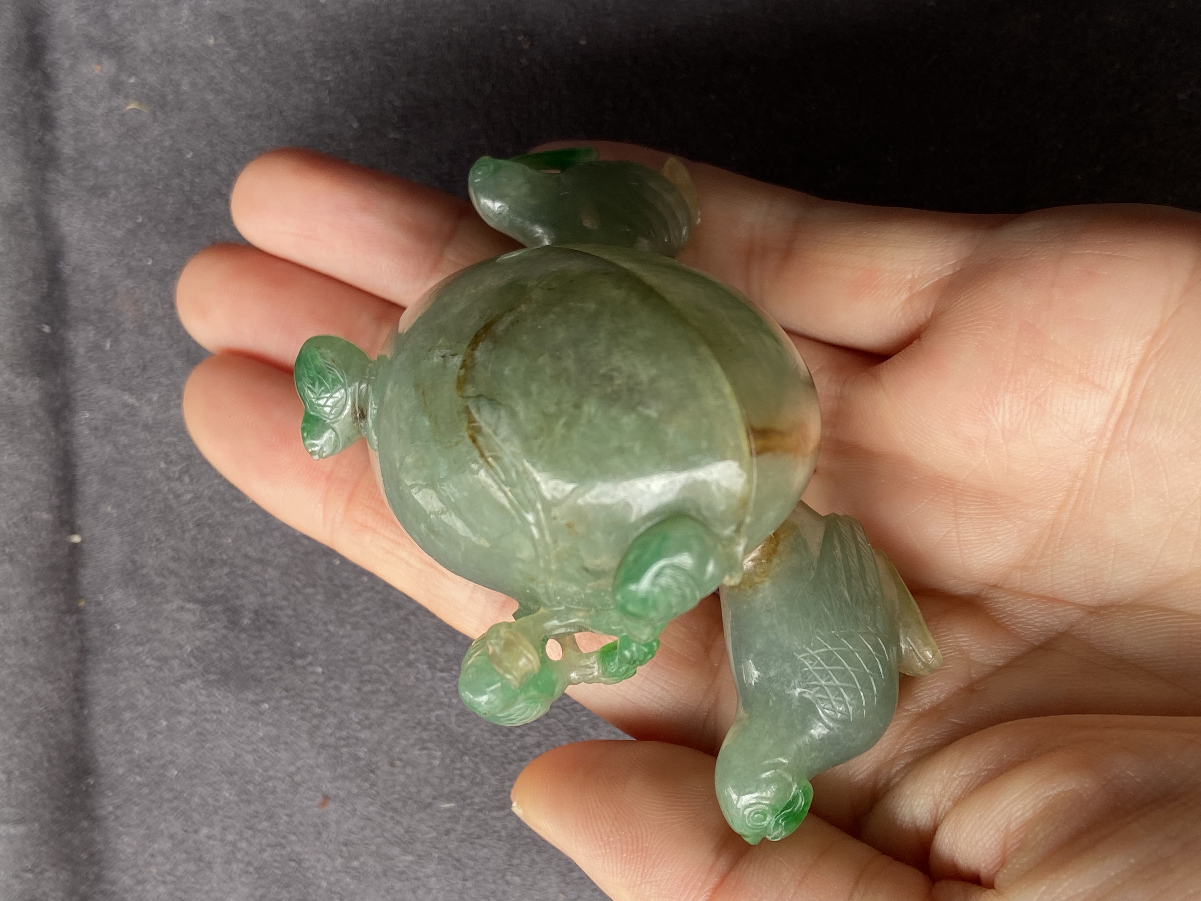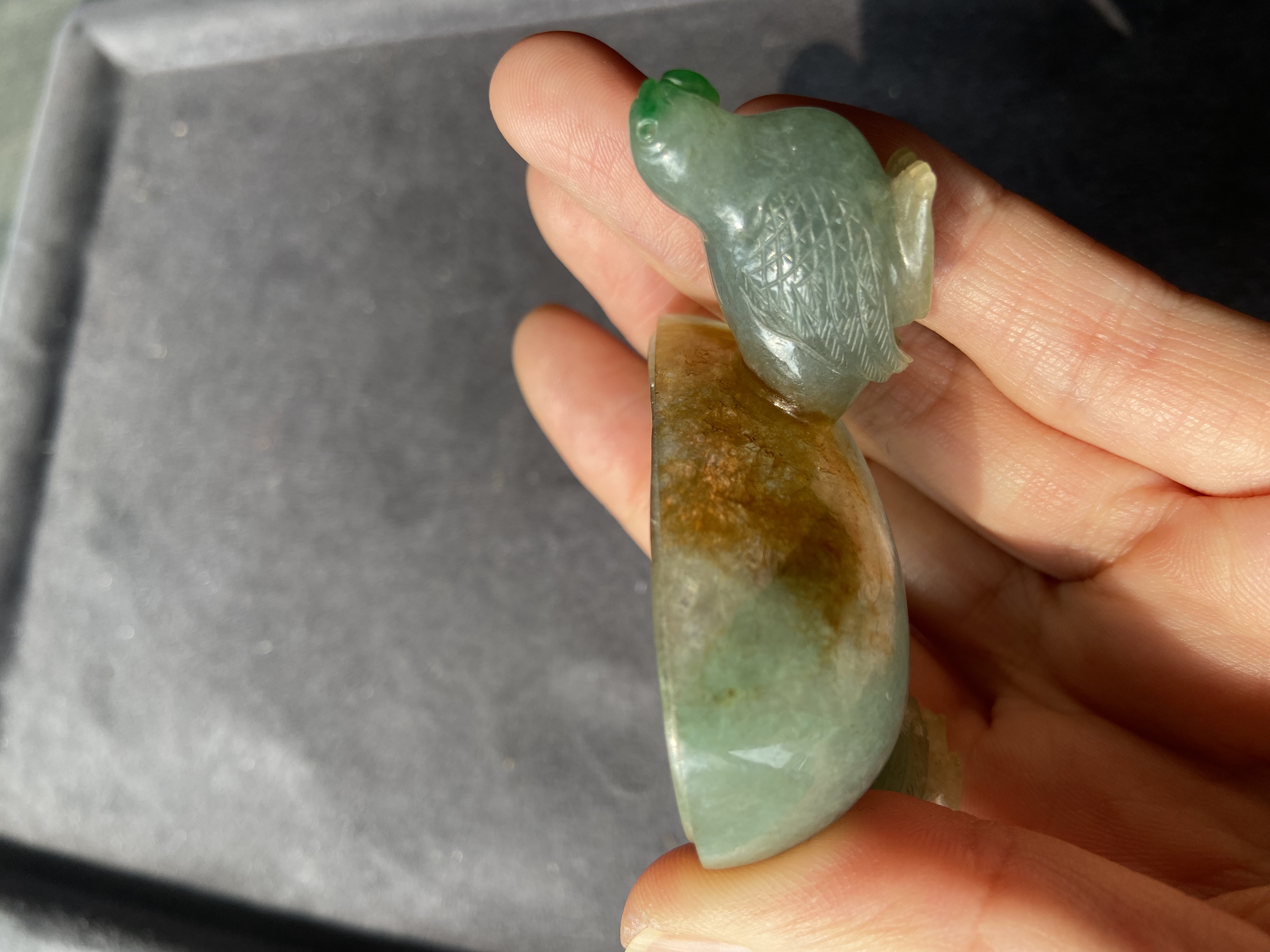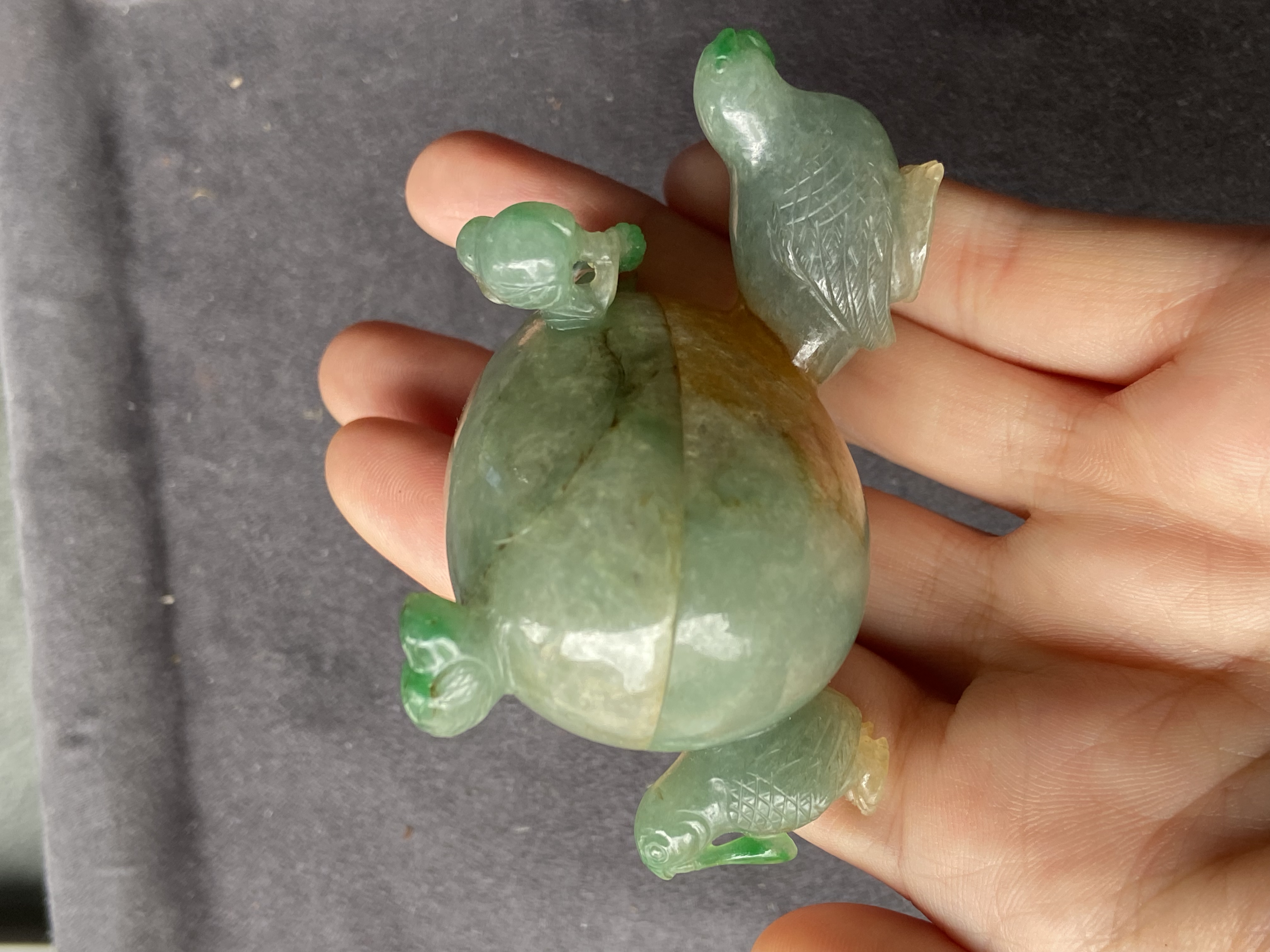 此盒天然翡翠雕刻,种水冰透,色翠绿又带黄翡,通体圆雕、巧雕工艺,手工难度较大,技艺较为精炼,鸡纹刀工符合传统韵味,器型玲珑可爱,宜于文人香道案头把玩或当时女性化妆粉盒。此类造型在翡翠拍卖市场较少见,可惜沁色不够自然,图中显示有外裂,影响价格。