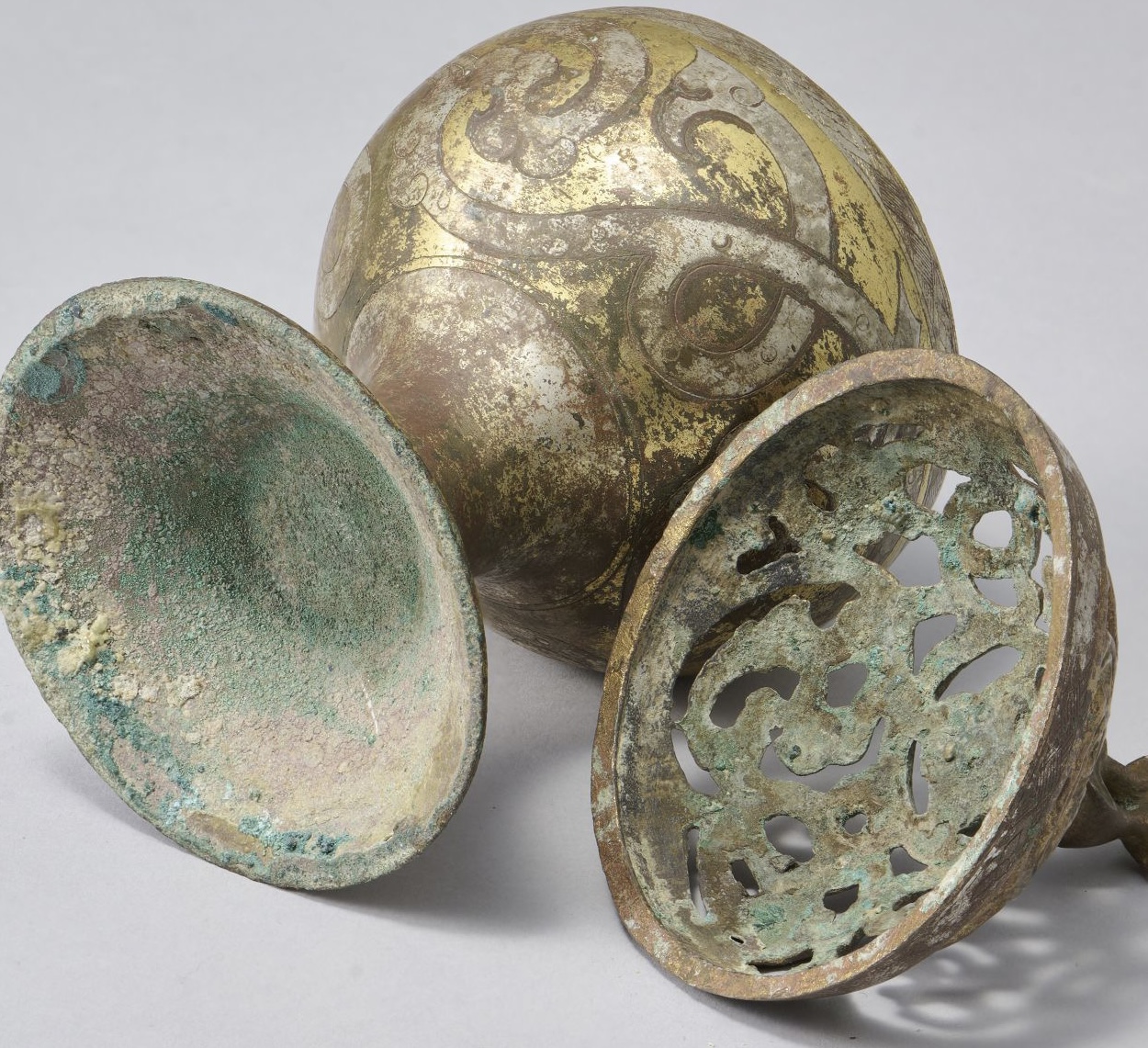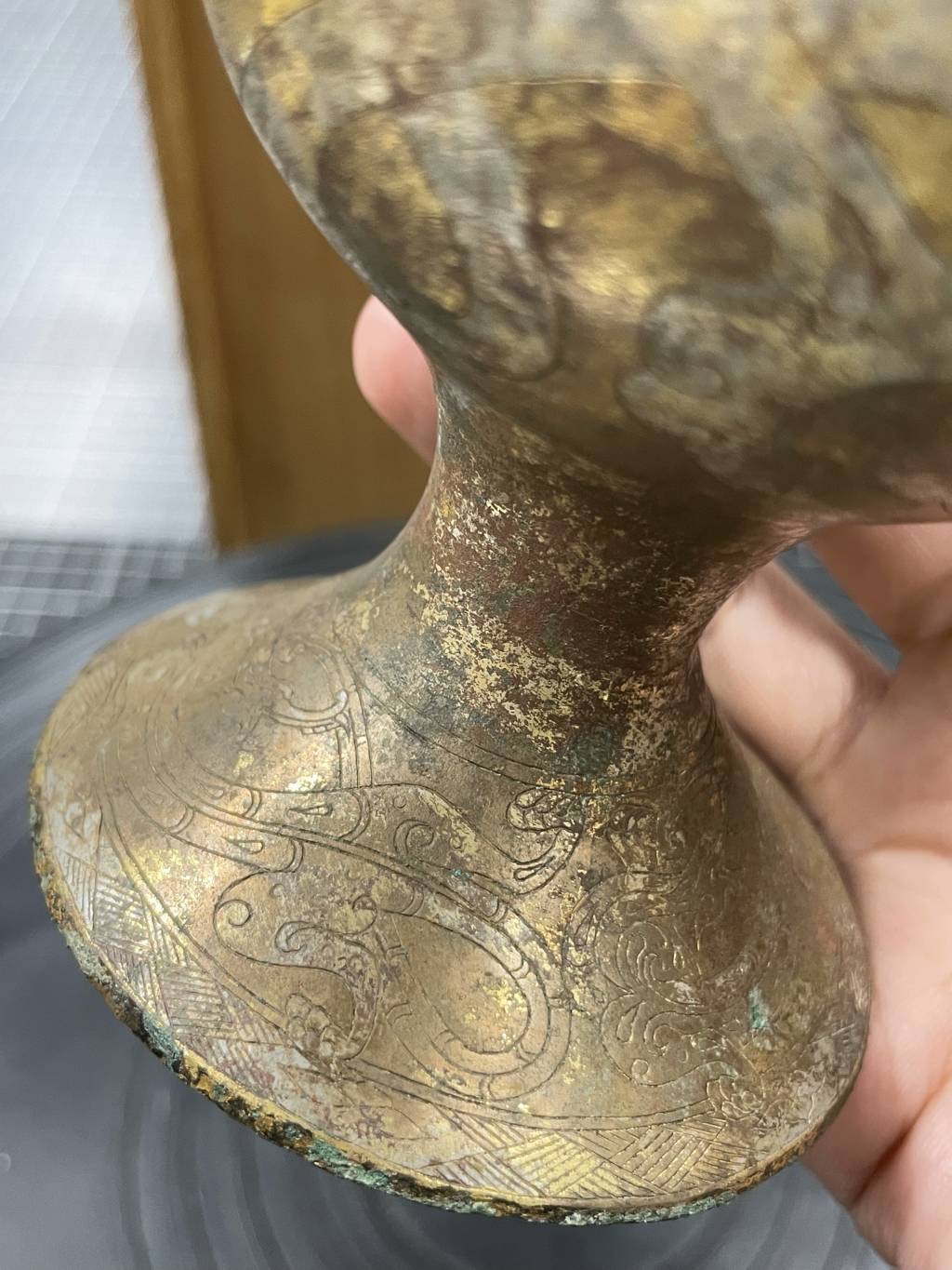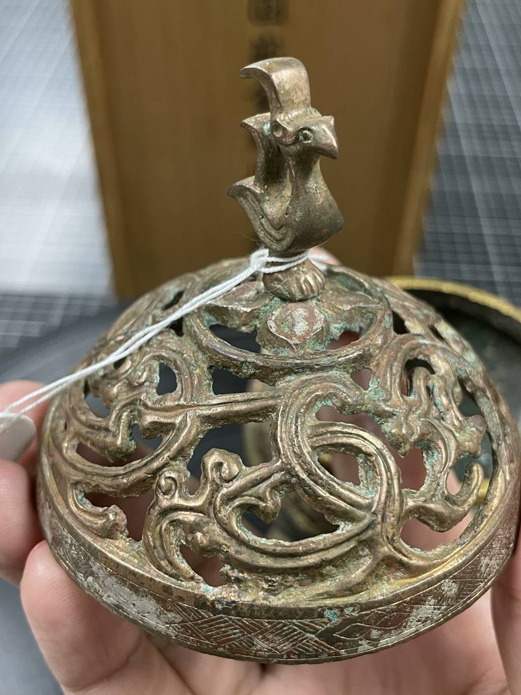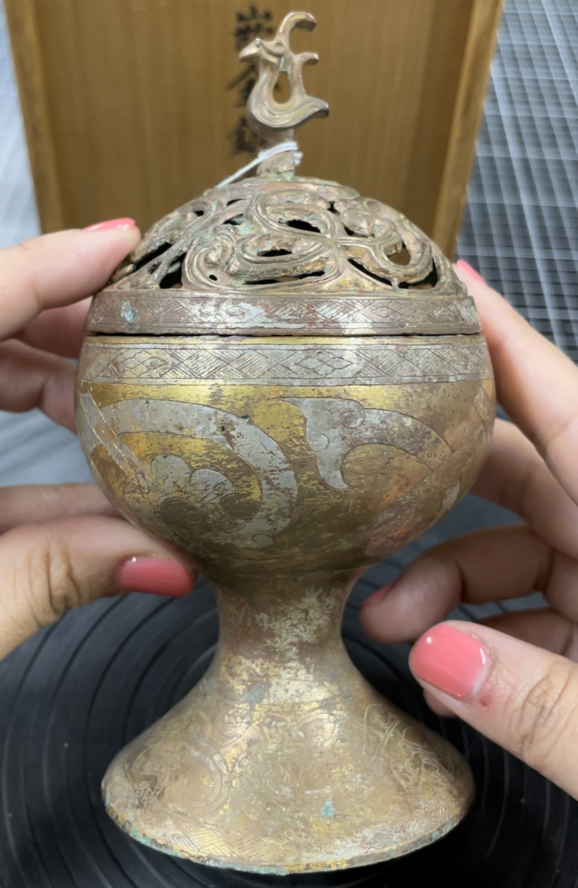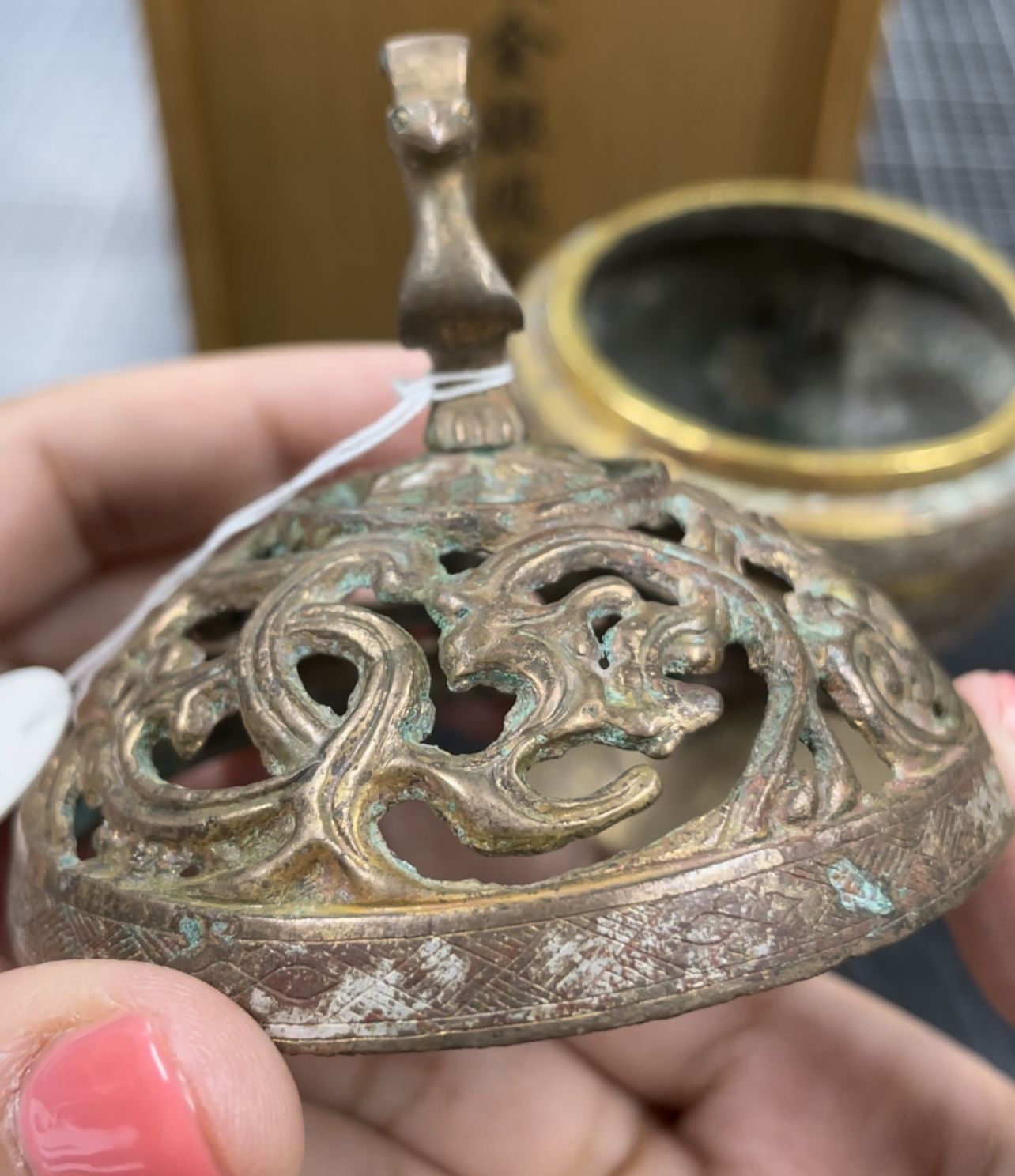 藏友好,这件器物一眼看上去是很舒服的古代艺术品,虽然表面没有锈蚀,但工艺是非常传统的古代艺术,符合西汉时期的工艺、艺术风格,干净是清理的结果。但从底部和盖内的原始锈蚀状态来看是原生态的土壤环境生成的结果,是当下仿品做不像的自然锈蚀。你所说的错金错银是错误的,仔细看其实是鎏金鎏银,和错金错银是两个不同的概念和结果。一件器物上同时鎏金和鎏银是比较难得,所以这是件不错的古代艺术品,值得收藏。以上是我个人观点、仅做参考。