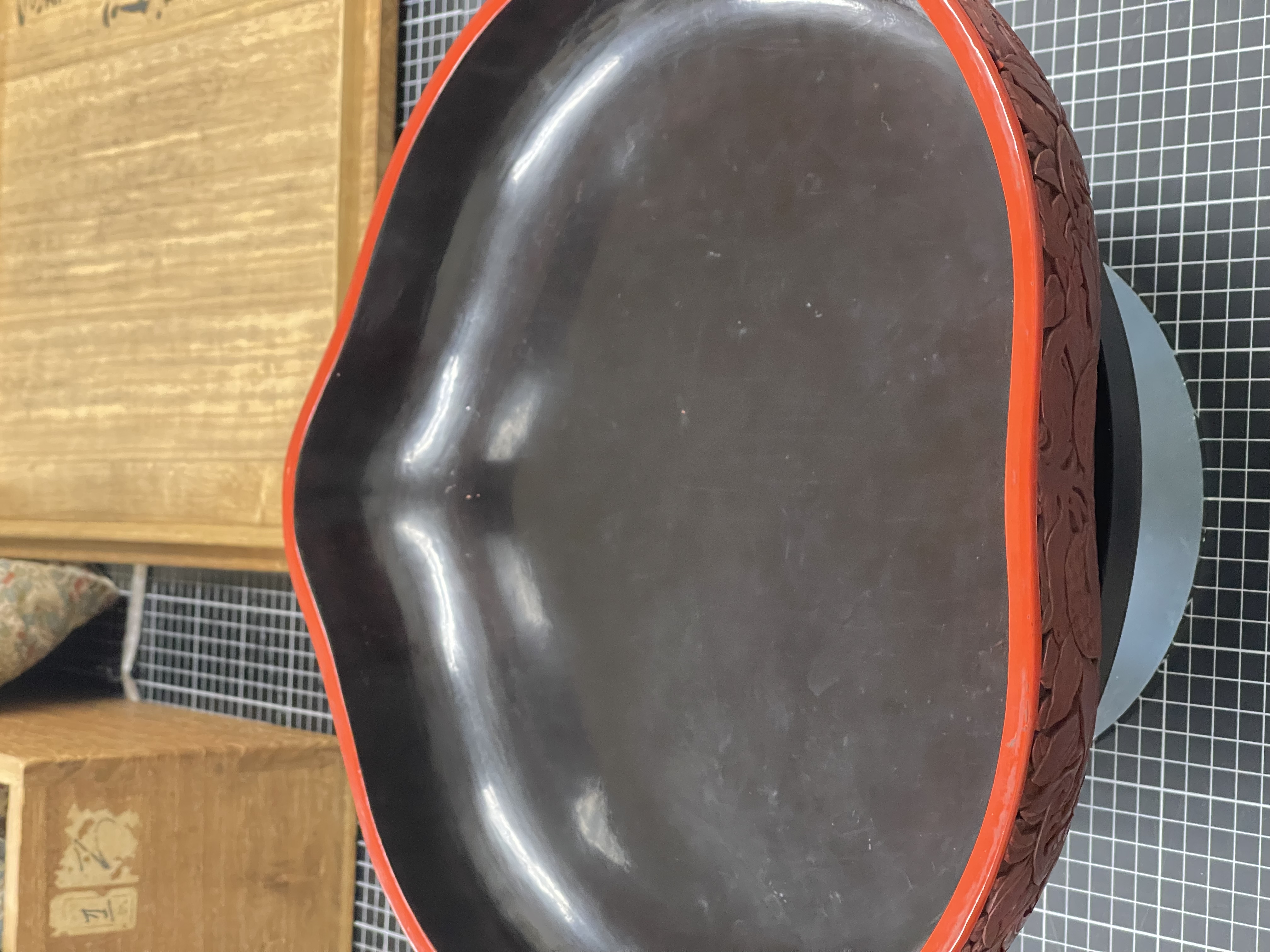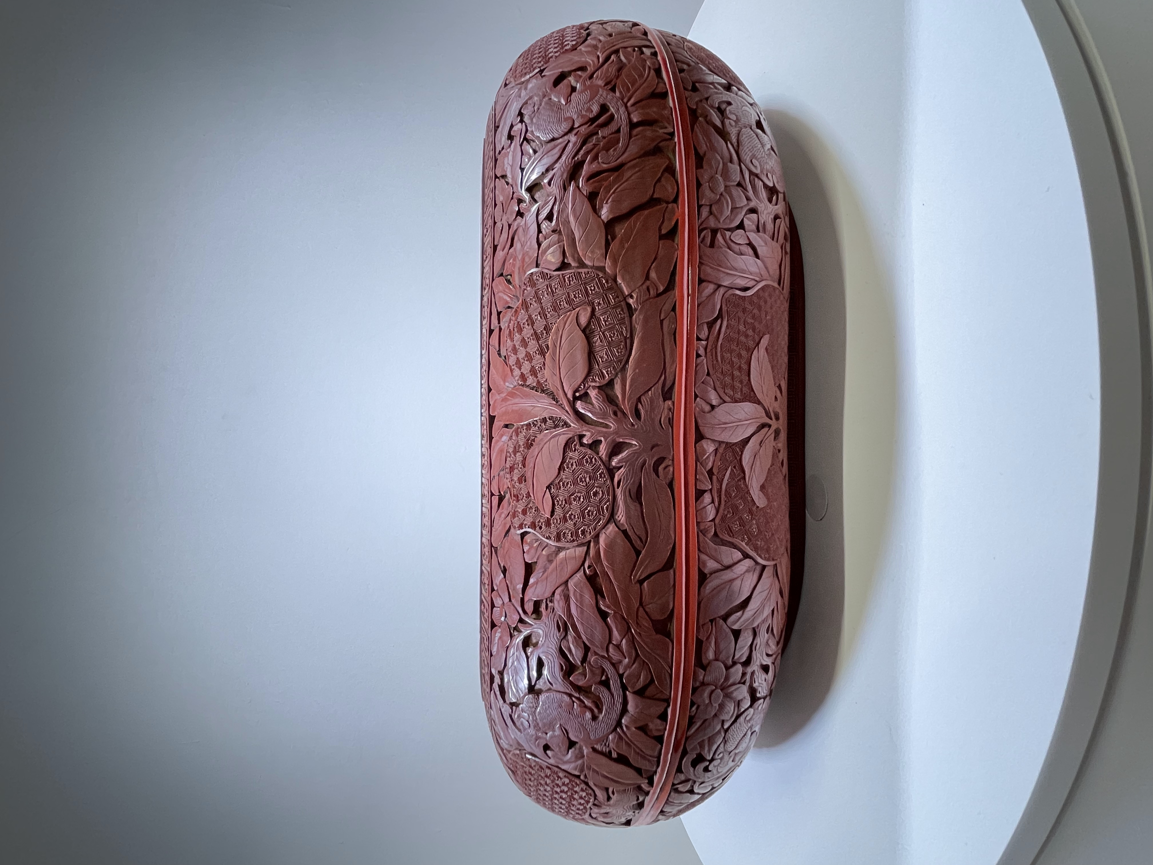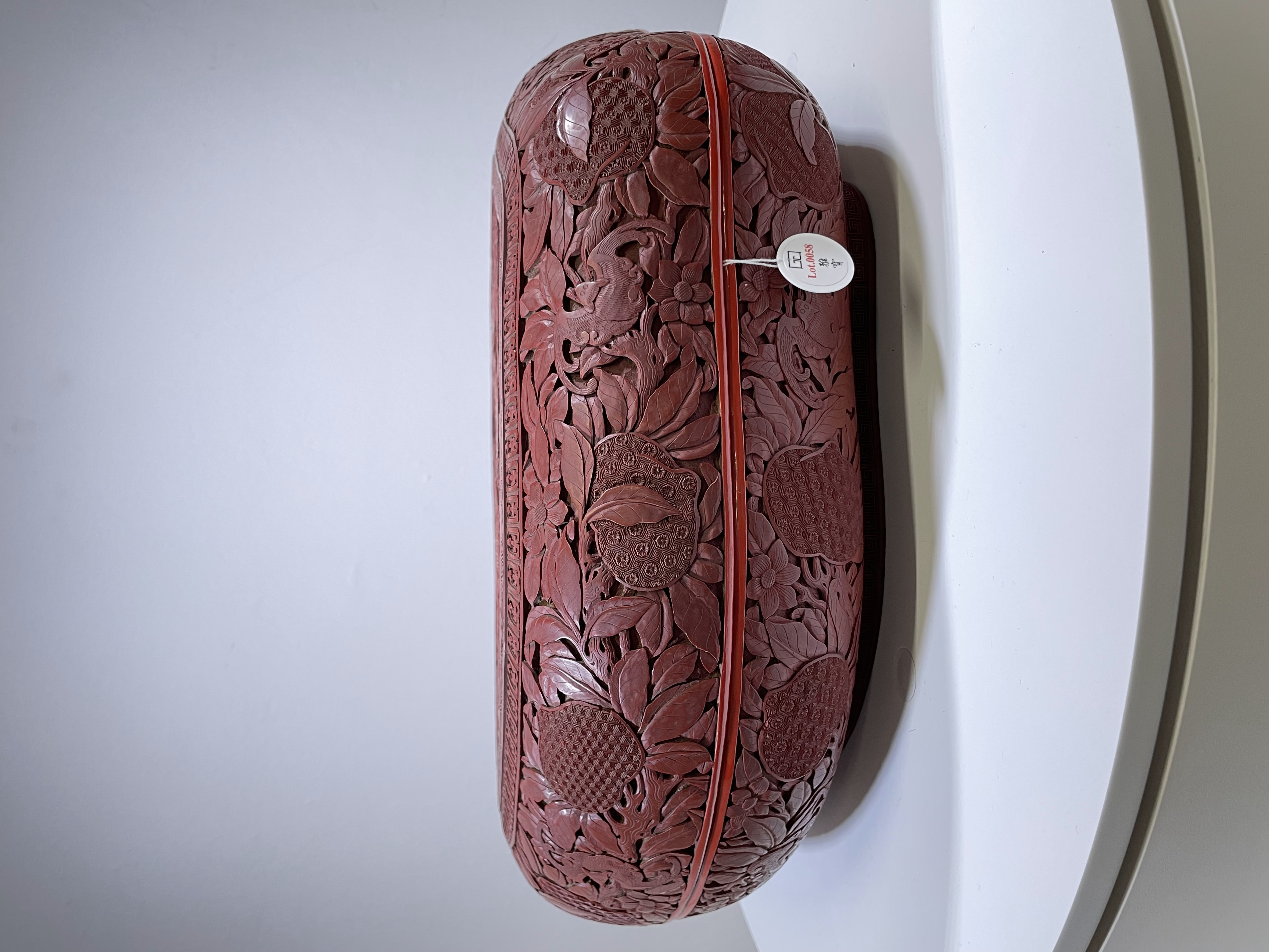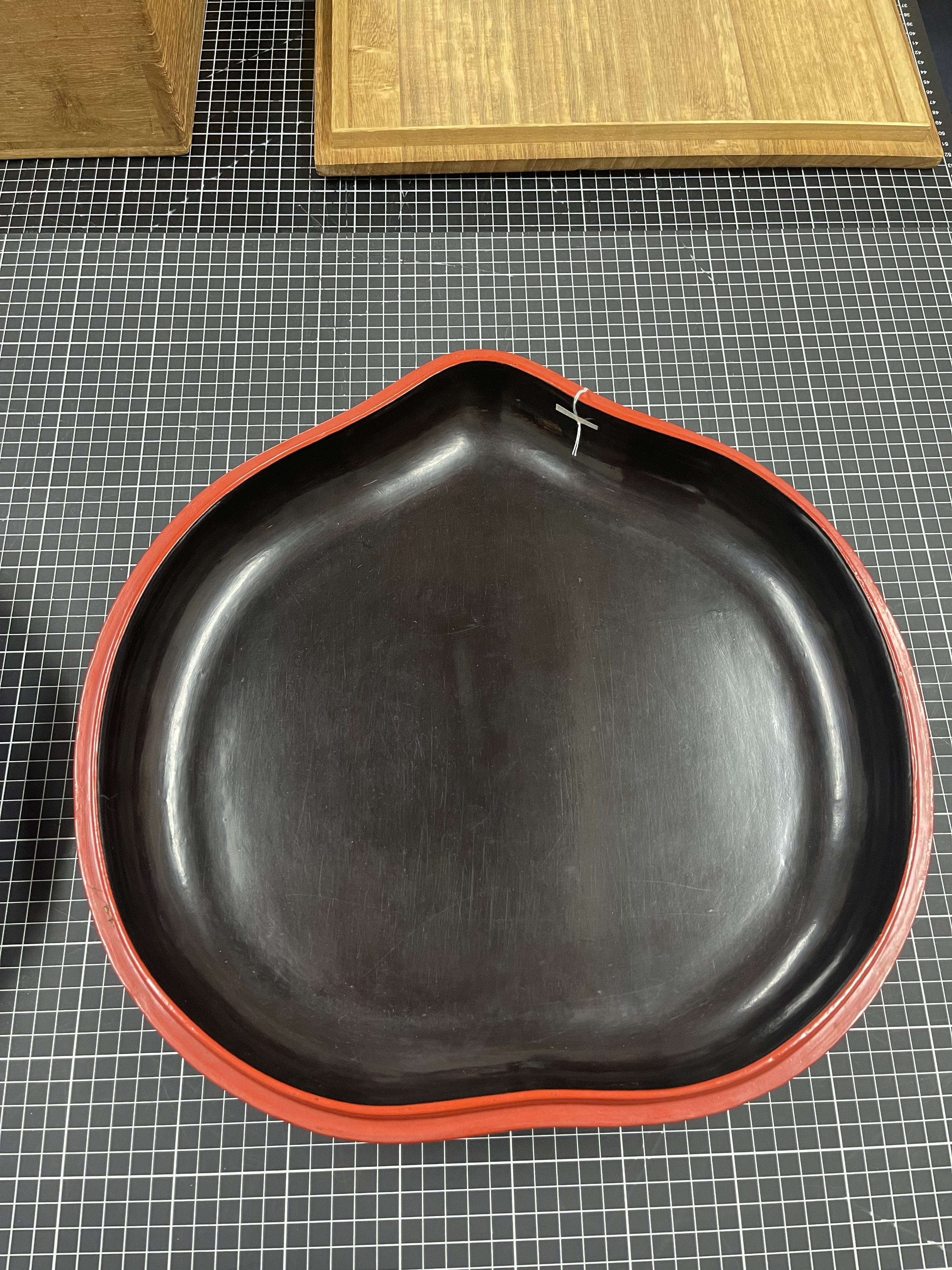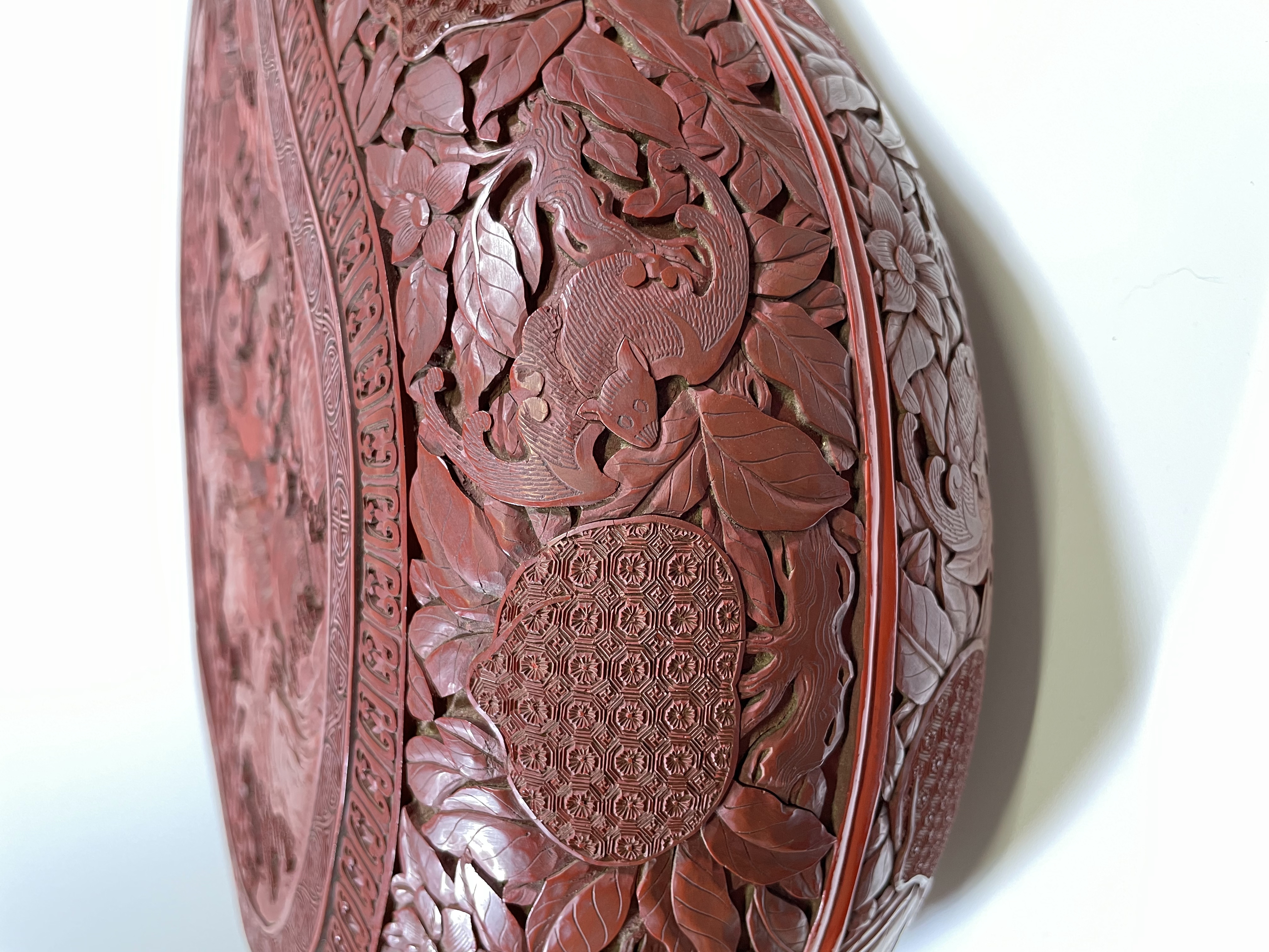 清代乾隆桃型五老图捧盒,盒通体雕红漆,盖面山石嶙峋,苍松翠柏表达天长地久,,亭台楼阁小桥流水体现古代人美好生活的场景,盒底周围雕有荔枝蝙蝠,寓意为大吉大利,福寿长绵,此藏品色泽鲜艳刀工流畅,,显示出高超的雕刻技艺,是一件精品佳作,值得收藏,盖面两处瑕疵处可以用大漆修补。