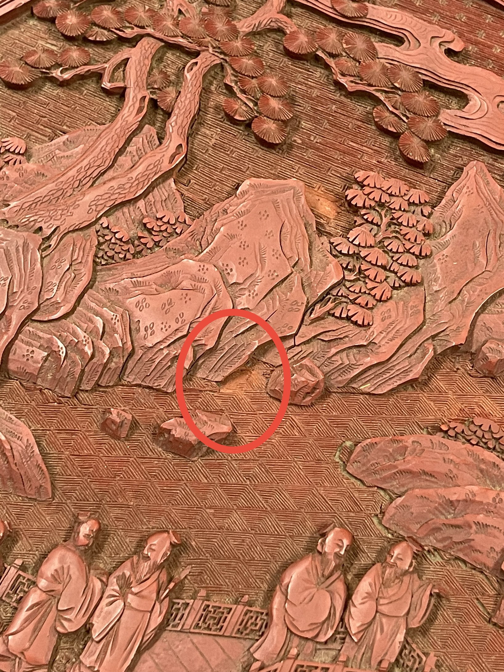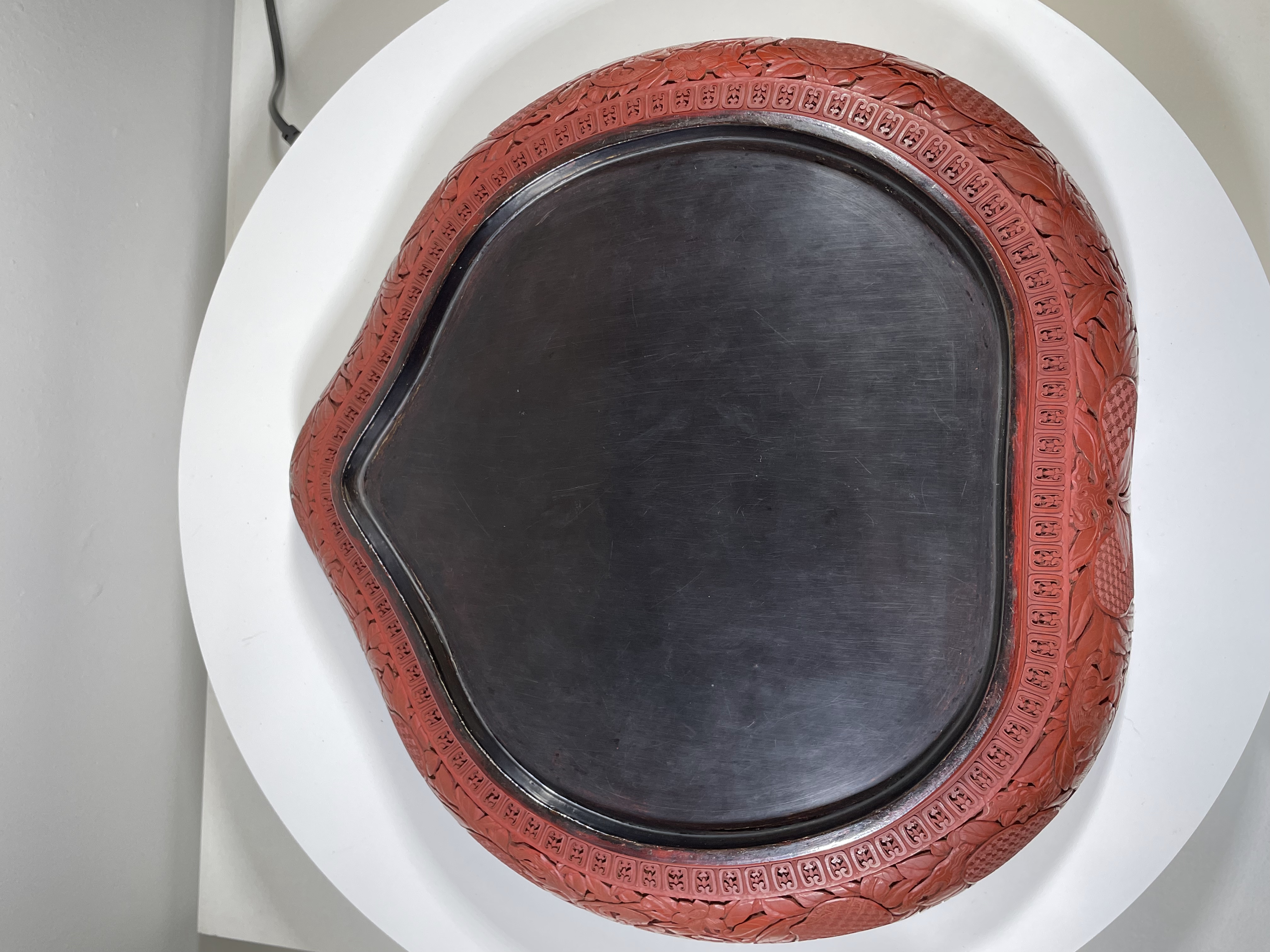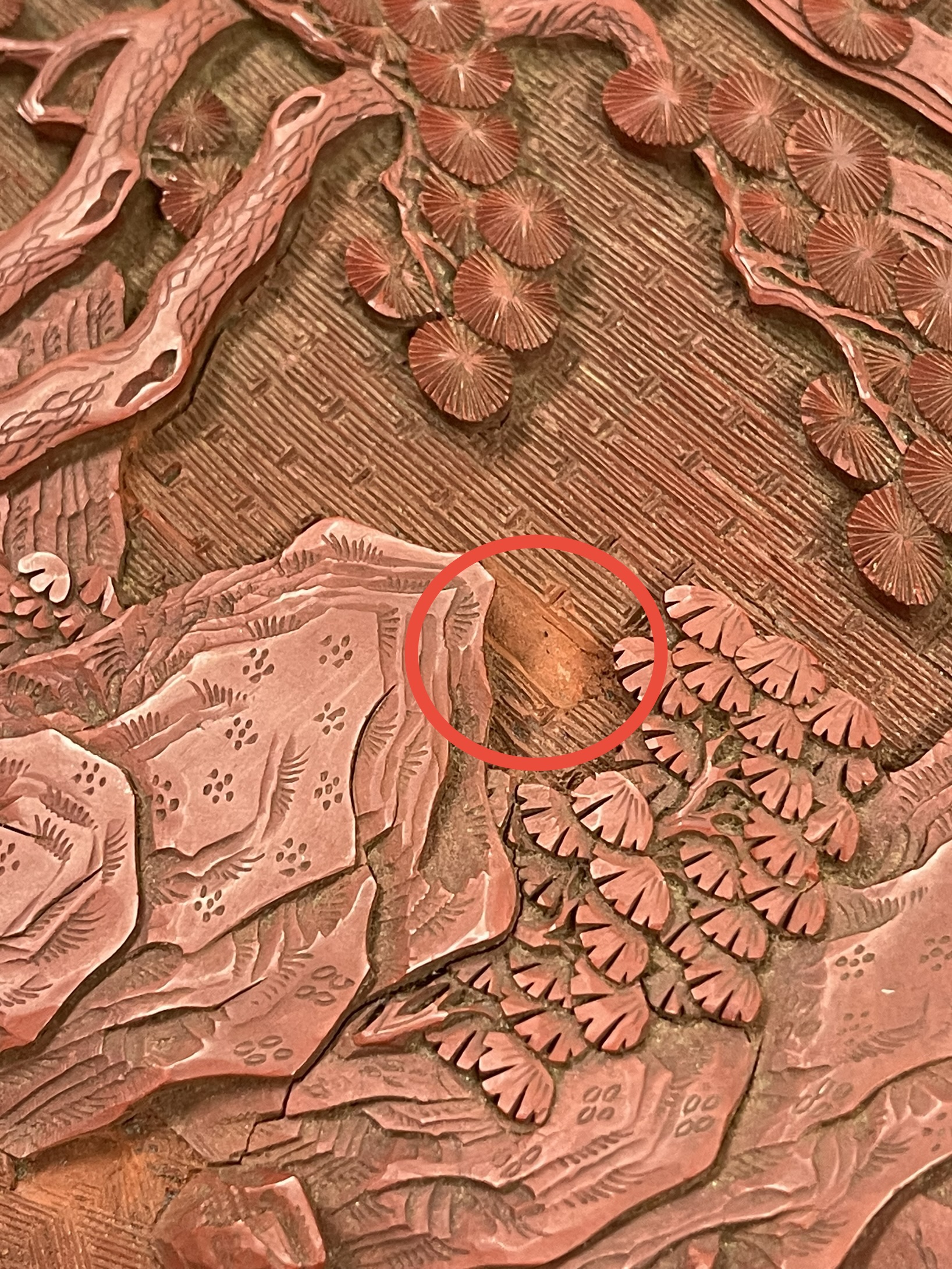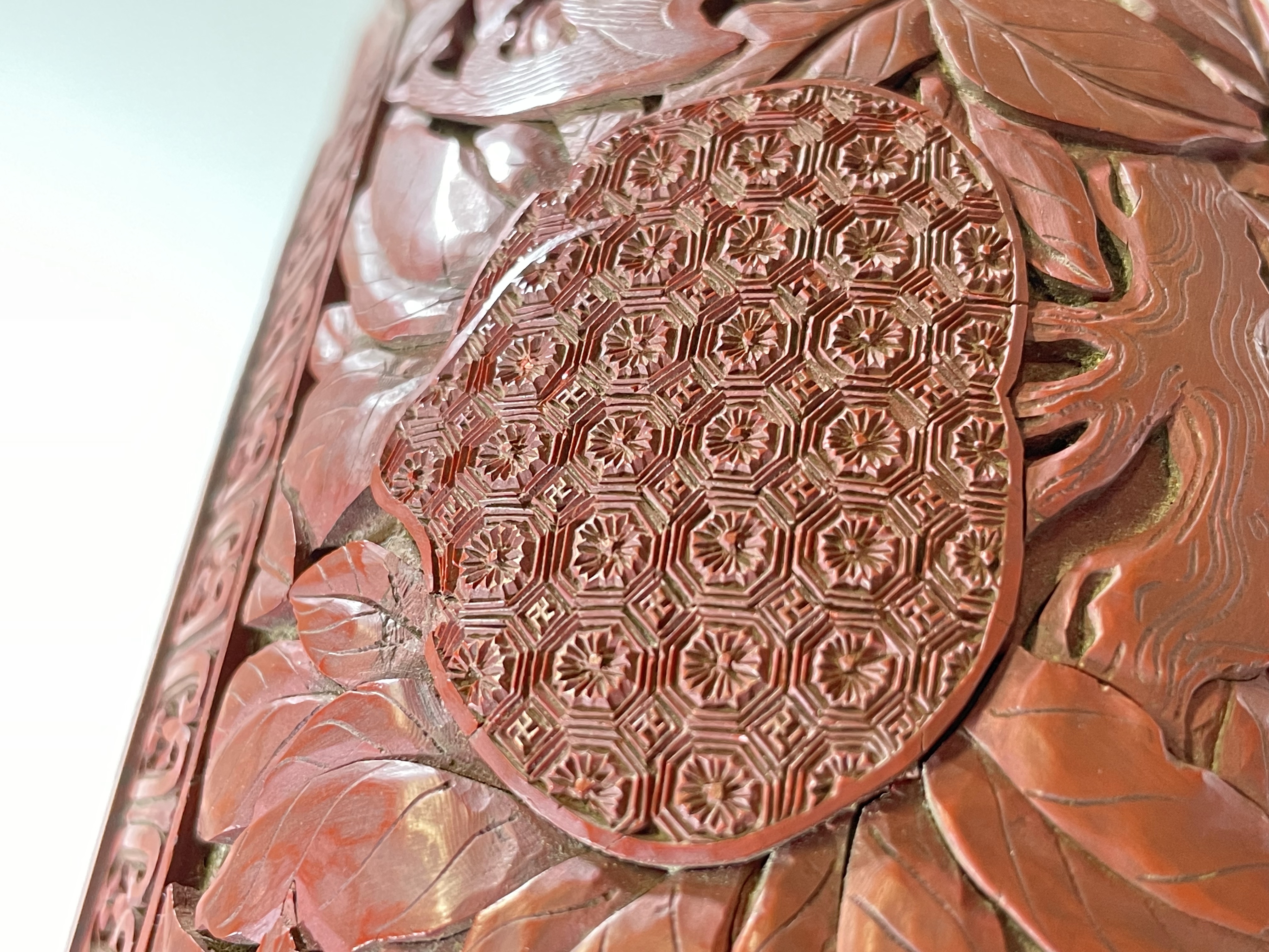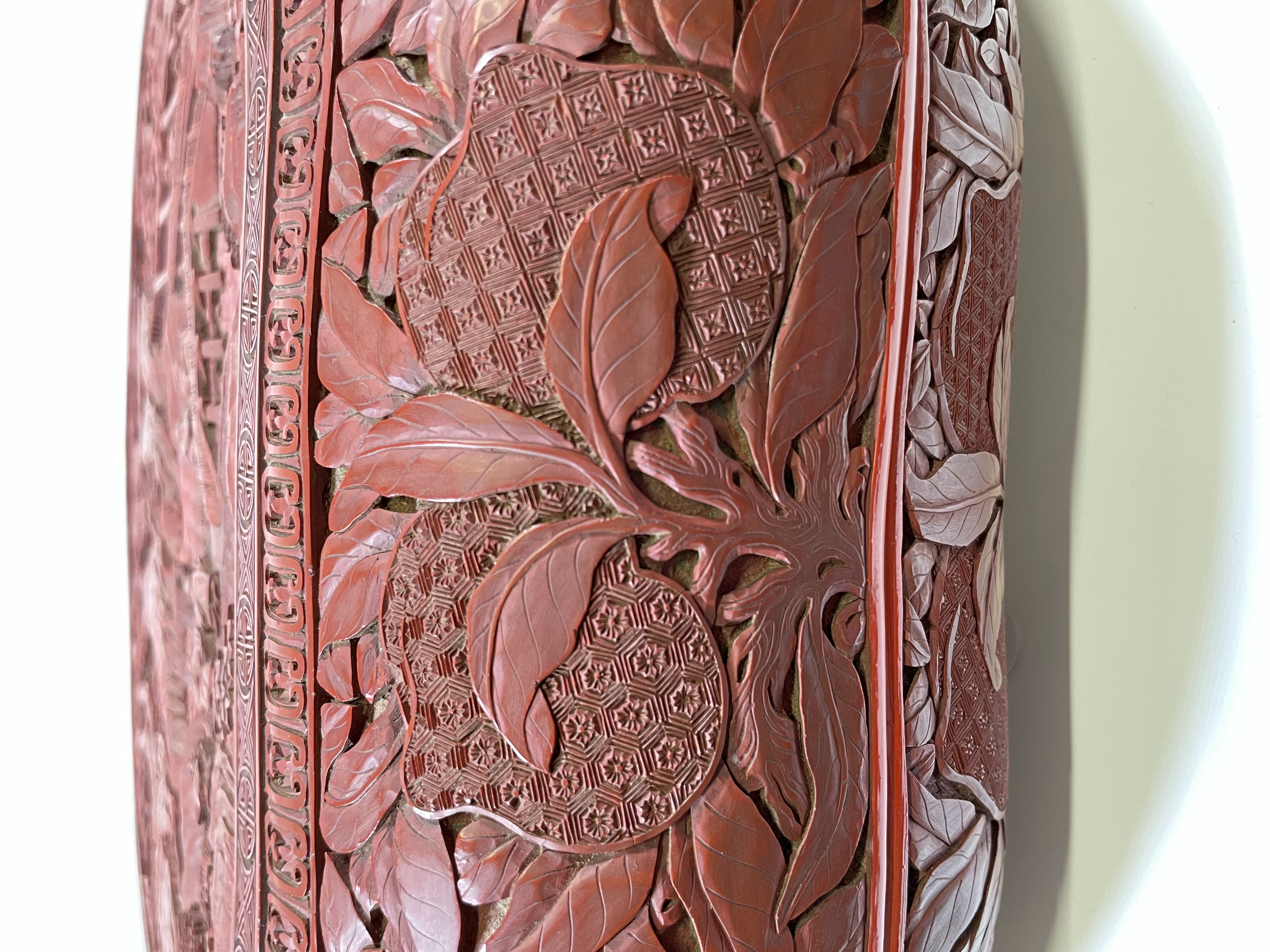 清代乾隆桃型五老图捧盒,盒通体雕红漆,盖面山石嶙峋,苍松翠柏表达天长地久,,亭台楼阁小桥流水体现古代人美好生活的场景,盒底周围雕有荔枝蝙蝠,寓意为大吉大利,福寿长绵,此藏品色泽鲜艳刀工流畅,,显示出高超的雕刻技艺,是一件精品佳作,值得收藏,盖面两处瑕疵处可以用大漆修补。