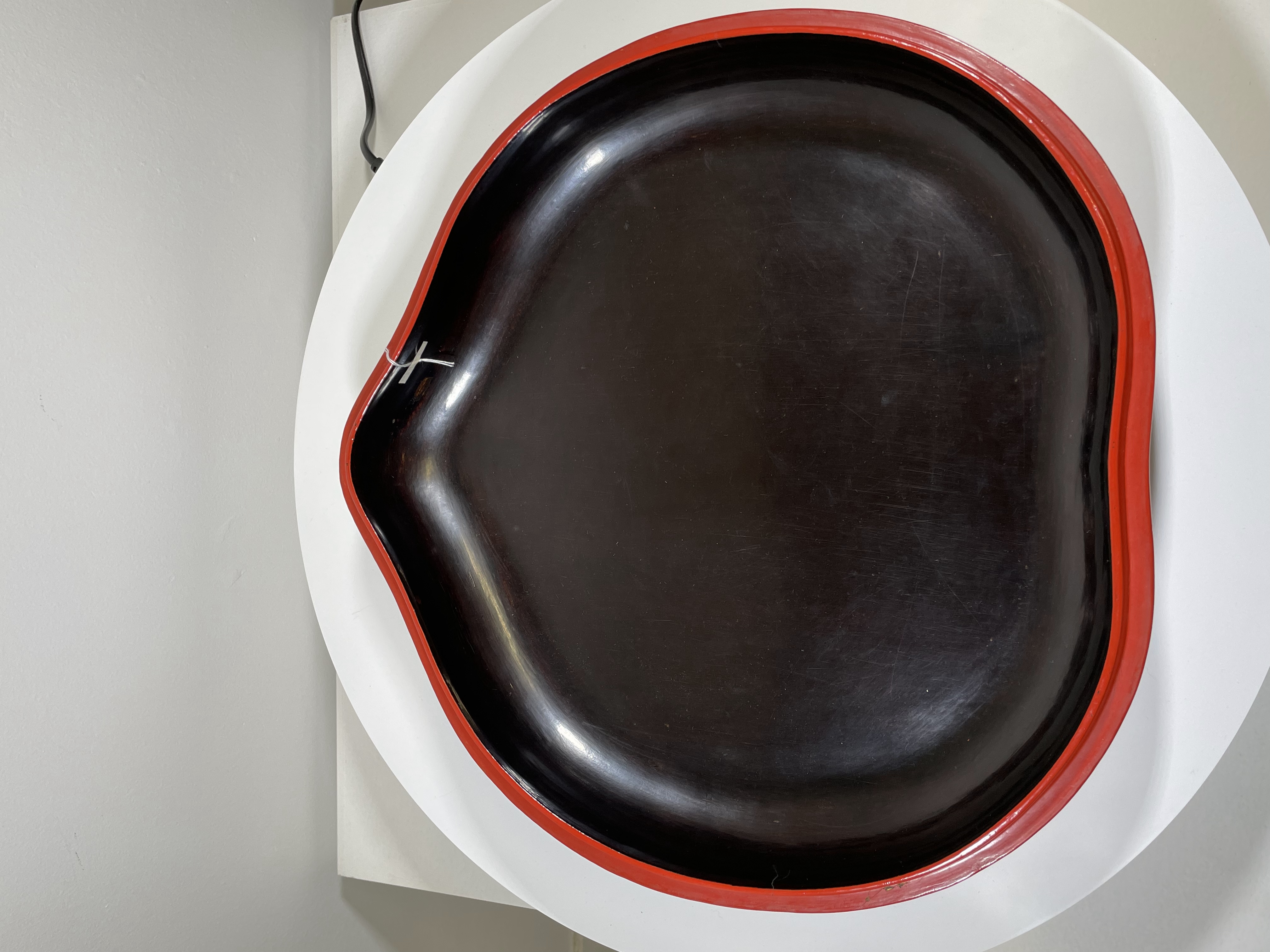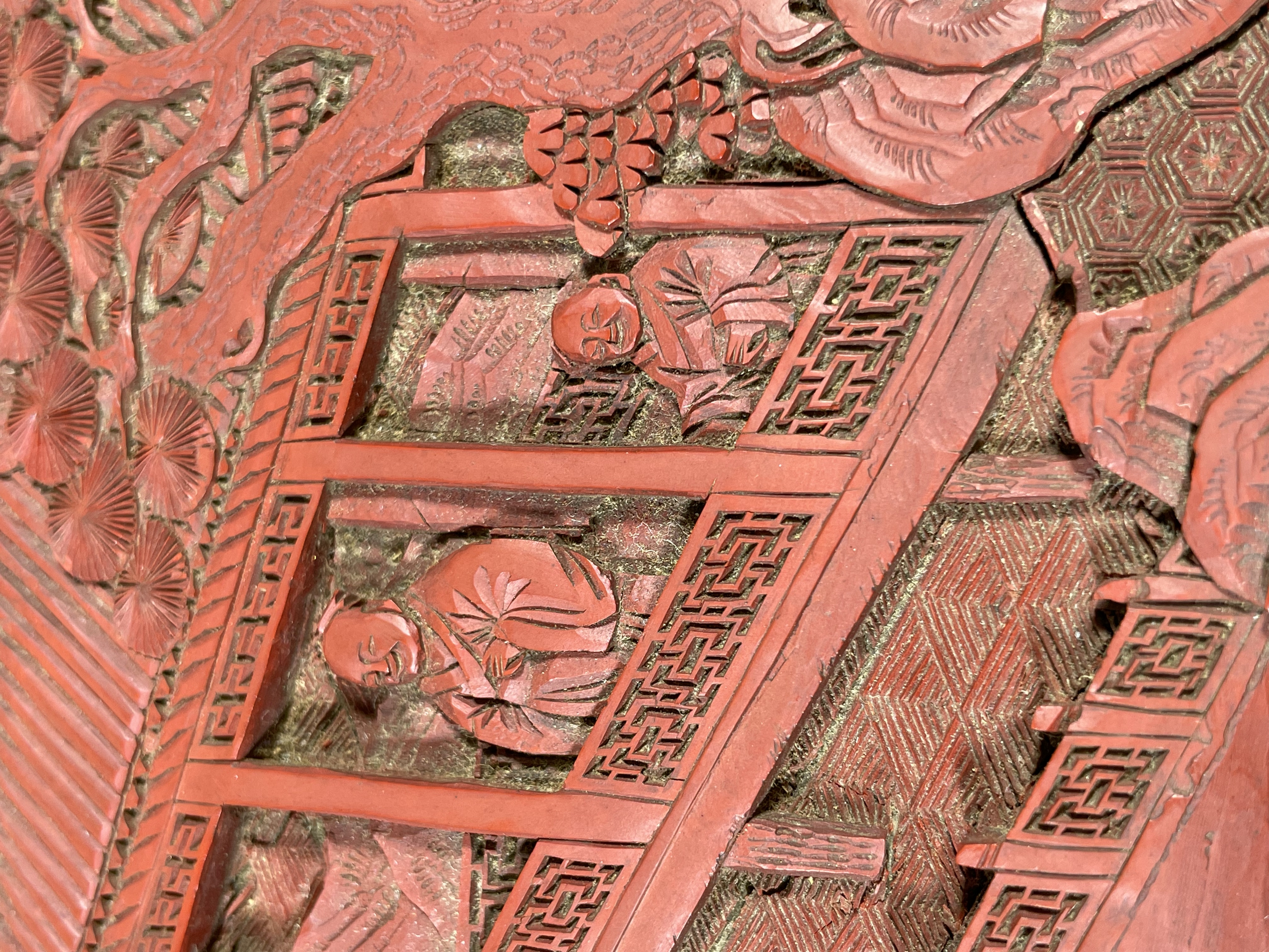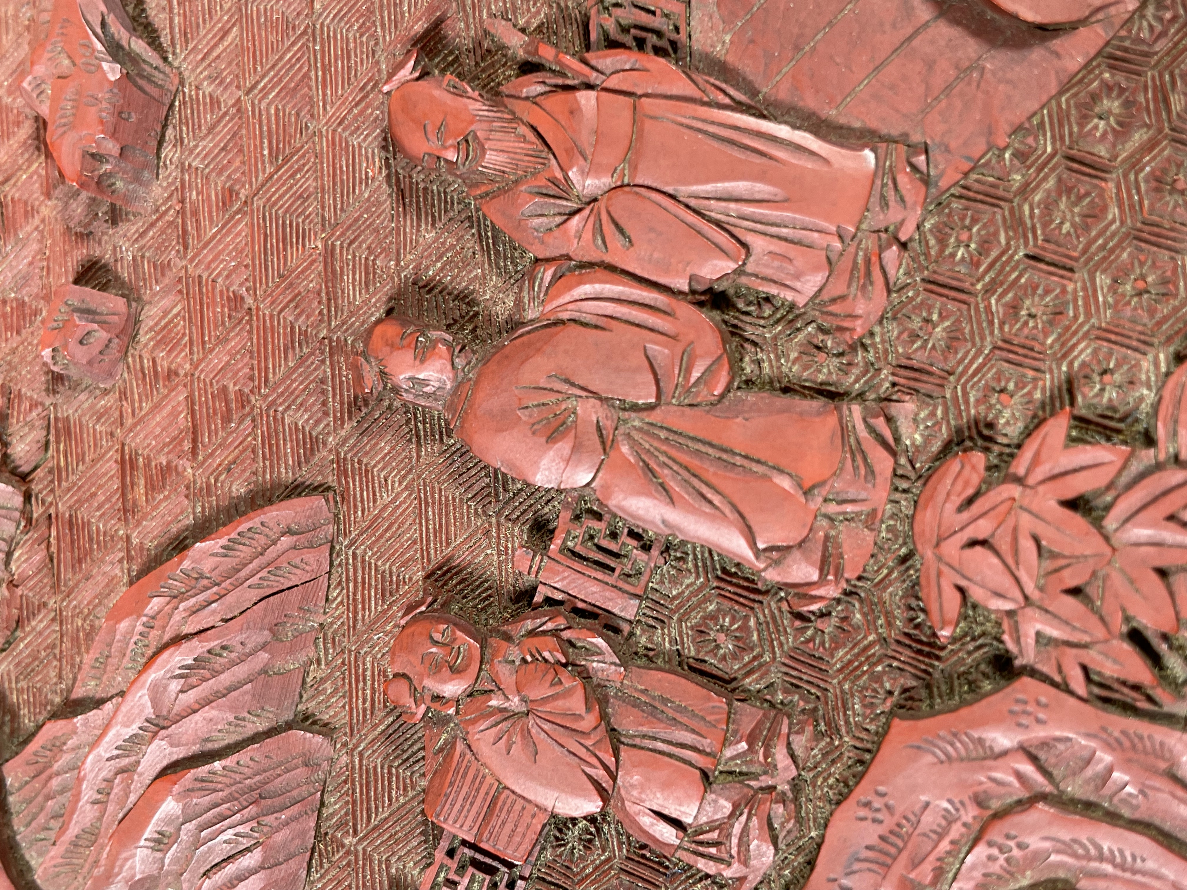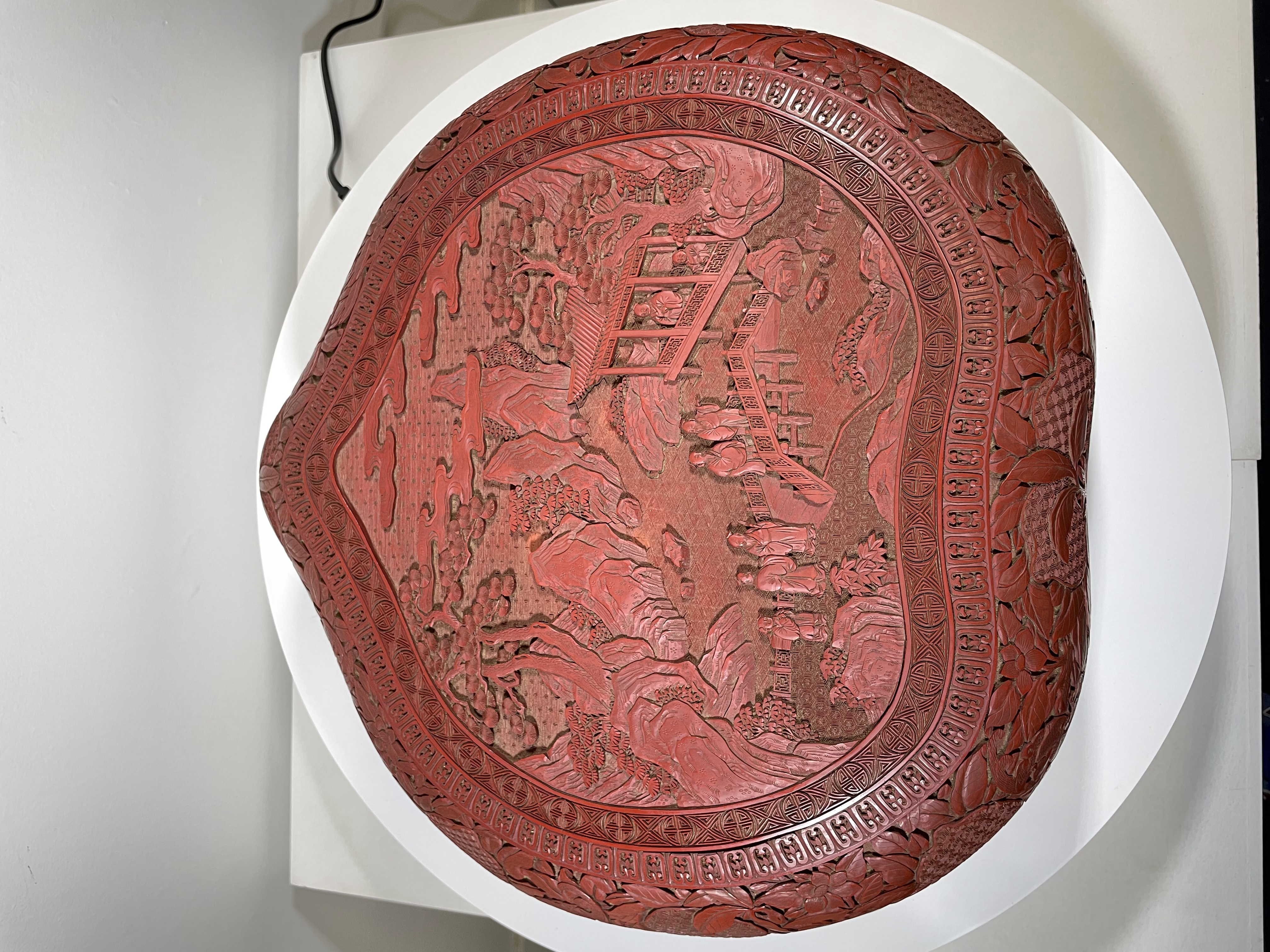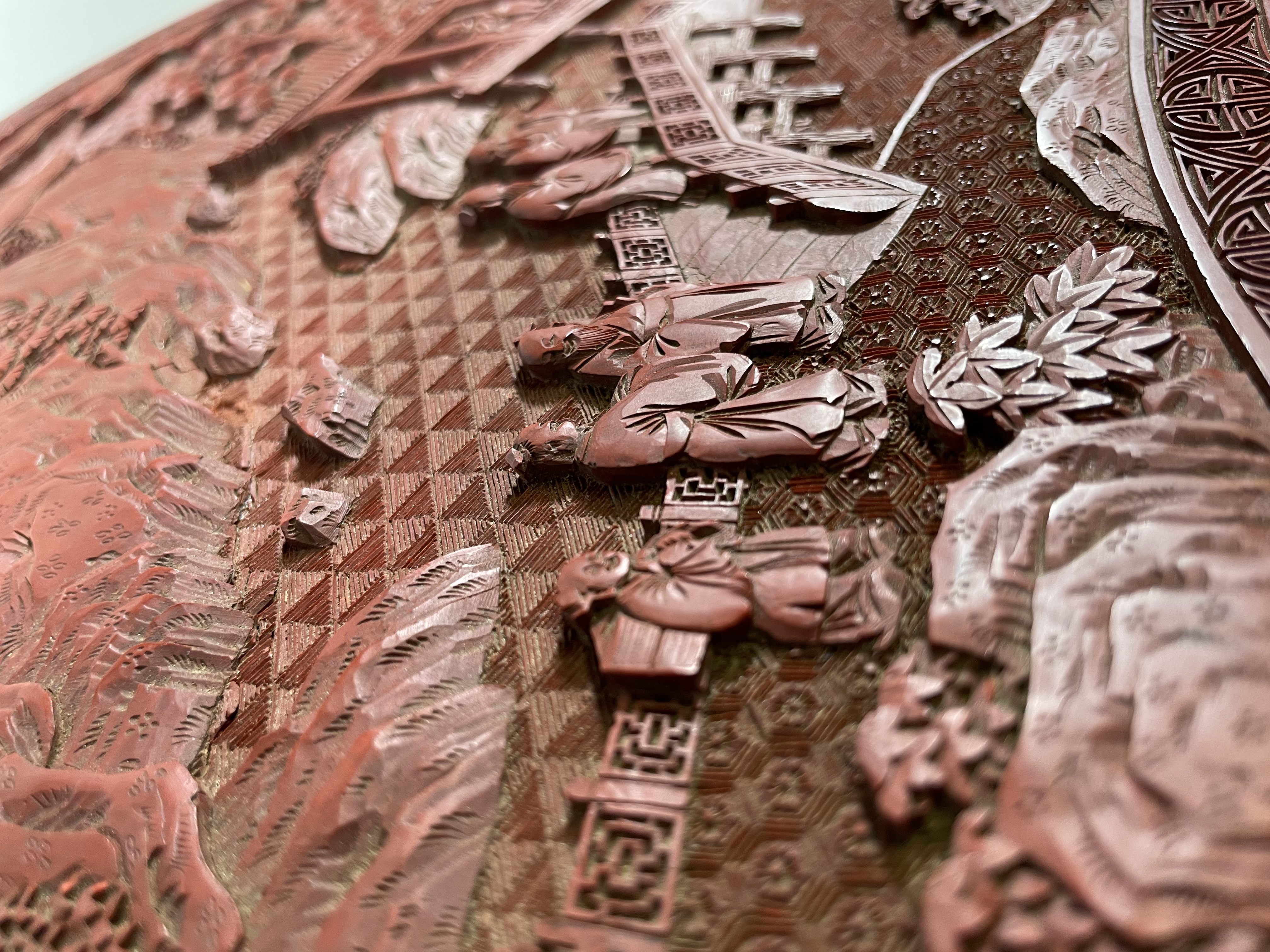 清代乾隆桃型五老图捧盒,盒通体雕红漆,盖面山石嶙峋,苍松翠柏表达天长地久,,亭台楼阁小桥流水体现古代人美好生活的场景,盒底周围雕有荔枝蝙蝠,寓意为大吉大利,福寿长绵,此藏品色泽鲜艳刀工流畅,,显示出高超的雕刻技艺,是一件精品佳作,值得收藏,盖面两处瑕疵处可以用大漆修补。