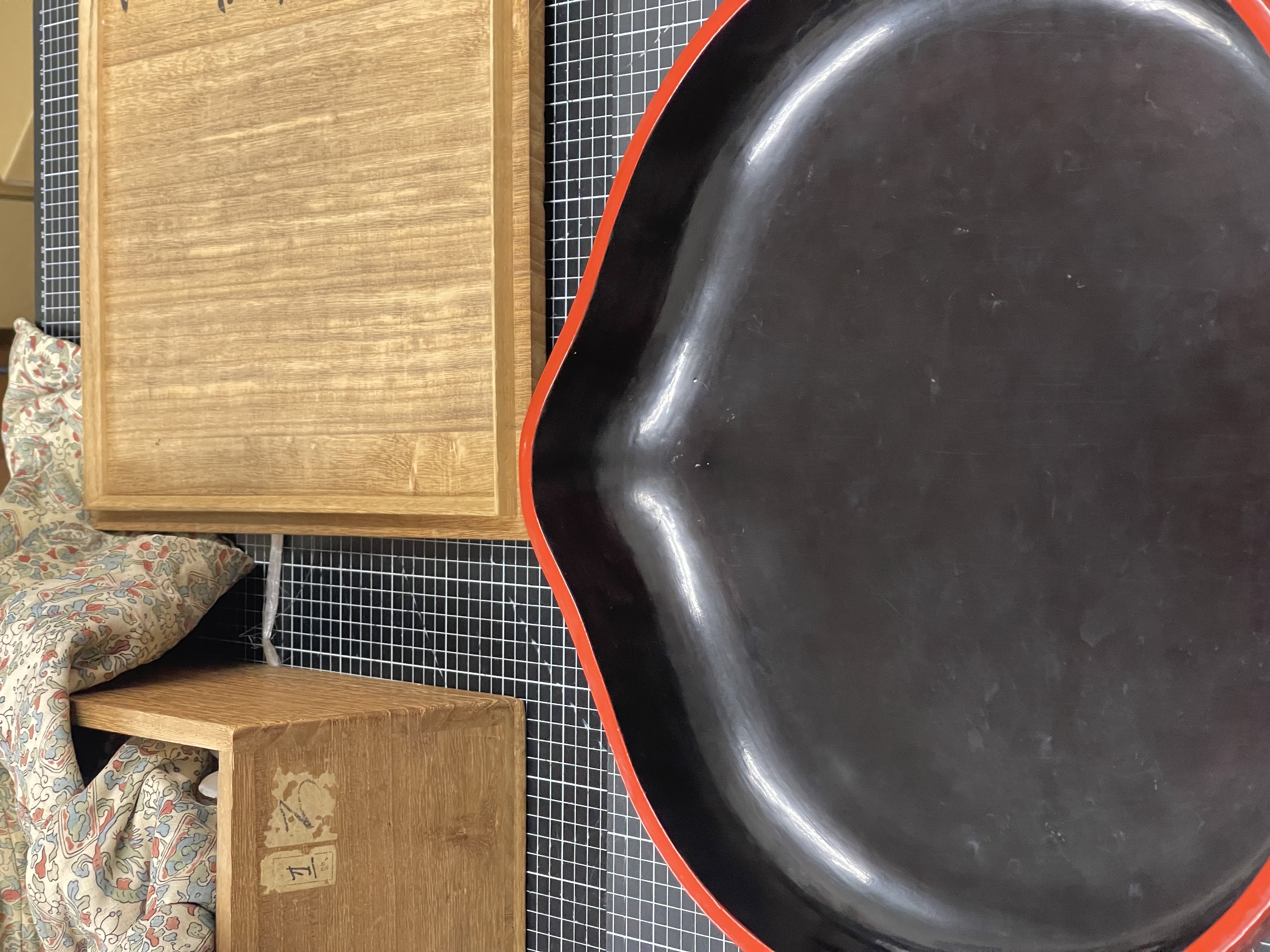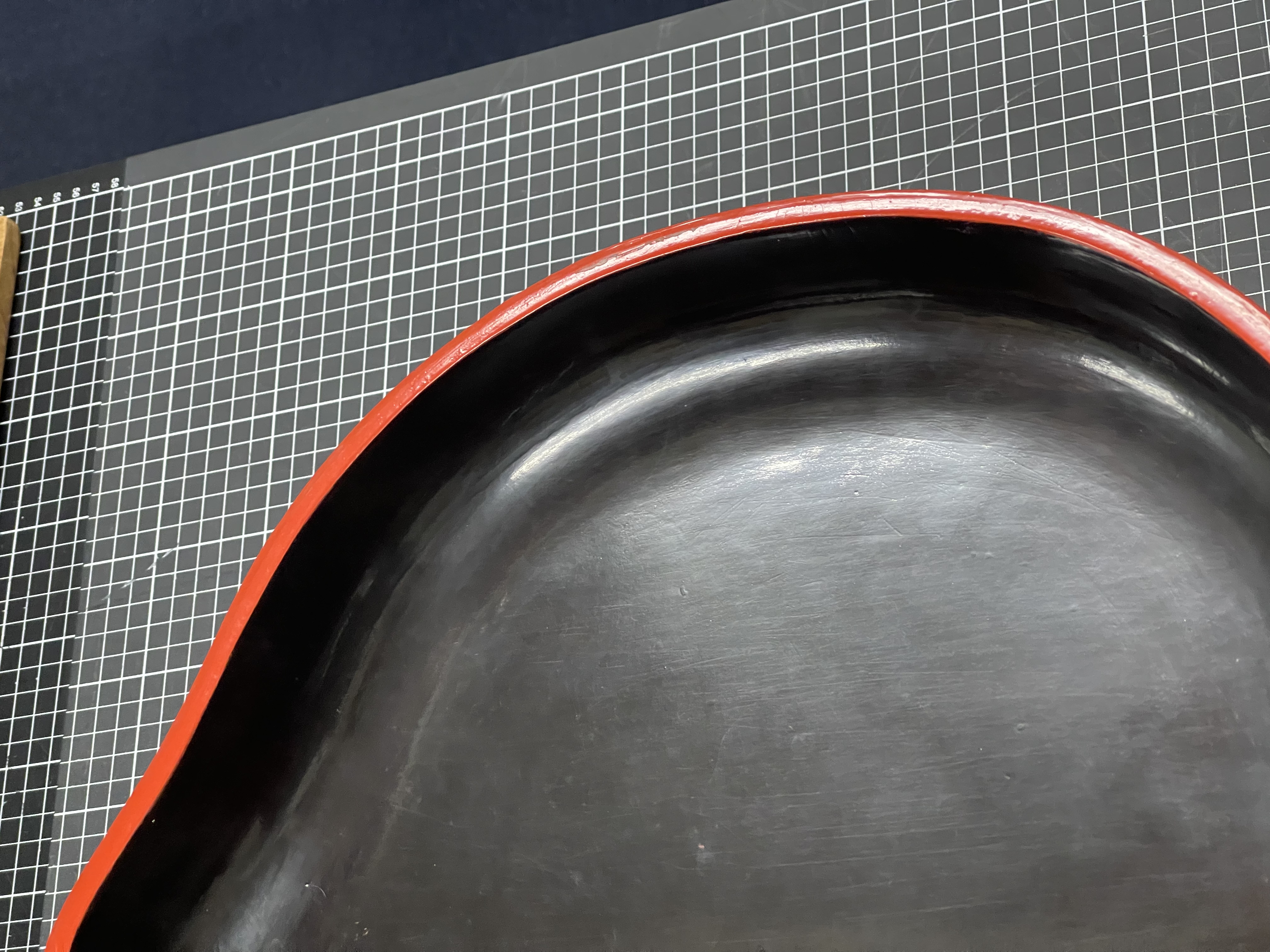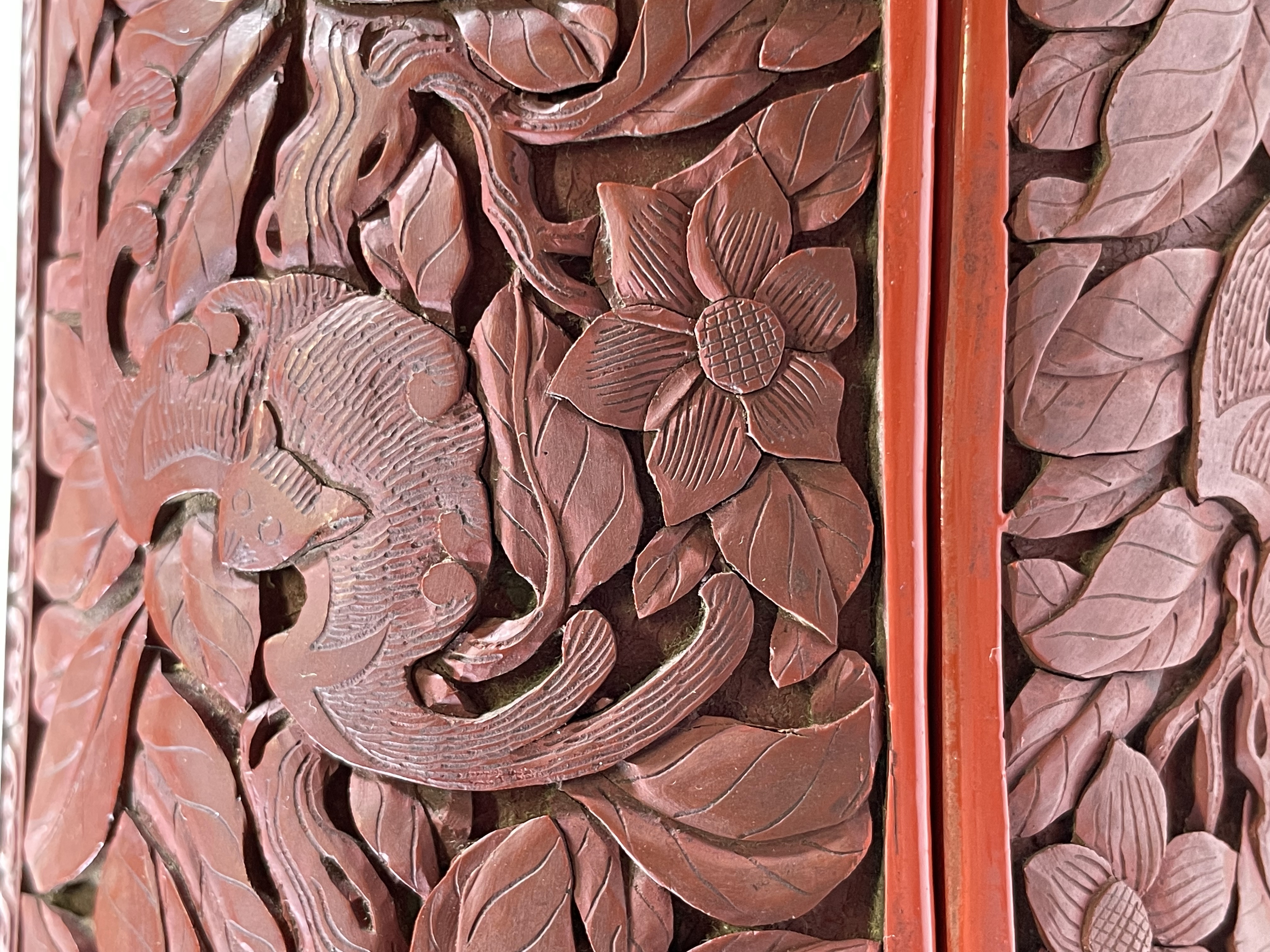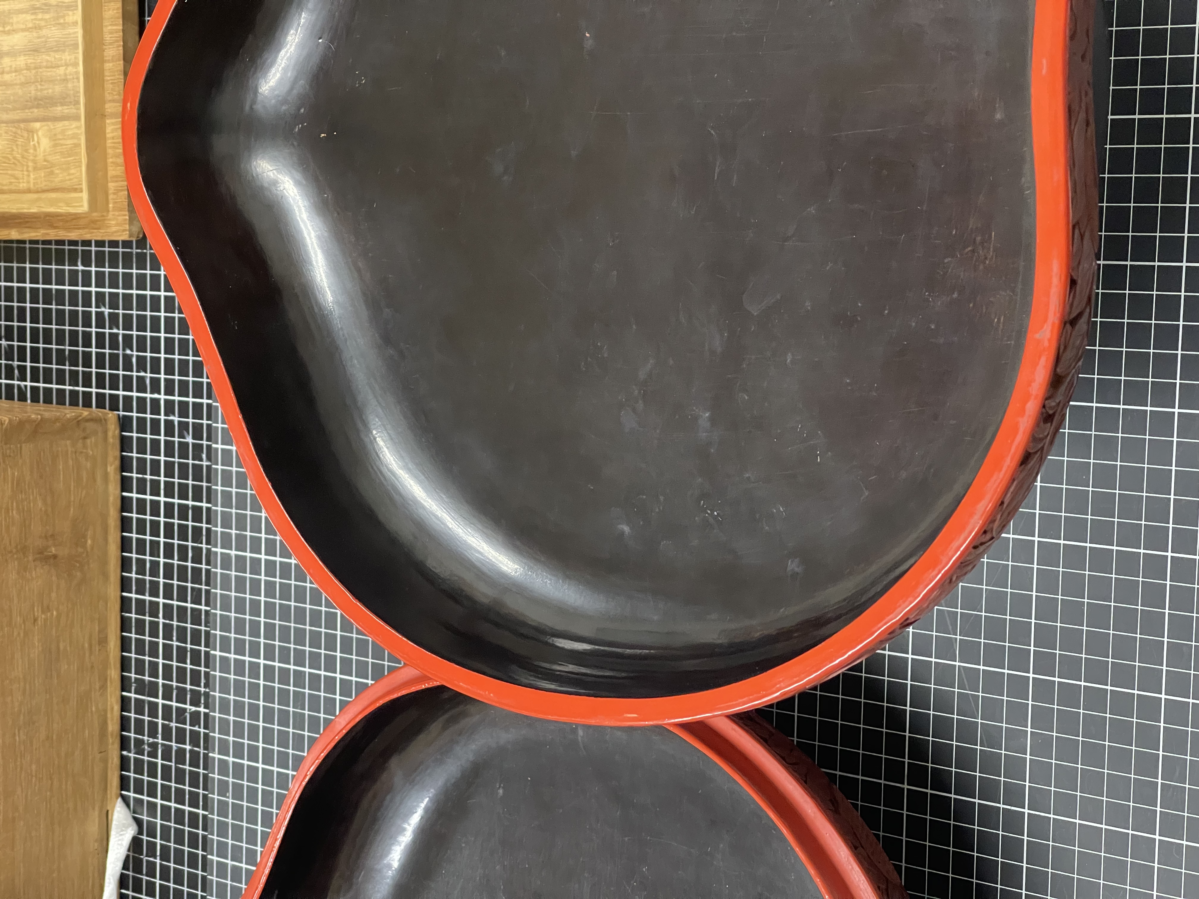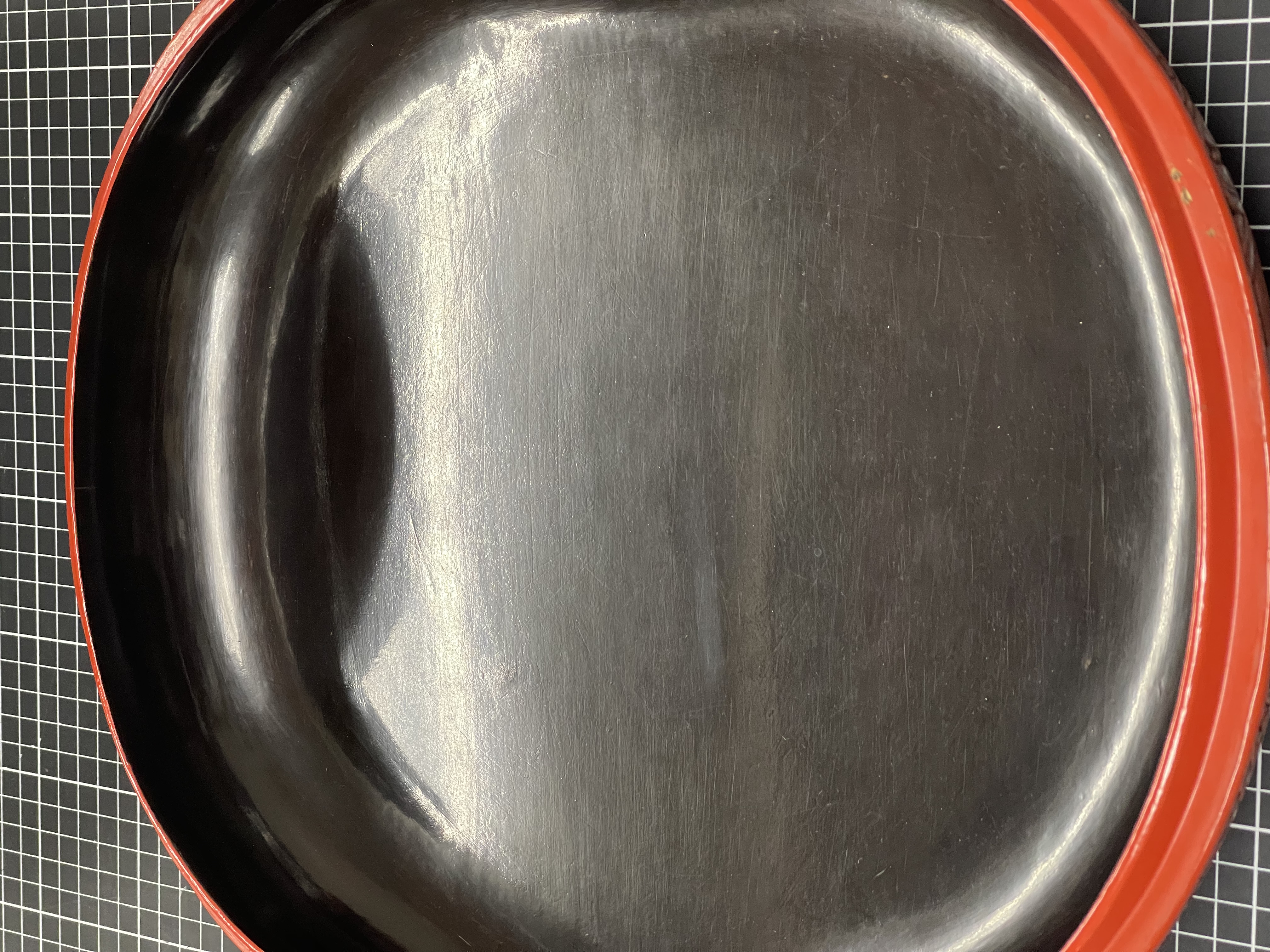 清代乾隆桃型五老图捧盒,盒通体雕红漆,盖面山石嶙峋,苍松翠柏表达天长地久,,亭台楼阁小桥流水体现古代人美好生活的场景,盒底周围雕有荔枝蝙蝠,寓意为大吉大利,福寿长绵,此藏品色泽鲜艳刀工流畅,,显示出高超的雕刻技艺,是一件精品佳作,值得收藏,盖面两处瑕疵处可以用大漆修补。