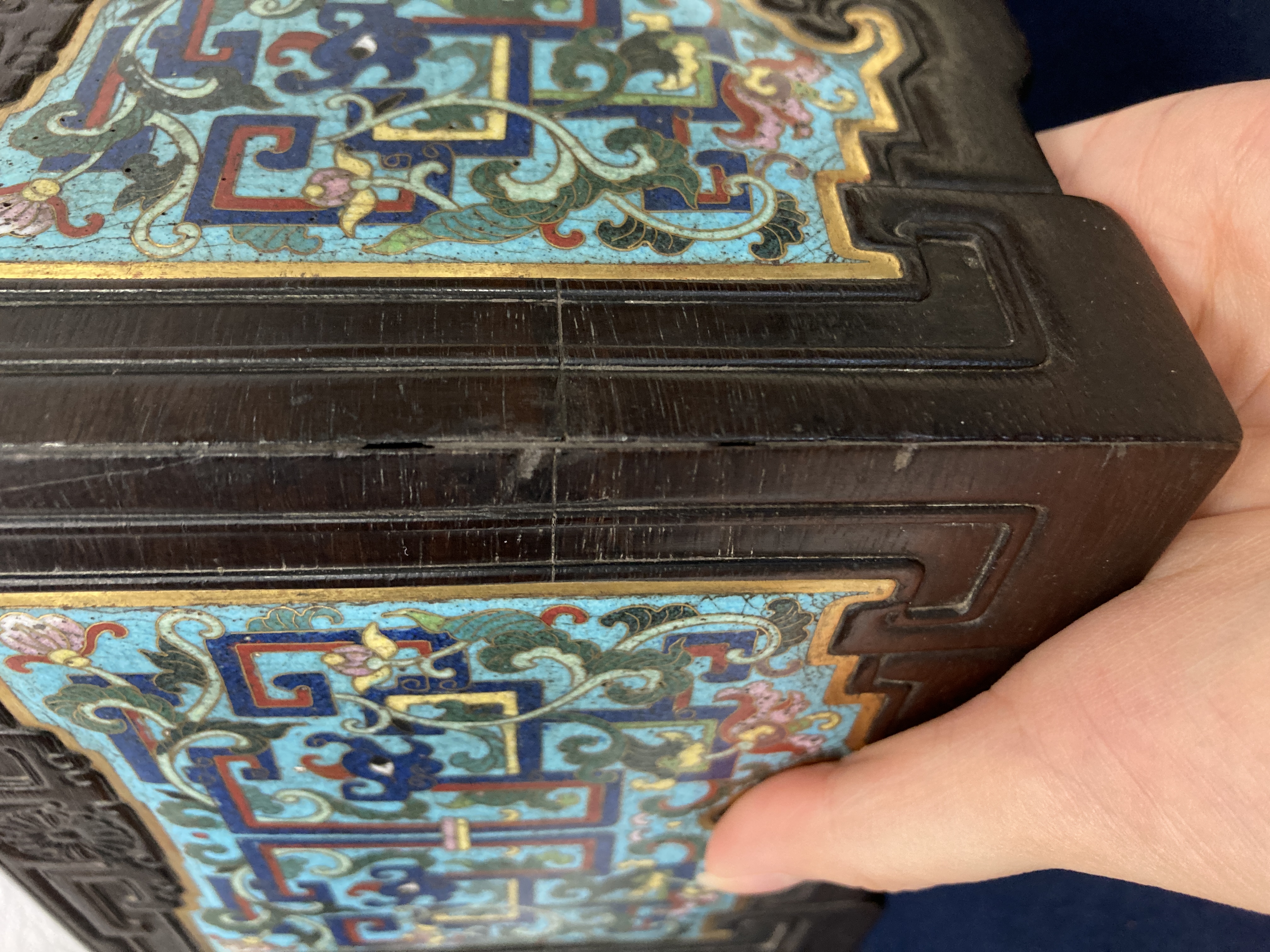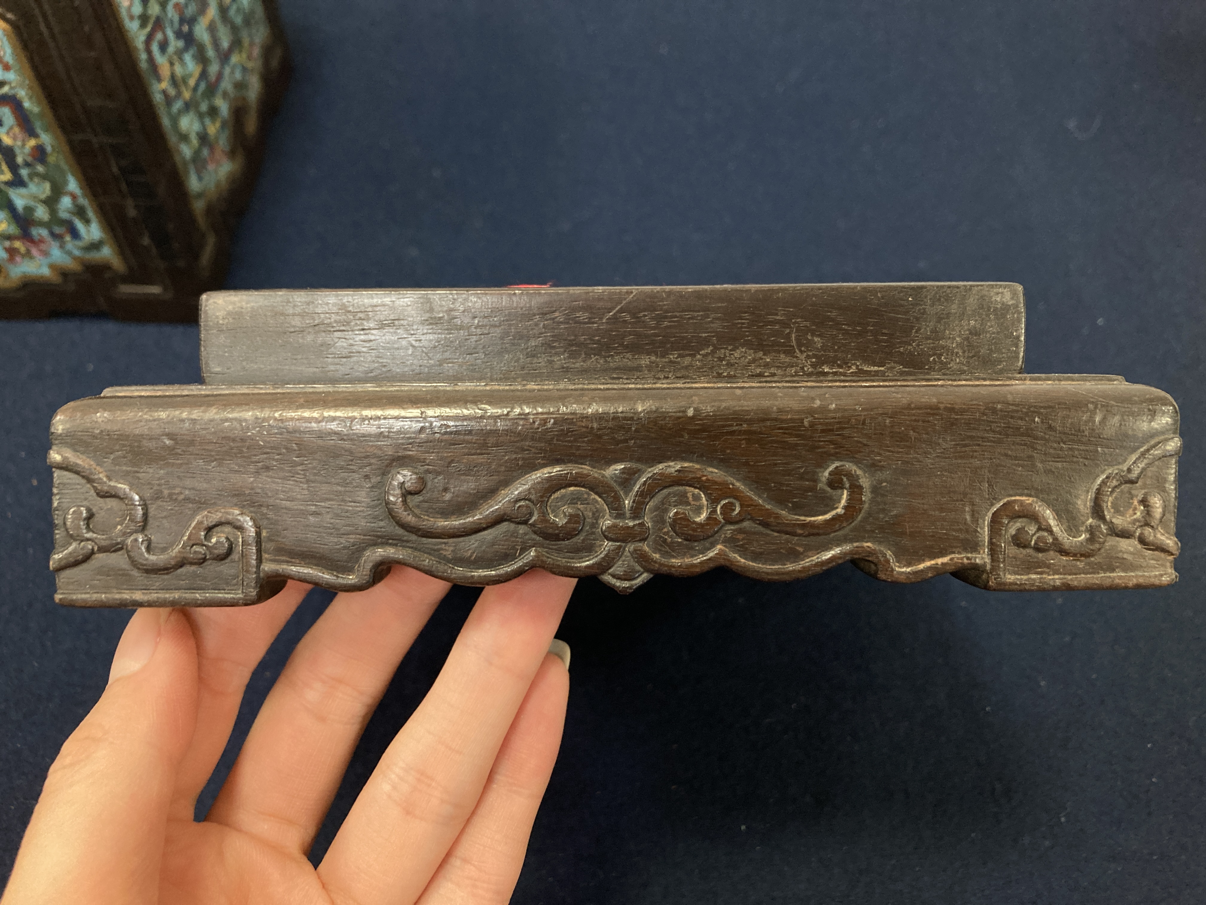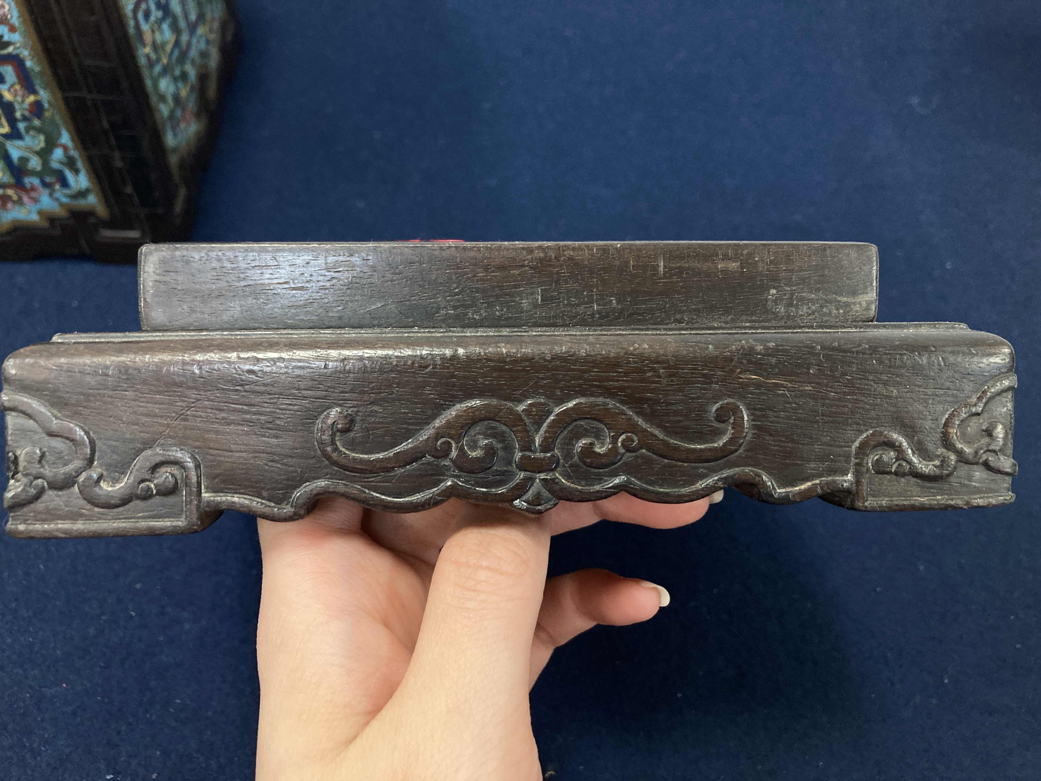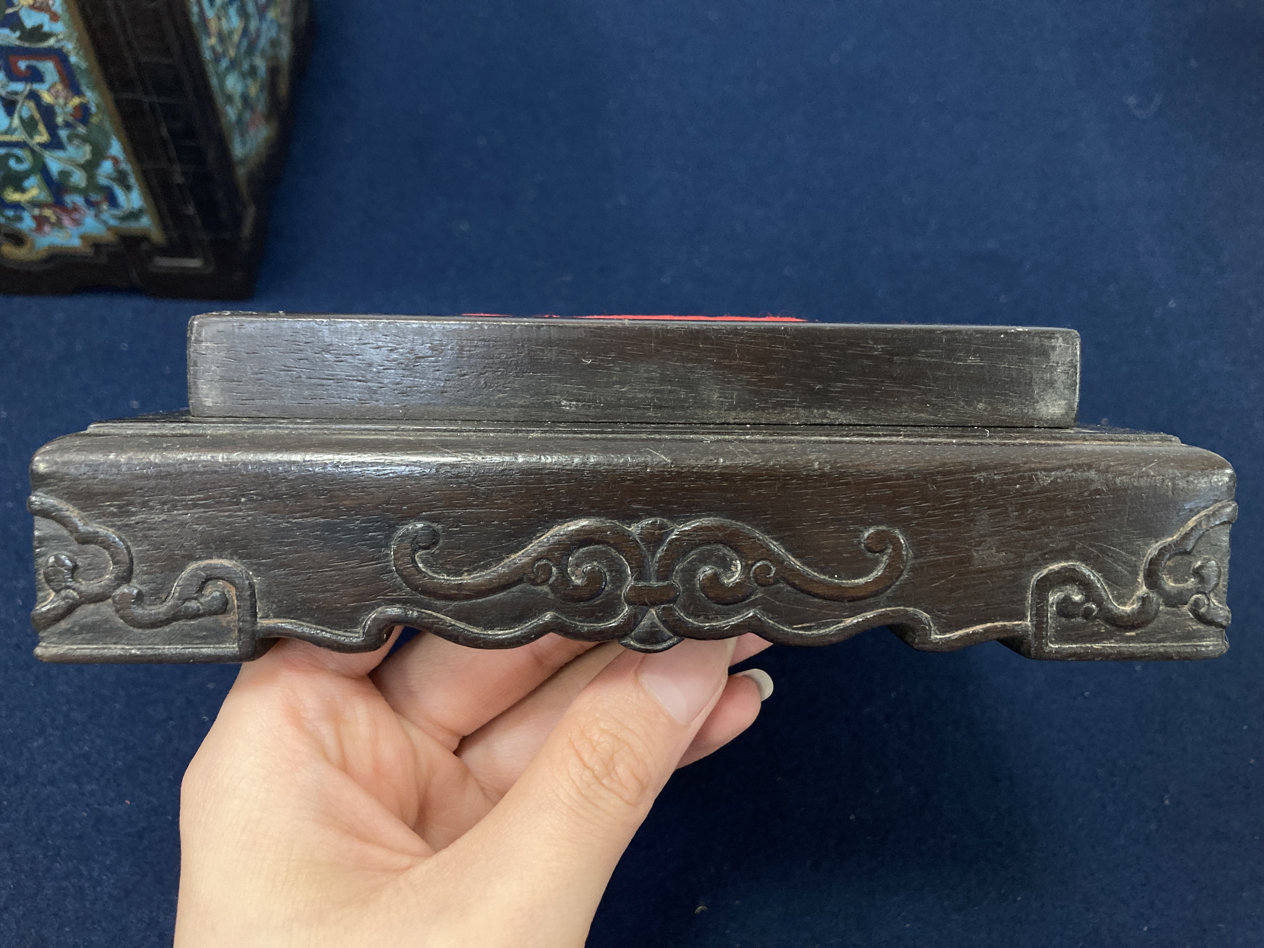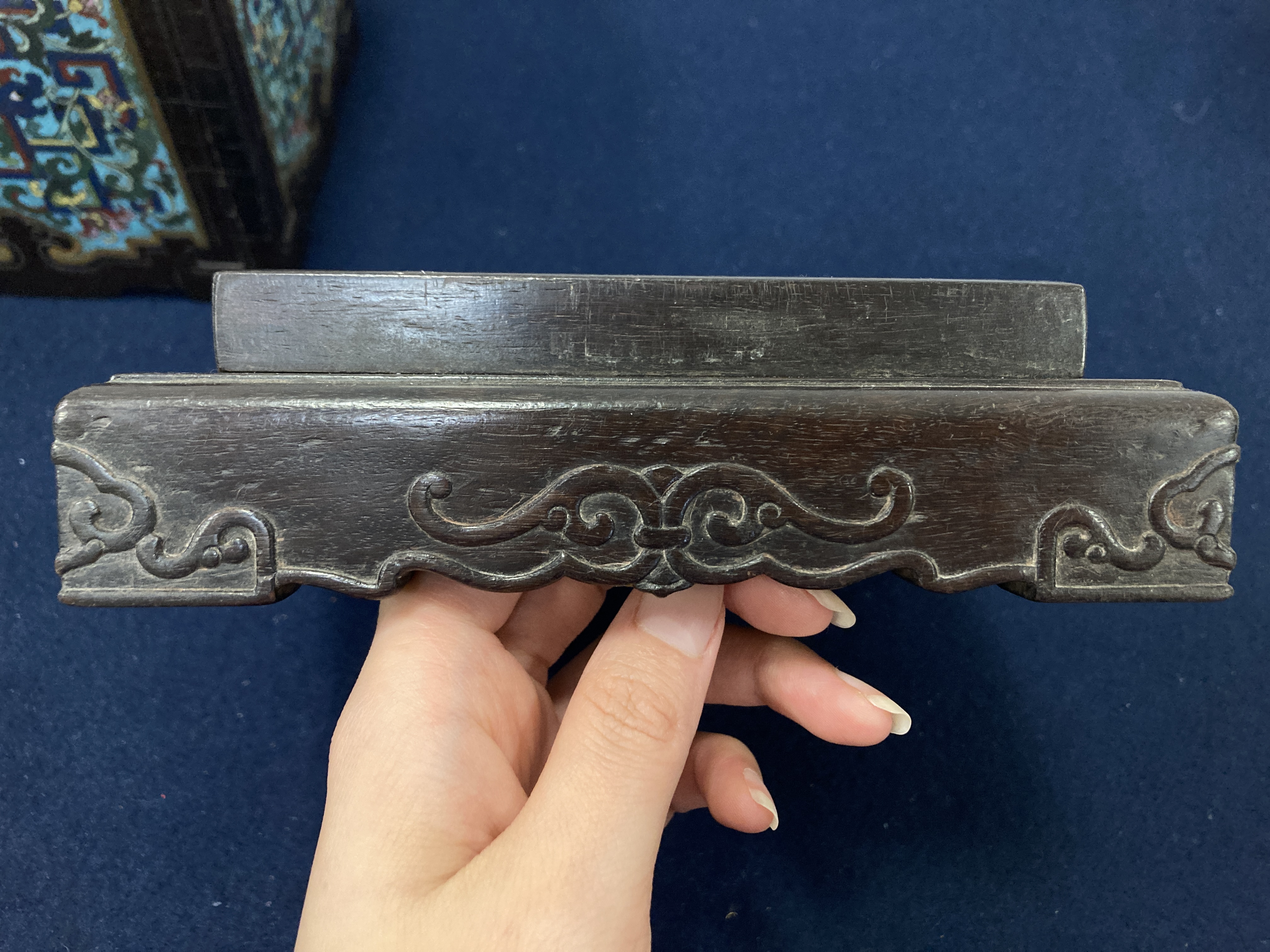这件掐丝珐琅紫檀盒,应该是一个玺印的扣盒,这件东西从制式上看是沿袭着老制式所做,通过整体的状态、包浆、还有它拐子笼的形式、上边的掐丝珐琅彩的四条釉料,它应该是老的。从照片上分析应该是晚清到民国的东西,并非款识所写的本朝。款识刻得很软,不像本朝那么劲道,馆阁体书写得没那么的精炼。盒的料从木质上看,棕眼的细腻程度应该是紫檀的,没问题,看着像老的。珐琅彩掐丝,从丝条添彩的状态看,符合晚清到民国这个时间百年的这种历史特点,综合来看应该是晚清到民国的珍品,不错,可藏。 另外要看看有没有修补,尤其是这个紫檀的木块,如果是满撤,那是非常不错,要有修补就递减价值了。
