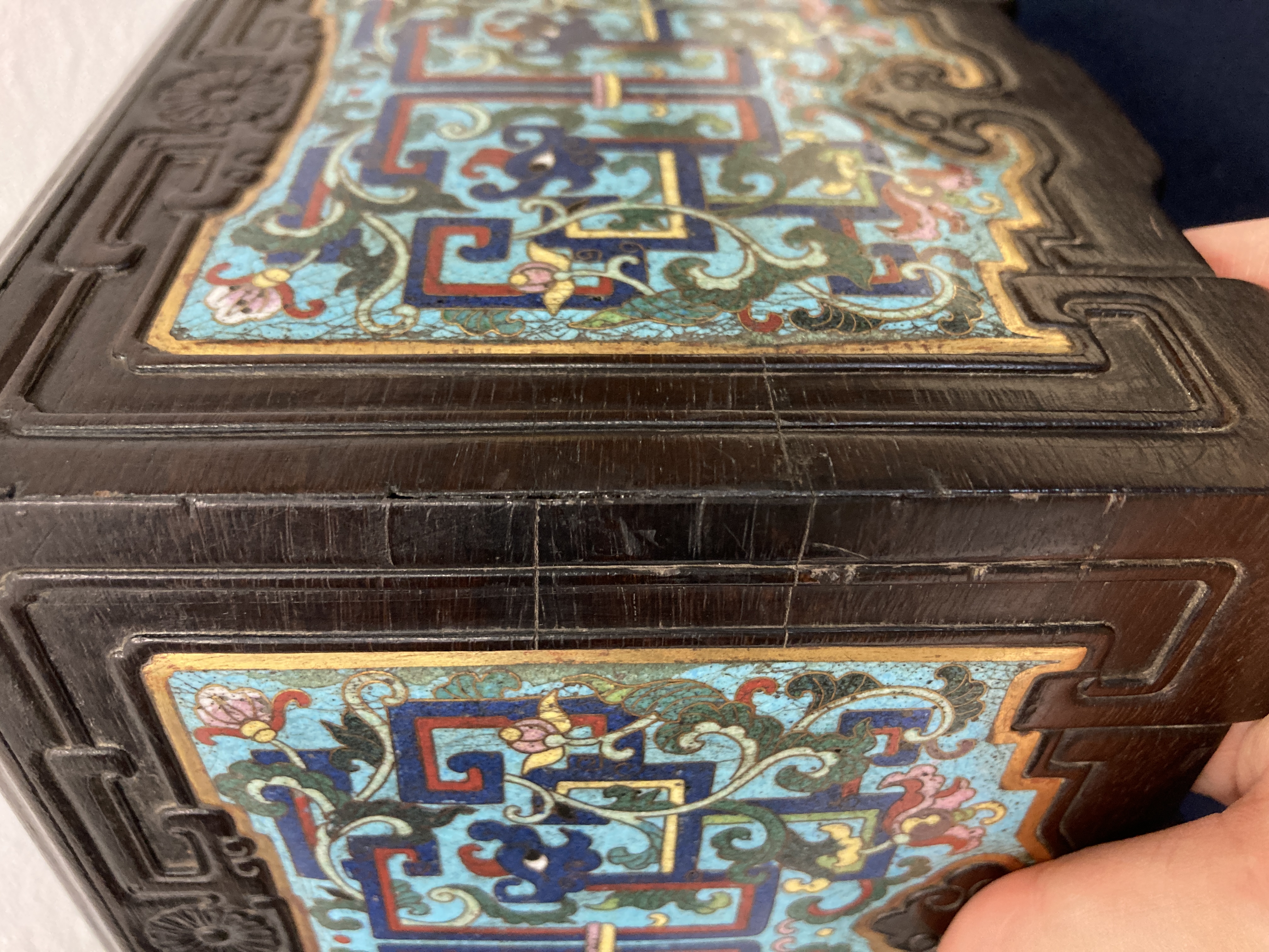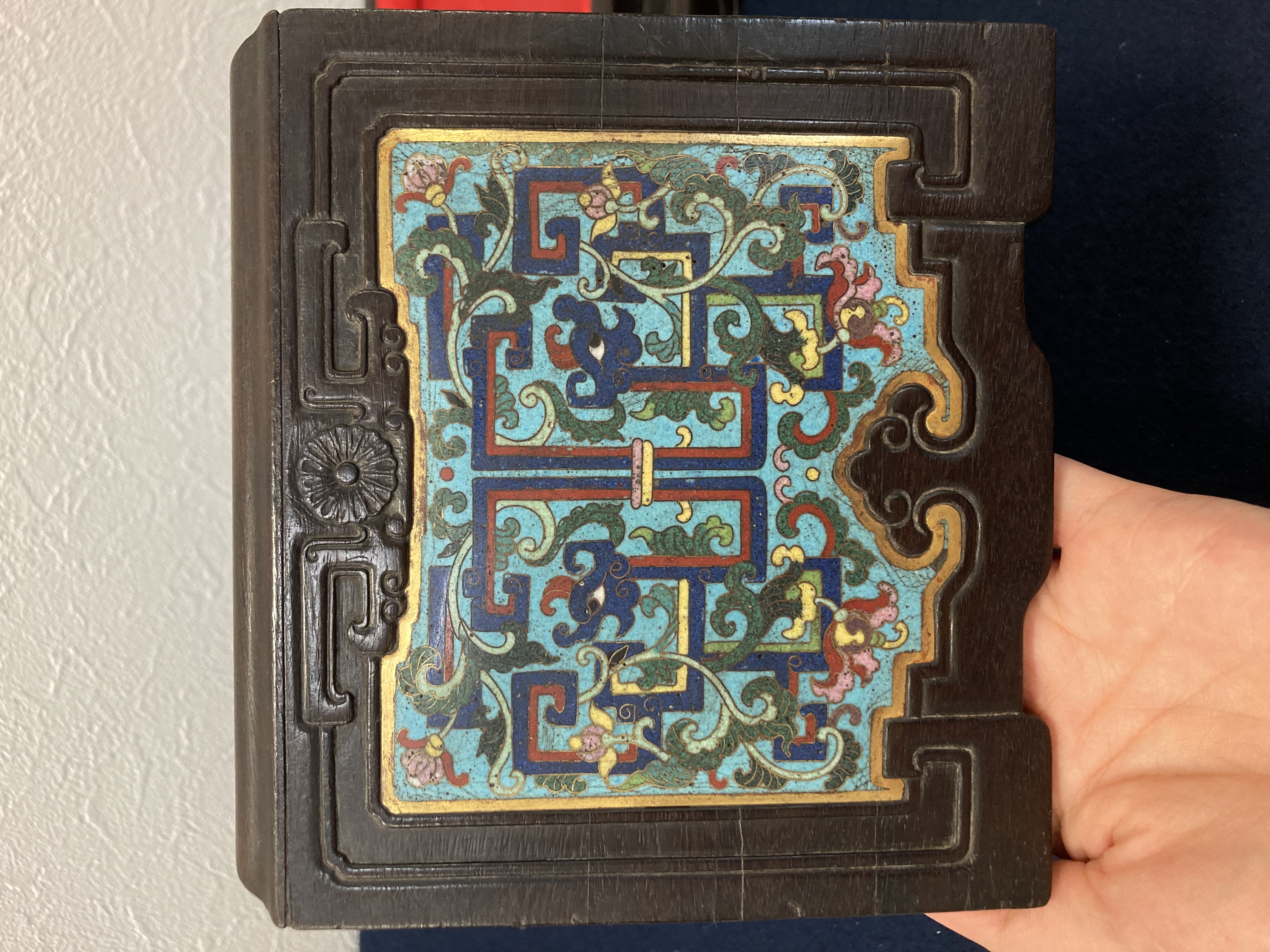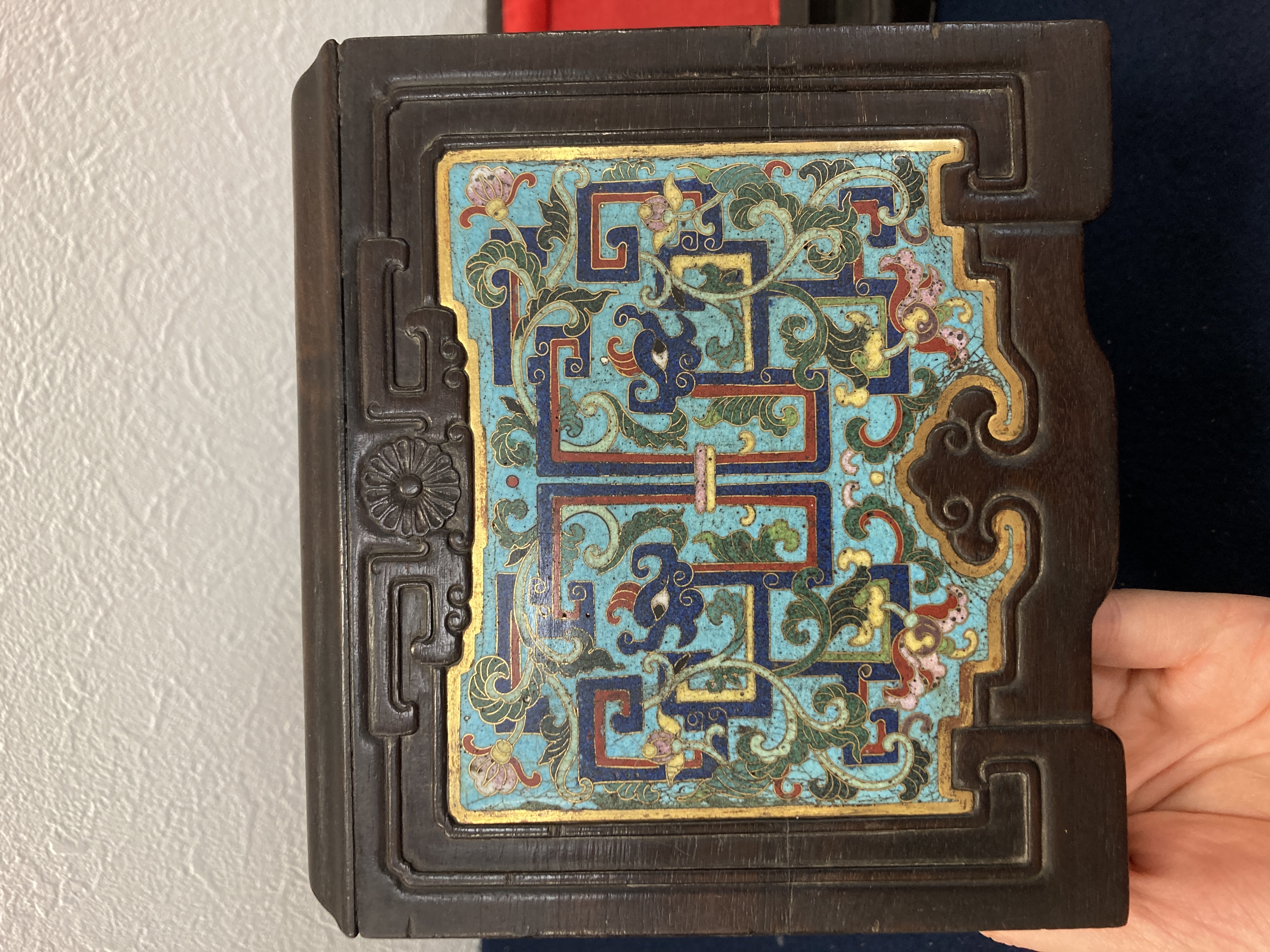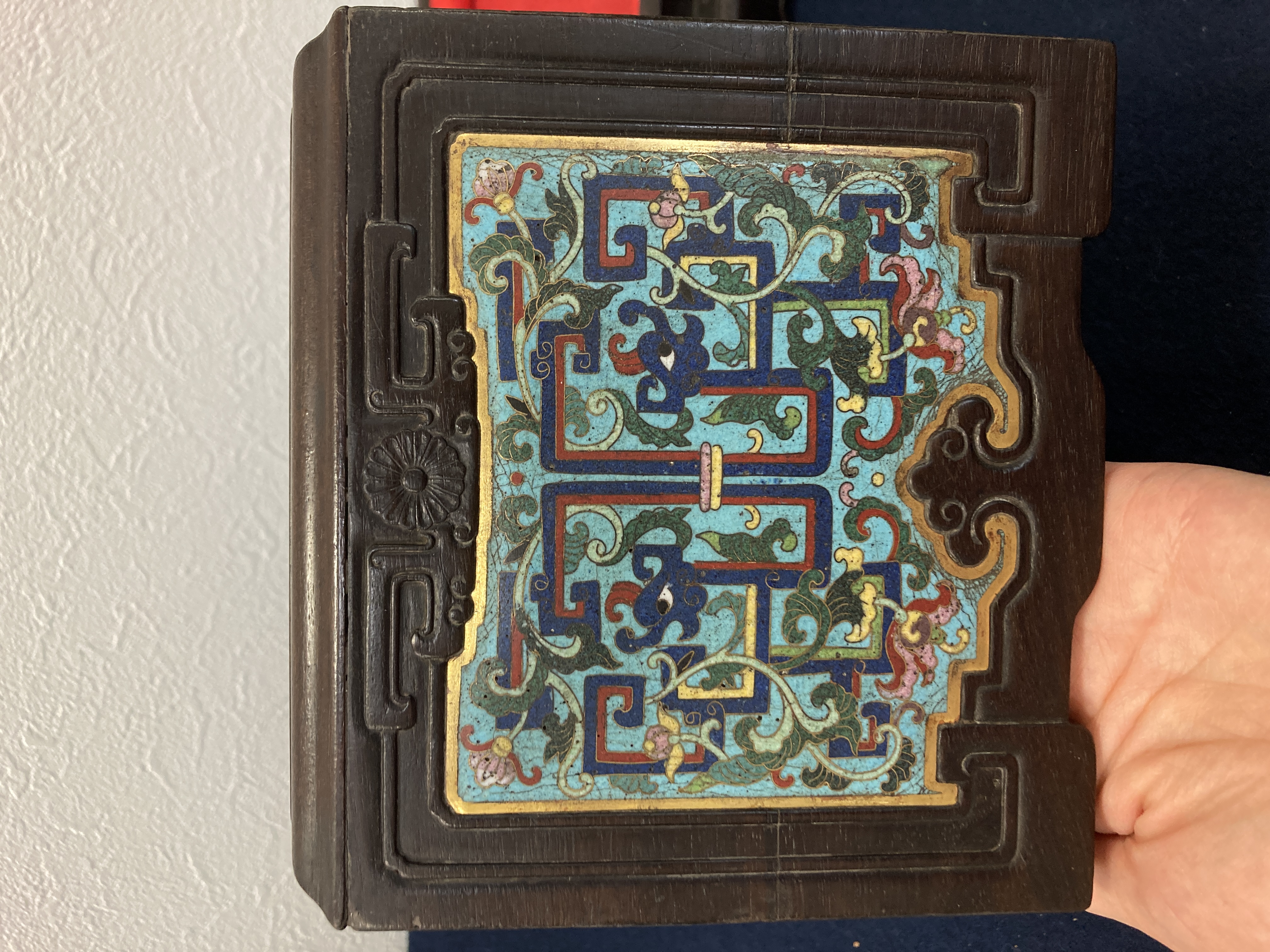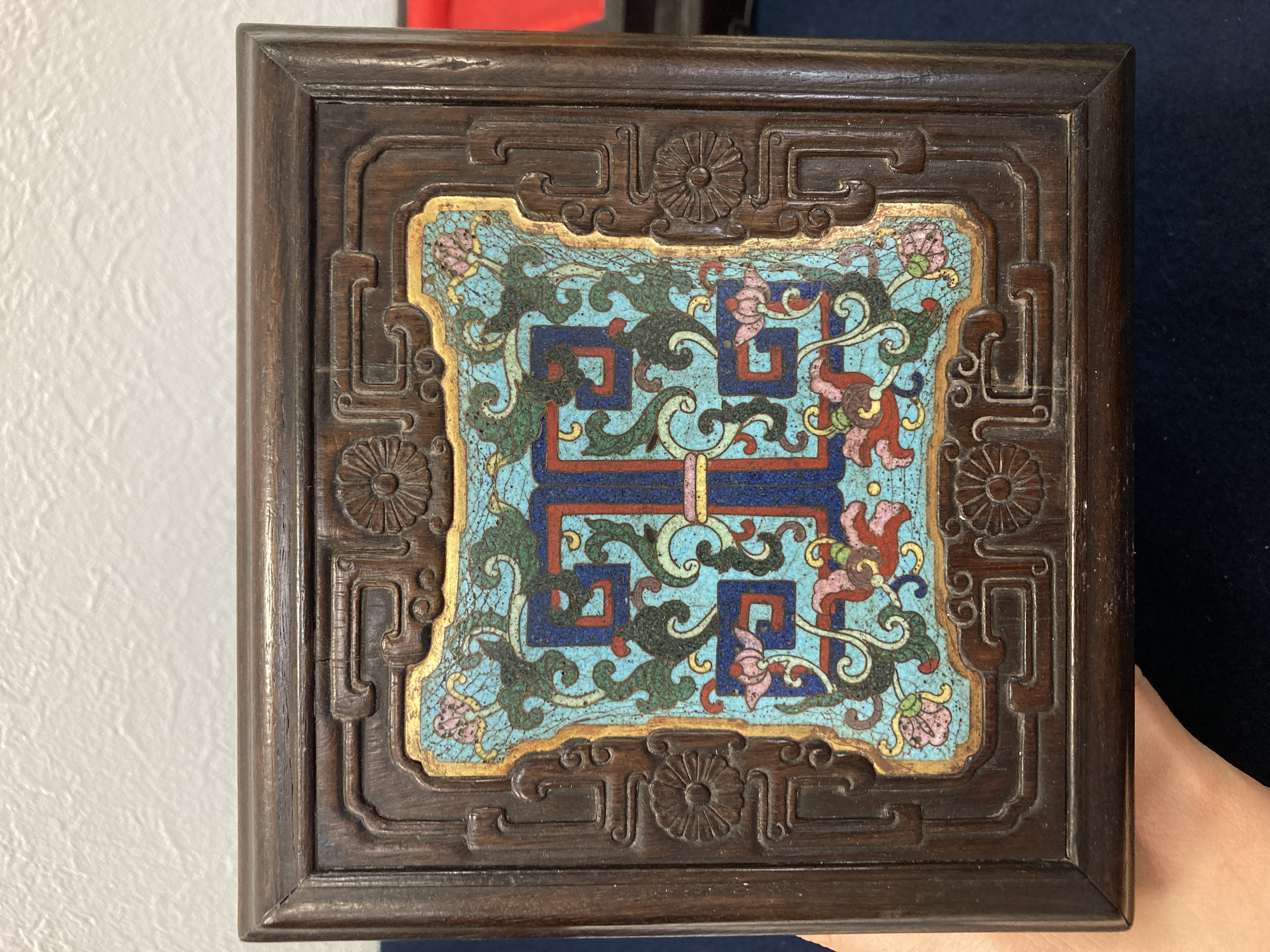 这件掐丝珐琅紫檀盒,应该是一个玺印的扣盒,这件东西从制式上看是沿袭着老制式所做,通过整体的状态、包浆、还有它拐子笼的形式、上边的掐丝珐琅彩的四条釉料,它应该是老的。从照片上分析应该是晚清到民国的东西,并非款识所写的本朝。款识刻得很软,不像本朝那么劲道,馆阁体书写得没那么的精炼。盒的料从木质上看,棕眼的细腻程度应该是紫檀的,没问题,看着像老的。珐琅彩掐丝,从丝条添彩的状态看,符合晚清到民国这个时间百年的这种历史特点,综合来看应该是晚清到民国的珍品,不错,可藏。 另外要看看有没有修补,尤其是这个紫檀的木块,如果是满撤,那是非常不错,要有修补就递减价值了。