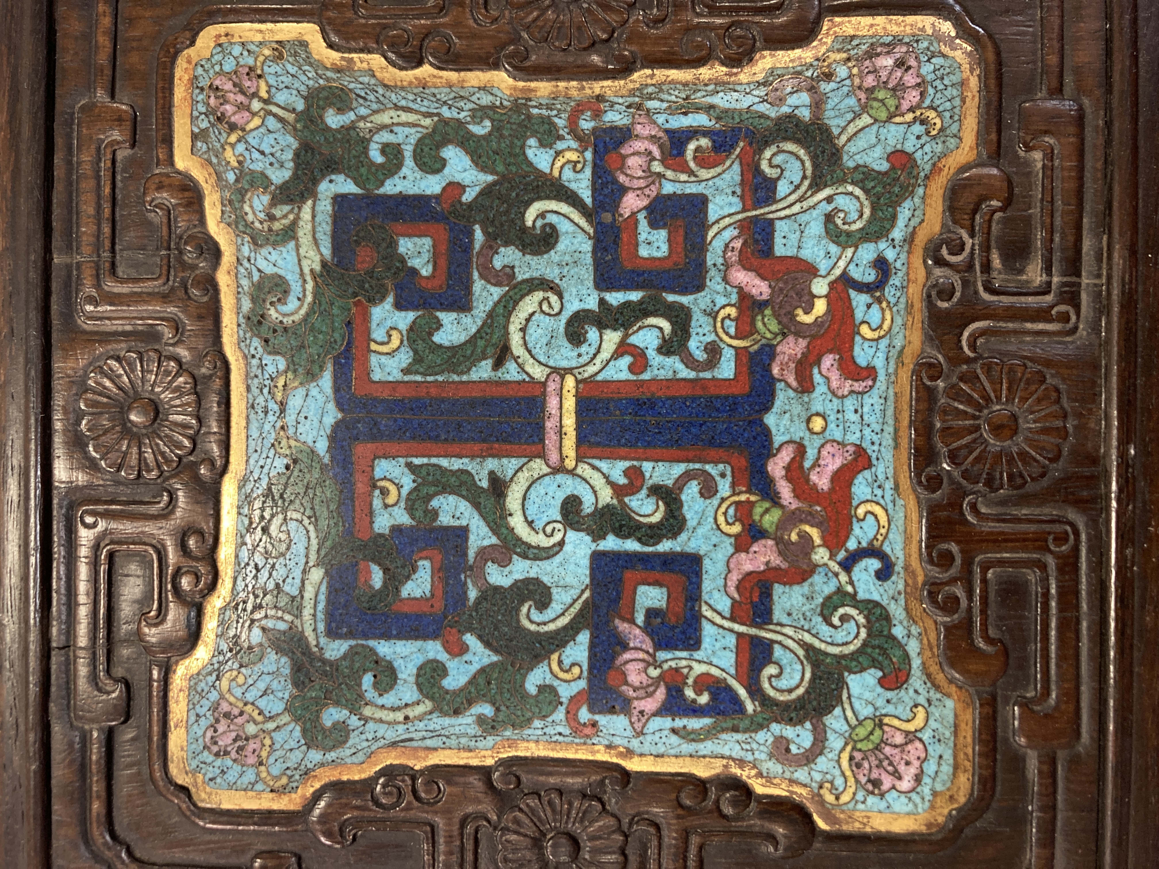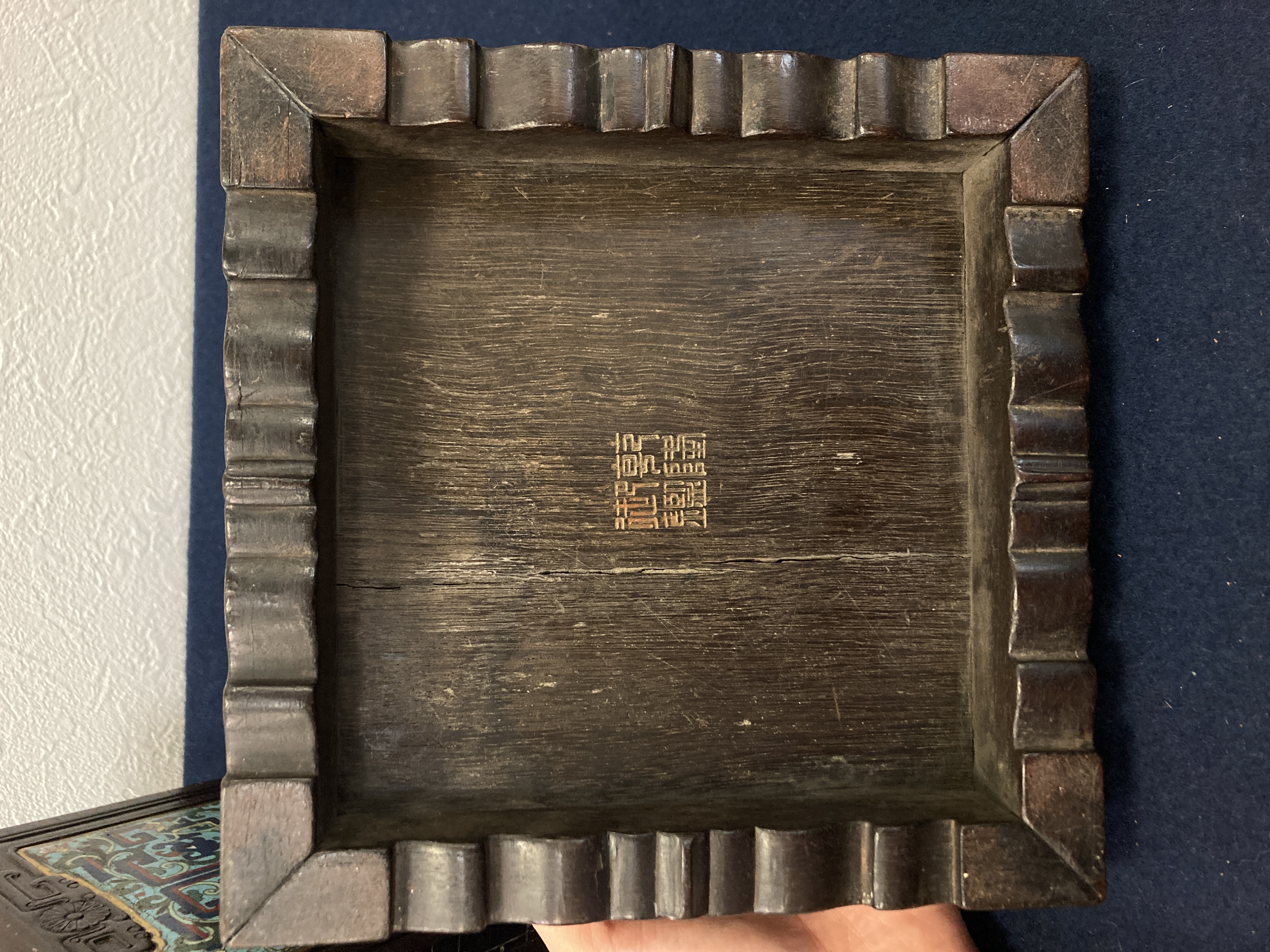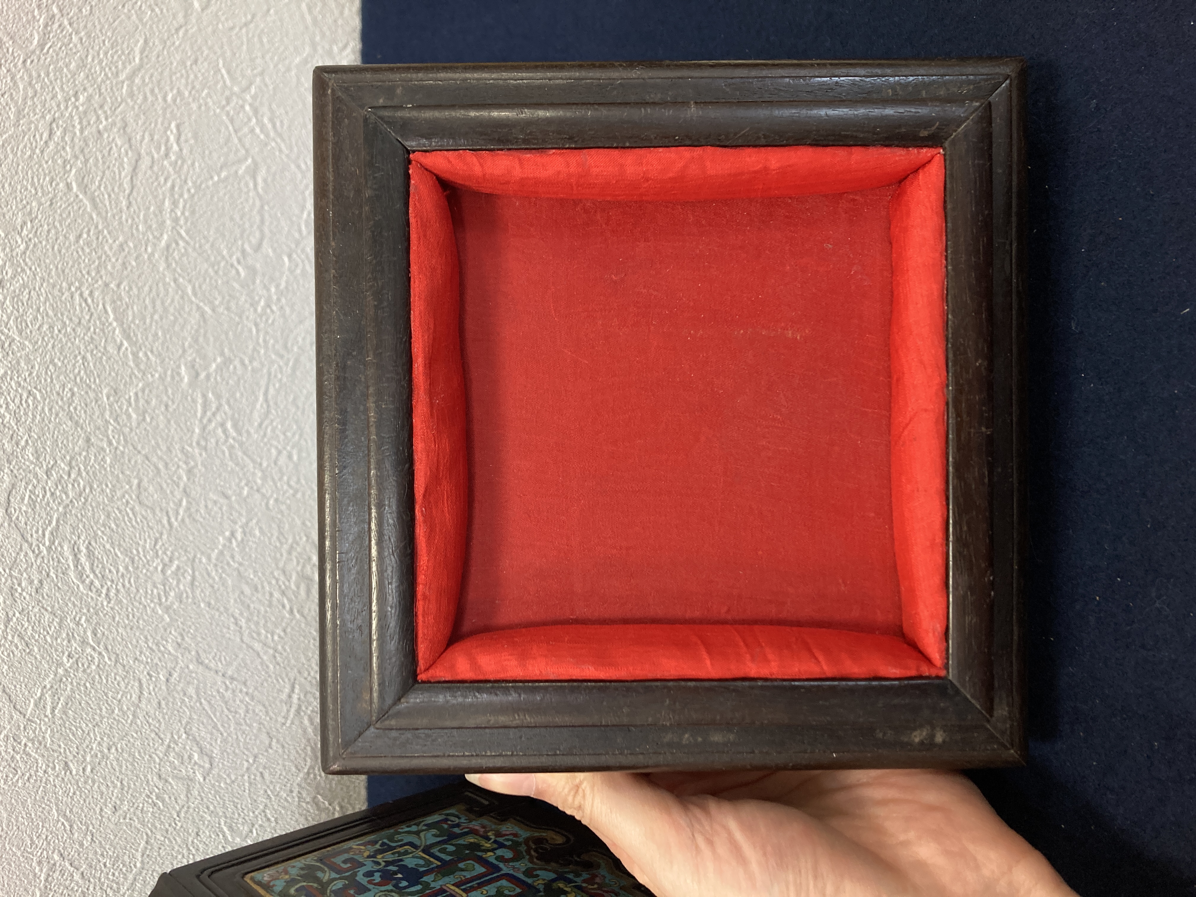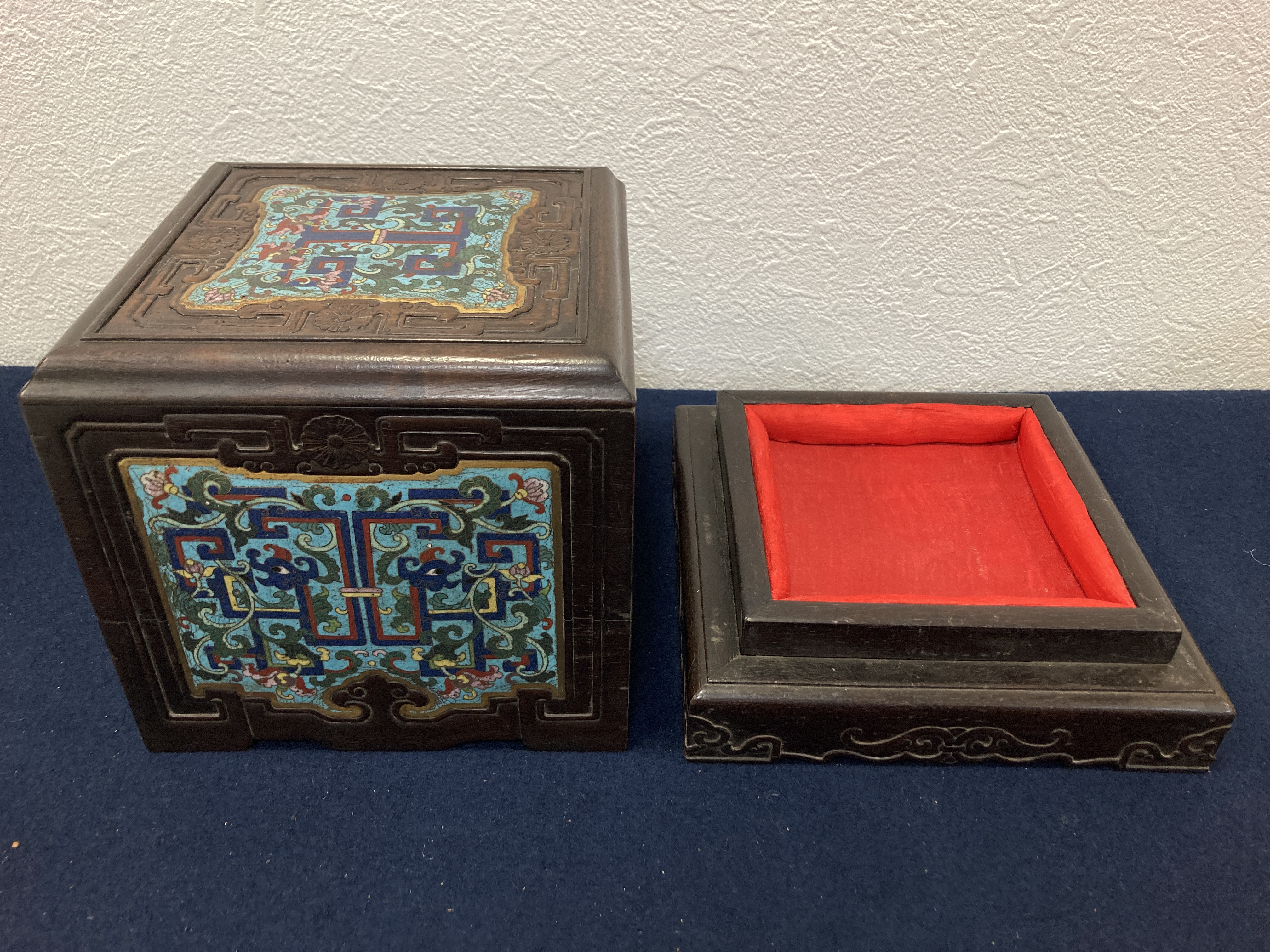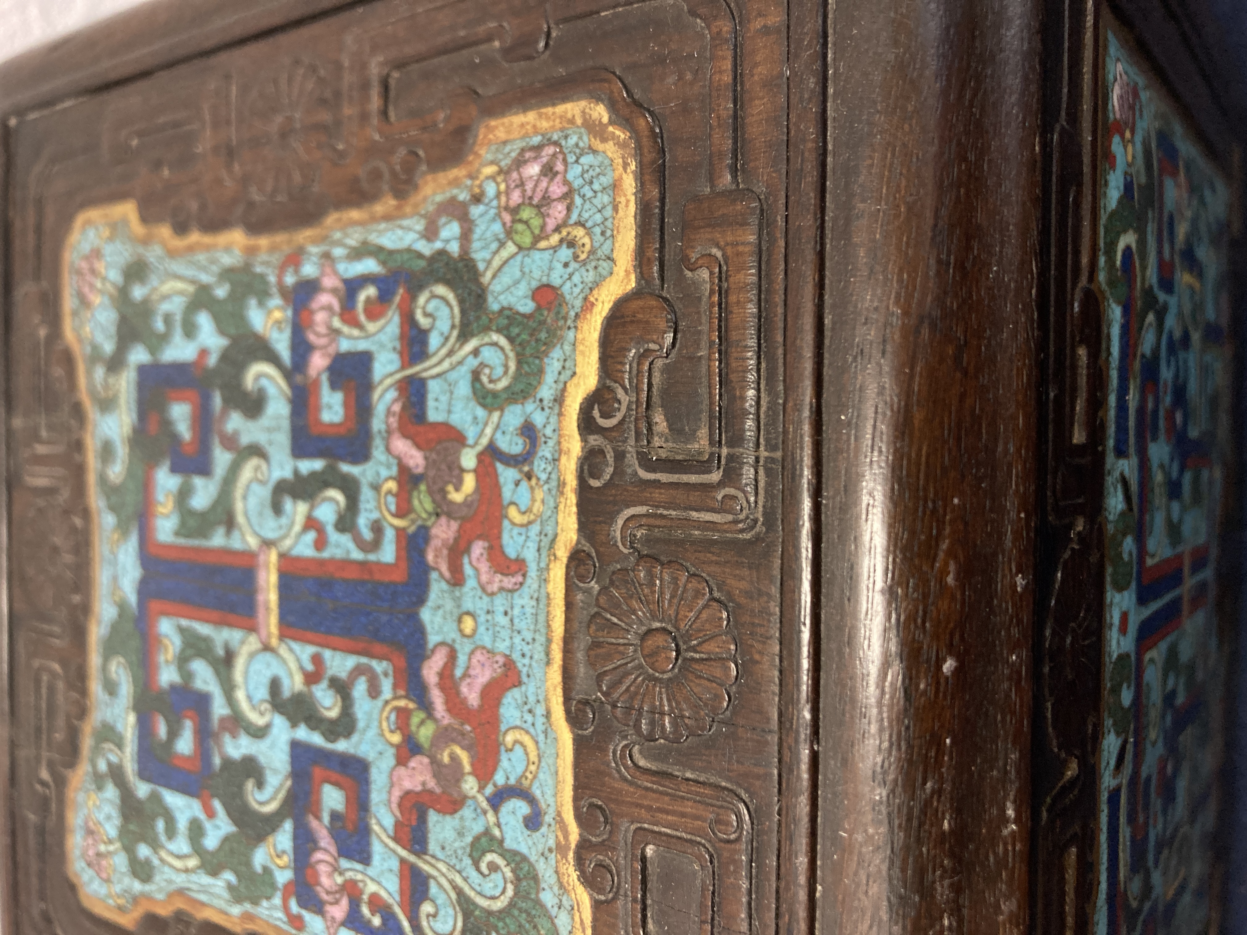 这件掐丝珐琅紫檀盒,应该是一个玺印的扣盒,这件东西从制式上看是沿袭着老制式所做,通过整体的状态、包浆、还有它拐子笼的形式、上边的掐丝珐琅彩的四条釉料,它应该是老的。从照片上分析应该是晚清到民国的东西,并非款识所写的本朝。款识刻得很软,不像本朝那么劲道,馆阁体书写得没那么的精炼。盒的料从木质上看,棕眼的细腻程度应该是紫檀的,没问题,看着像老的。珐琅彩掐丝,从丝条添彩的状态看,符合晚清到民国这个时间百年的这种历史特点,综合来看应该是晚清到民国的珍品,不错,可藏。 另外要看看有没有修补,尤其是这个紫檀的木块,如果是满撤,那是非常不错,要有修补就递减价值了。