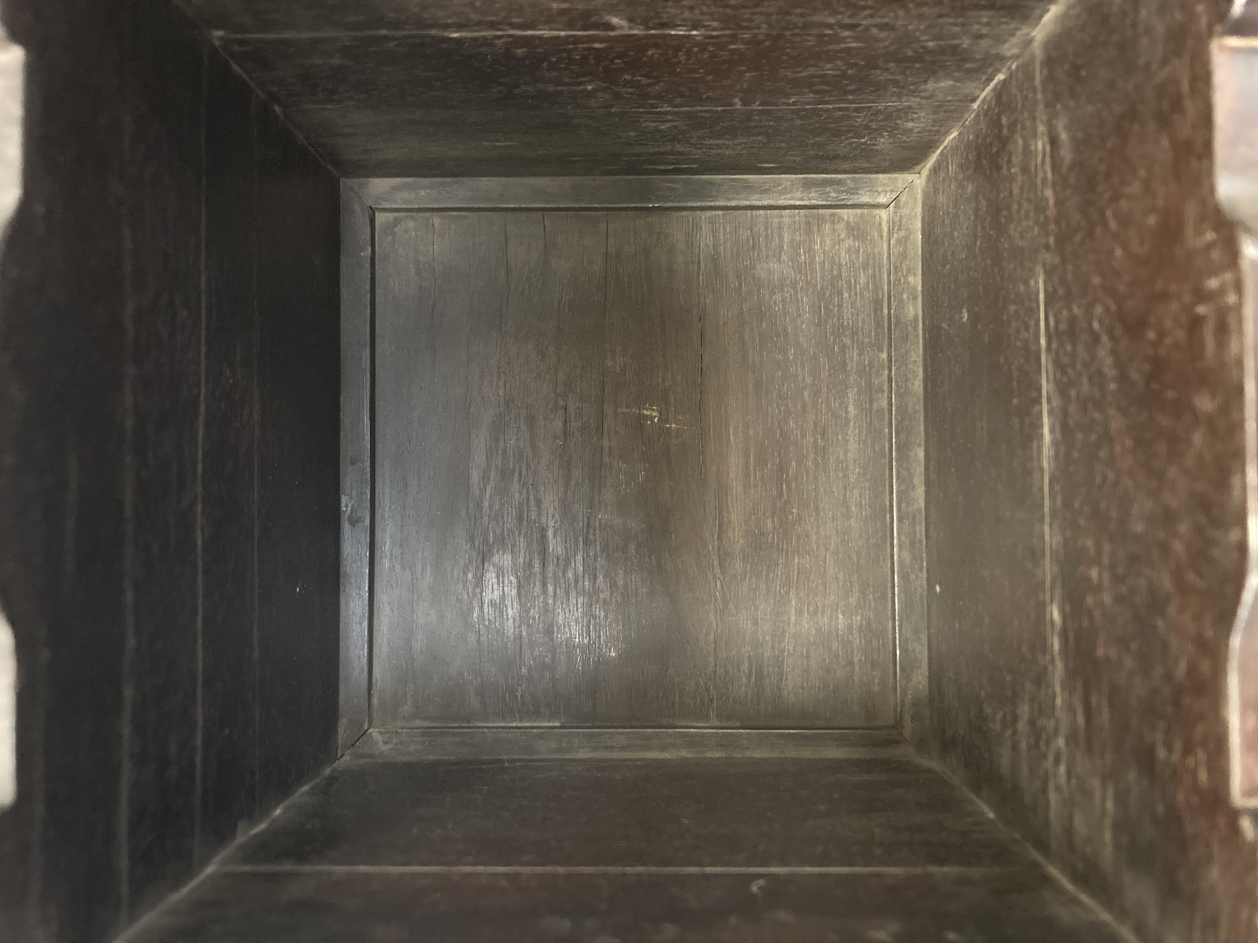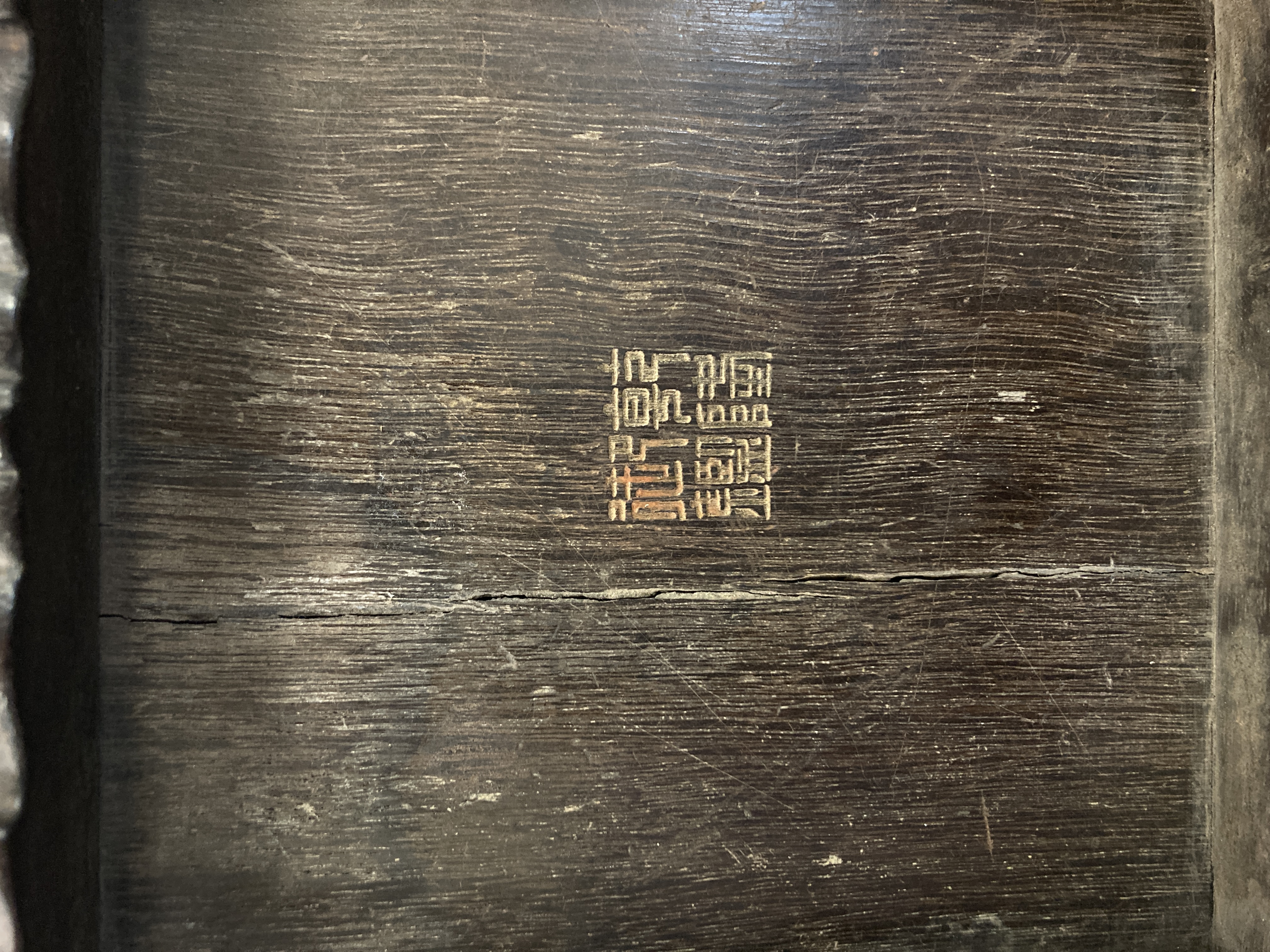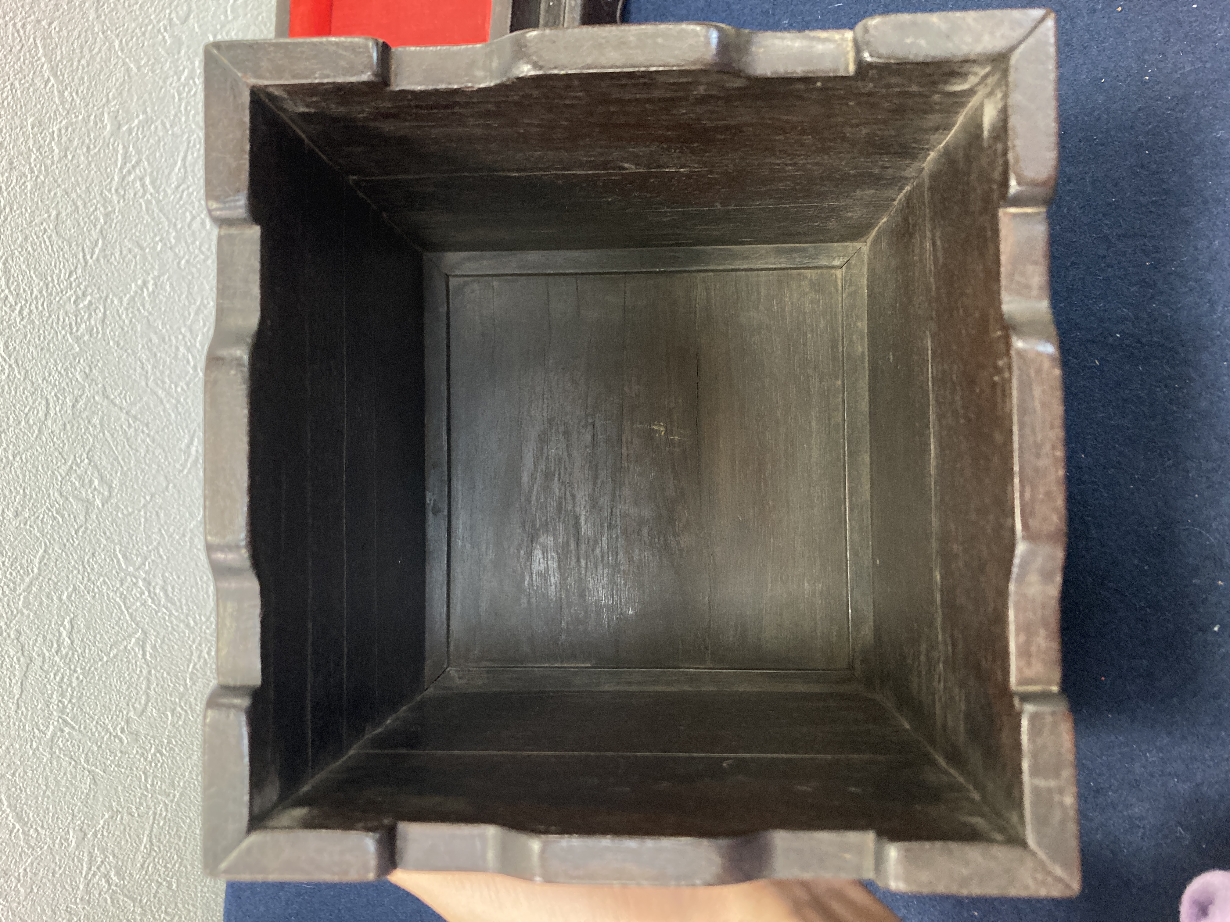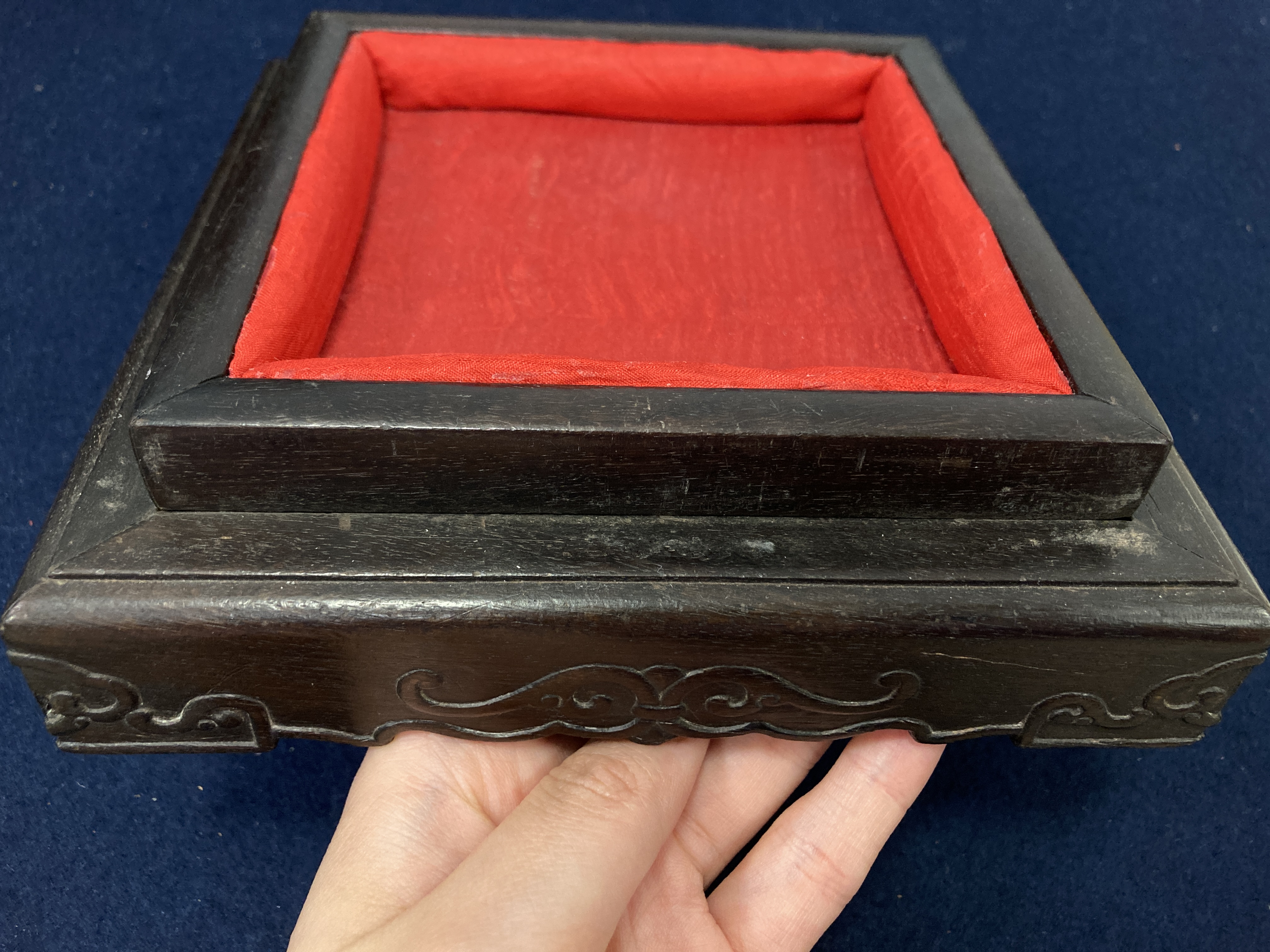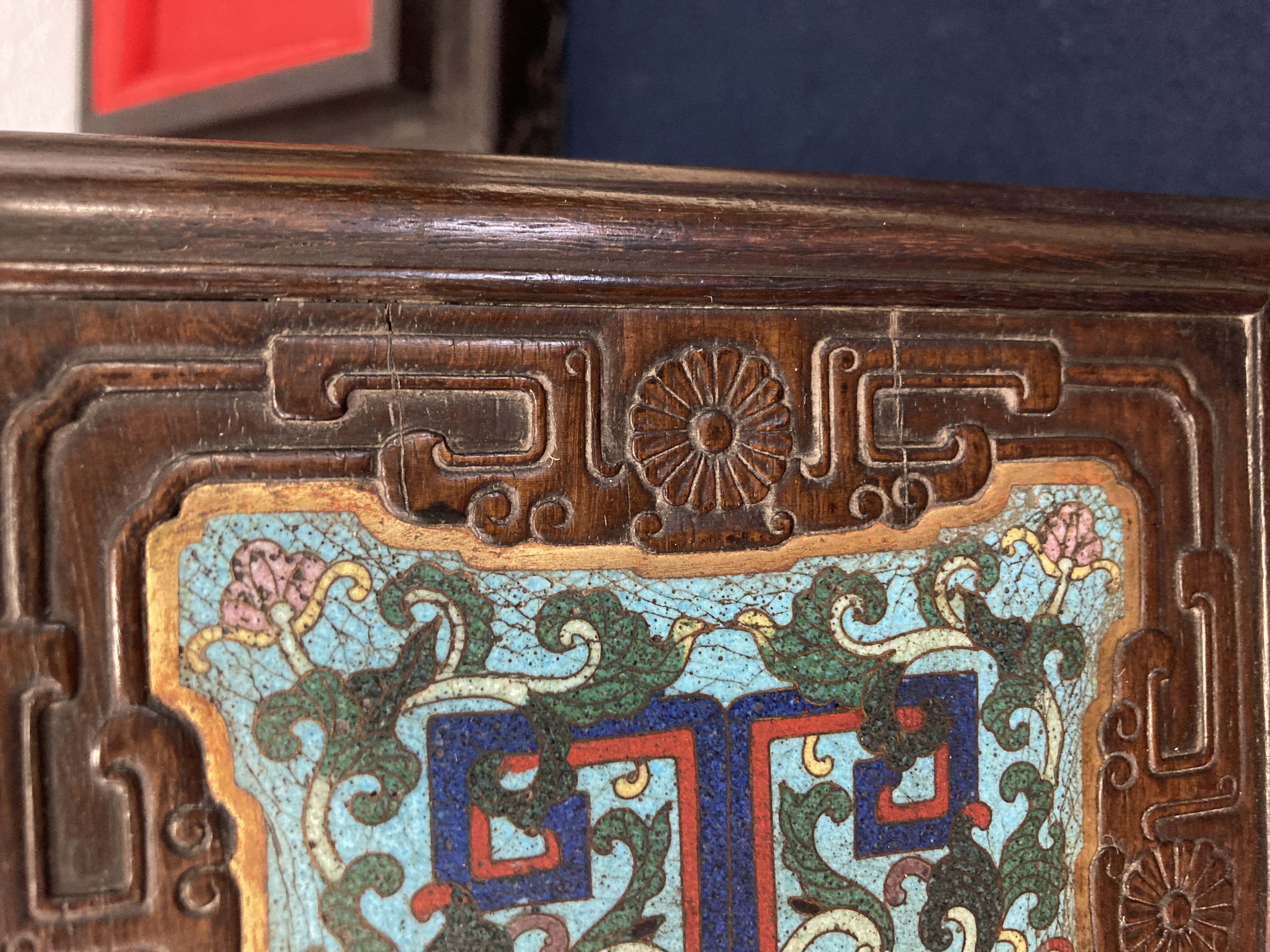 这件掐丝珐琅紫檀盒,应该是一个玺印的扣盒,这件东西从制式上看是沿袭着老制式所做,通过整体的状态、包浆、还有它拐子笼的形式、上边的掐丝珐琅彩的四条釉料,它应该是老的。从照片上分析应该是晚清到民国的东西,并非款识所写的本朝。款识刻得很软,不像本朝那么劲道,馆阁体书写得没那么的精炼。盒的料从木质上看,棕眼的细腻程度应该是紫檀的,没问题,看着像老的。珐琅彩掐丝,从丝条添彩的状态看,符合晚清到民国这个时间百年的这种历史特点,综合来看应该是晚清到民国的珍品,不错,可藏。 另外要看看有没有修补,尤其是这个紫檀的木块,如果是满撤,那是非常不错,要有修补就递减价值了。