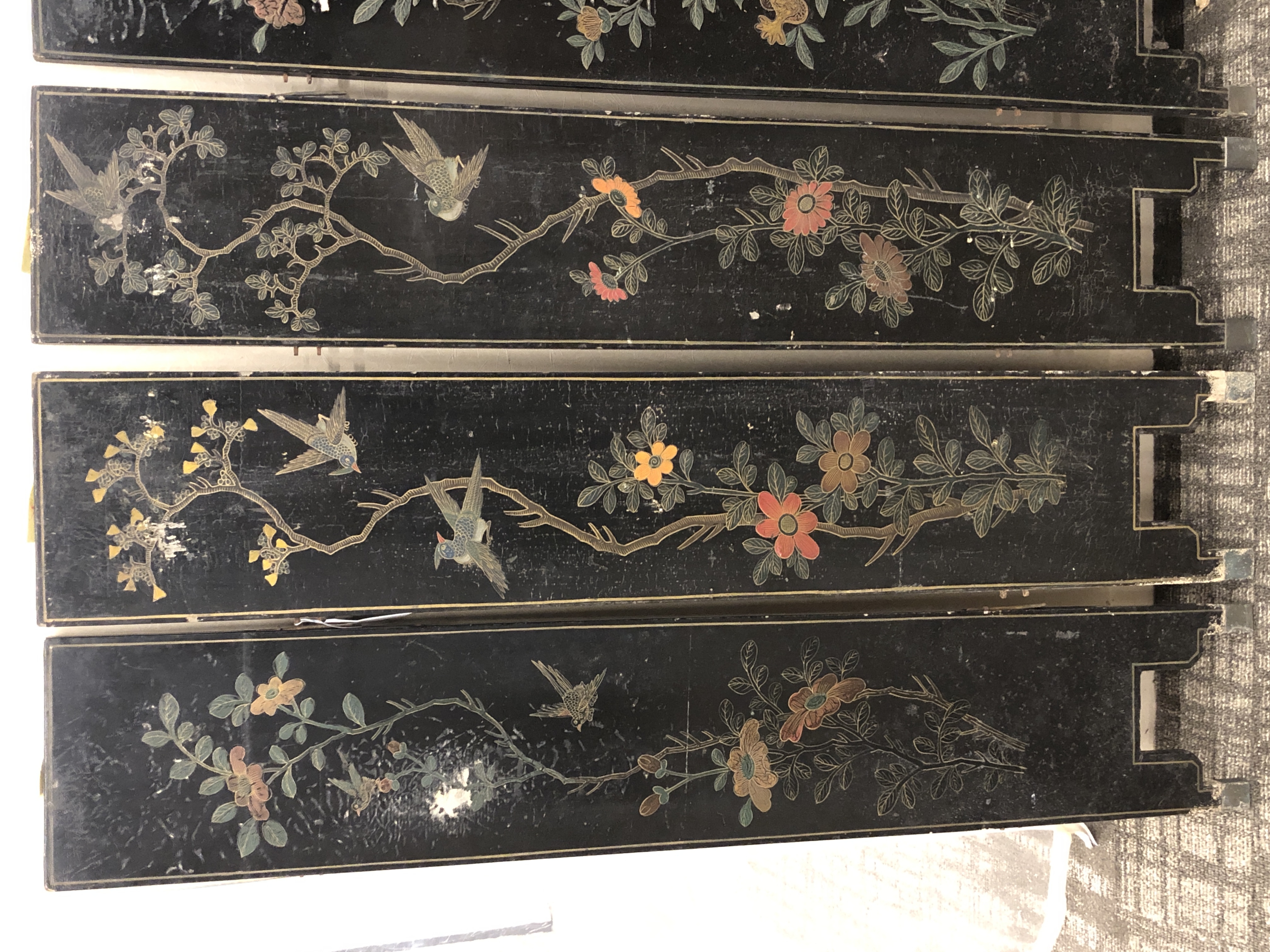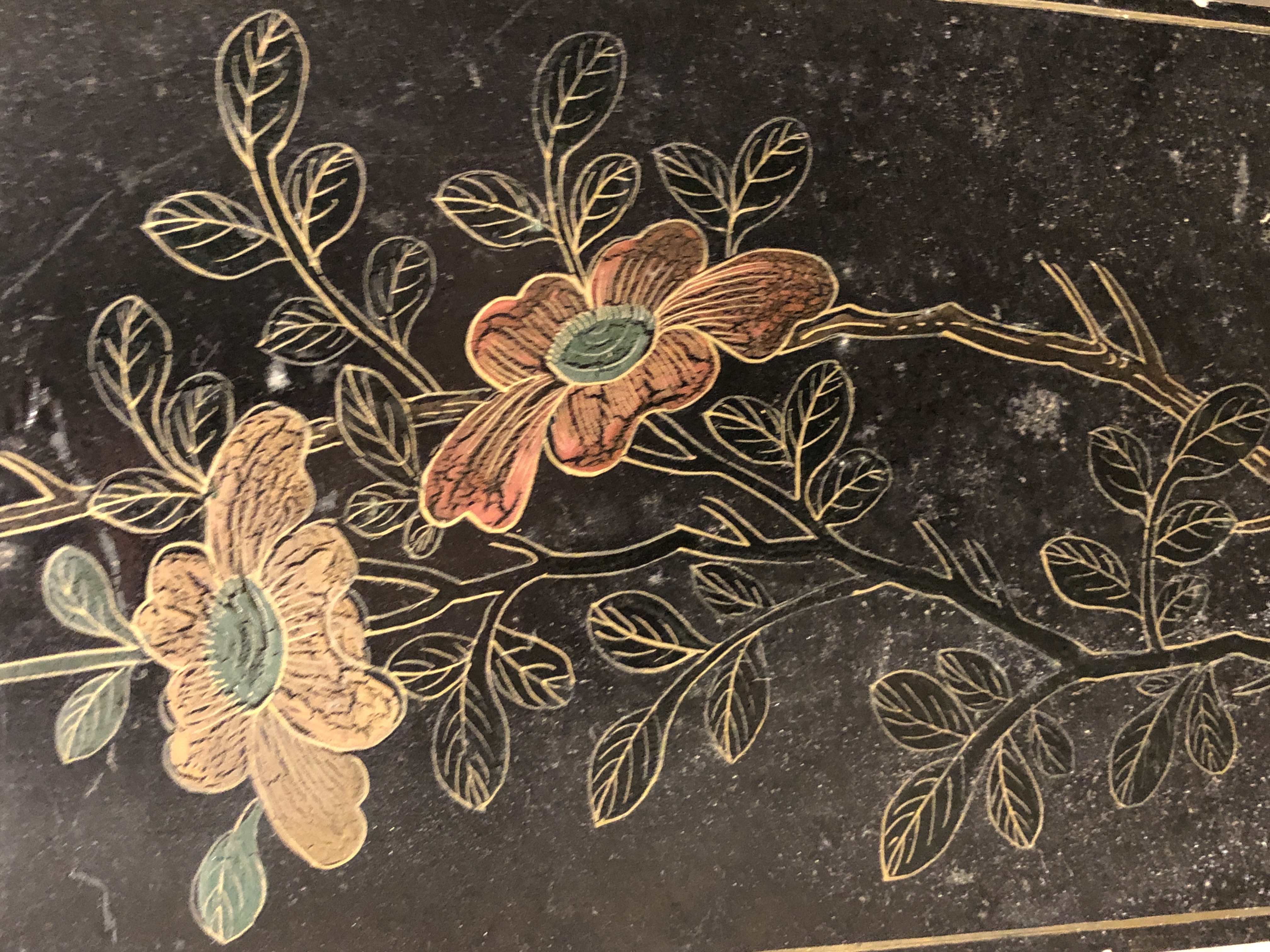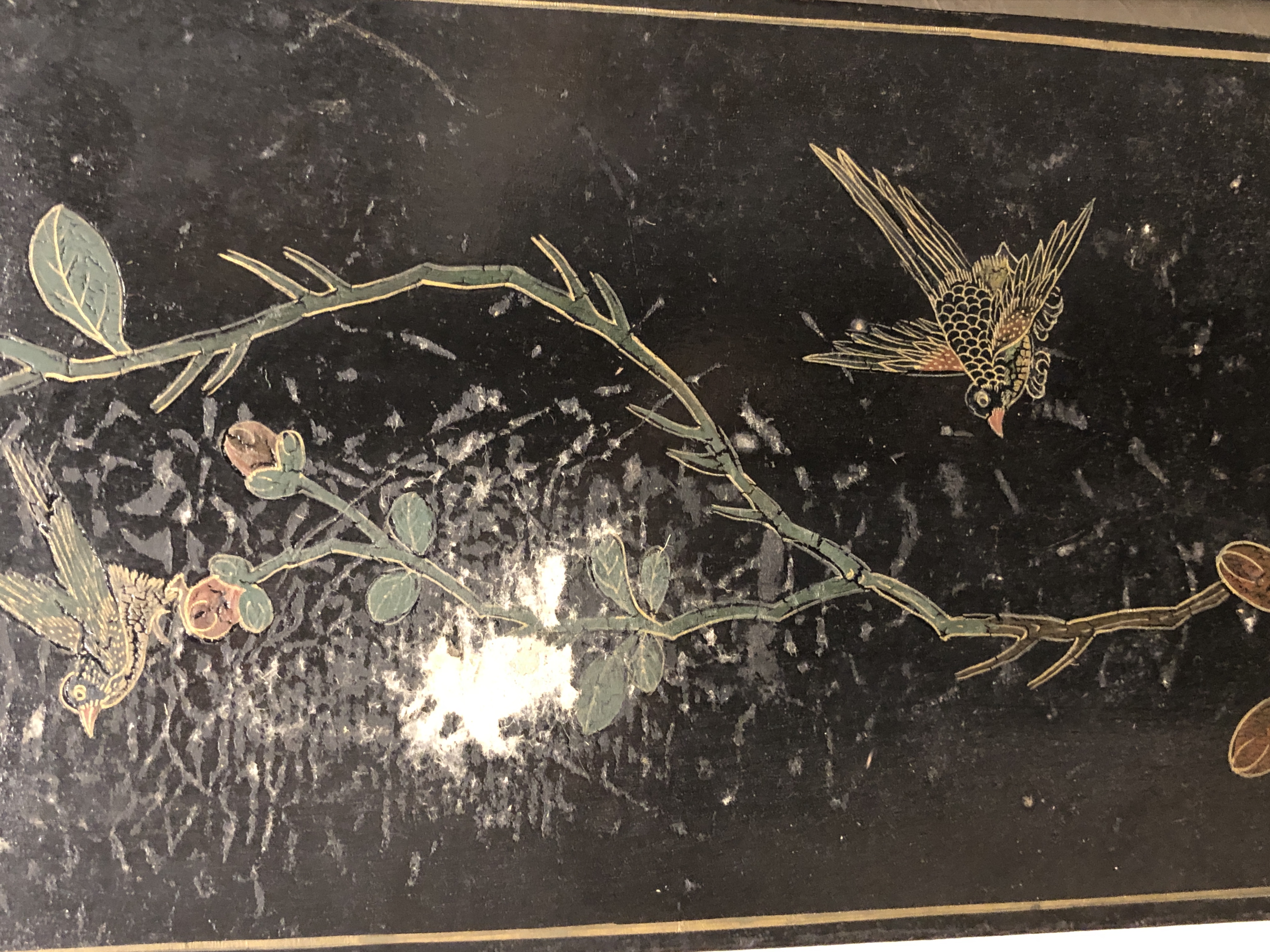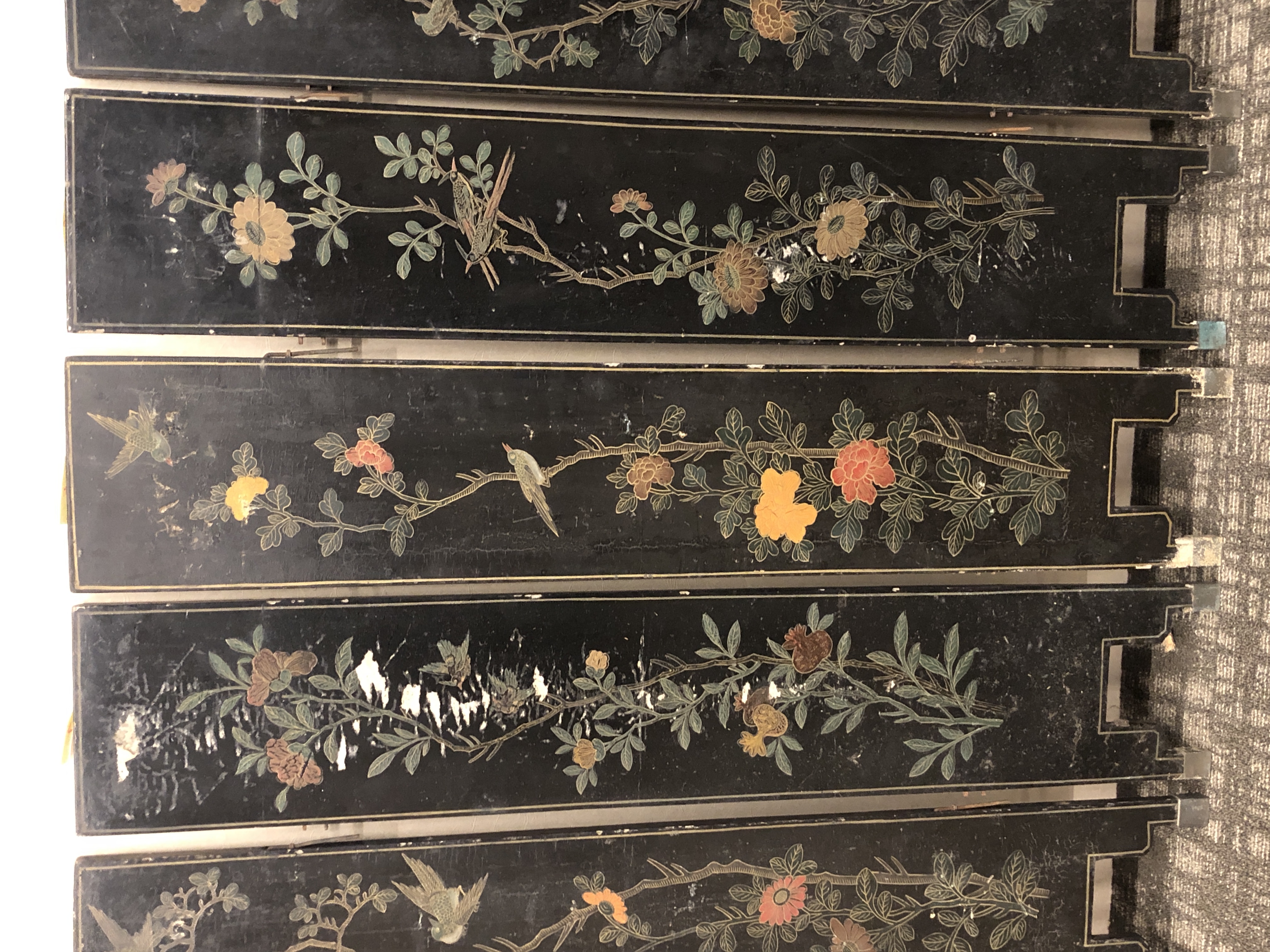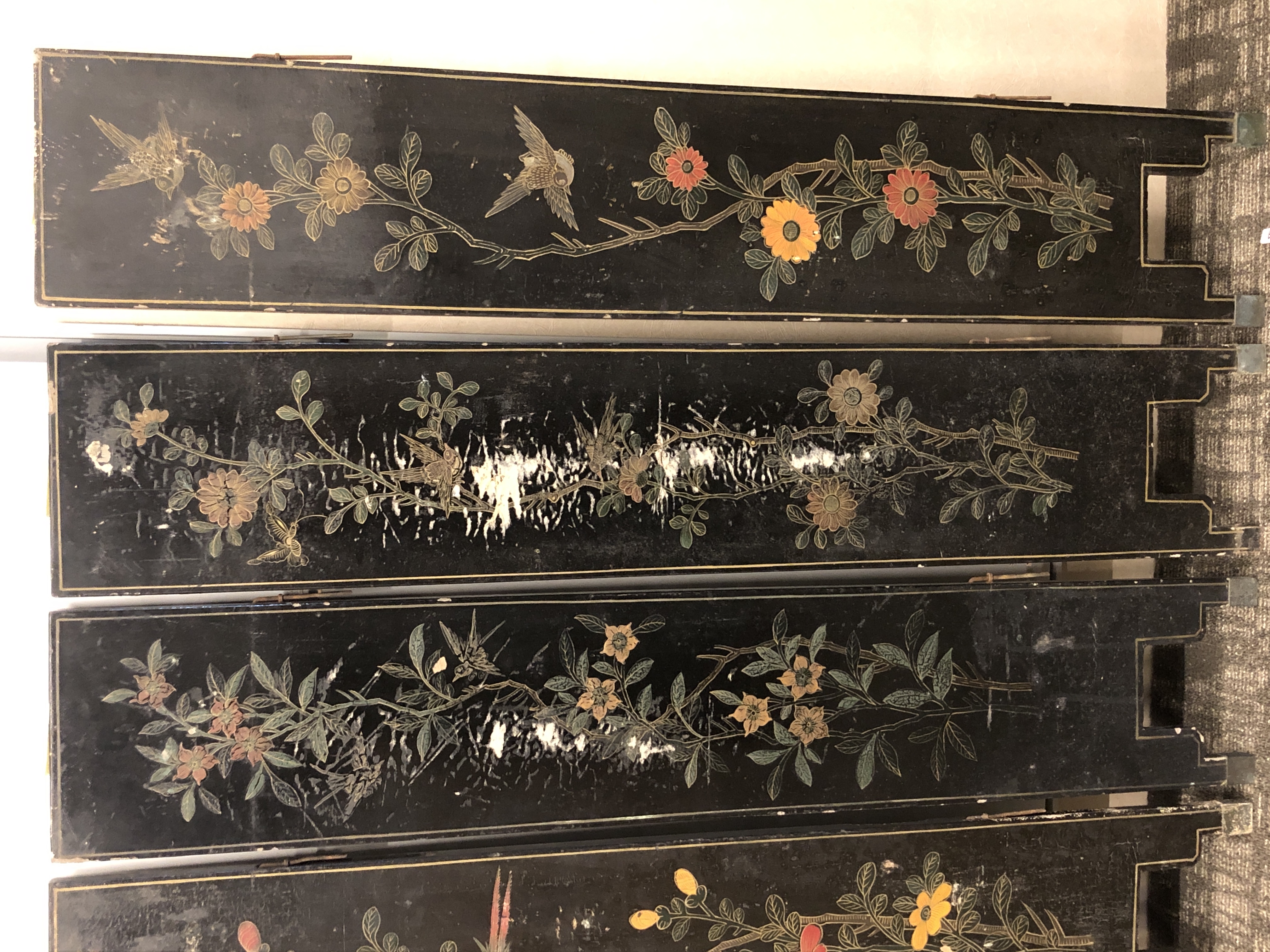 清代大漆彩绘描金十二扇桌瓶,屏风底漆为黑色打底用运彩绘花卉,金漆套边的画法,展现出各种花卉争奇斗艳的形态,画法娴熟,笔画流畅,颜色鲜艳夺目,两边框镶嵌彩贝,桌屏为晚清作品,可惜有些部位脱彩严重,从而影响了整个作品的品相,尽图片看这件作品还是有一定的观赏和收藏价值,