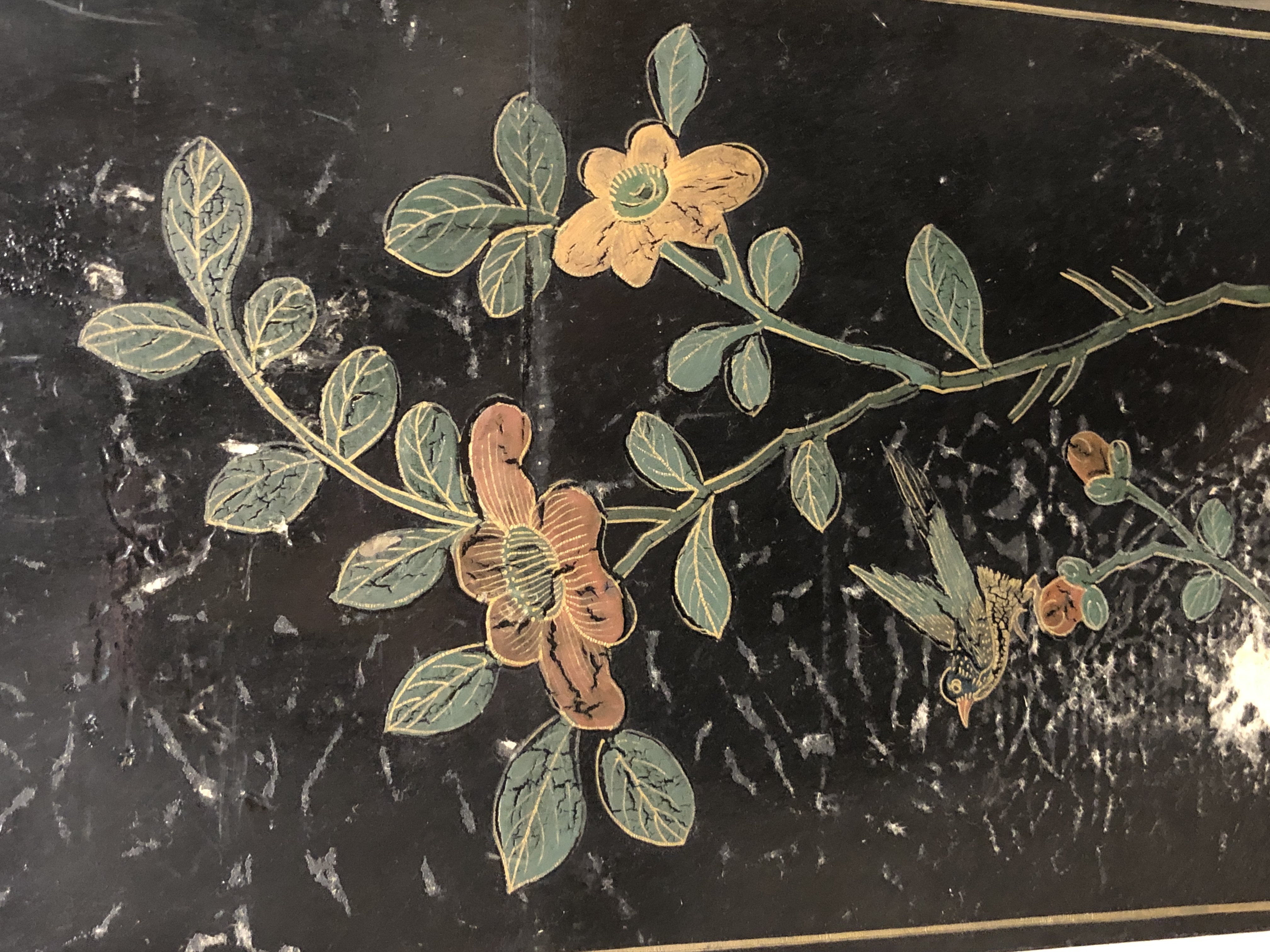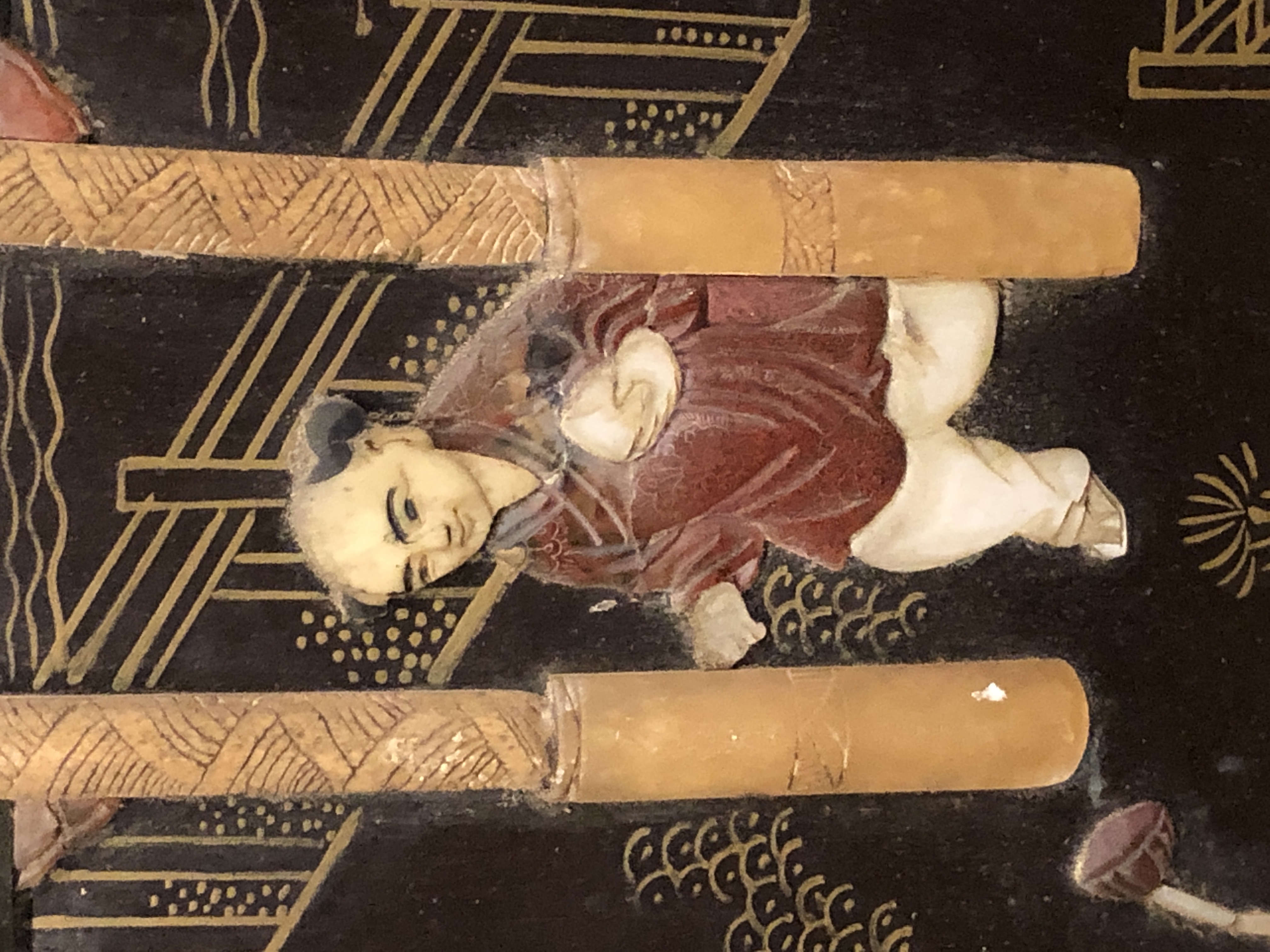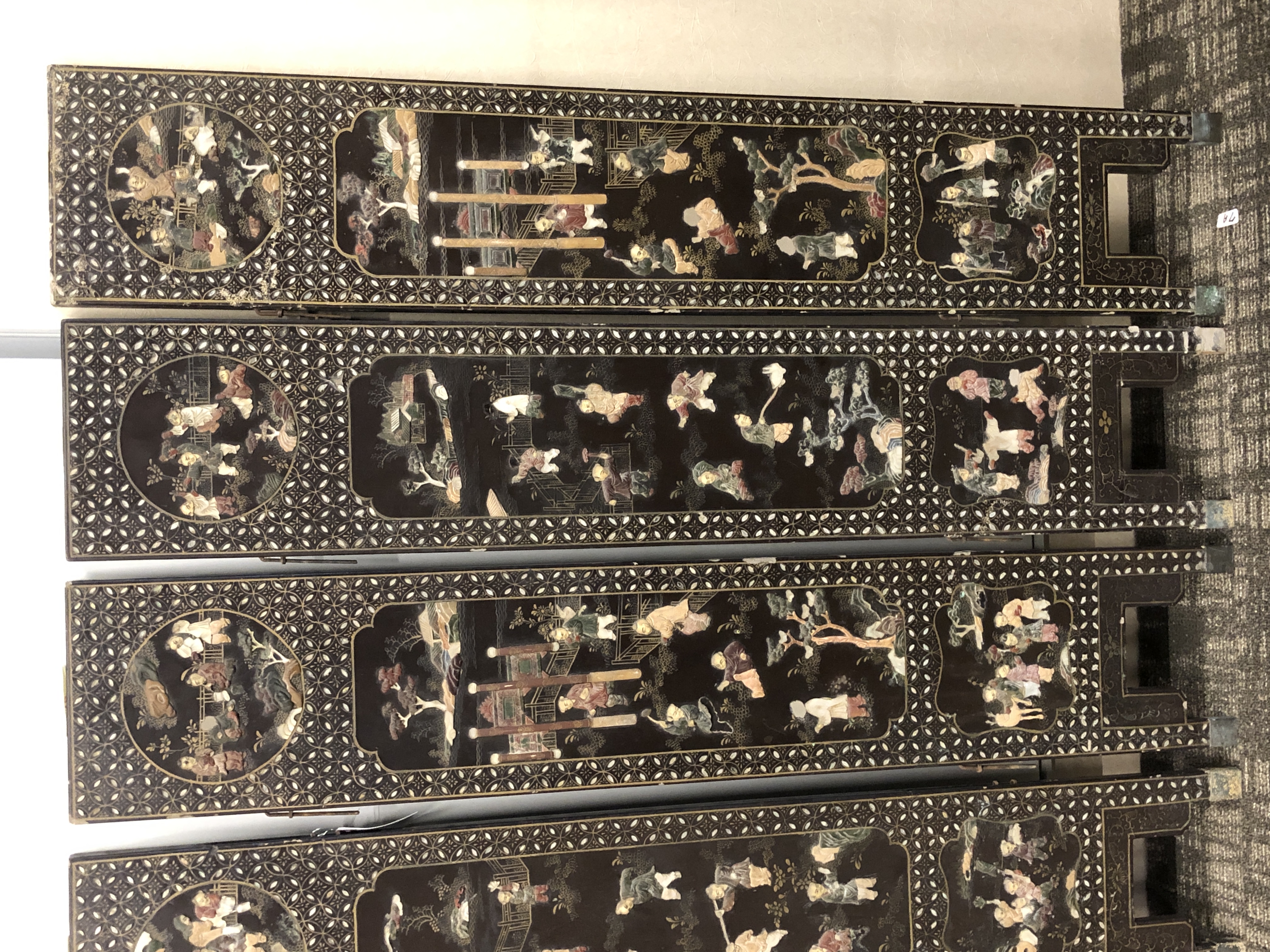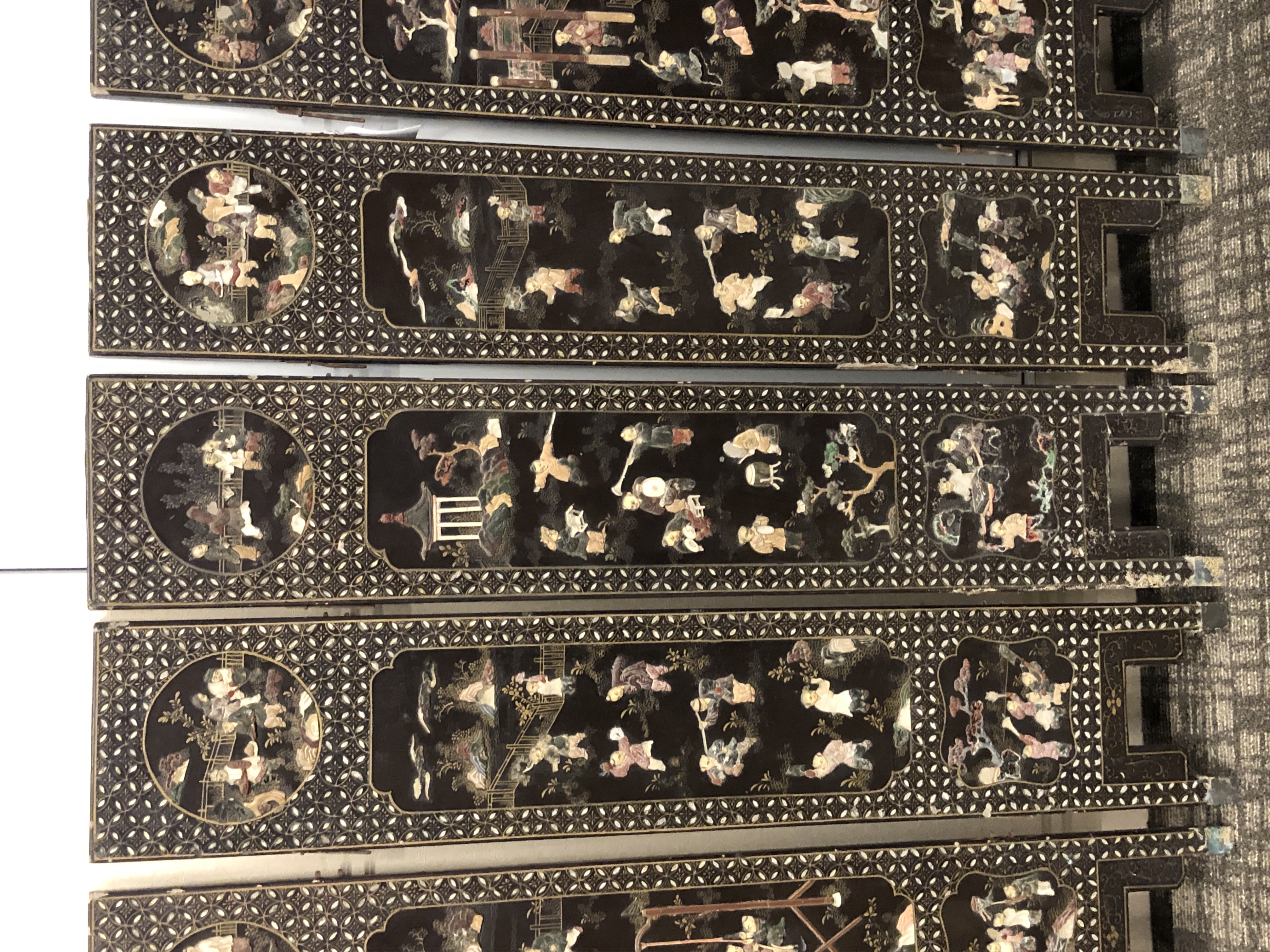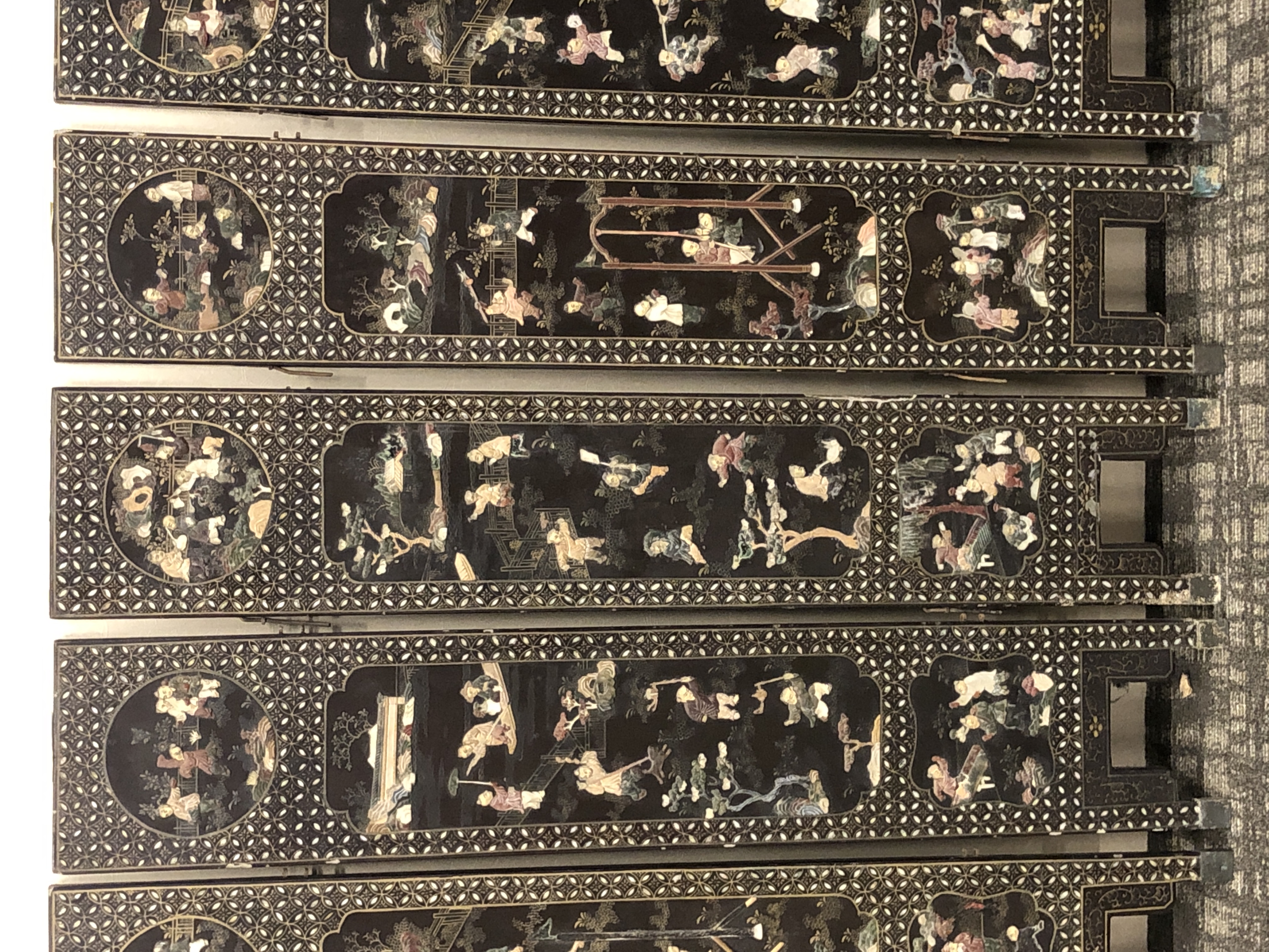 清代大漆彩绘描金十二扇桌瓶,屏风底漆为黑色打底用运彩绘花卉,金漆套边的画法,展现出各种花卉争奇斗艳的形态,画法娴熟,笔画流畅,颜色鲜艳夺目,两边框镶嵌彩贝,桌屏为晚清作品,可惜有些部位脱彩严重,从而影响了整个作品的品相,尽图片看这件作品还是有一定的观赏和收藏价值,