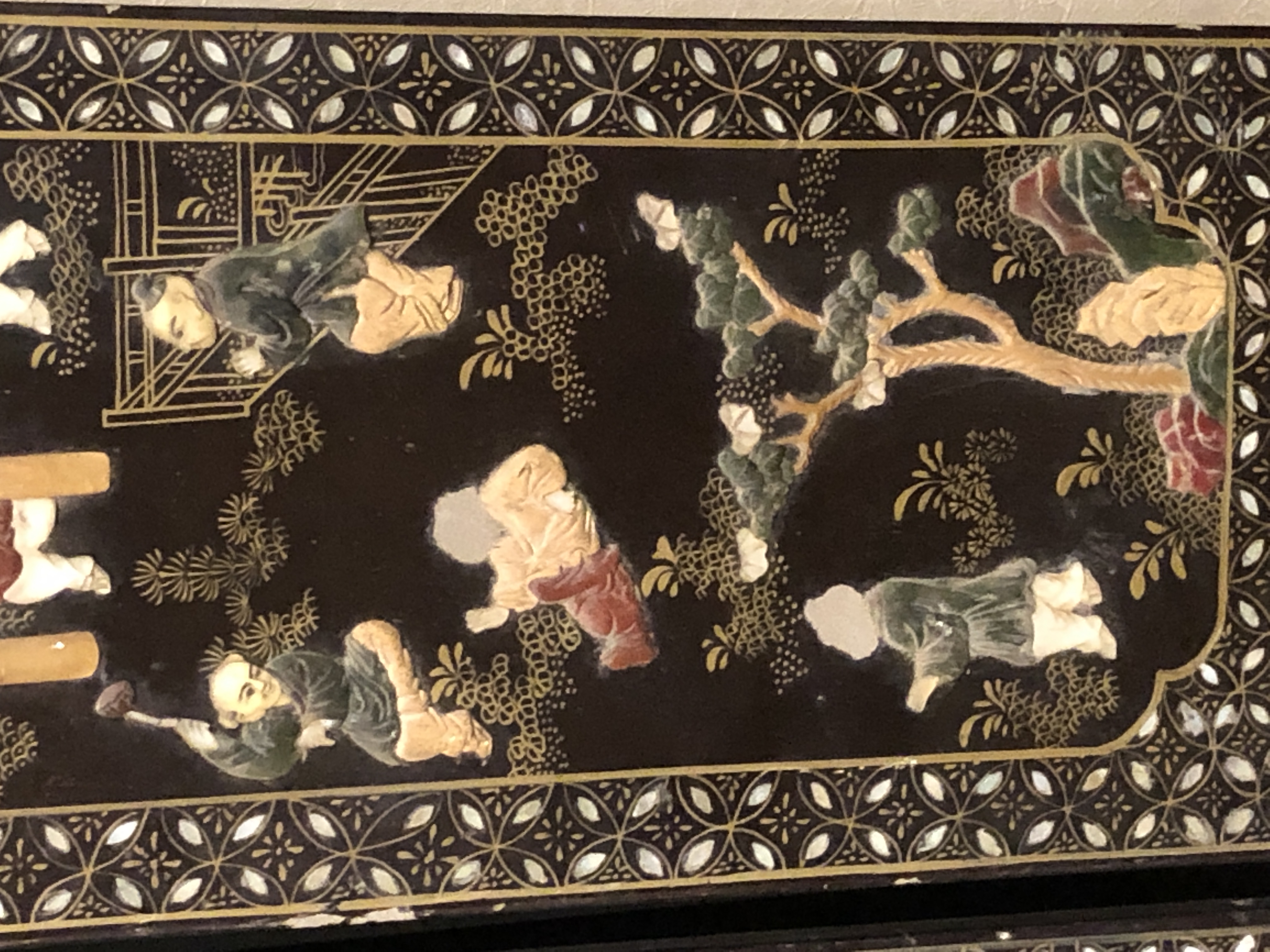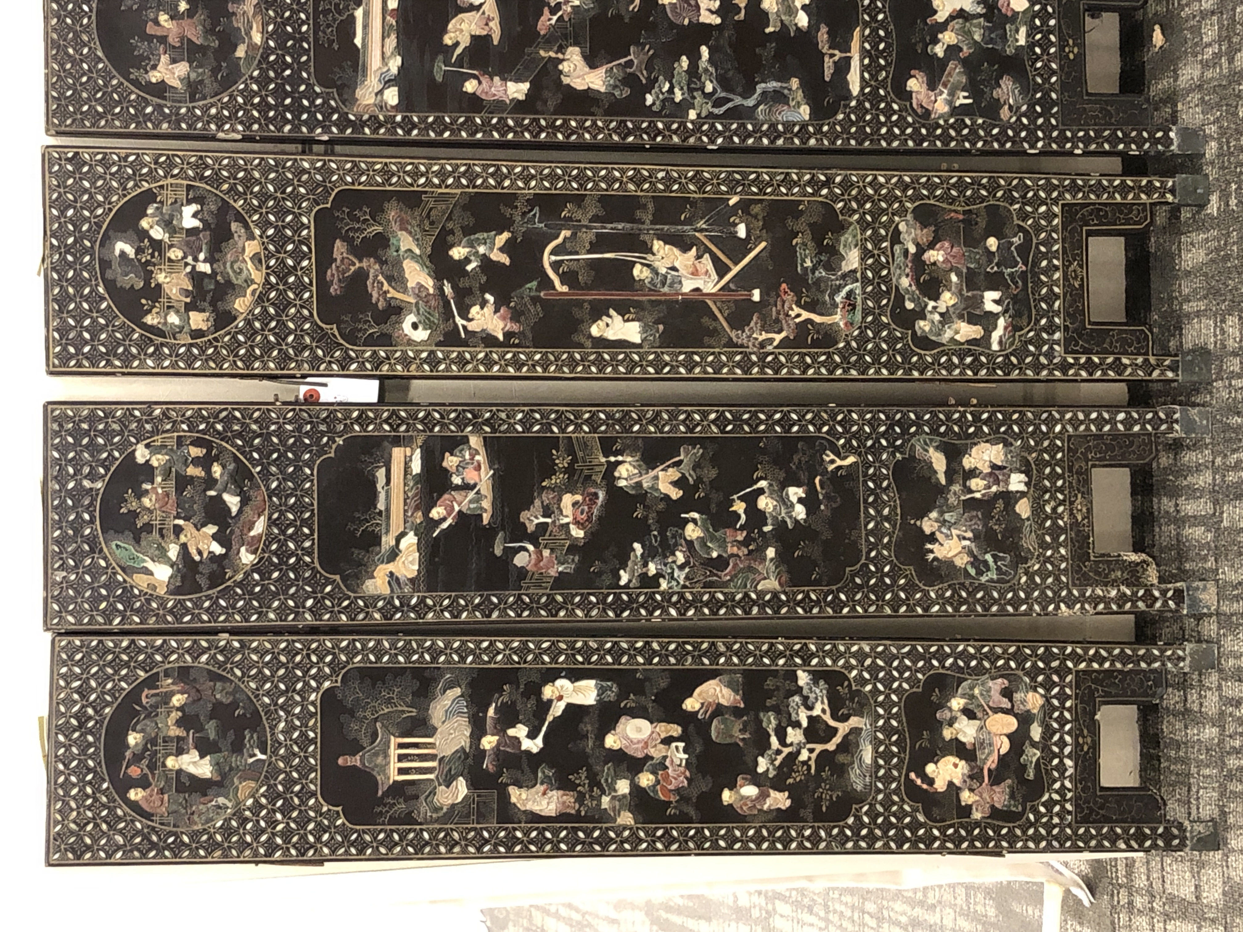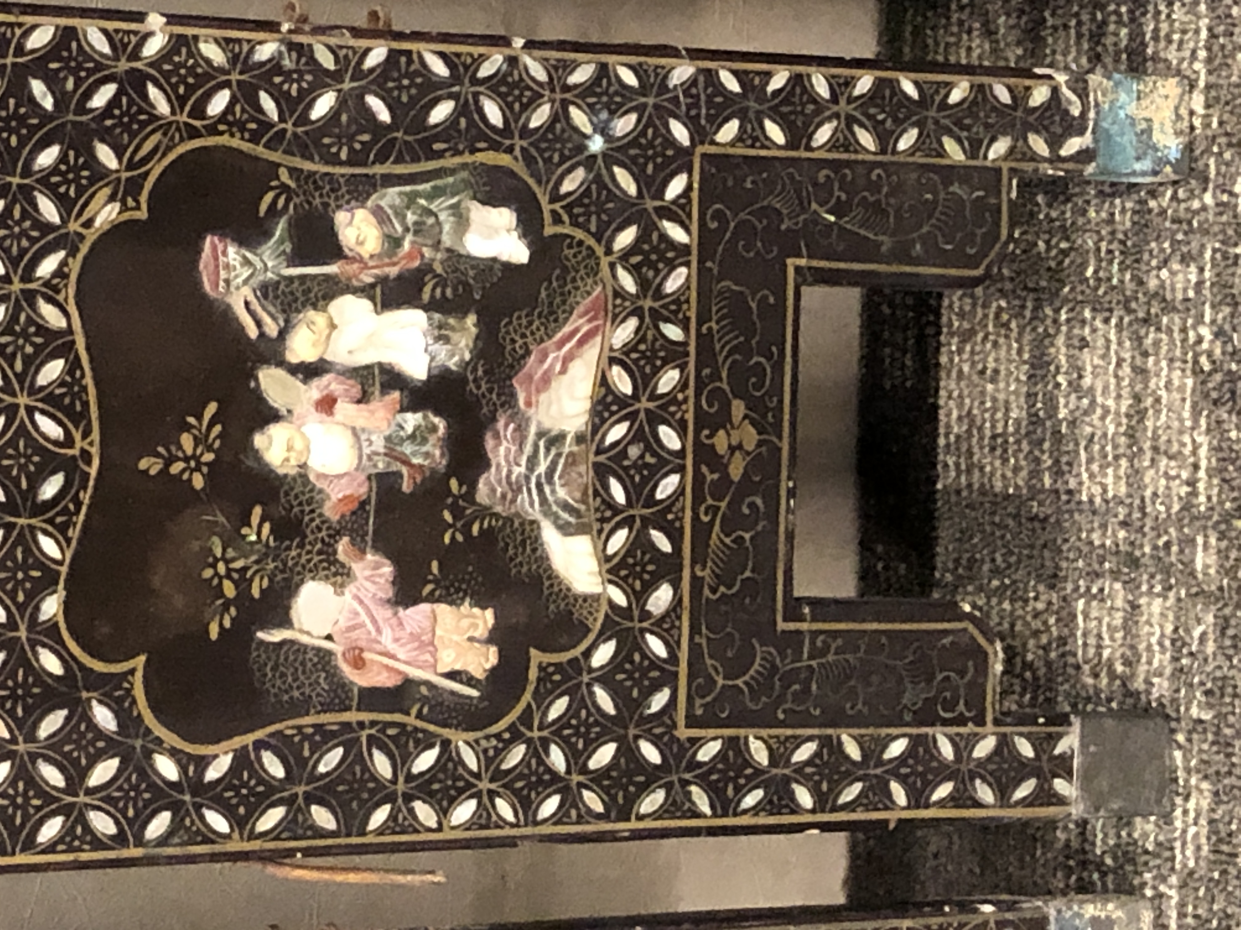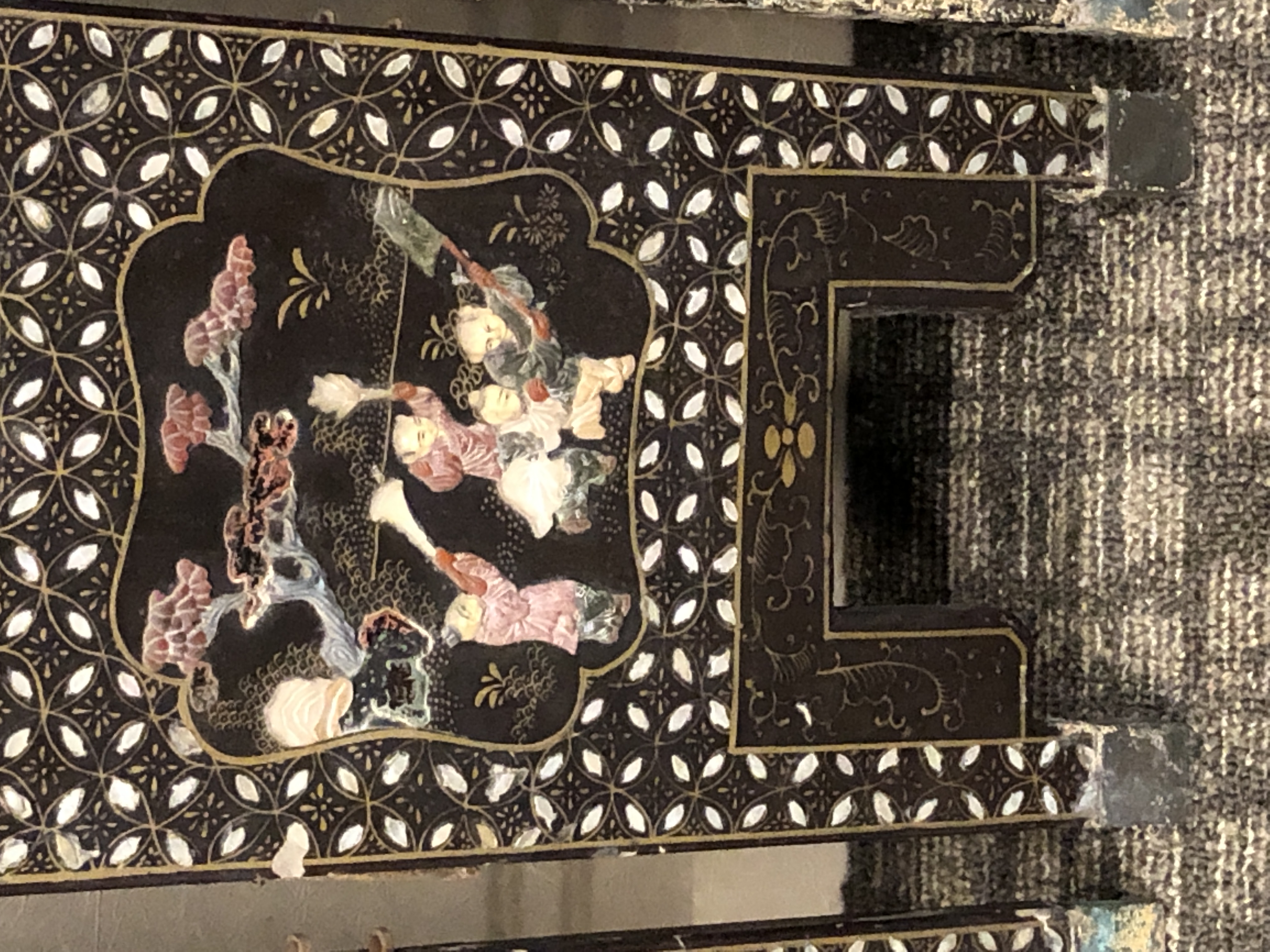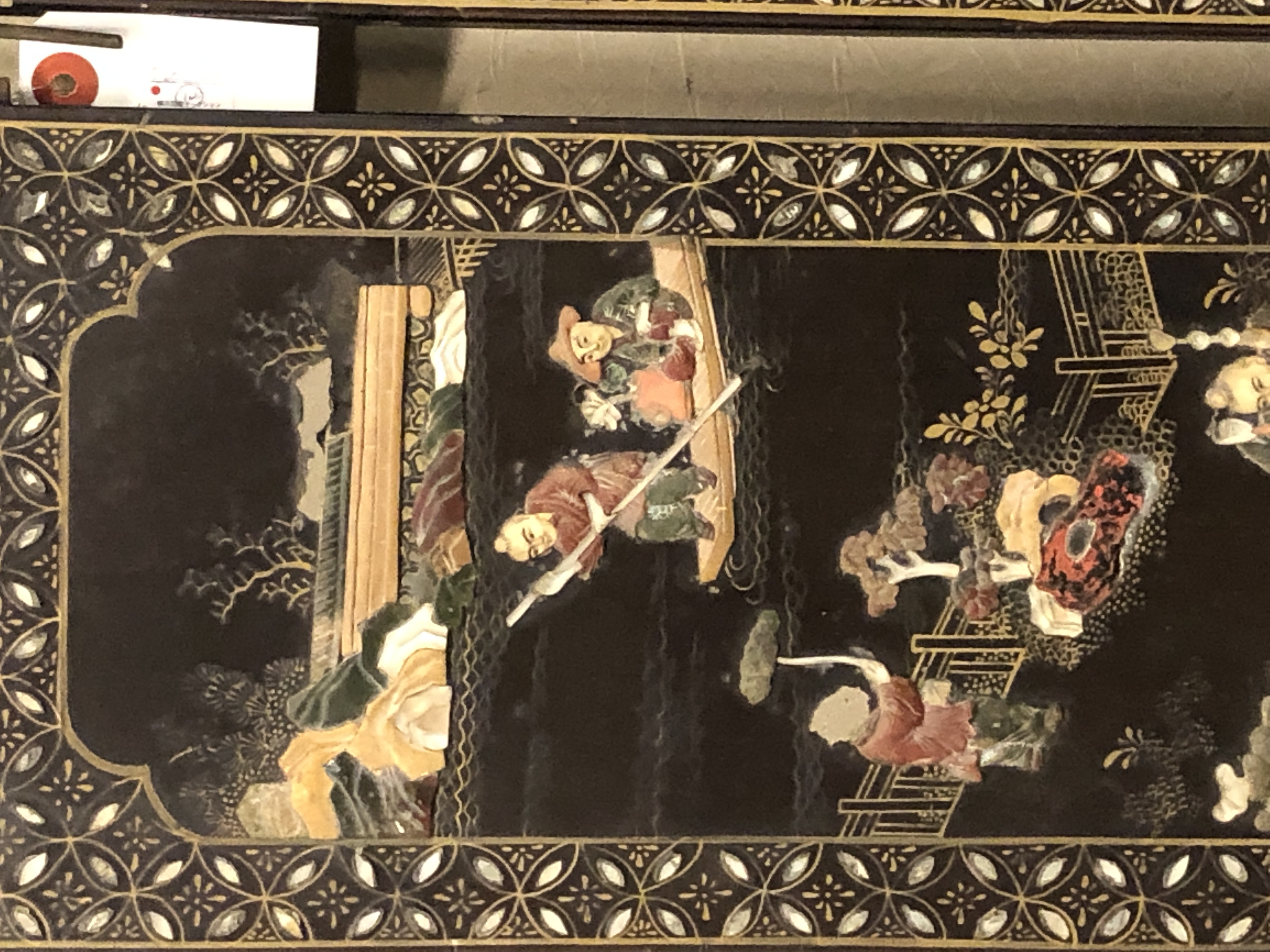 清代大漆彩绘描金十二扇桌瓶,屏风底漆为黑色打底用运彩绘花卉,金漆套边的画法,展现出各种花卉争奇斗艳的形态,画法娴熟,笔画流畅,颜色鲜艳夺目,两边框镶嵌彩贝,桌屏为晚清作品,可惜有些部位脱彩严重,从而影响了整个作品的品相,尽图片看这件作品还是有一定的观赏和收藏价值,