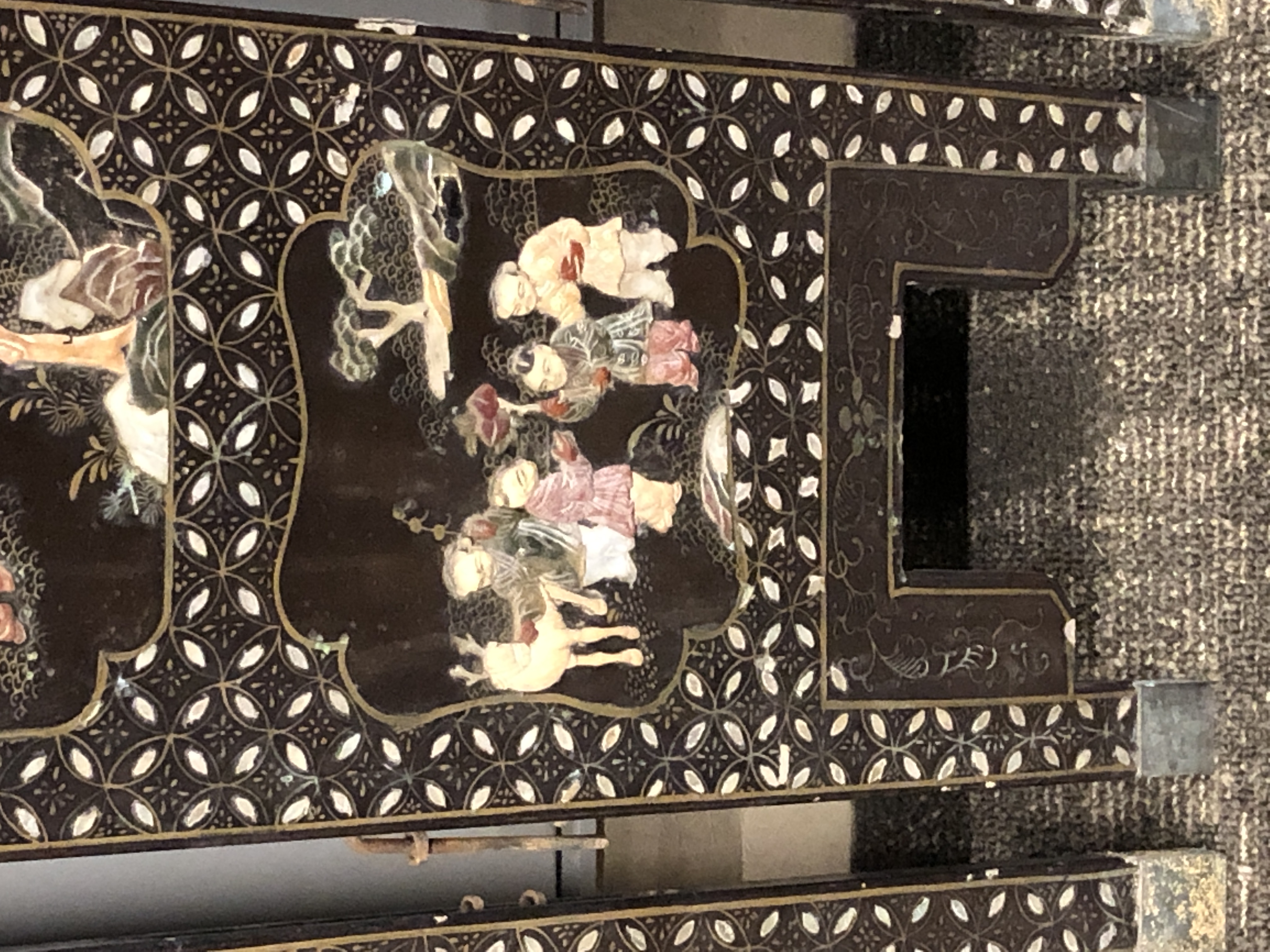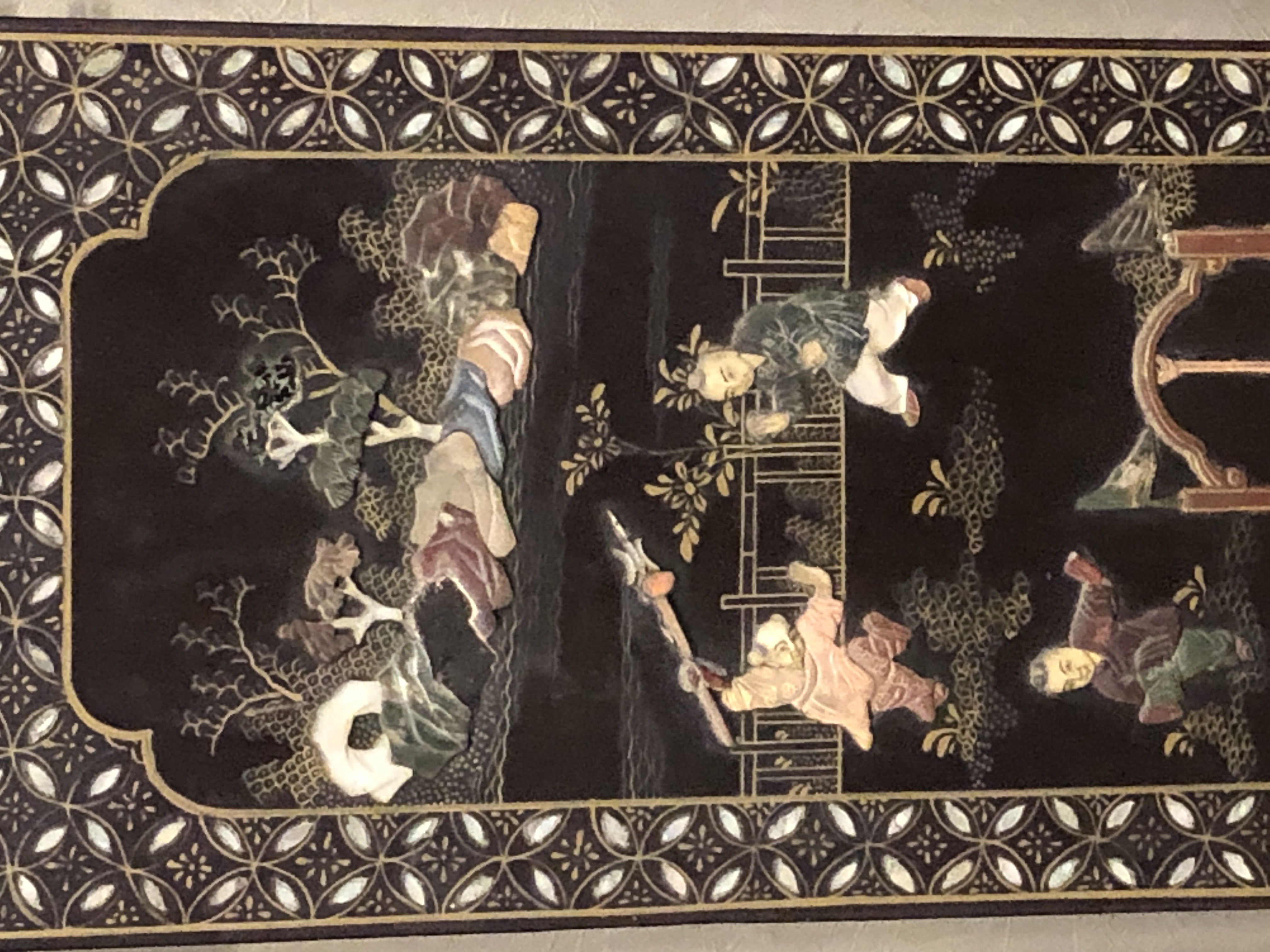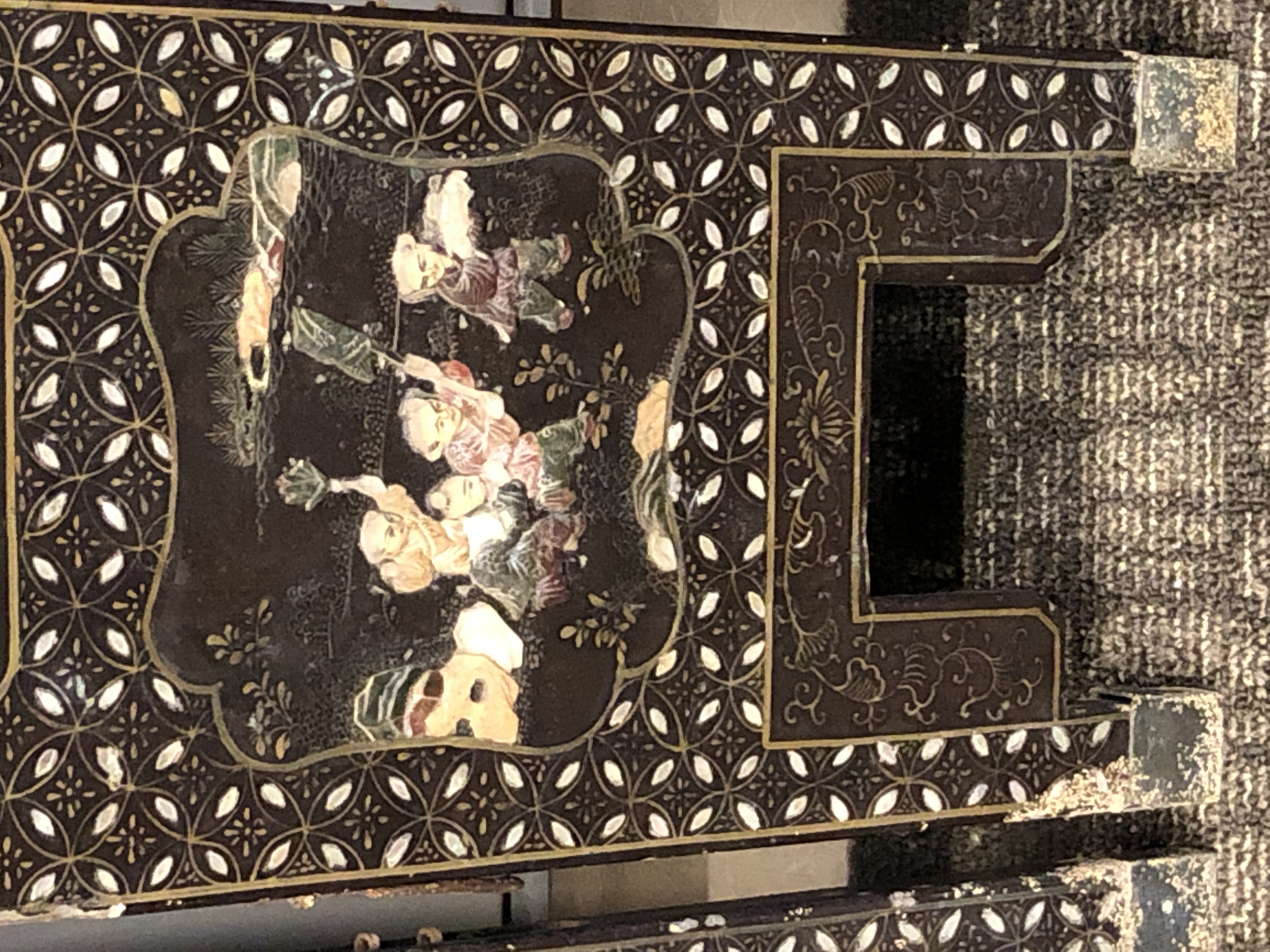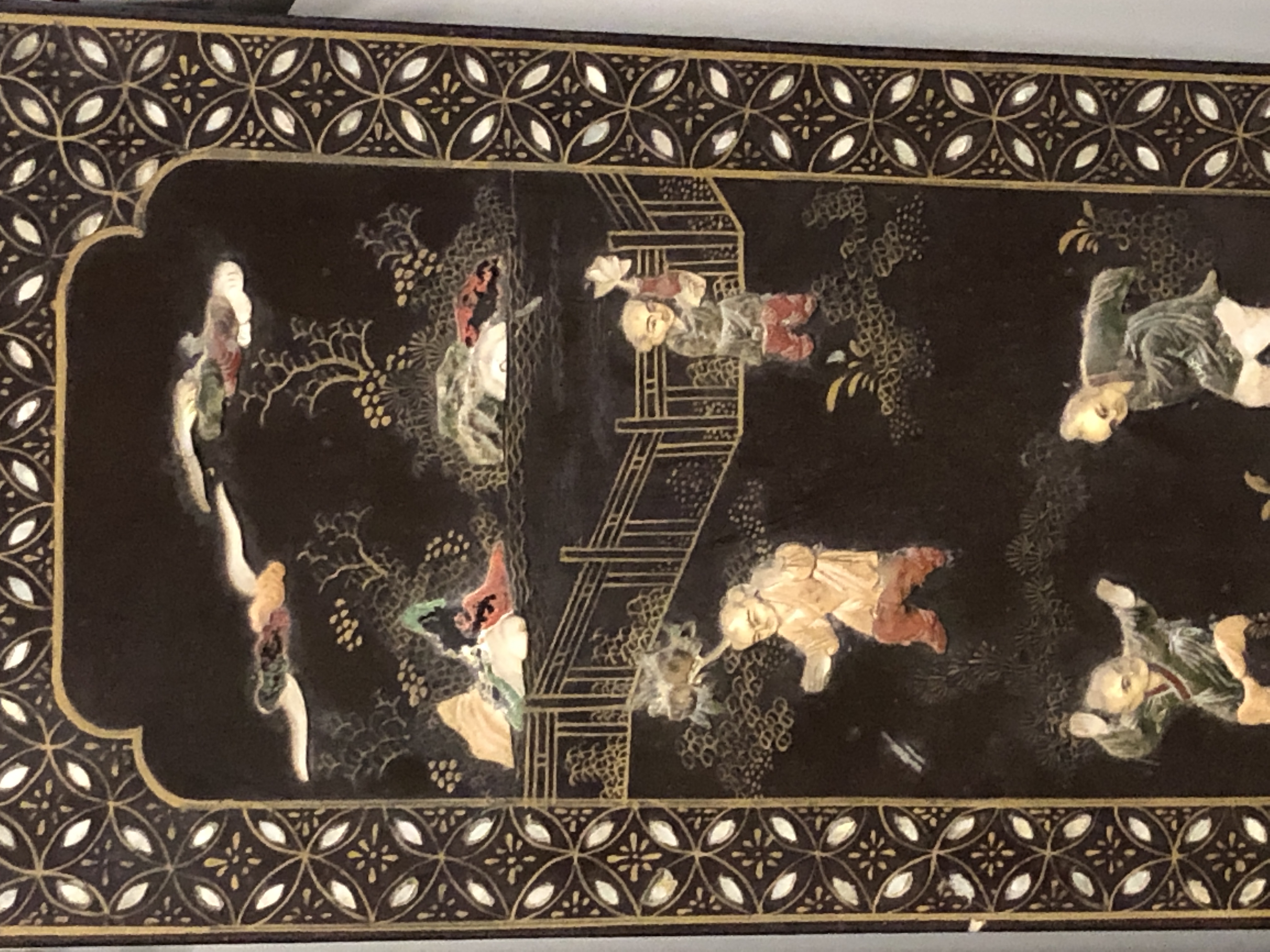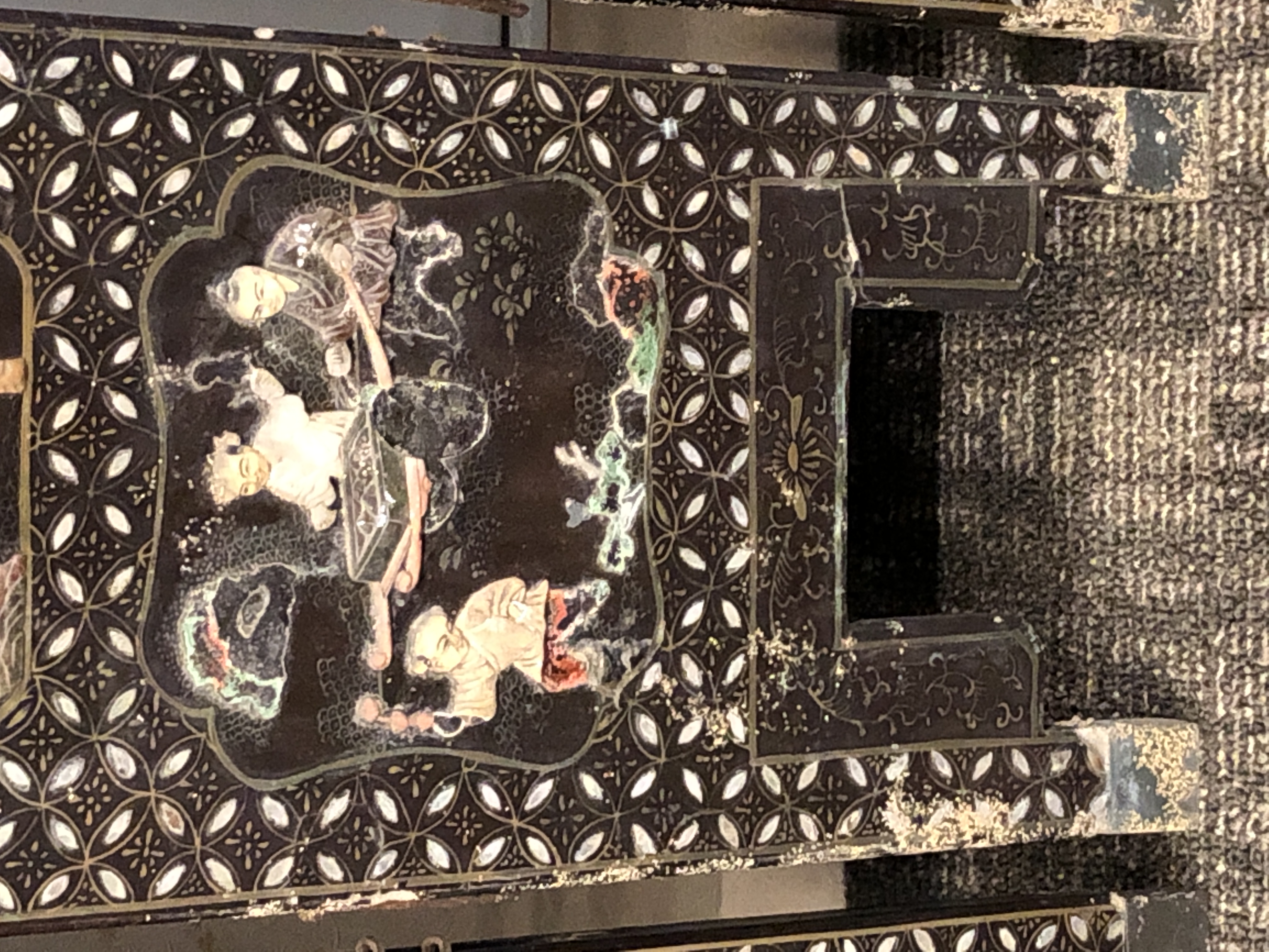 清代大漆彩绘描金十二扇桌瓶,屏风底漆为黑色打底用运彩绘花卉,金漆套边的画法,展现出各种花卉争奇斗艳的形态,画法娴熟,笔画流畅,颜色鲜艳夺目,两边框镶嵌彩贝,桌屏为晚清作品,可惜有些部位脱彩严重,从而影响了整个作品的品相,尽图片看这件作品还是有一定的观赏和收藏价值,