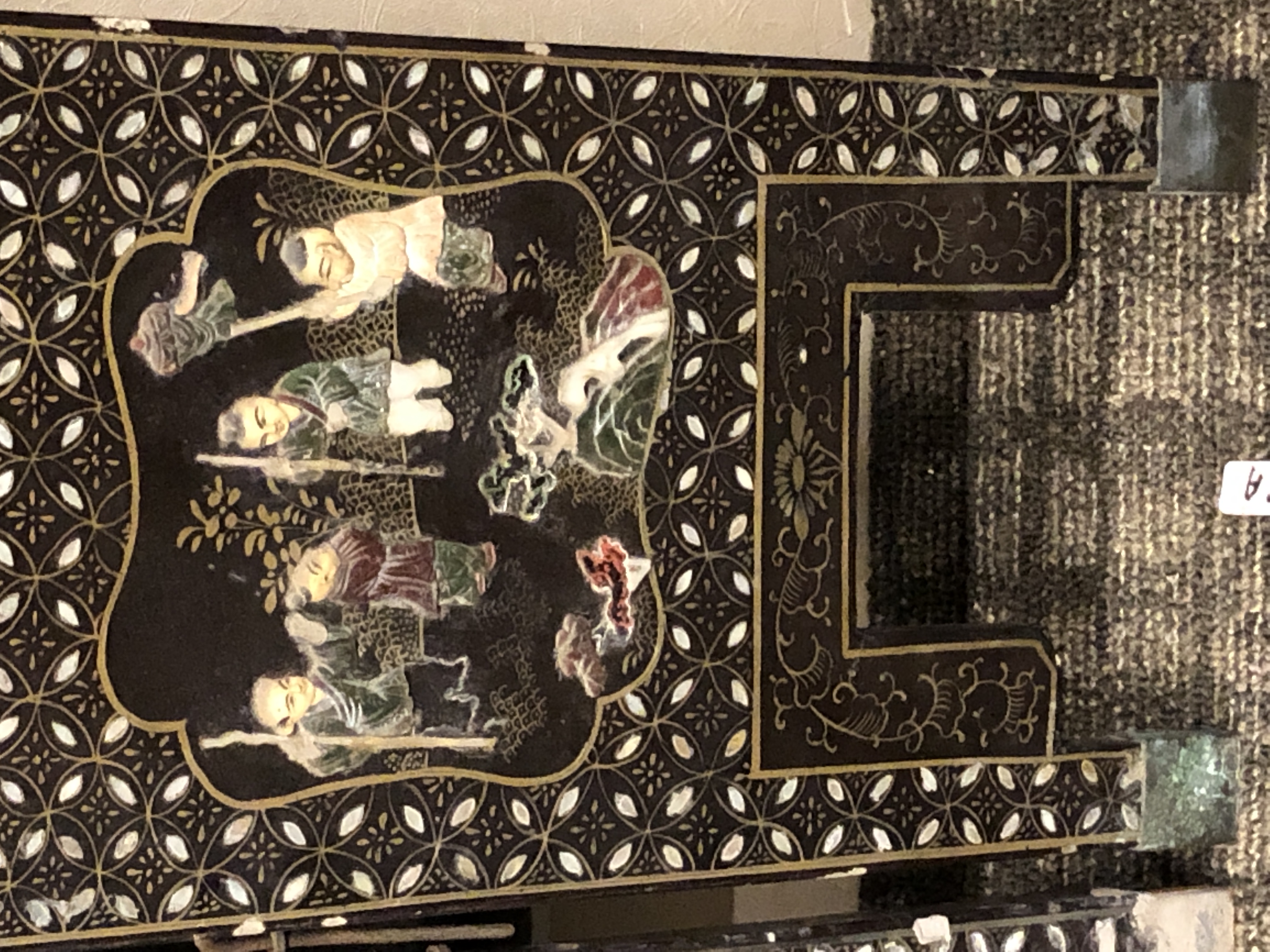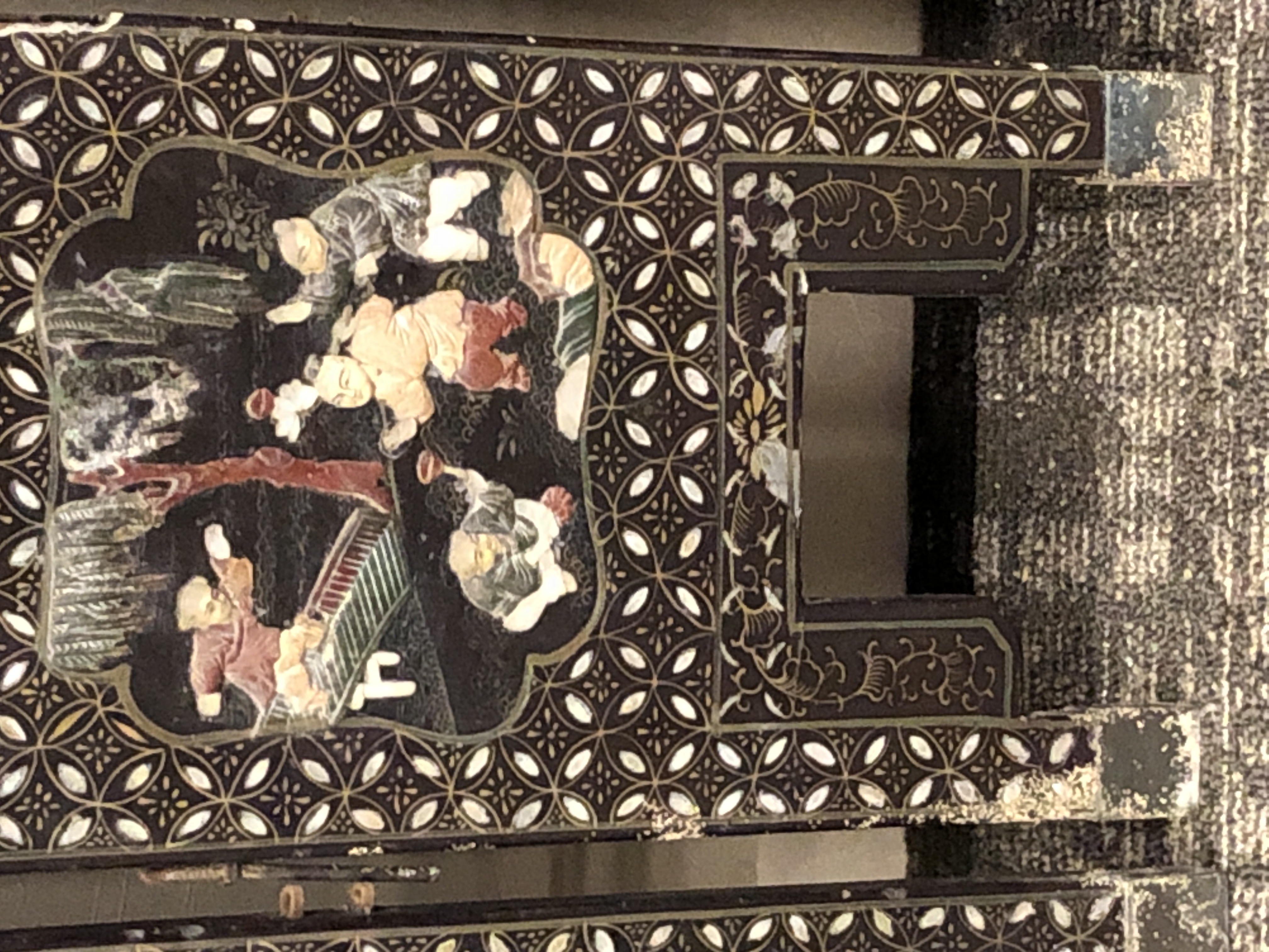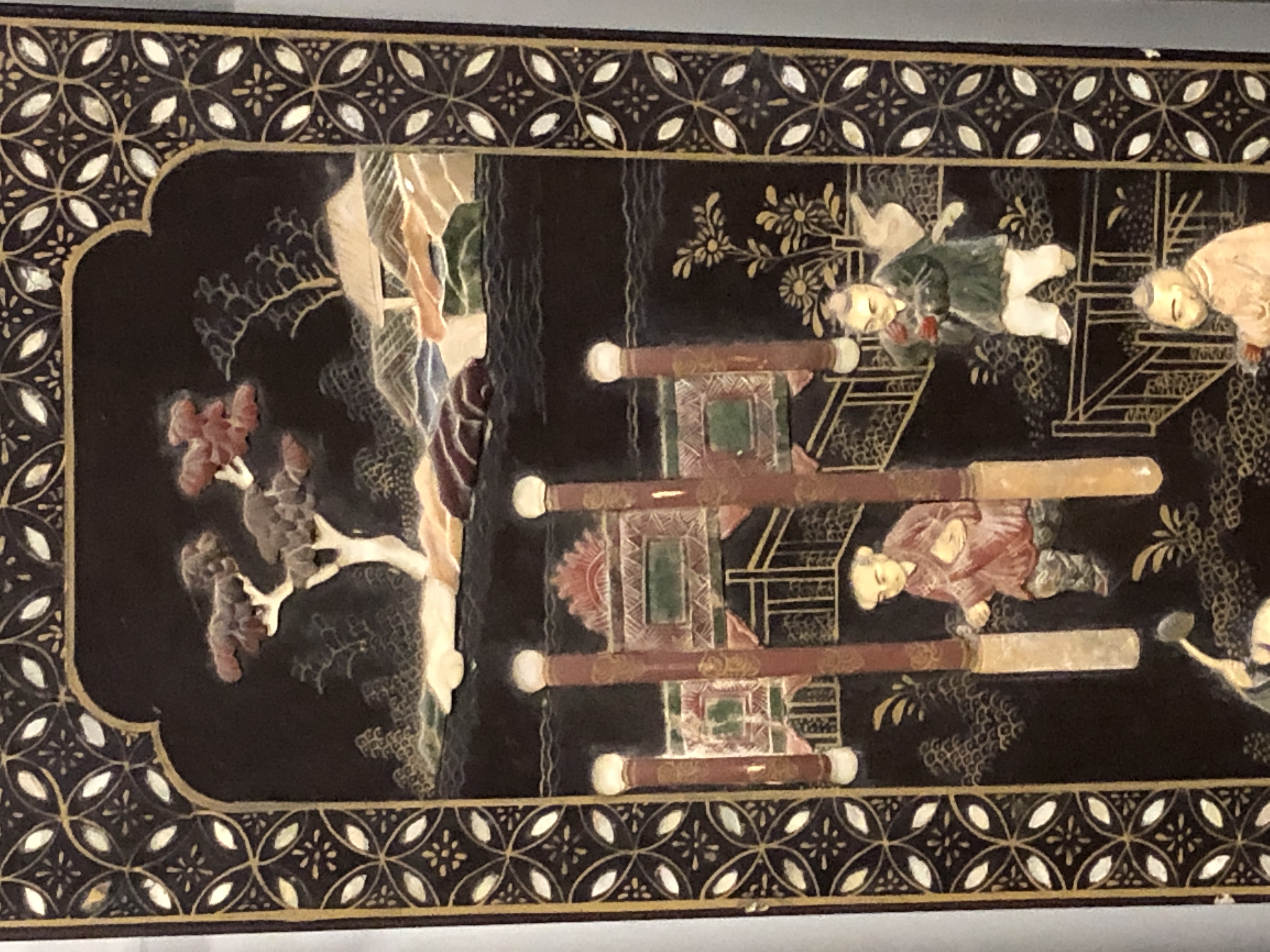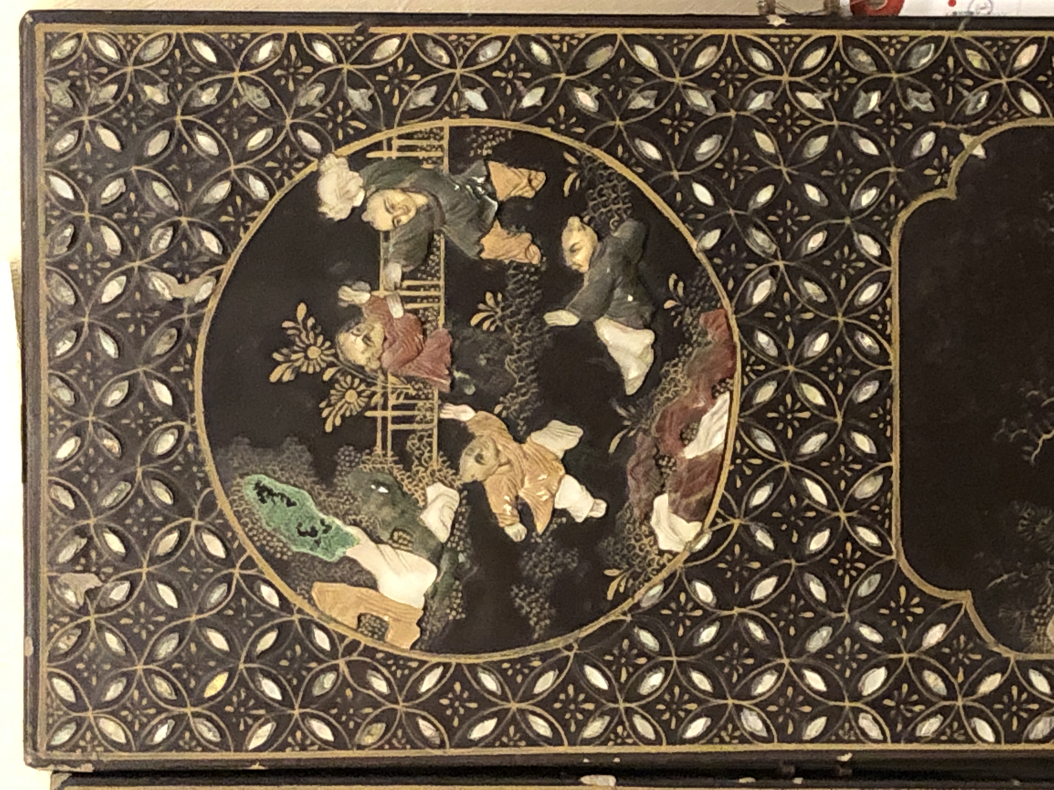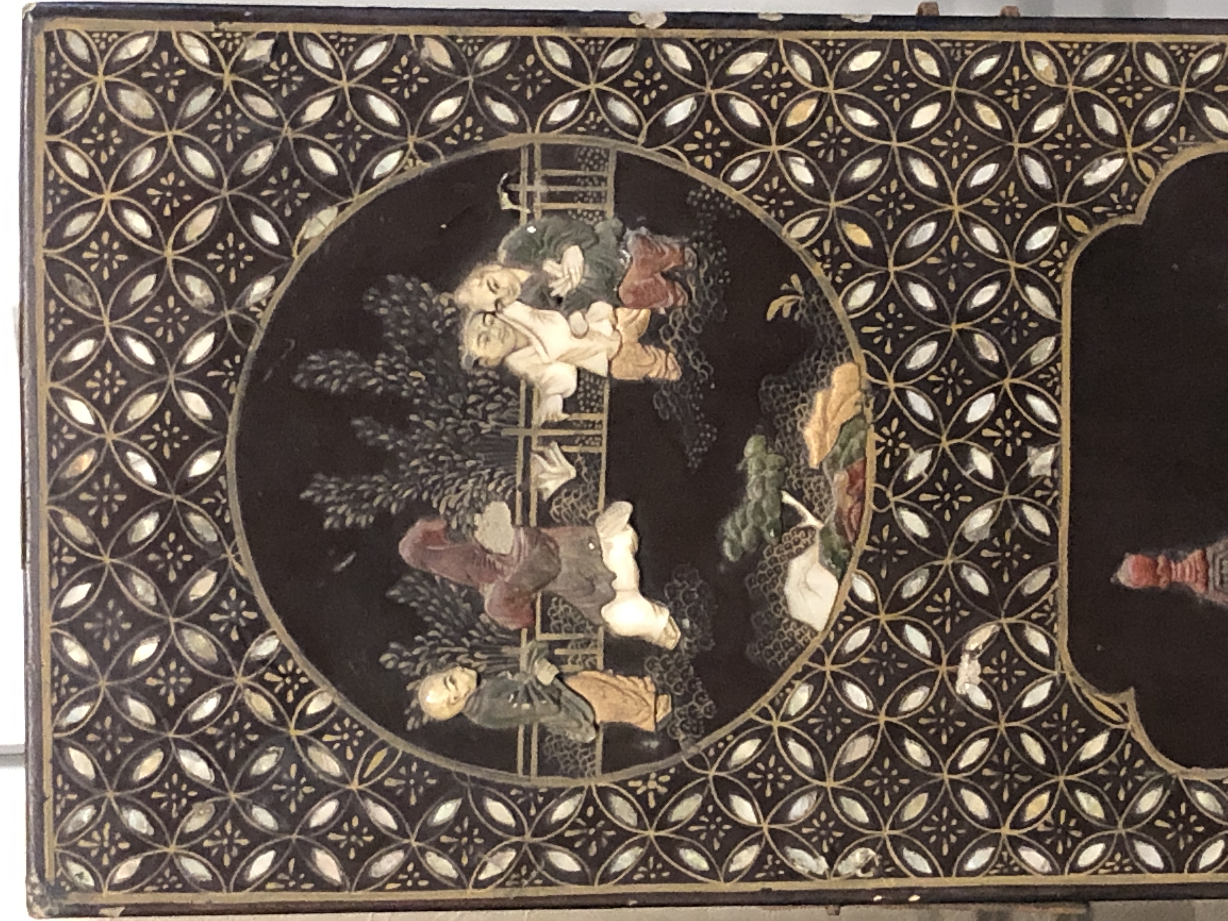 清代大漆彩绘描金十二扇桌瓶,屏风底漆为黑色打底用运彩绘花卉,金漆套边的画法,展现出各种花卉争奇斗艳的形态,画法娴熟,笔画流畅,颜色鲜艳夺目,两边框镶嵌彩贝,桌屏为晚清作品,可惜有些部位脱彩严重,从而影响了整个作品的品相,尽图片看这件作品还是有一定的观赏和收藏价值,